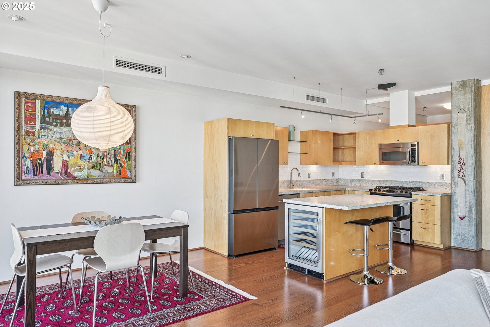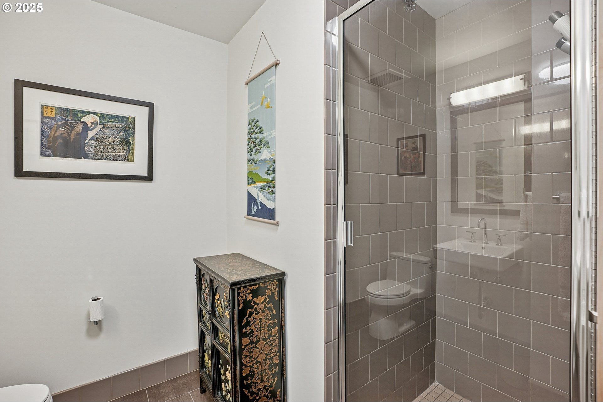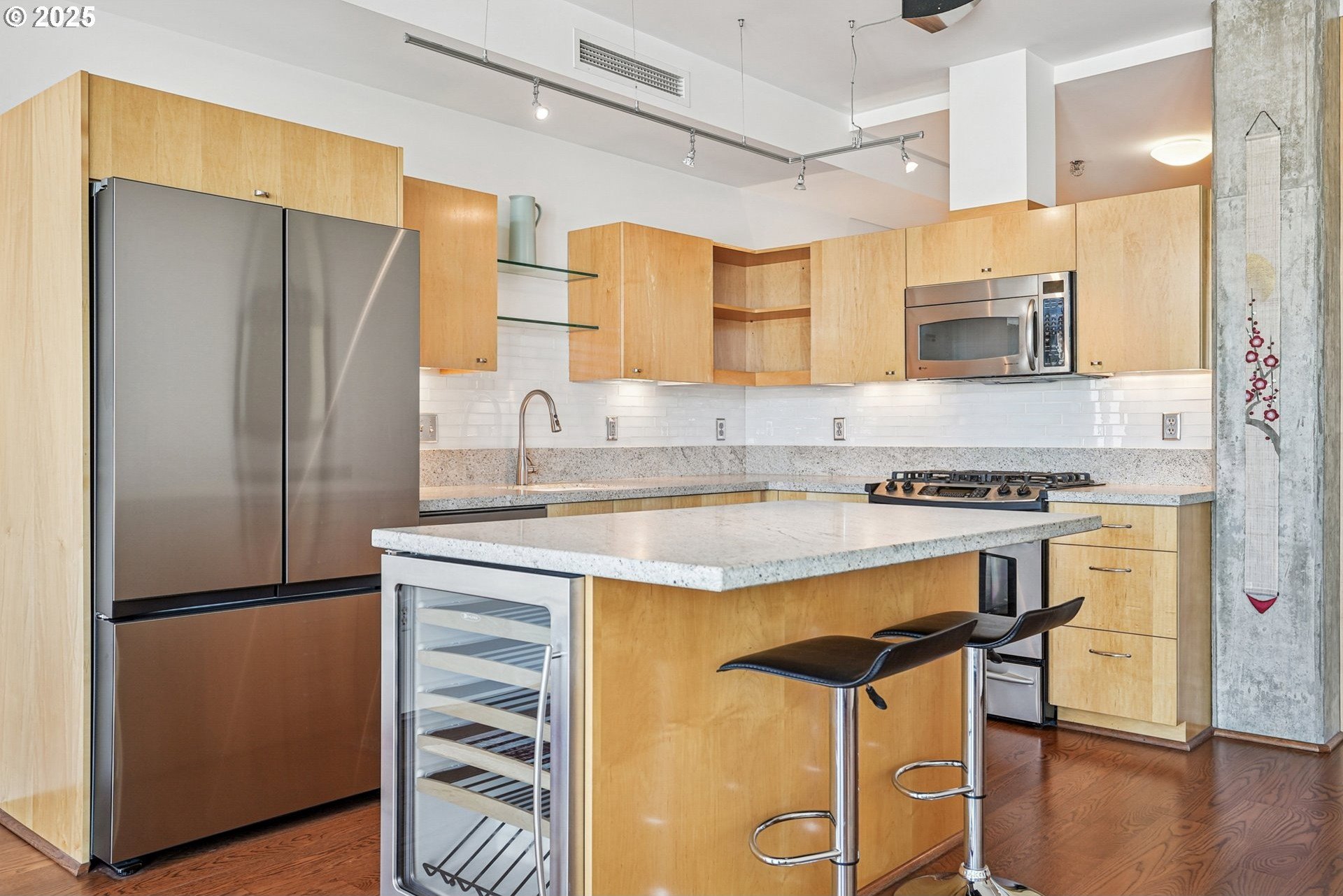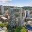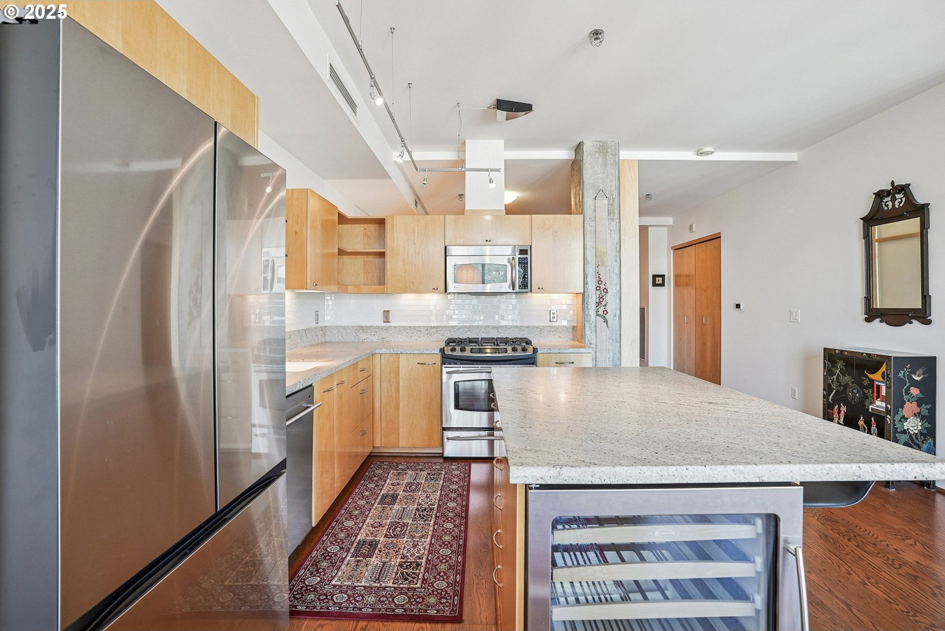 Enjoy a turnkey lifestyle & a breath of fresh air in this light and bright condo on the highest floor possible before the penthouse levels. Mid-century vibes & modern style with an open living area flooded with light from the floor to ceiling windows with two layers of mesh solar shades to control all the natural light you like. Enjoy watching the sunsets & grilling on the balcony spanning over 26'. Clean lines in the kitchen with European-style cabinets, granite counters, a custom full-height backsplash and stainless appliances, including the wine cooler in the eating island. The primary suite is private off the living room with custom wood & glass sliders, custom closets & an en suite bathroom featuring a marble vanity and large soaking tub/shower combination. Matching custom wood & glass sliders enclose the 2nd bedroom for working or hosting guests with the adjacent 2nd bath. The large entry leads to a big laundry room with generous storage space, washer & dryer. Separately deeded & secure parking space is within the building, and includes a private storage room adjacent to the parking space. The building has power for EV charging & each owner can contract to bring the power and install charging stations at each parking space at their own cost. The building has many wonderful amenities: fitness room & library on the 2nd floor, meeting room & common terrace with kitchen & bath on the 3rd floor, plus 24/7 concierge service. Strong HOA & very well managed building. Frequent the new Mark Rothko Pavilion at the Portland Art Museum across the street, events at the Schnitz, Oregon Historical Society, Farmers Markets, classes at PSU, downtown shopping & dining.