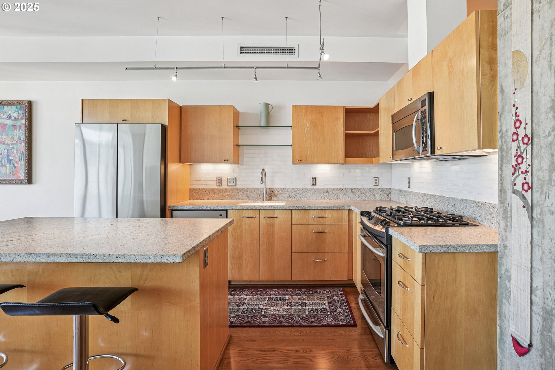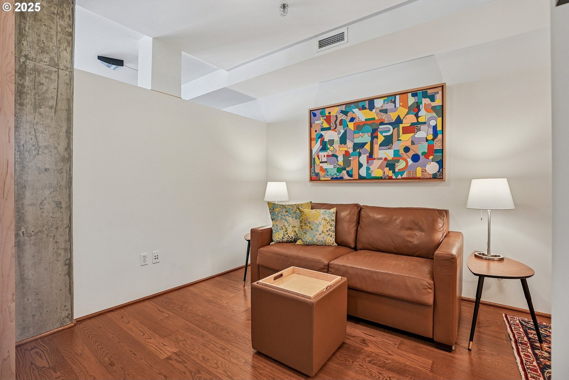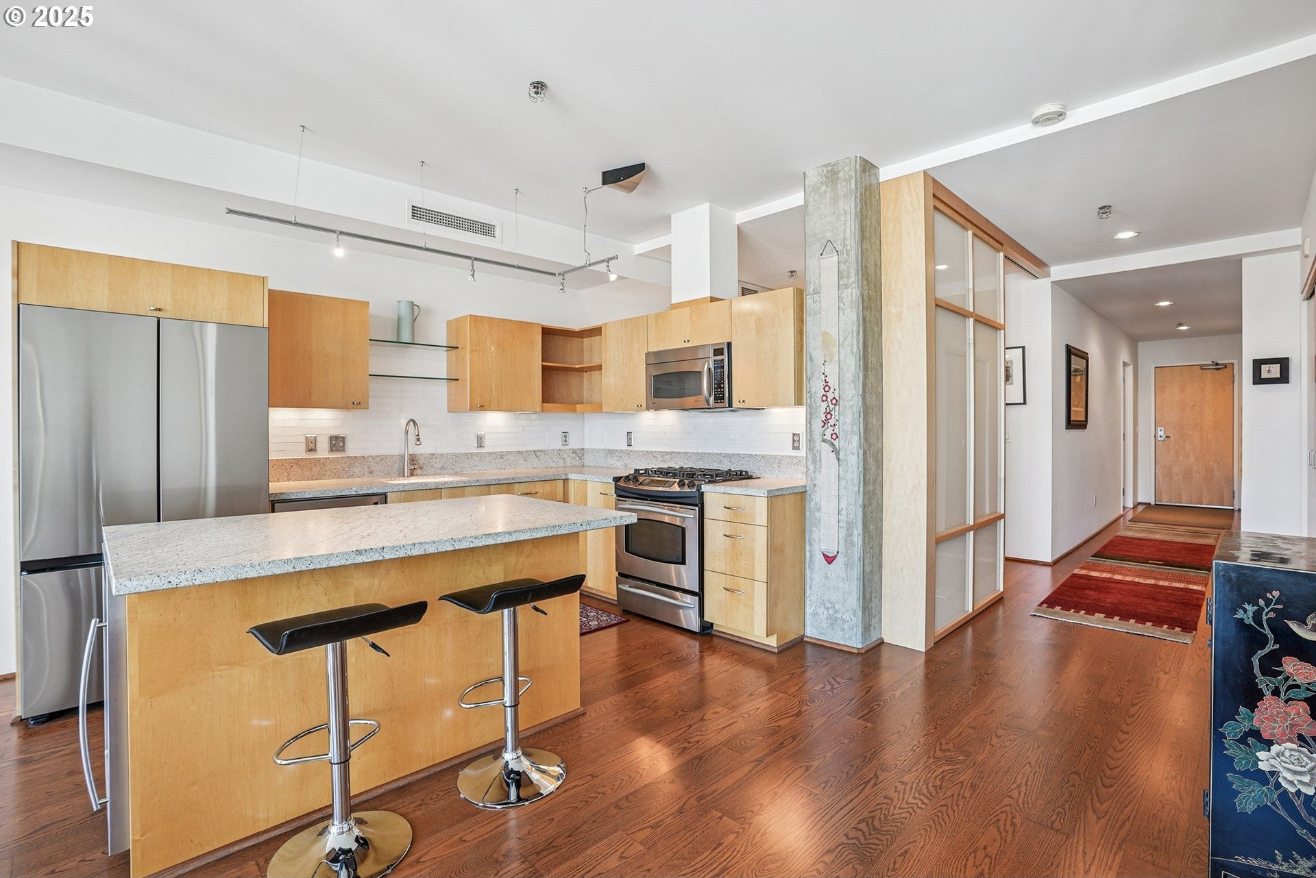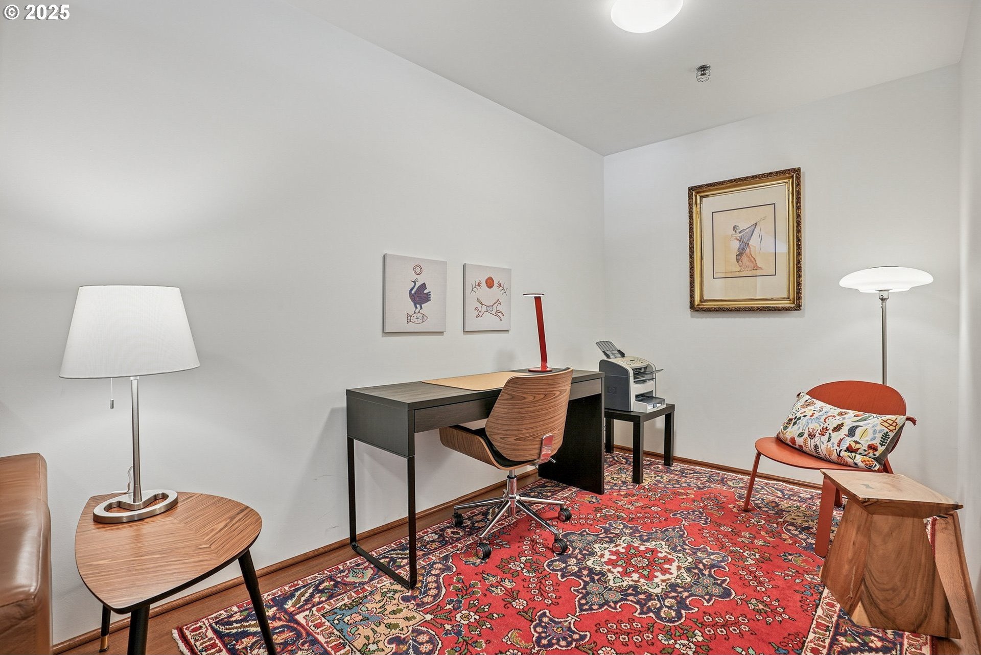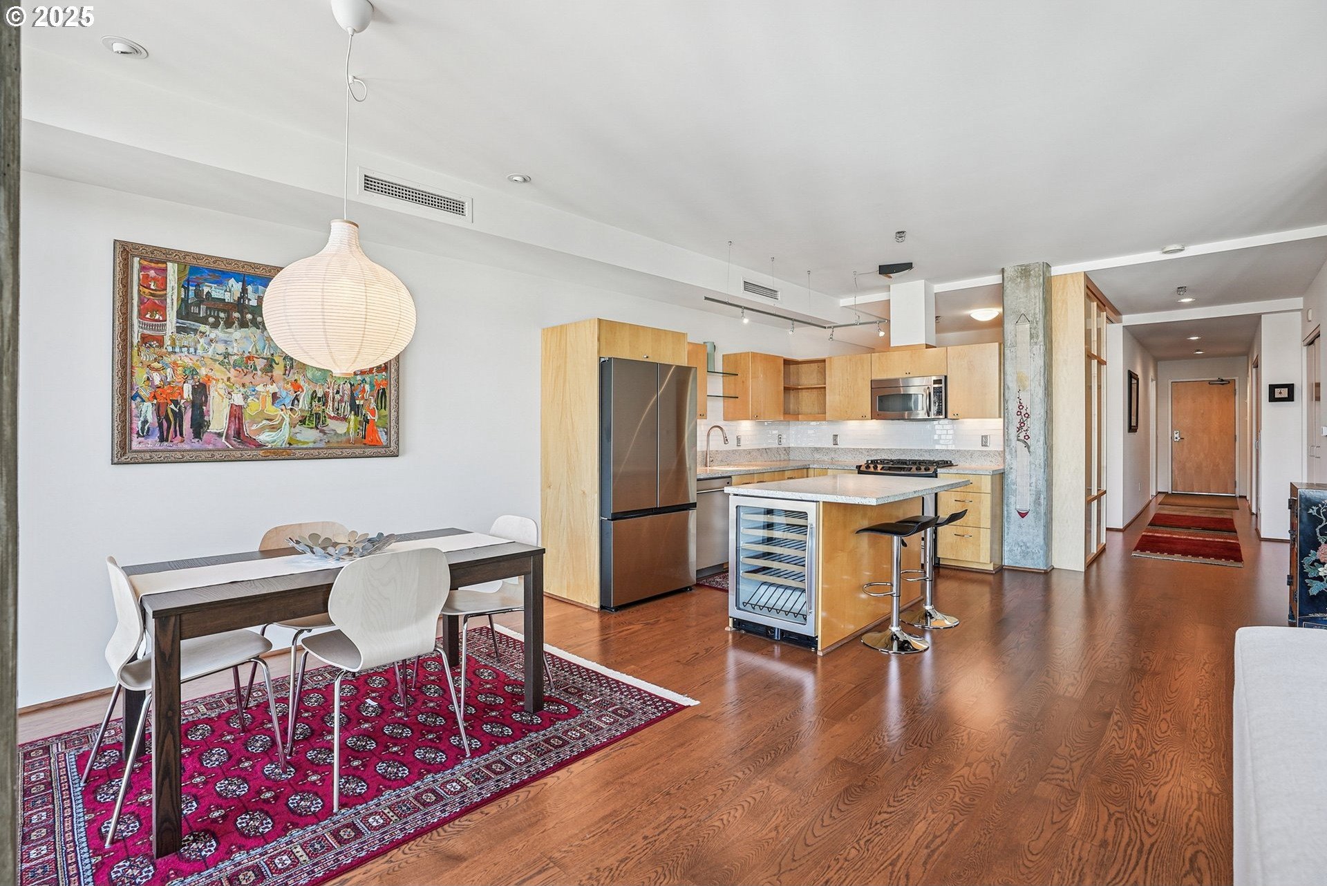 Enjoy a turnkey lifestyle & a breath of fresh air in this light and bright condo on the highest floor possible before the penthouse levels. Mid-century vibes & modern style with an open living area flooded with light from the floor to ceiling windows with two layers of mesh solar shades to control all the natural light you like. Enjoy watching the sunsets & grilling on the balcony spanning over 26'. Clean lines in the kitchen with European-style cabinets, granite counters, a custom full-height backsplash and stainless appliances, including the wine cooler in the eating island. The primary suite is private off the living room with custom wood & glass sliders, custom closets & an en suite bathroom featuring a marble vanity and large soaking tub/shower combination. Matching custom wood & glass sliders enclose the 2nd bedroom for working or hosting guests with the adjacent 2nd bath. The large entry leads to a big laundry room with generous storage space, washer & dryer. Separately deeded & secure parking space is within the building, and includes a private storage room adjacent to the parking space. The building has power for EV charging & each owner can contract to bring the power and install charging stations at each parking space at their own cost. The building has many wonderful amenities: fitness room & library on the 2nd floor, meeting room & common terrace with kitchen & bath on the 3rd floor, plus 24/7 concierge service. Strong HOA & very well managed building. Frequent the new Mark Rothko Pavilion at the Portland Art Museum across the street, events at the Schnitz, Oregon Historical Society, Farmers Markets, classes at PSU, downtown shopping & dining.