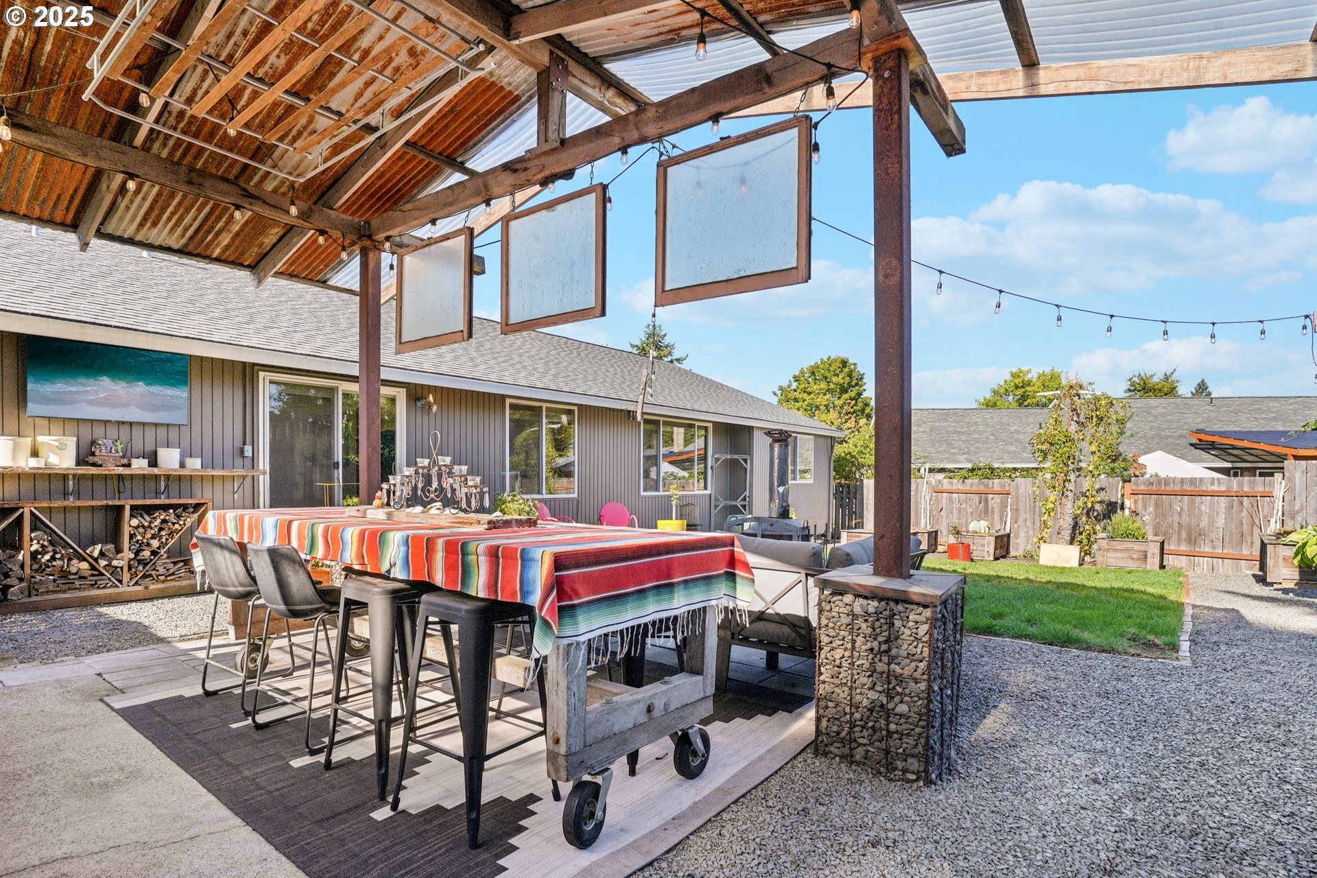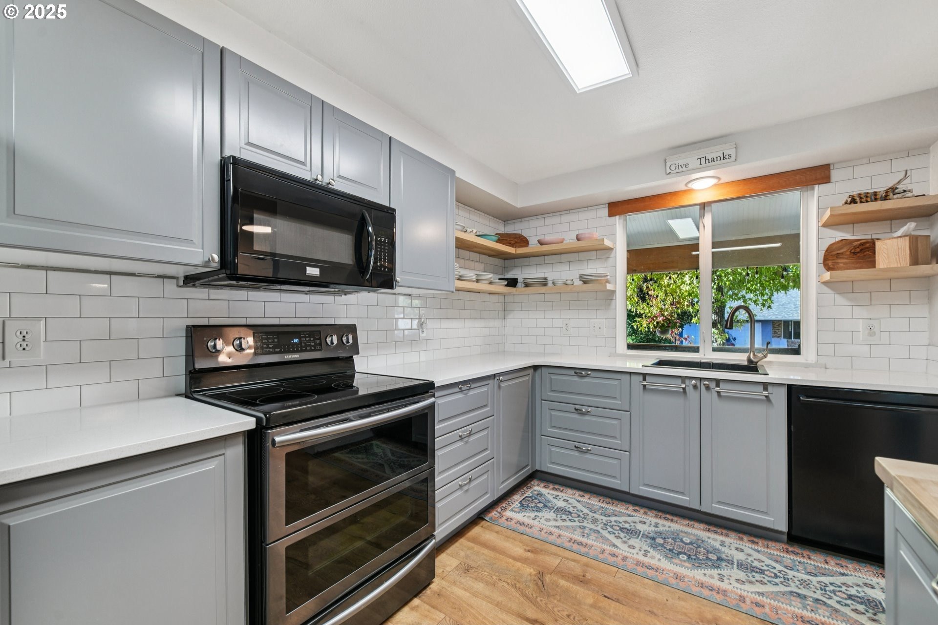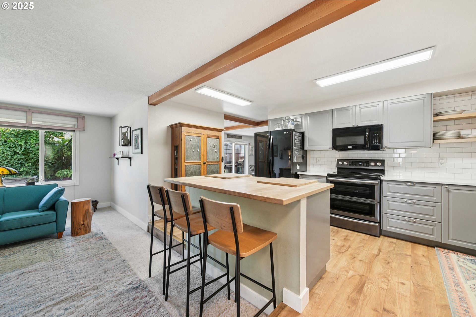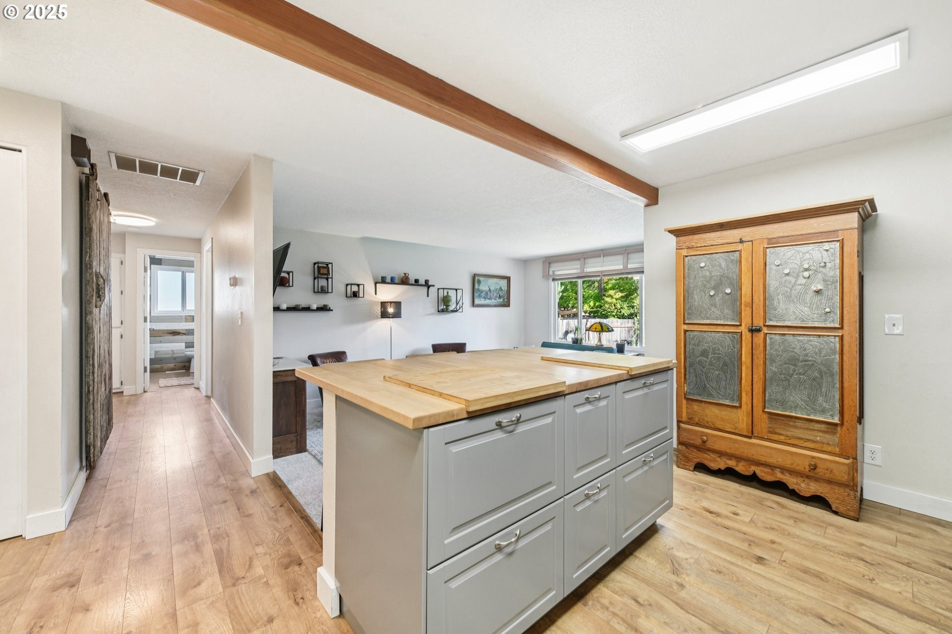 Welcome to this beautifully cared-for, move-in ready one-level home featuring 3 spacious bedrooms and 2 full bathrooms. From the moment you arrive, you'll be greeted by an inviting covered front porch that sets the tone for the warmth and character found throughout.Step inside to discover a stunning kitchen with a perfect blend of style and function, complete with a butcher block island with eat-at seating, sleek quartz countertops, open shelving, and charming exposed beams. The living space is filled with natural light and enhanced by newer LVP flooring and tasteful rustic-modern finishes, including a sliding barn door that adds both style and convenience.The fully fenced backyard is ideal for entertaining with a large covered patio, raised garden beds, and a storage shed—offering plenty of space for gardening, gatherings, or just relaxing outdoors.Additional highlights include a newer roof, located in a quiet and very walkable neighborhood, you'll enjoy the tranquility of suburban living while still being close to all amenities. This home is spotless, full of character, and ready for its next owner.