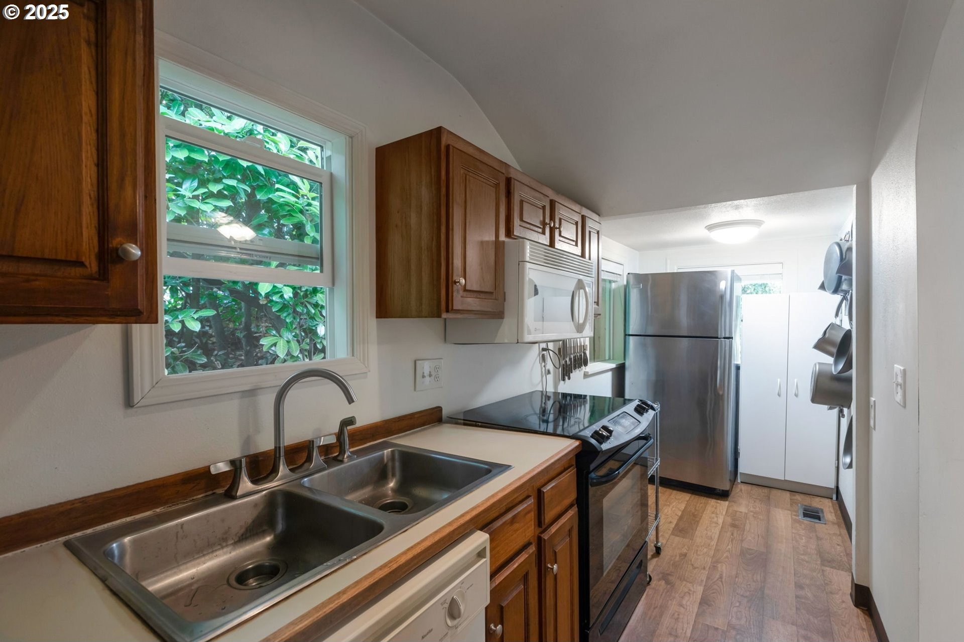 Welcome to your new home! This beautifully maintained 2-bedroom, 1-bathroom residence offers the ideal combination of functionality and charm. Freshly painted and boasting a new roof, gutters & windows there is so much to love! Once you step inside you will find light-filled living space with a warm, inviting atmosphere and a  convenient layout for everyday living. Both bedrooms both offer a slider to outside. The primary bedroom with a slider to your backyard. The second bedroom with slider to the front patio. The full bathroom boasts clean, classic finishes. Outside, enjoy a private backyard perfect for entertaining, gardening, or relaxing in your own outdoor oasis. Additional highlights include a new water heater and furnace, you’ll love the bathroom remodel and the light bright space throughout the home.  Whether you're a first-time buyer, downsizing, or looking for an investment property, this home fits the bill. Don’t miss this opportunity to own a well-cared-for home in a desirable neighborhood. Schedule your showing today! [Home Energy Score = 5. HES Report at https://rpt.greenbuildingregistry.com/hes/OR10242015]