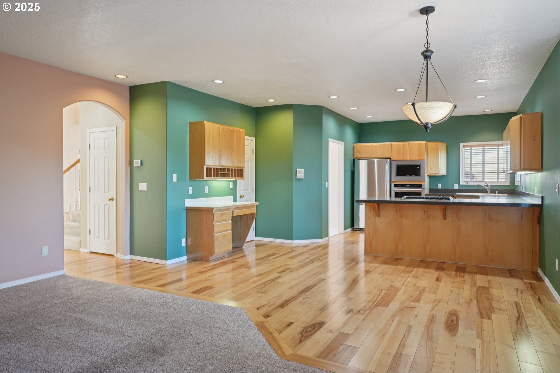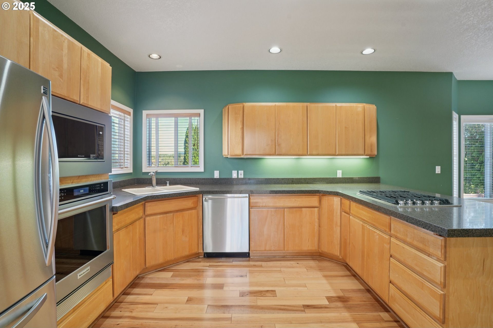 Beautifully maintained Camas home backing to a serene greenbelt. This light-filled residence offers a comfortable and open layout with formal living and dining spaces, plus an inviting kitchen that flows seamlessly into a second dining area and family room.Features include hickory hardwood flooring, new carpet on the main level, and a dedicated laundry room with ample storage. Recent updates provide peace of mind — a new HVAC system (2024), oven, microwave, and cooktop (2025), along with a Terra Firma–encased crawl space and leaf guard gutters. The property is professionally landscaped and meticulously maintained. Enjoy a private back deck overlooking the green space and HOA-maintained trails leading directly to Dorothy Fox Elementary. Move-in ready and thoughtfully cared for, with all appliances included.