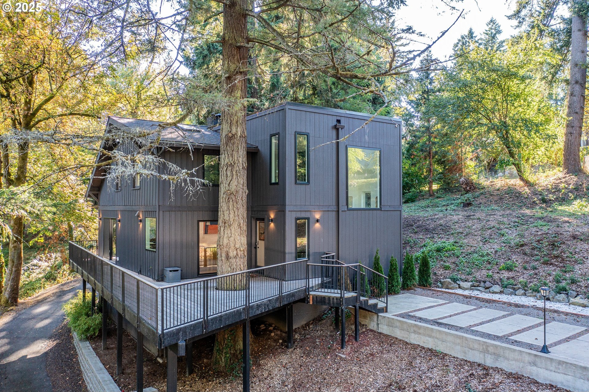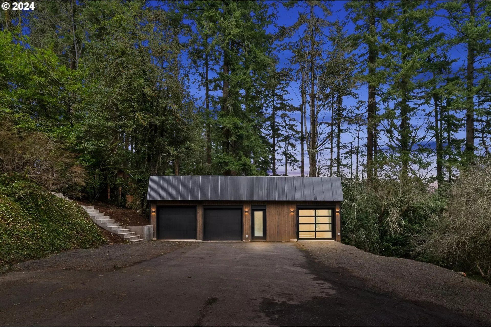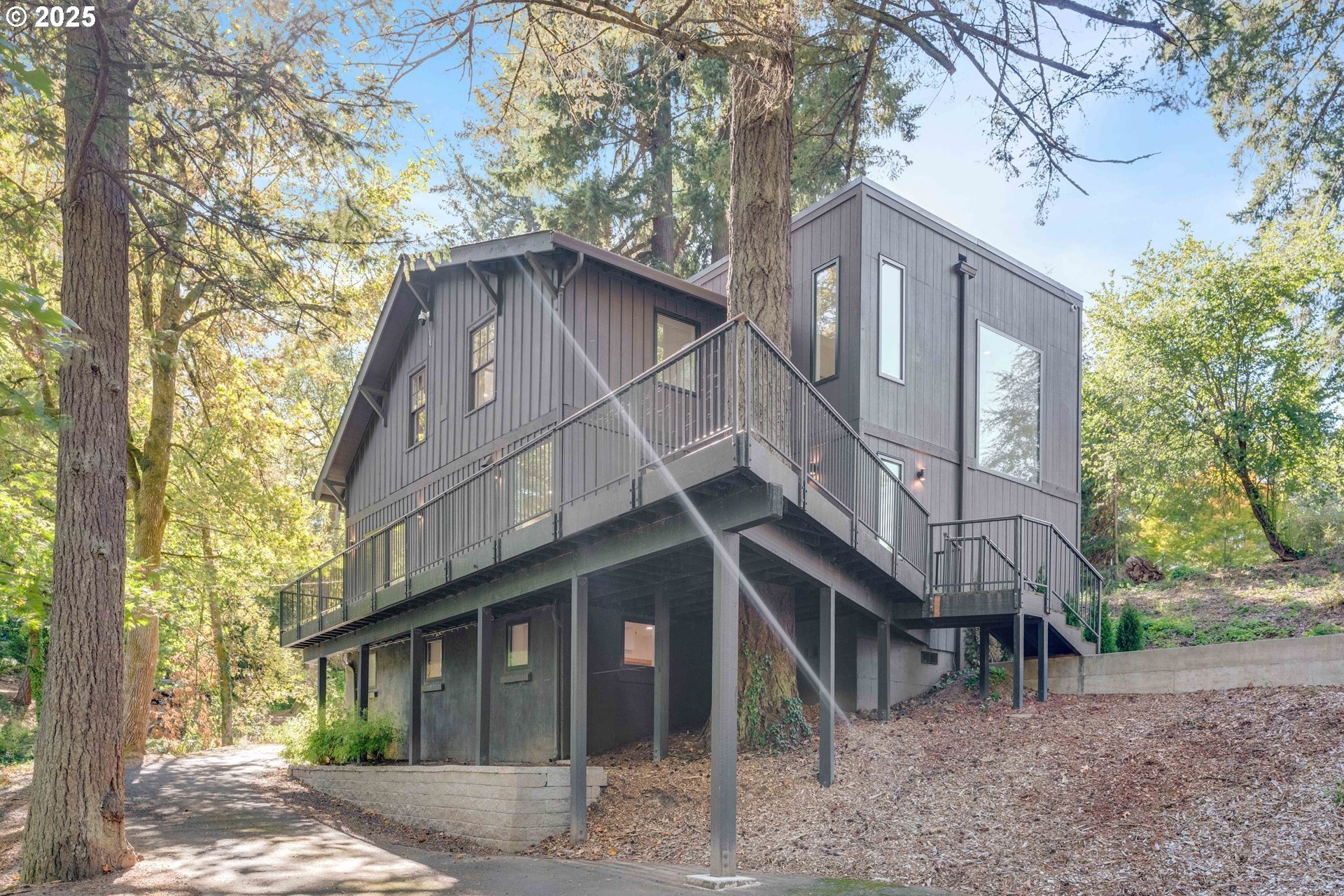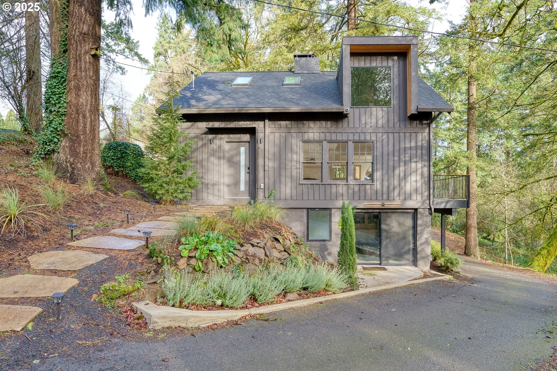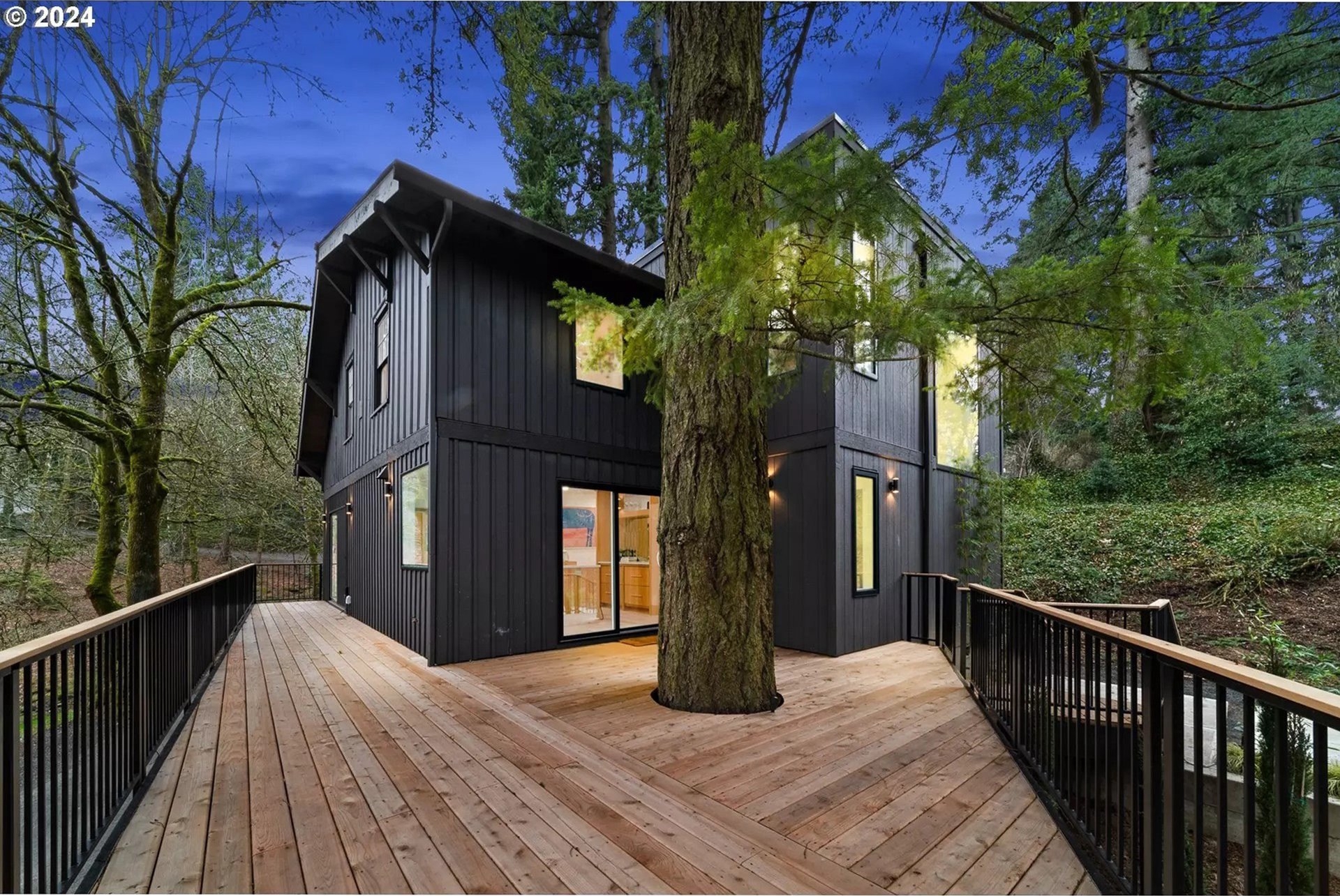 OPEN HOUSE SATURDAY OCTOBER 11th 1-3PM! Nestled among the trees on over 1.5 acres in Portland, this striking modern three-story home offers a perfect balance of natural serenity and sophisticated design. The exterior’s dark, moody tones contrast beautifully with the light and airy interior, where soaring vaulted ceilings, skylights, and expansive windows fill the space with natural light. The living room features a stunning stone fireplace as its centerpiece, while the dining area seamlessly connects to a chef’s kitchen with custom cabinetry, an island, built-in refrigerator, and sliding doors that open to a spacious deck for effortless indoor-outdoor living. A stylish half bath and a flexible main-level room—ideal as an office or sitting area—add to the home’s functionality. Upstairs, the luxurious primary suite impresses with vaulted ceilings, a skylight, a walk-in closet, and a spa-like ensuite bath featuring a double vanity and an oversized walk-in shower with dual shower heads. A second upstairs bedroom also includes its own ensuite bath, offering privacy and comfort. The lower level is designed for both relaxation and entertainment, with a temperature-controlled wine cellar, a bedroom, a full bath with a walk-in glass shower, a laundry room, and a spacious bonus room complete with a wet bar—perfect for gatherings. Outside, a detached two-car garage includes a dedicated gym area, completing this exceptional property. Designed with meticulous attention to detail and surrounded by the beauty of the Pacific Northwest, this residence offers a rare blend of modern luxury and tranquil seclusion.
