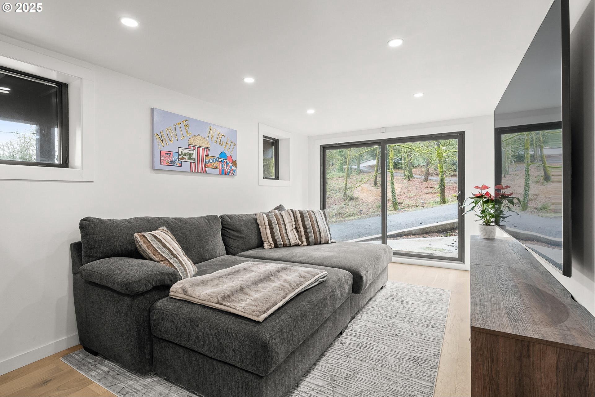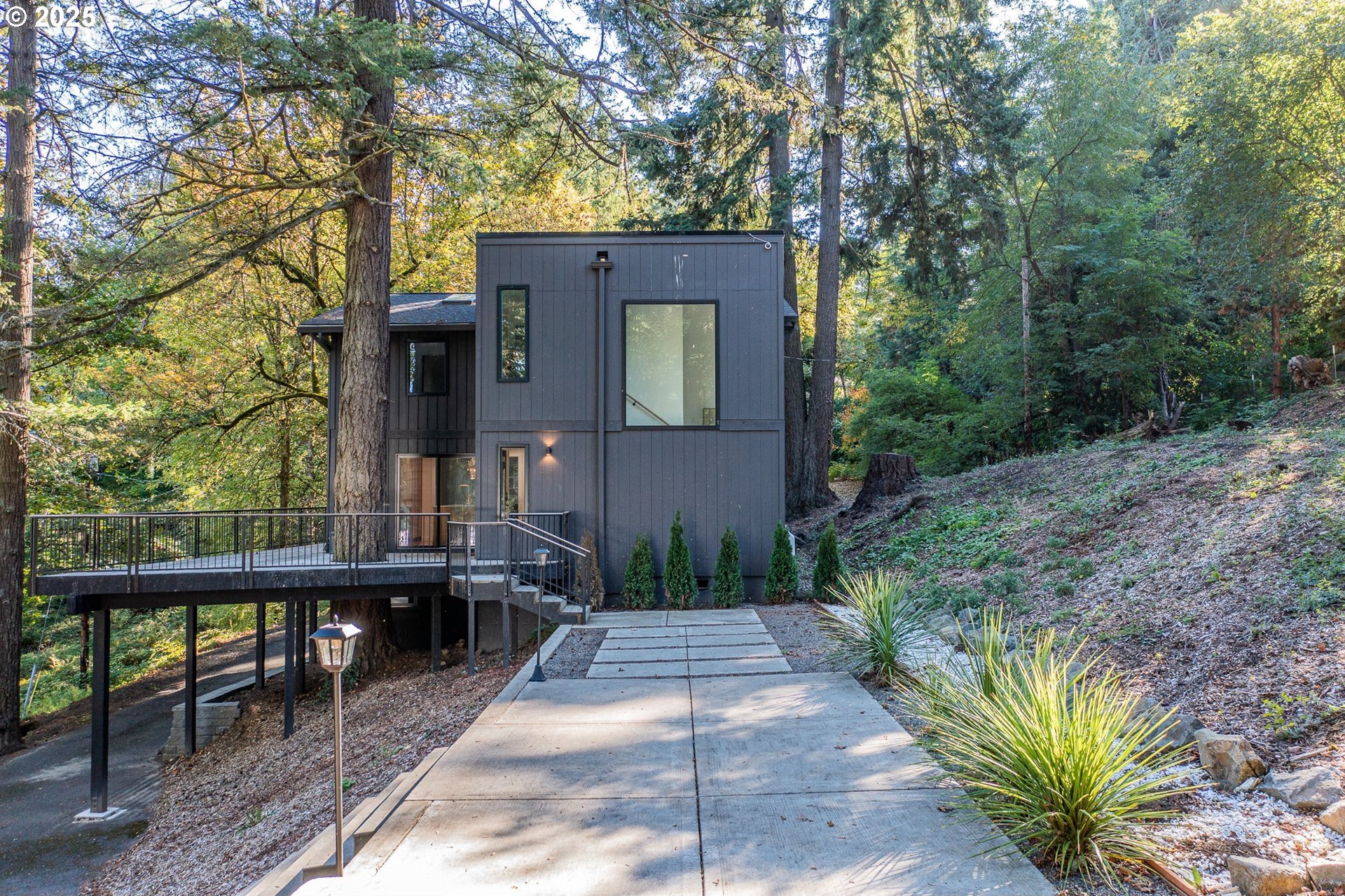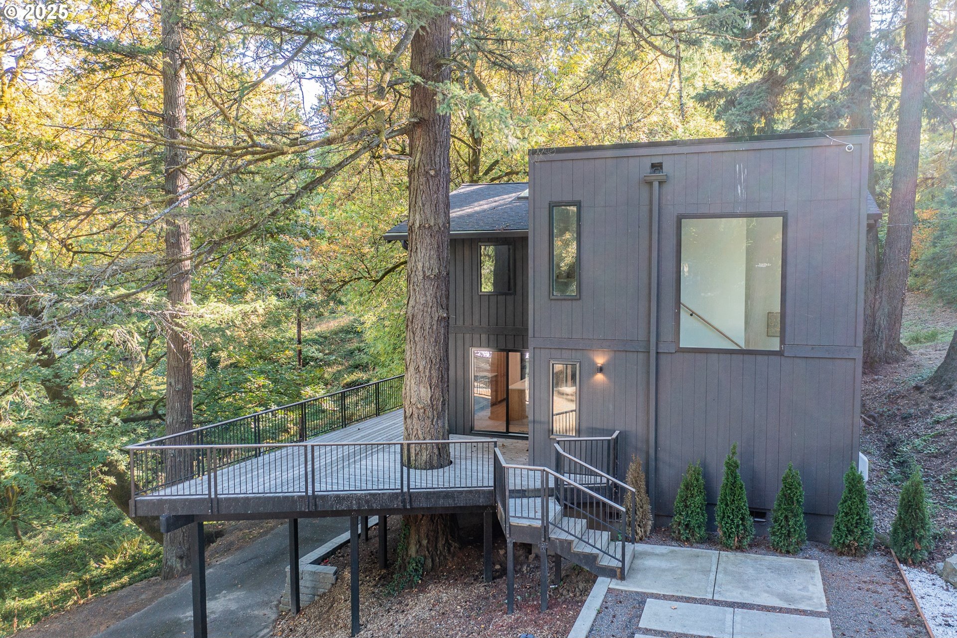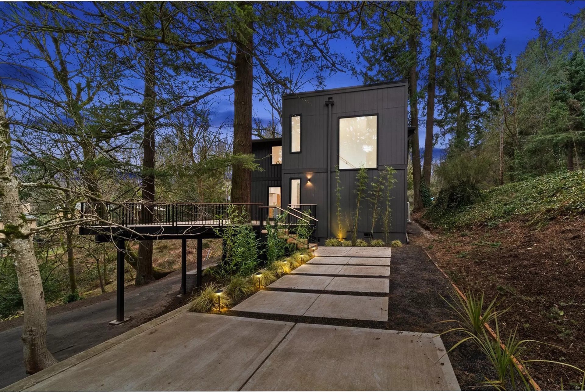 OPEN HOUSE SATURDAY OCTOBER 11th 1-3PM! Nestled among the trees on over 1.5 acres in Portland, this striking modern three-story home offers a perfect balance of natural serenity and sophisticated design. The exterior’s dark, moody tones contrast beautifully with the light and airy interior, where soaring vaulted ceilings, skylights, and expansive windows fill the space with natural light. The living room features a stunning stone fireplace as its centerpiece, while the dining area seamlessly connects to a chef’s kitchen with custom cabinetry, an island, built-in refrigerator, and sliding doors that open to a spacious deck for effortless indoor-outdoor living. A stylish half bath and a flexible main-level room—ideal as an office or sitting area—add to the home’s functionality. Upstairs, the luxurious primary suite impresses with vaulted ceilings, a skylight, a walk-in closet, and a spa-like ensuite bath featuring a double vanity and an oversized walk-in shower with dual shower heads. A second upstairs bedroom also includes its own ensuite bath, offering privacy and comfort. The lower level is designed for both relaxation and entertainment, with a temperature-controlled wine cellar, a bedroom, a full bath with a walk-in glass shower, a laundry room, and a spacious bonus room complete with a wet bar—perfect for gatherings. Outside, a detached two-car garage includes a dedicated gym area, completing this exceptional property. Designed with meticulous attention to detail and surrounded by the beauty of the Pacific Northwest, this residence offers a rare blend of modern luxury and tranquil seclusion.
