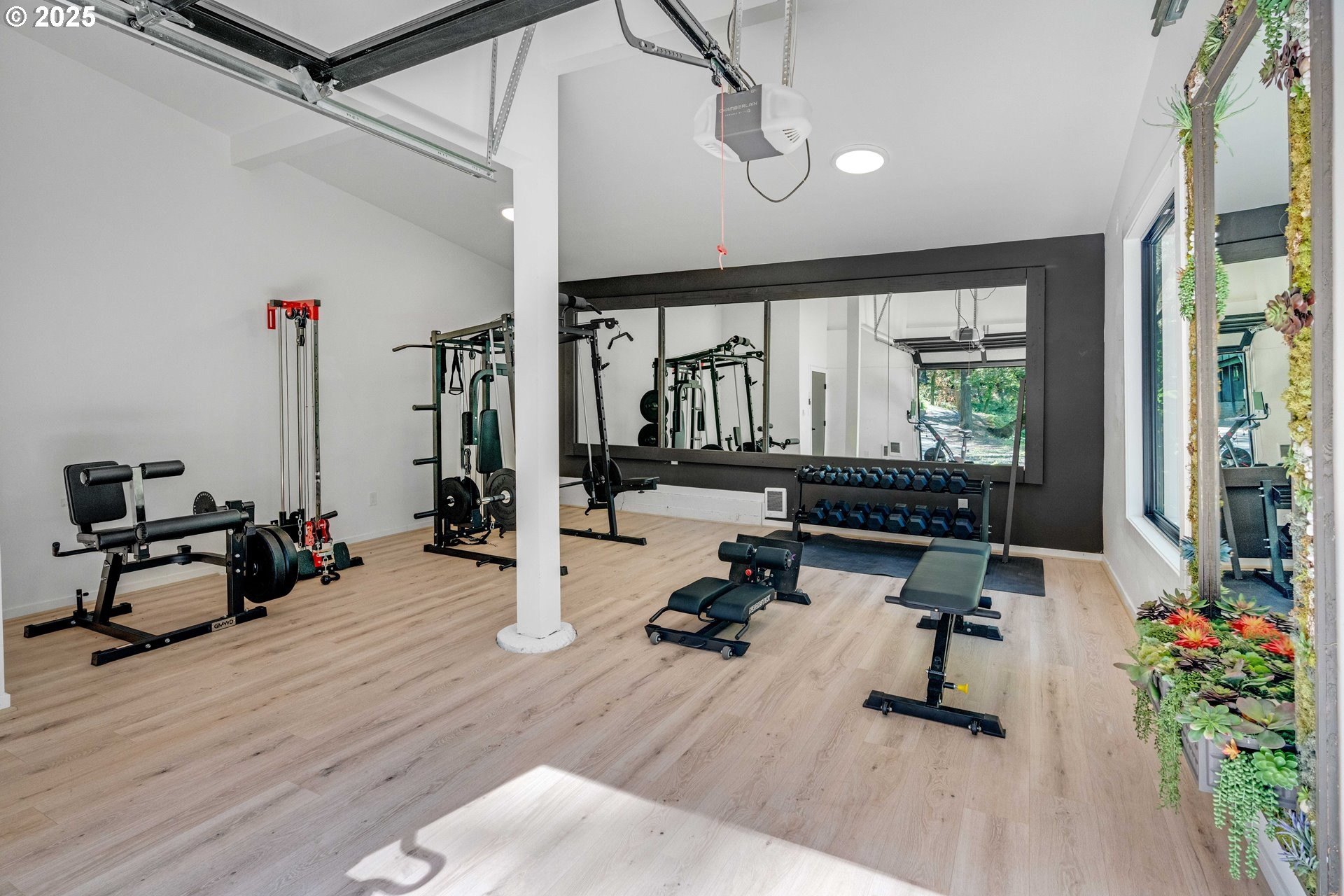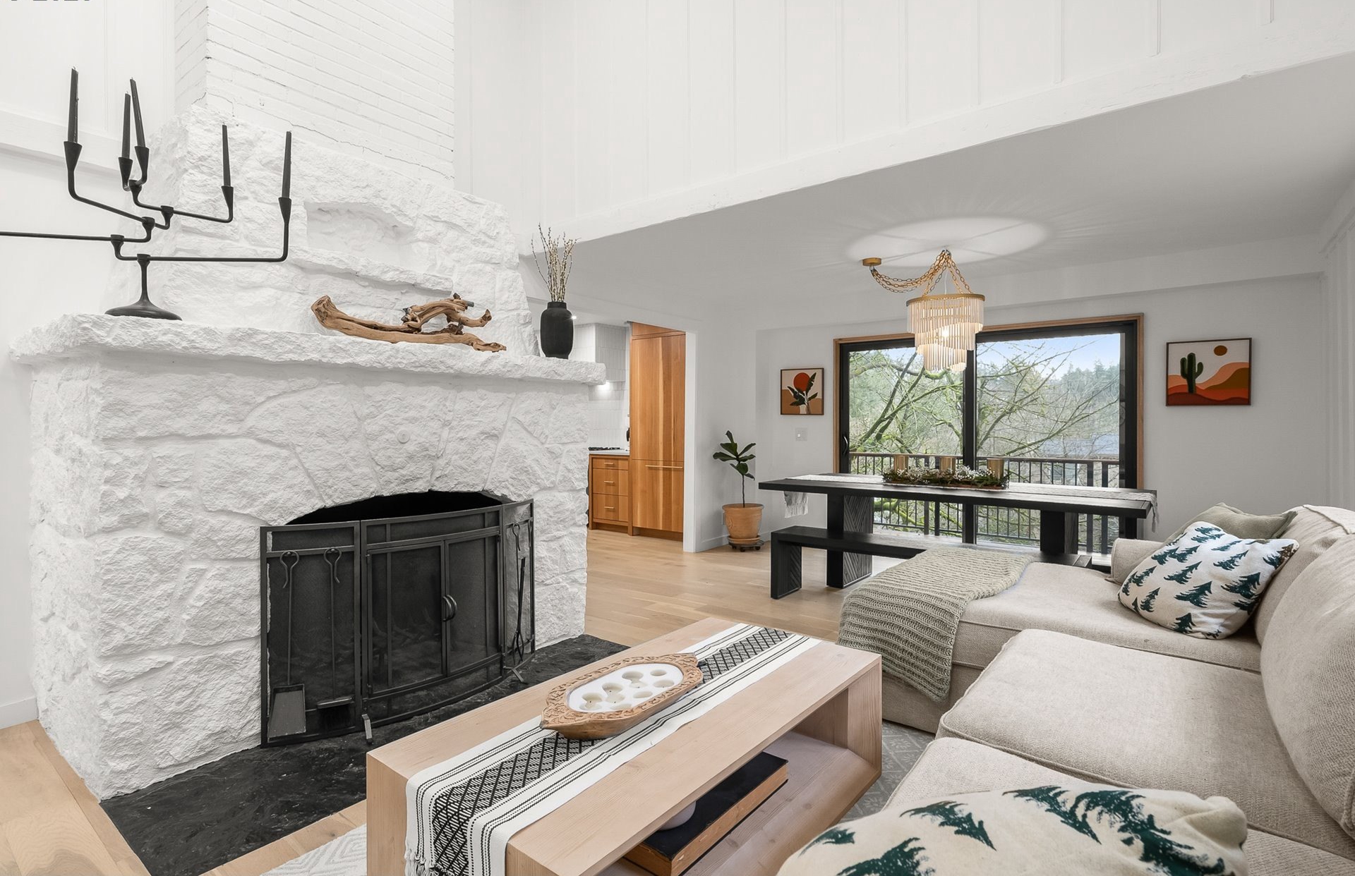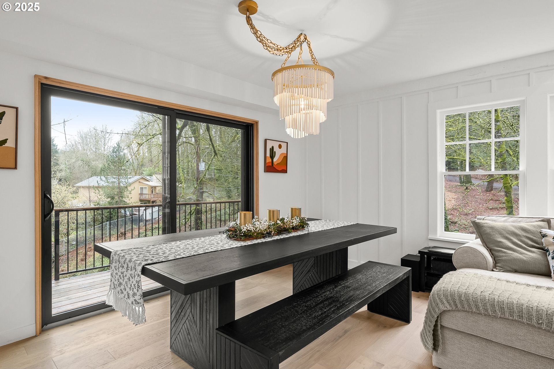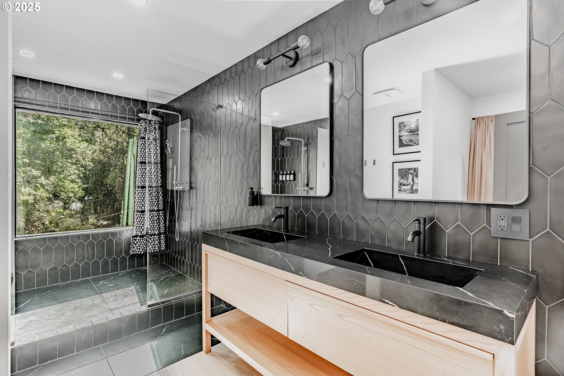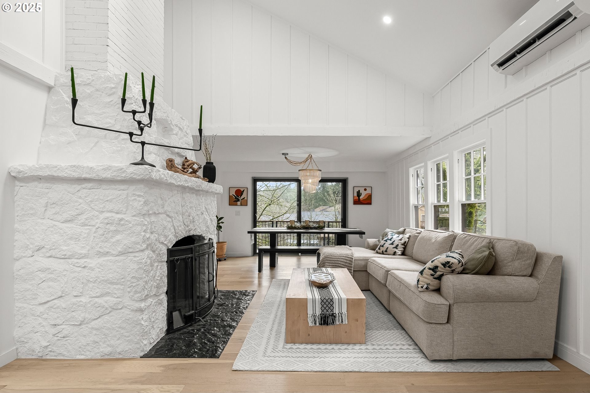 OPEN HOUSE SATURDAY OCTOBER 11th 1-3PM! Nestled among the trees on over 1.5 acres in Portland, this striking modern three-story home offers a perfect balance of natural serenity and sophisticated design. The exterior’s dark, moody tones contrast beautifully with the light and airy interior, where soaring vaulted ceilings, skylights, and expansive windows fill the space with natural light. The living room features a stunning stone fireplace as its centerpiece, while the dining area seamlessly connects to a chef’s kitchen with custom cabinetry, an island, built-in refrigerator, and sliding doors that open to a spacious deck for effortless indoor-outdoor living. A stylish half bath and a flexible main-level room—ideal as an office or sitting area—add to the home’s functionality. Upstairs, the luxurious primary suite impresses with vaulted ceilings, a skylight, a walk-in closet, and a spa-like ensuite bath featuring a double vanity and an oversized walk-in shower with dual shower heads. A second upstairs bedroom also includes its own ensuite bath, offering privacy and comfort. The lower level is designed for both relaxation and entertainment, with a temperature-controlled wine cellar, a bedroom, a full bath with a walk-in glass shower, a laundry room, and a spacious bonus room complete with a wet bar—perfect for gatherings. Outside, a detached two-car garage includes a dedicated gym area, completing this exceptional property. Designed with meticulous attention to detail and surrounded by the beauty of the Pacific Northwest, this residence offers a rare blend of modern luxury and tranquil seclusion.