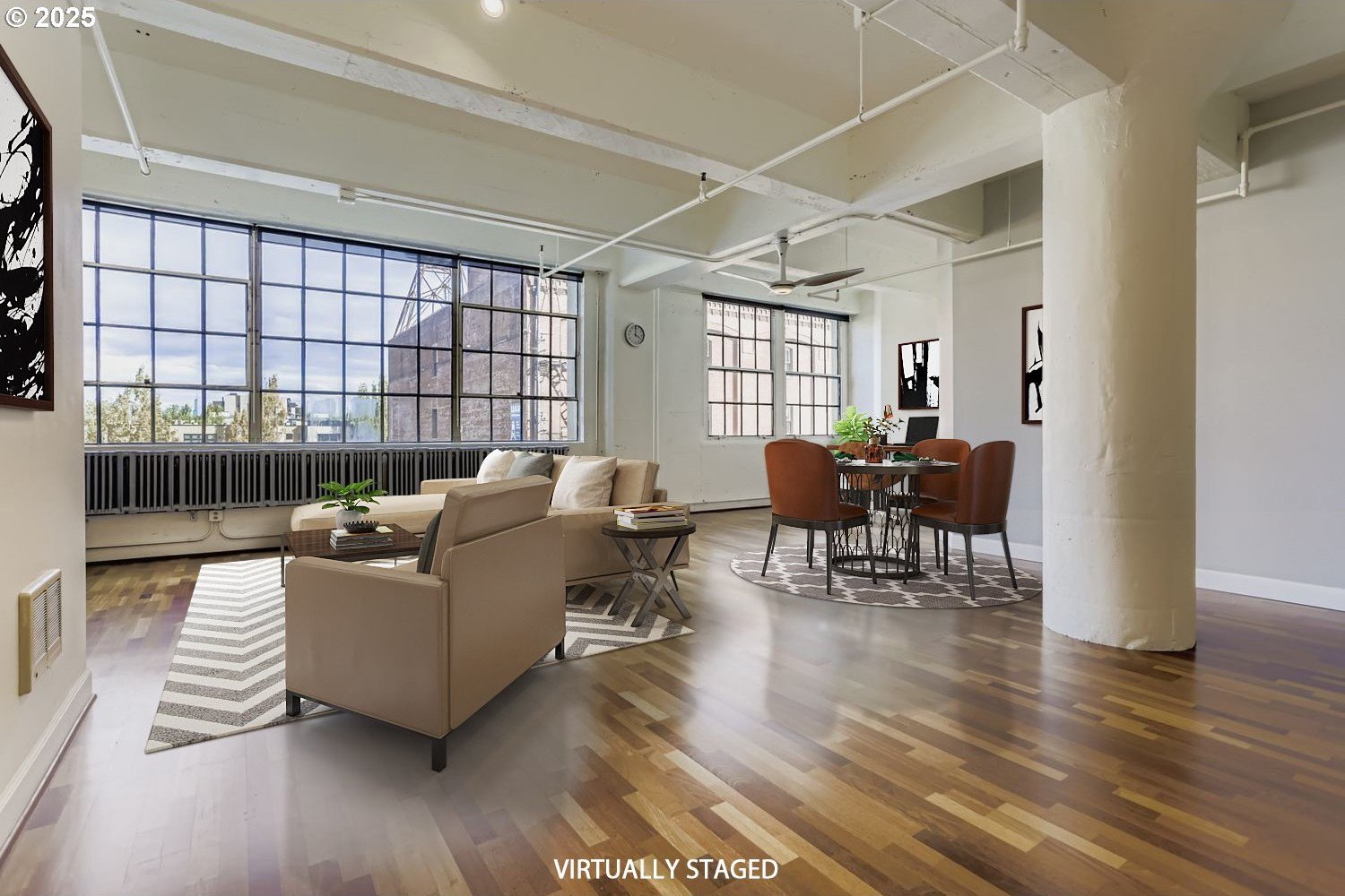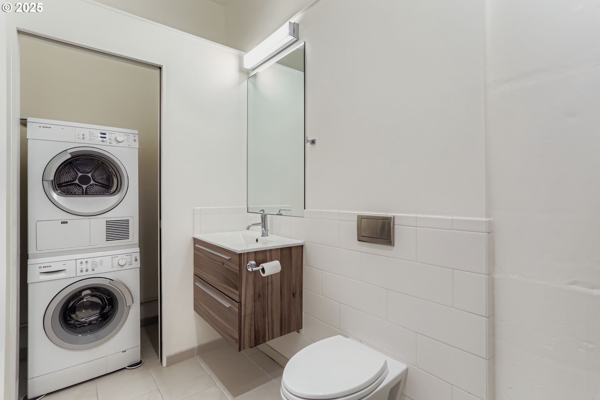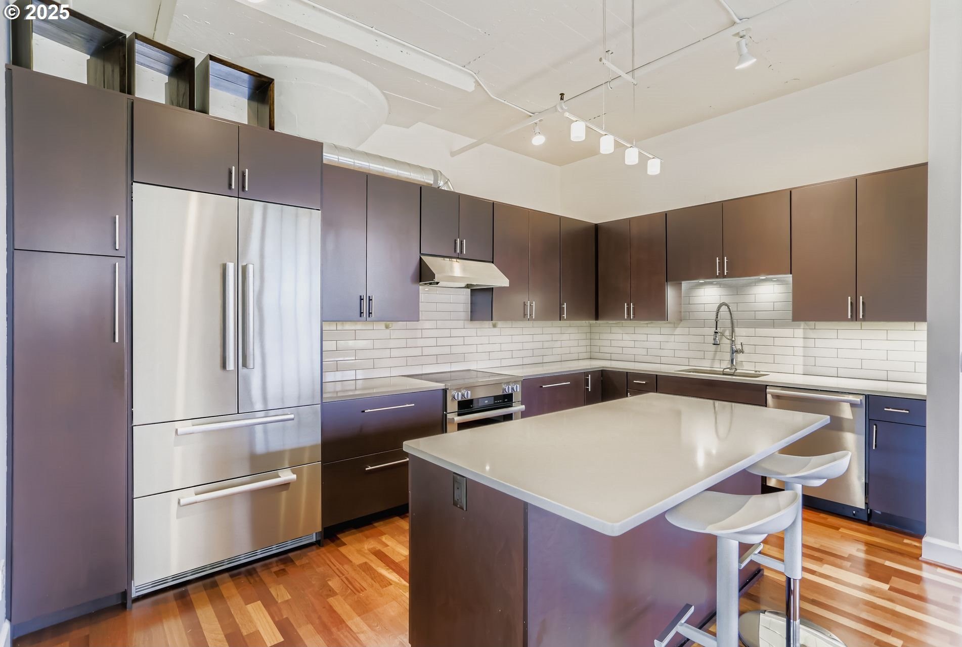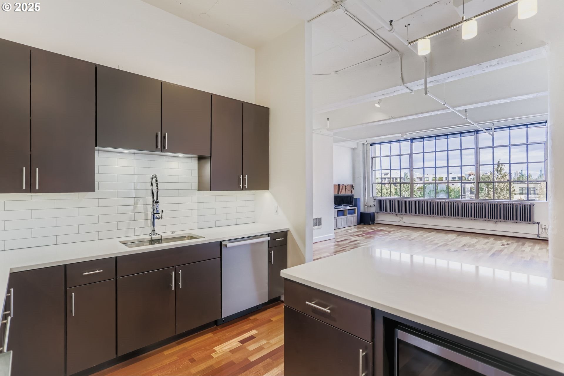 Welcome to urban sophistication at 1314 NW Irving #303, a truly unique industrial loft perched in the heart of Portland's historic Pearl District. This NE corner condo allows for big city views framed by a wall of windows and complemented by high ceilings. The fully remodeled kitchen features quartz countertops, a large island, and premium Miele appliances, including an induction range. The condo includes a fully enclosed bedroom with a luxurious ensuite bathroom and a walk-in California closet. The spacious living area allows for living, dining and work space plus a second full bathroom. Perfect for entertaining, the expansive rooftop deck offers sweeping city and mountain views. Just steps away from world class coffee, restaurants and shopping in the Pearl. Enjoy the monthly First Thursday art walk out your front door in this vibrant community. With zoning that caters to both residential and professional needs, this loft is your canvas for city living at its finest.