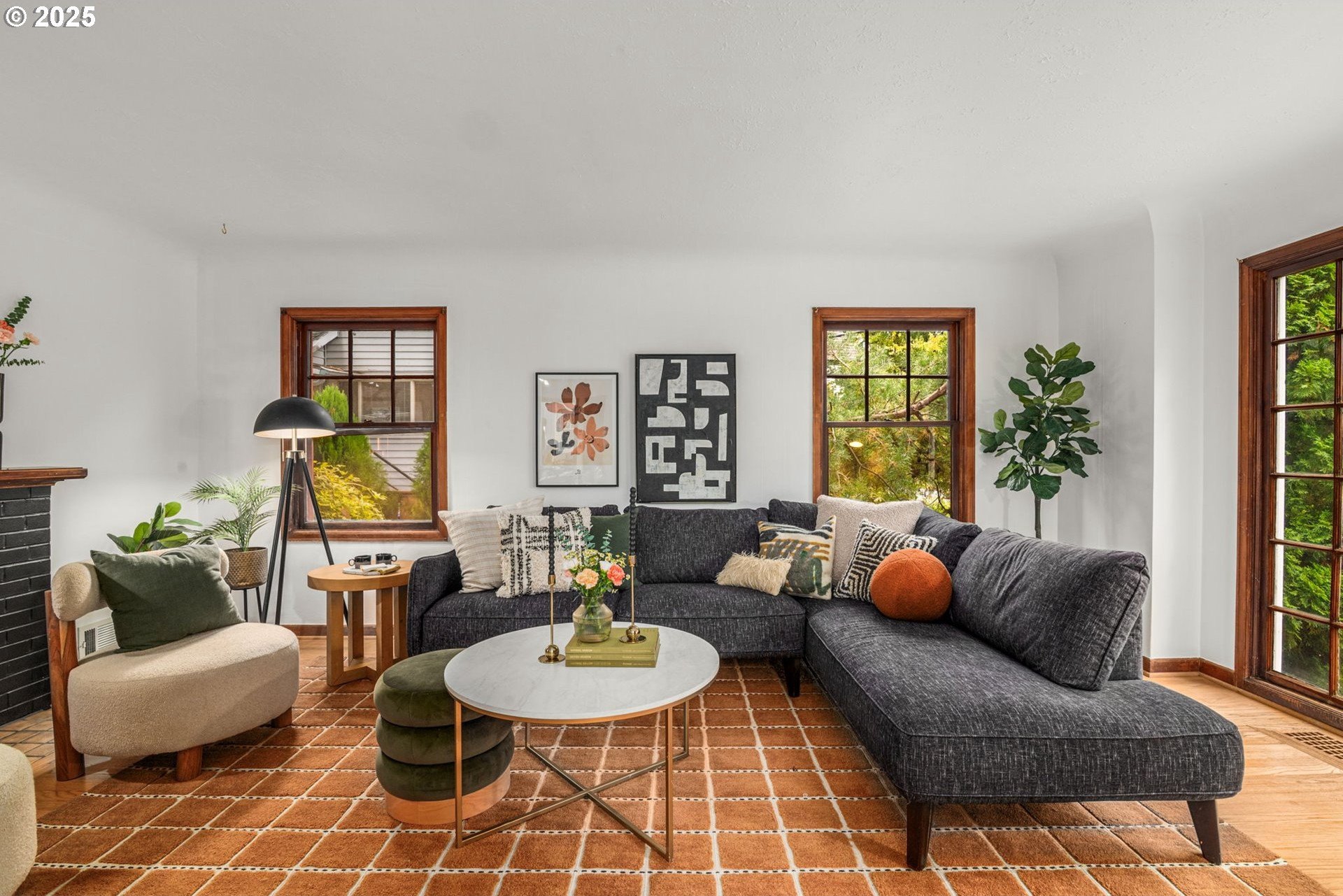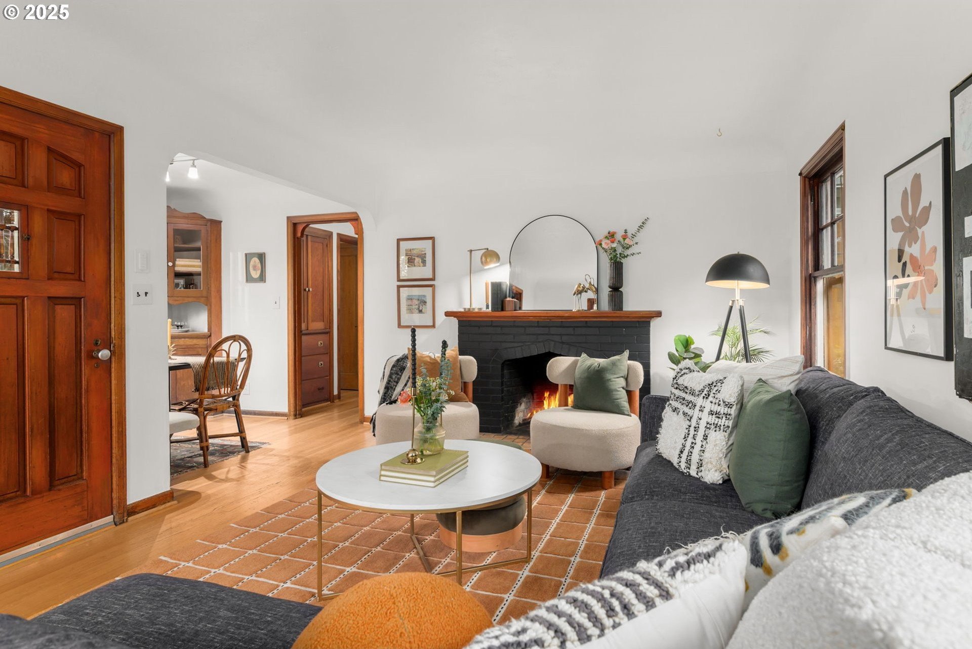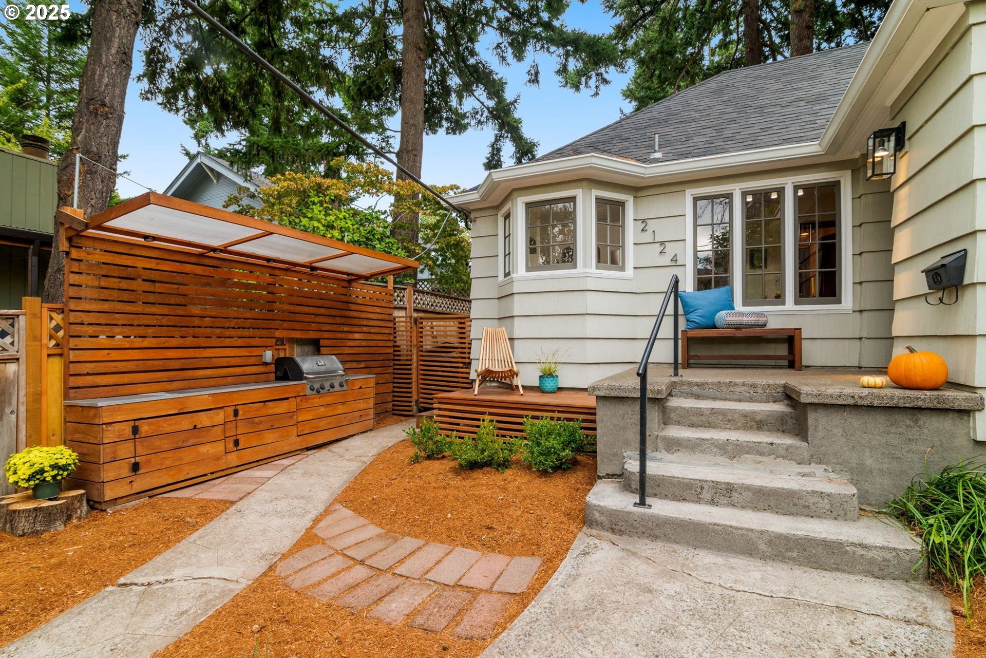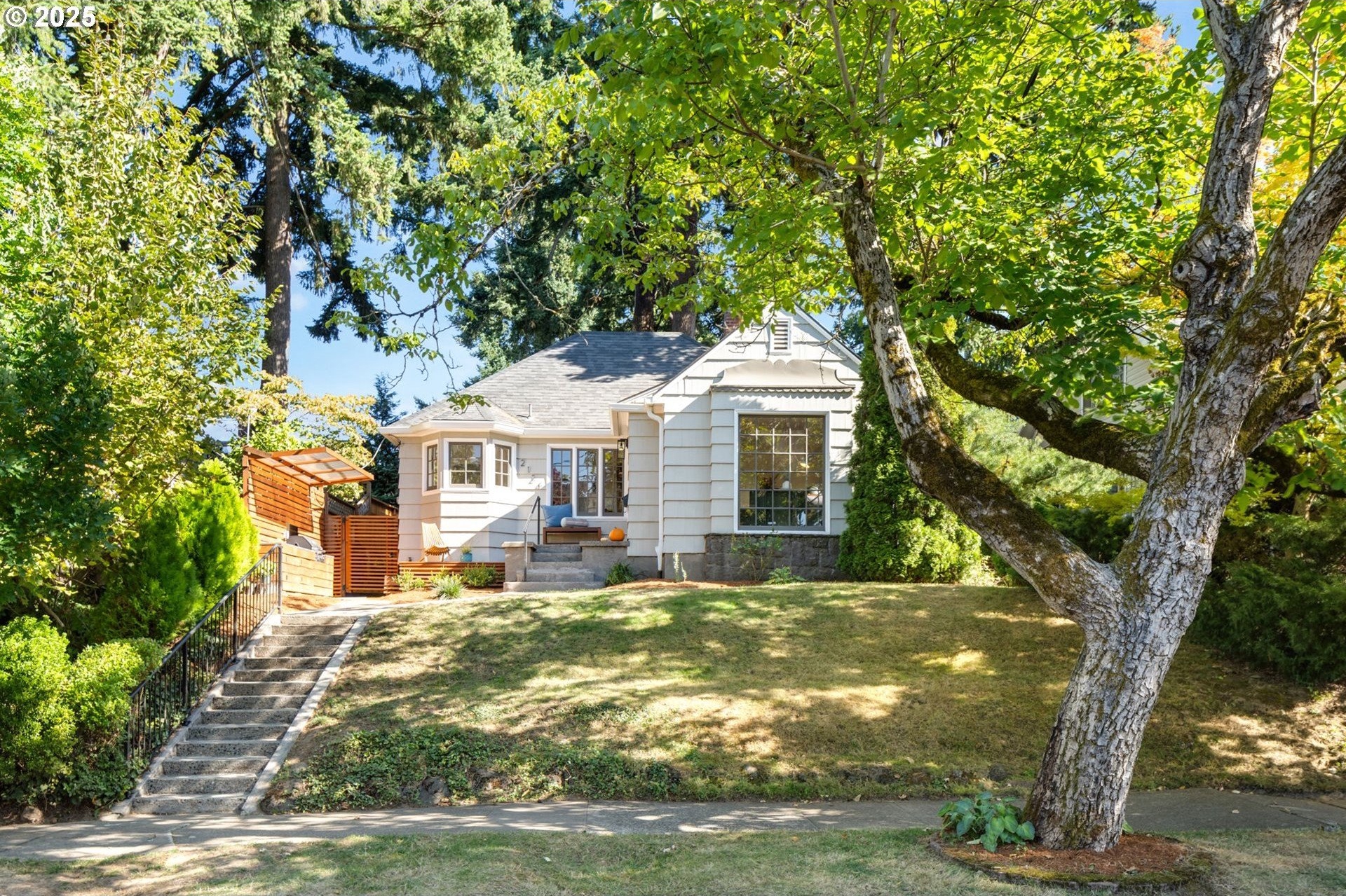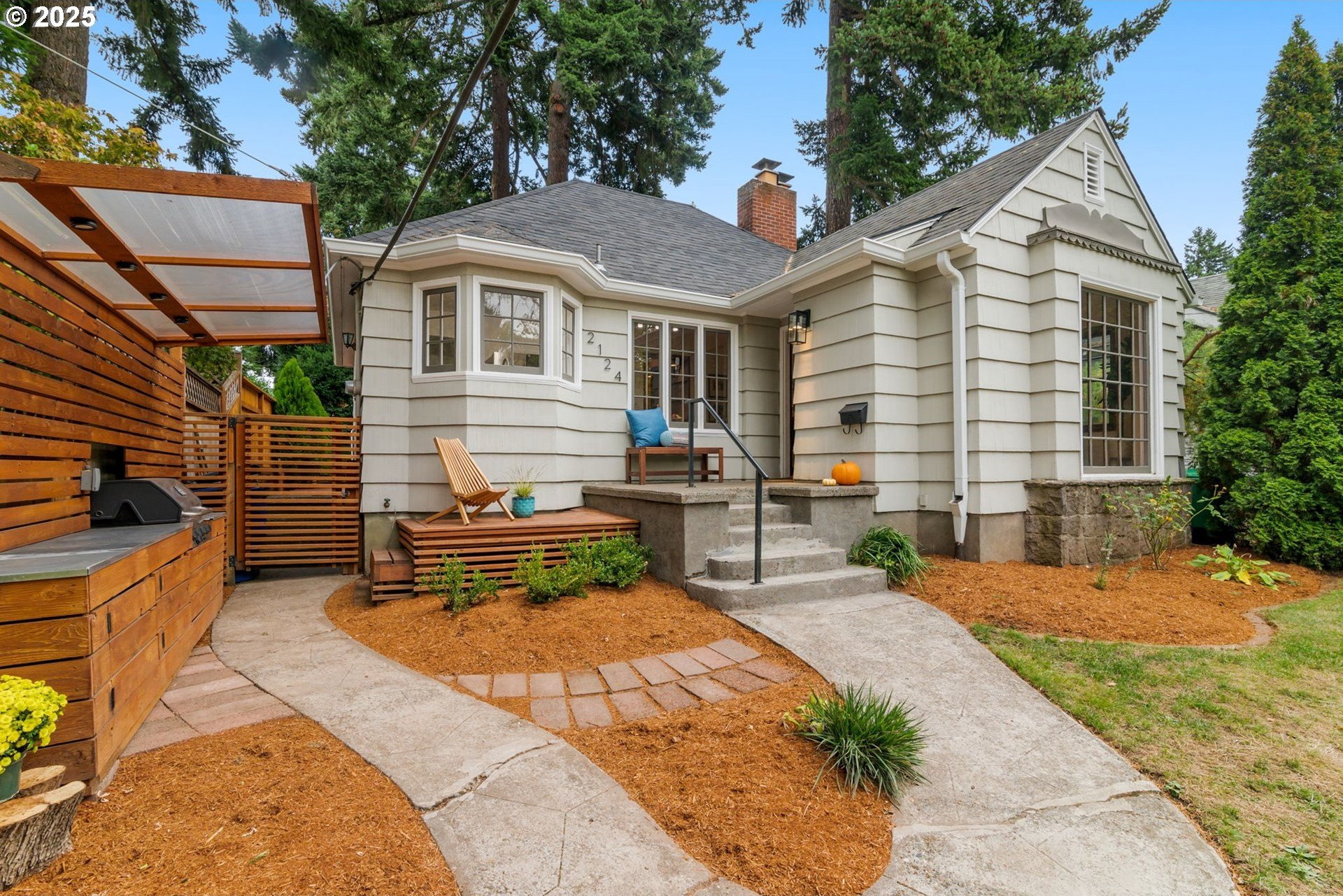In the heart of Portland’s Mt. Tabor neighborhood, this charming cottage with a Tudor twist offers style, warmth, and walkability. Set above the street for privacy, the home feels bright and airy throughout, with large windows that frame leafy views and fill every room with natural light. Original woodwork, coved ceilings, and custom built-ins showcase timeless craftsmanship, while oak floors add warmth and character. The main level features three bedrooms—including an oversized primary—and a stylish bathroom with high-end fixtures and heated tile floors. The kitchen is bright and efficient, with stainless steel appliances and bay windows overlooking the front yard. Downstairs, the spacious basement includes a cozy family room with a fireplace, a half bath, home gym/flex space, laundry area, and generous storage. Outdoor living is exceptional: the front yard features a covered outdoor kitchen with slate counters and a built-in gas grill, plus a welcoming porch and deck perfect for morning coffee or evening sunsets. Out back, a large covered deck, playhouse, and peaceful park-like setting invite relaxation year-round. With a newer roof, gutters, and furnace, this home is move-in ready and ideally located—just blocks from Mt. Tabor Park, coffee shops, restaurants, and top-rated schools. [Home Energy Score = 3. HES Report at https://rpt.greenbuildingregistry.com/hes/OR10026619]