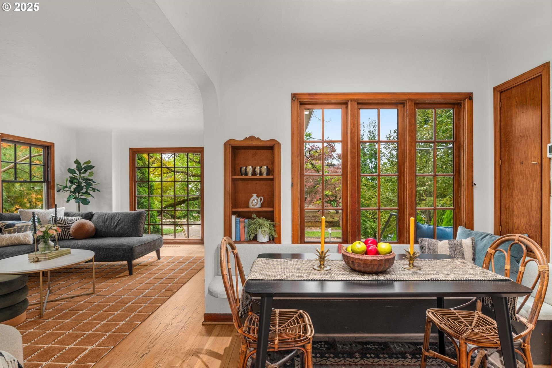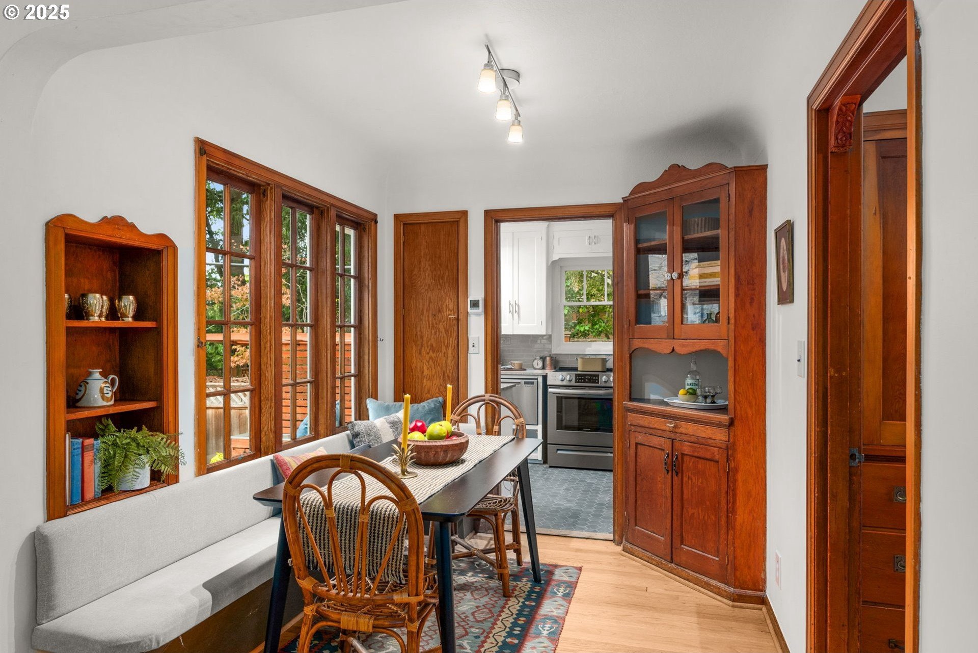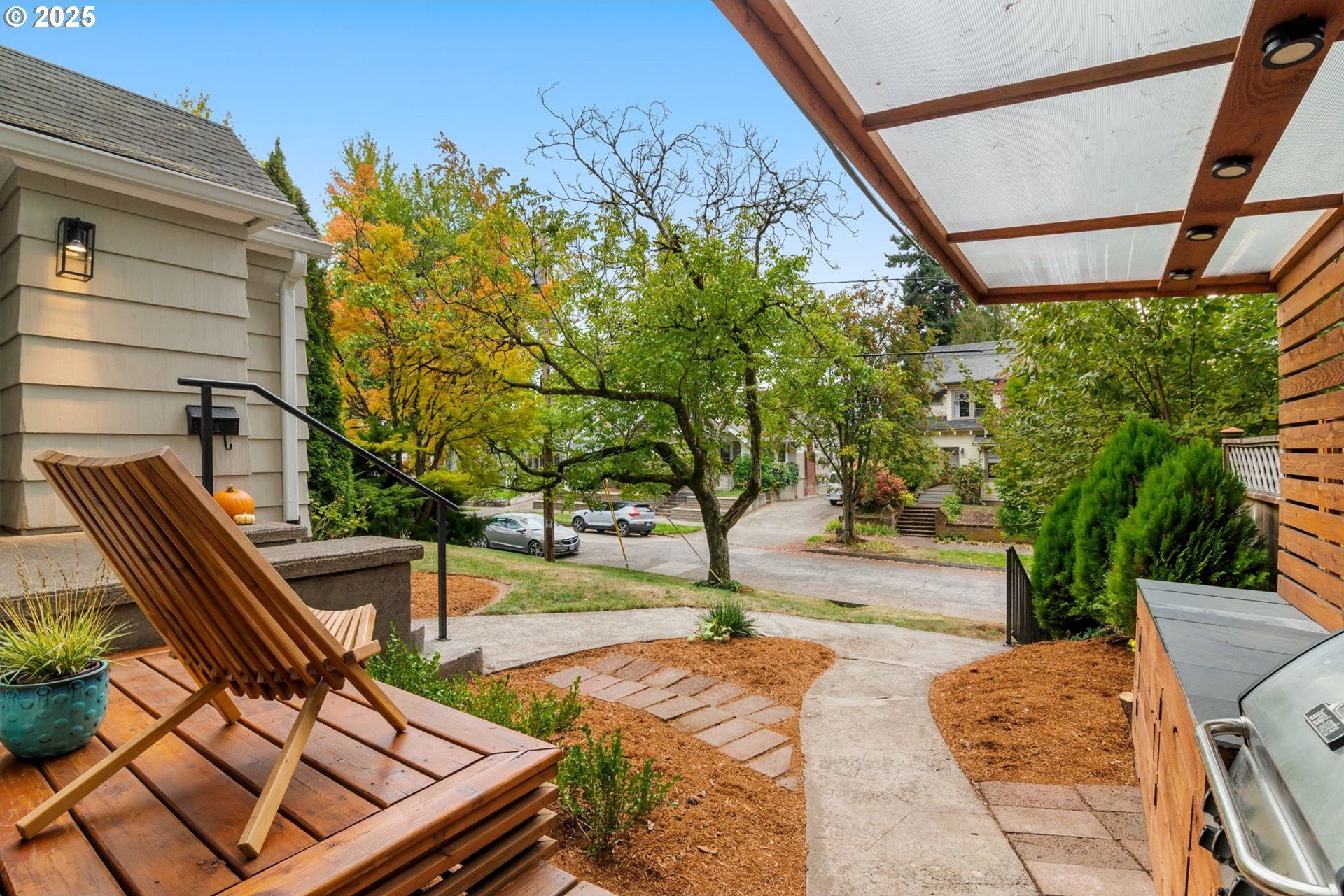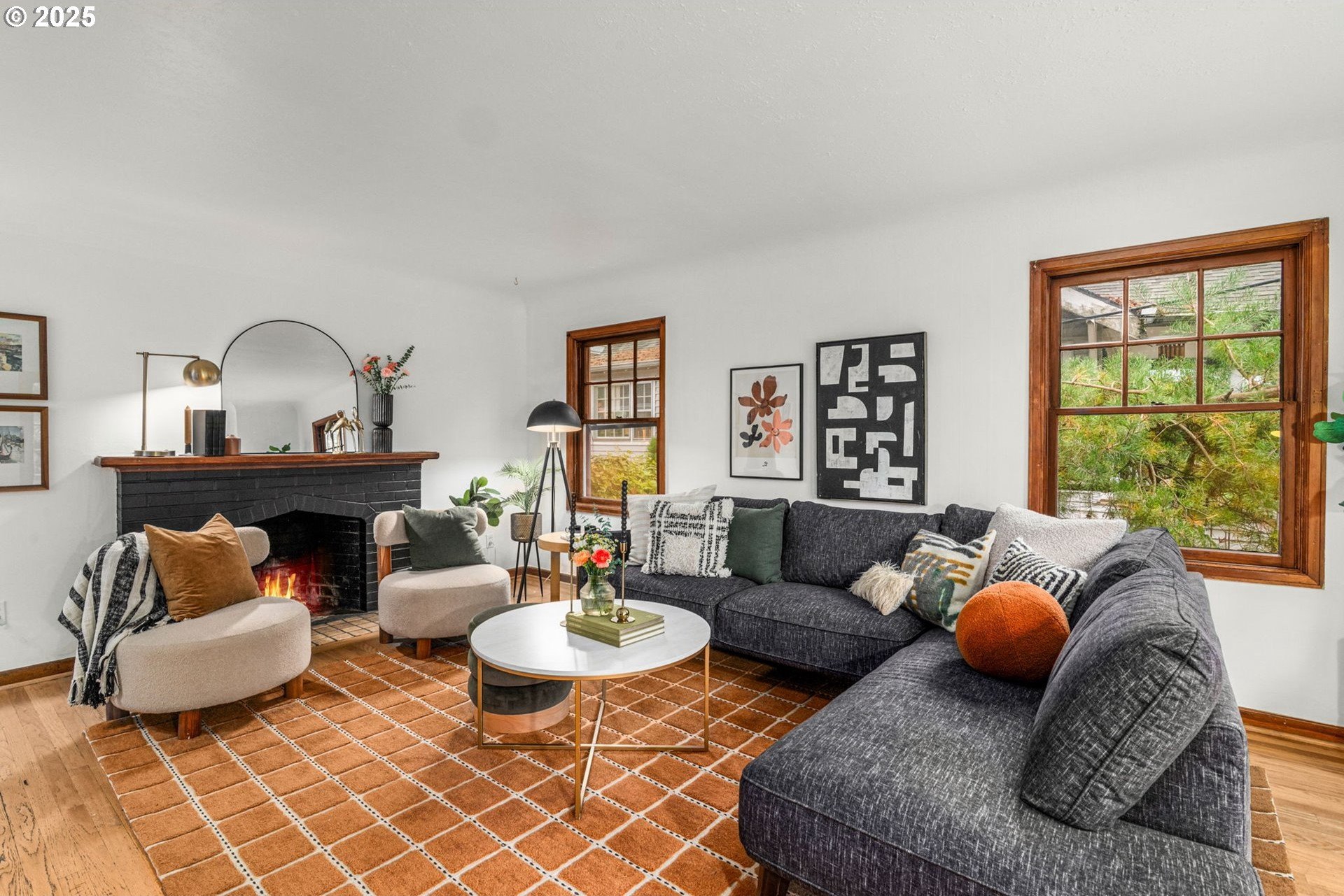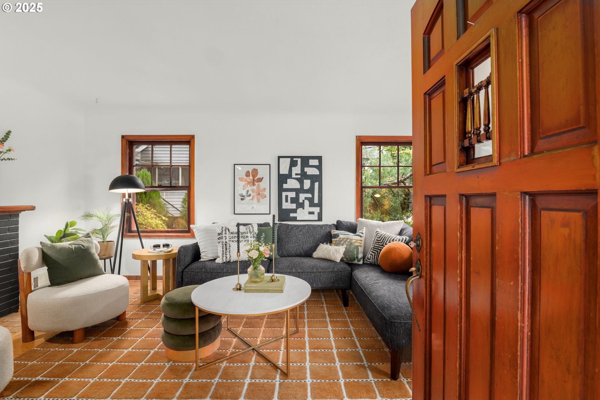 In the heart of Portland’s Mt. Tabor neighborhood, this charming cottage with a Tudor twist offers style, warmth, and walkability. Set above the street for privacy, the home feels bright and airy throughout, with large windows that frame leafy views and fill every room with natural light. Original woodwork, coved ceilings, and custom built-ins showcase timeless craftsmanship, while oak floors add warmth and character. The main level features three bedrooms—including an oversized primary—and a stylish bathroom with high-end fixtures and heated tile floors. The kitchen is bright and efficient, with stainless steel appliances and bay windows overlooking the front yard. Downstairs, the spacious basement includes a cozy family room with a fireplace, a half bath, home gym/flex space, laundry area, and generous storage. Outdoor living is exceptional: the front yard features a covered outdoor kitchen with slate counters and a built-in gas grill, plus a welcoming porch and deck perfect for morning coffee or evening sunsets. Out back, a large covered deck, playhouse, and peaceful park-like setting invite relaxation year-round. With a newer roof, gutters, and furnace, this home is move-in ready and ideally located—just blocks from Mt. Tabor Park, coffee shops, restaurants, and top-rated schools. [Home Energy Score = 3. HES Report at https://rpt.greenbuildingregistry.com/hes/OR10026619]