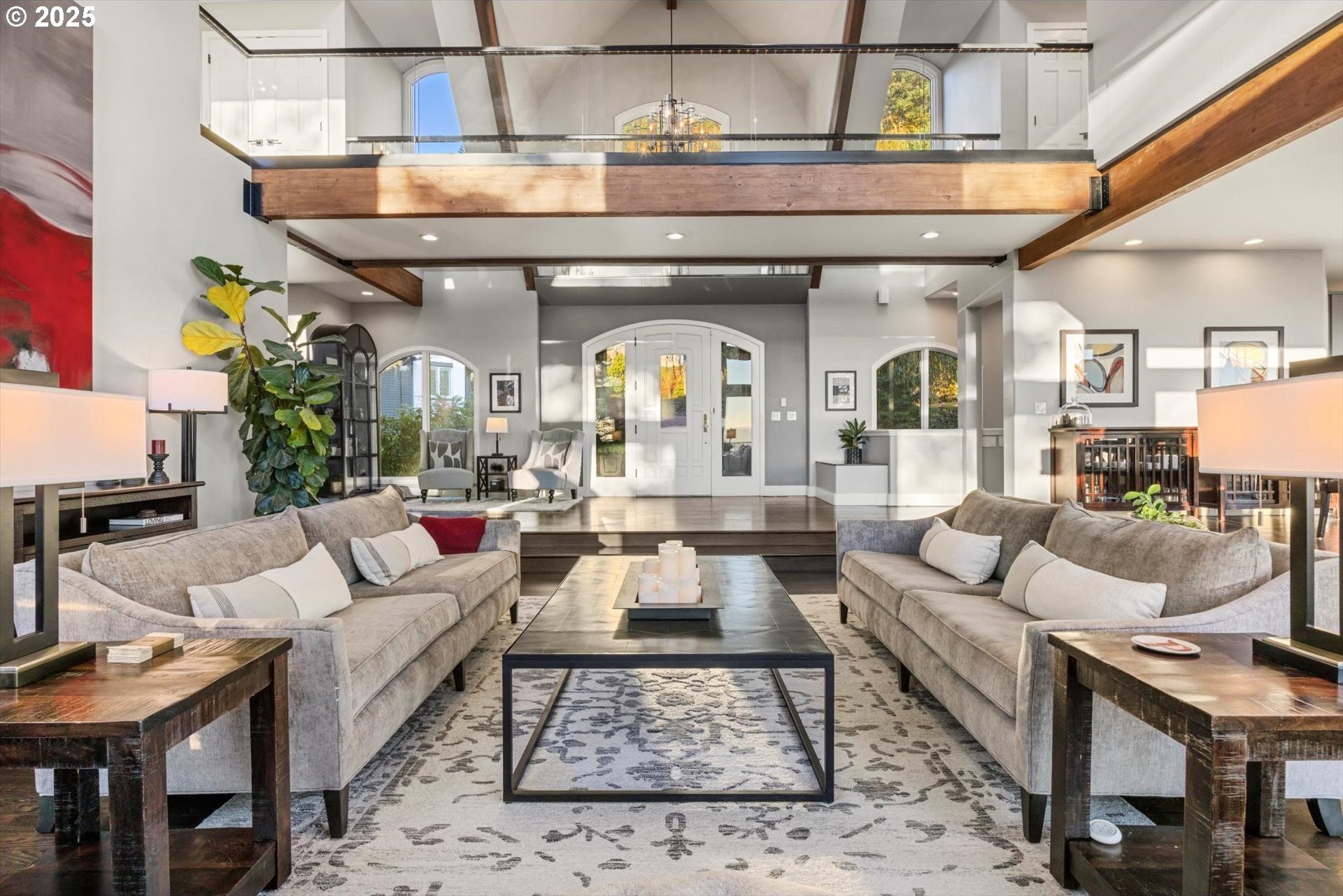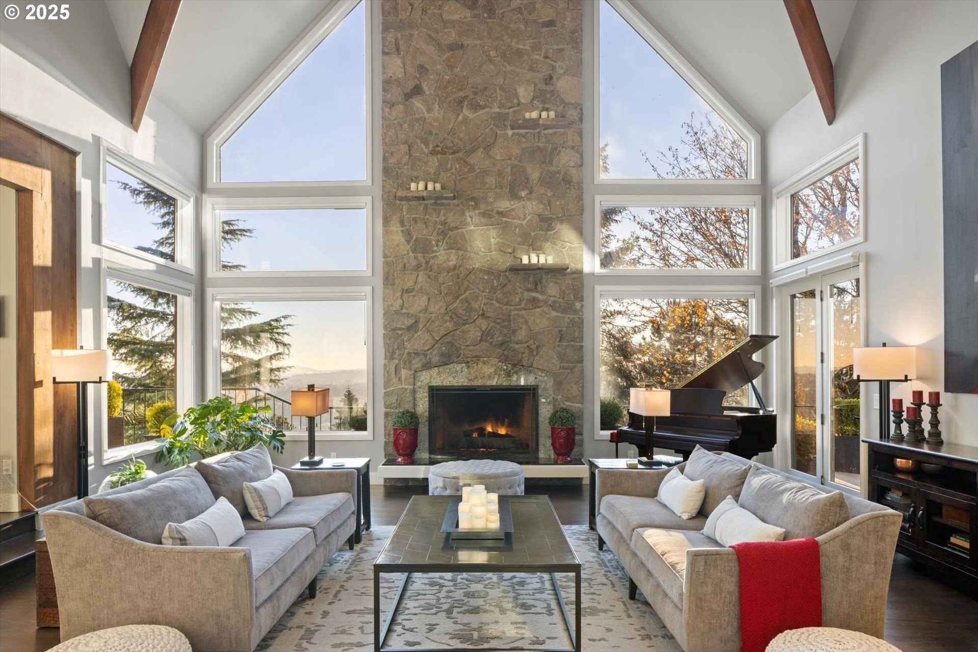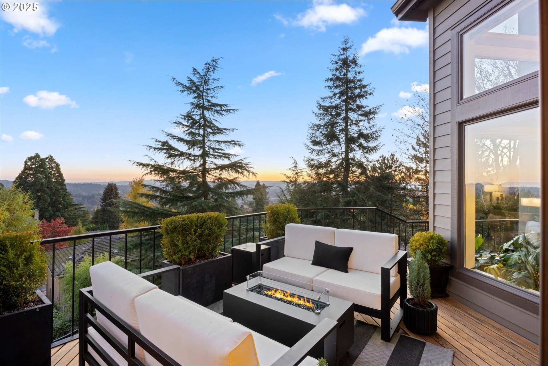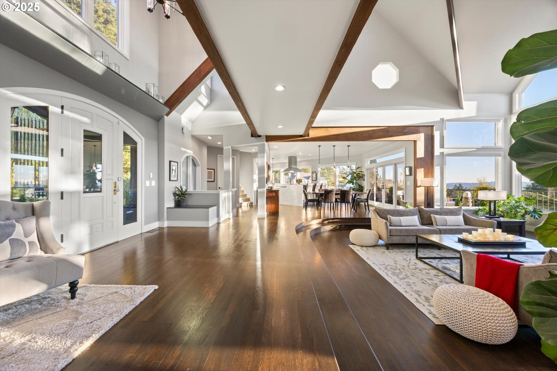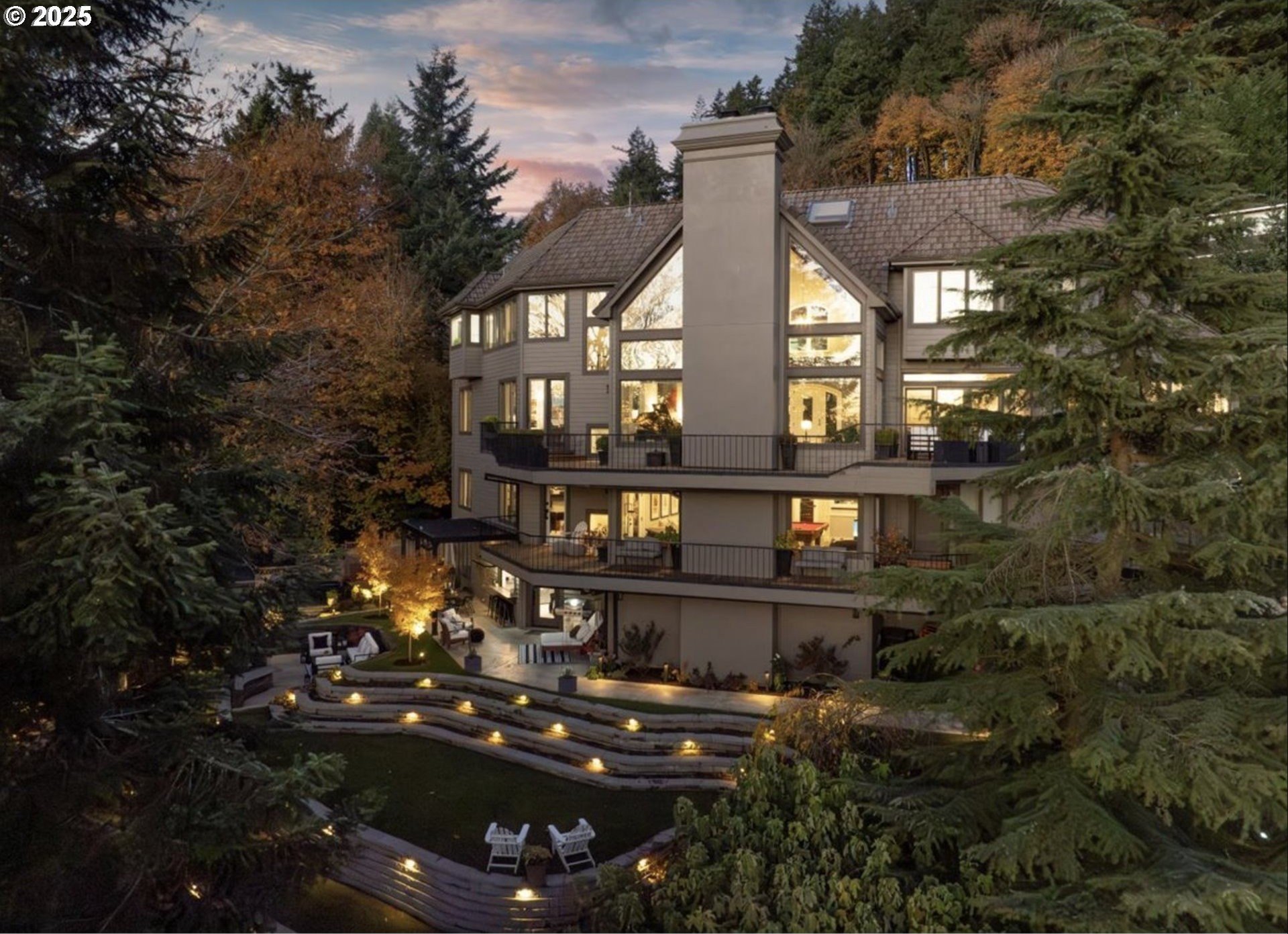 Welcome to an extraordinary retreat in the coveted, gated enclave of West Hills View Estates—where panoramic sunsets, high design, and thoughtful functionality converge. This reimagined residence offers an exceptional blend of grand scale, refined detail, and seamless indoor-outdoor living. Step into the dramatic mezzanine-level great room, where soaring 25-foot beamed ceilings and expansive windows create a stunning first impression. The open-concept chef’s kitchen is outfitted with premium Carrera quartz surfaces and top-tier appliances from Wolf, Miele, and SubZero—perfect for both everyday living and elevated entertaining. Experience elegant touches throughout, from sleek hardwood floors and Andersen windows to a luxe primary spa-style bath. Designed with versatility in mind, the home includes ADA-accessible guest accommodations complete with a second kitchenette, ideal for multi-generational living or long-term guests. Host effortlessly on the elevated deck and heated patio, with a nearby outdoor fireplace offering year-round ambiance. The lower level invites relaxation with a plush media lounge, wine cellar, and a soundproof flex room—perfect for music, art, or studio needs. Additional highlights include dual laundry areas and abundant space for customization. Enjoy the privacy of a boutique neighborhood of luxury estates, just minutes from Portland’s best—OHSU, the Multnomah Athletic Club, top-rated public and private schools, and a wealth of fine dining and cultural amenities. This is more than a home—it’s a lifestyle defined by reimagined vision, comfort, sophistication, and possibility. [Home Energy Score = 2. HES Report at https://rpt.greenbuildingregistry.com/hes/OR10233983]