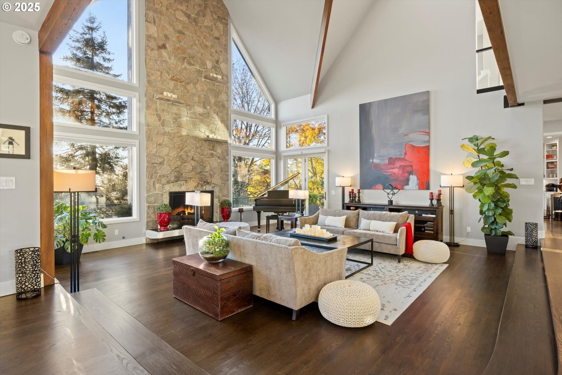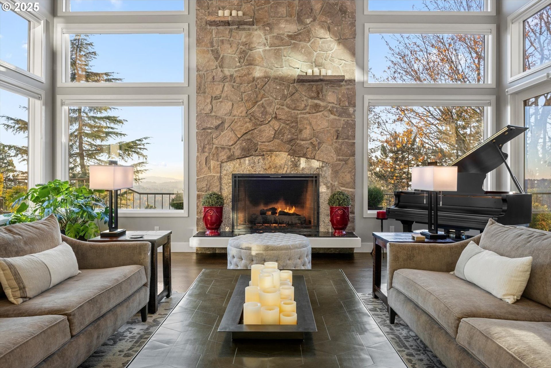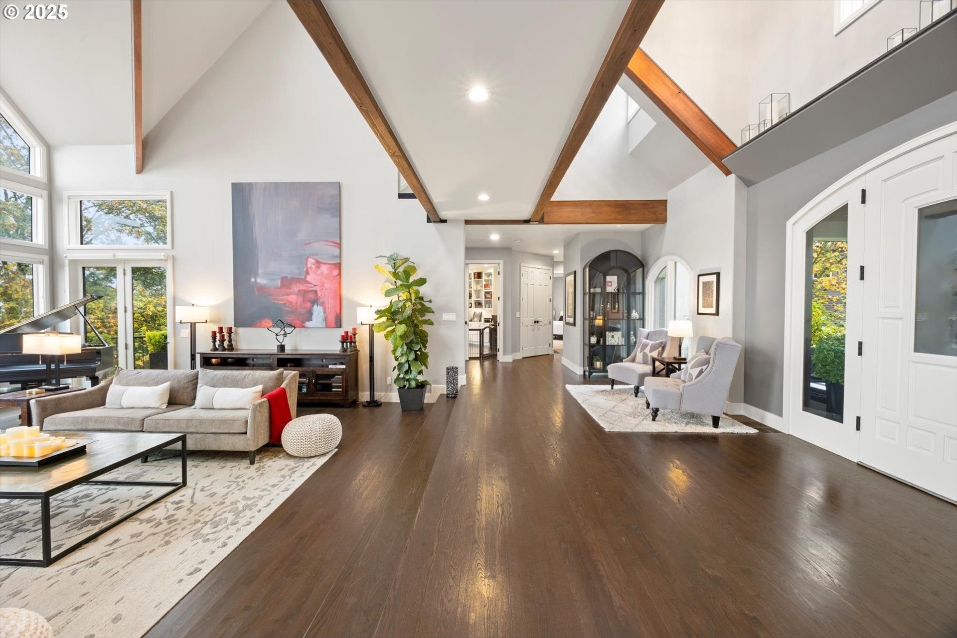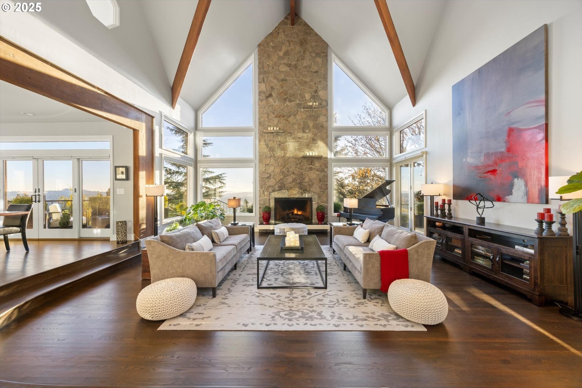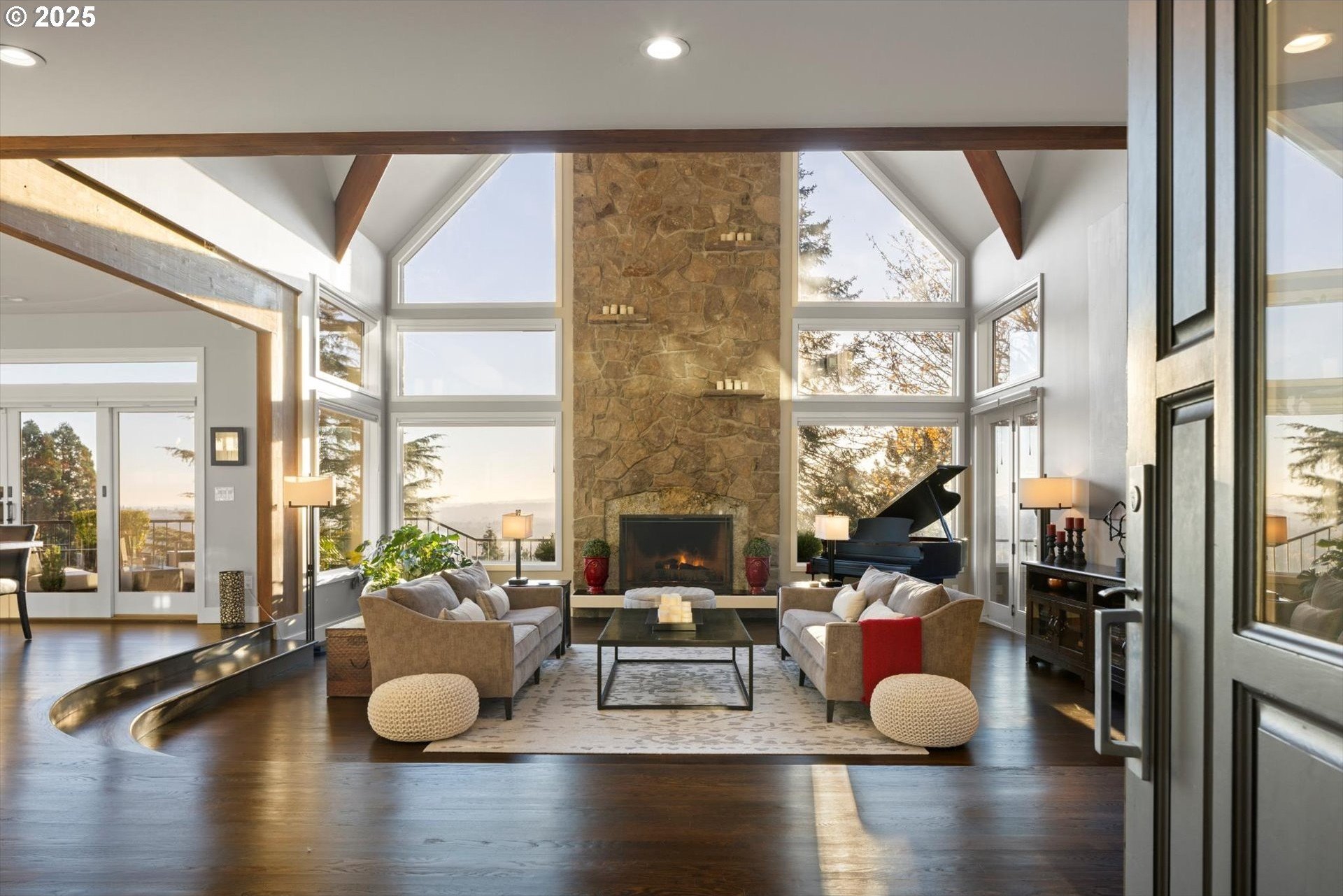 Welcome to an extraordinary retreat in the coveted, gated enclave of West Hills View Estates—where panoramic sunsets, high design, and thoughtful functionality converge. This reimagined residence offers an exceptional blend of grand scale, refined detail, and seamless indoor-outdoor living. Step into the dramatic mezzanine-level great room, where soaring 25-foot beamed ceilings and expansive windows create a stunning first impression. The open-concept chef’s kitchen is outfitted with premium Carrera quartz surfaces and top-tier appliances from Wolf, Miele, and SubZero—perfect for both everyday living and elevated entertaining. Experience elegant touches throughout, from sleek hardwood floors and Andersen windows to a luxe primary spa-style bath. Designed with versatility in mind, the home includes ADA-accessible guest accommodations complete with a second kitchenette, ideal for multi-generational living or long-term guests. Host effortlessly on the elevated deck and heated patio, with a nearby outdoor fireplace offering year-round ambiance. The lower level invites relaxation with a plush media lounge, wine cellar, and a soundproof flex room—perfect for music, art, or studio needs. Additional highlights include dual laundry areas and abundant space for customization. Enjoy the privacy of a boutique neighborhood of luxury estates, just minutes from Portland’s best—OHSU, the Multnomah Athletic Club, top-rated public and private schools, and a wealth of fine dining and cultural amenities. This is more than a home—it’s a lifestyle defined by reimagined vision, comfort, sophistication, and possibility. [Home Energy Score = 2. HES Report at https://rpt.greenbuildingregistry.com/hes/OR10233983]
