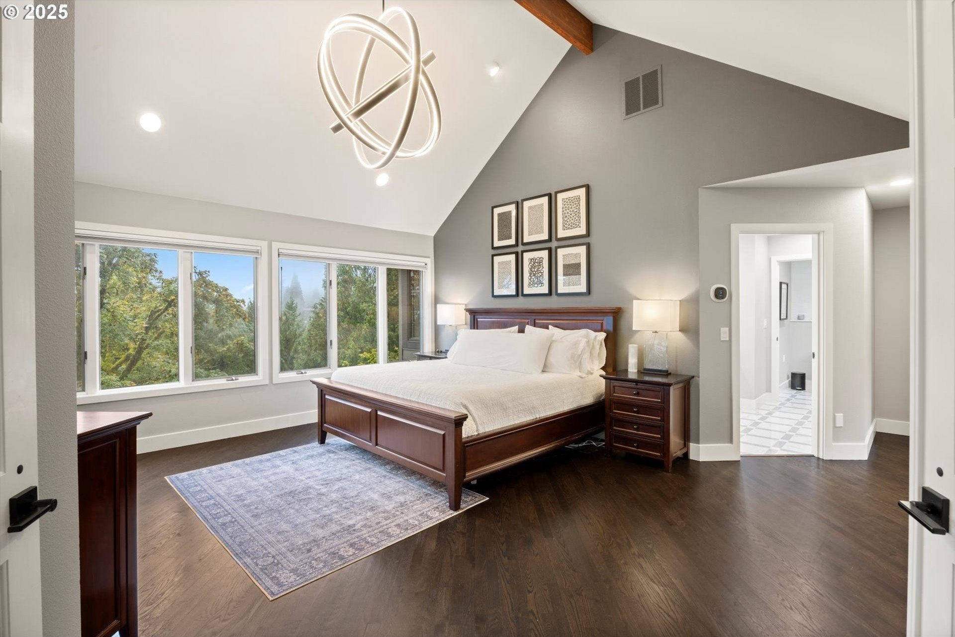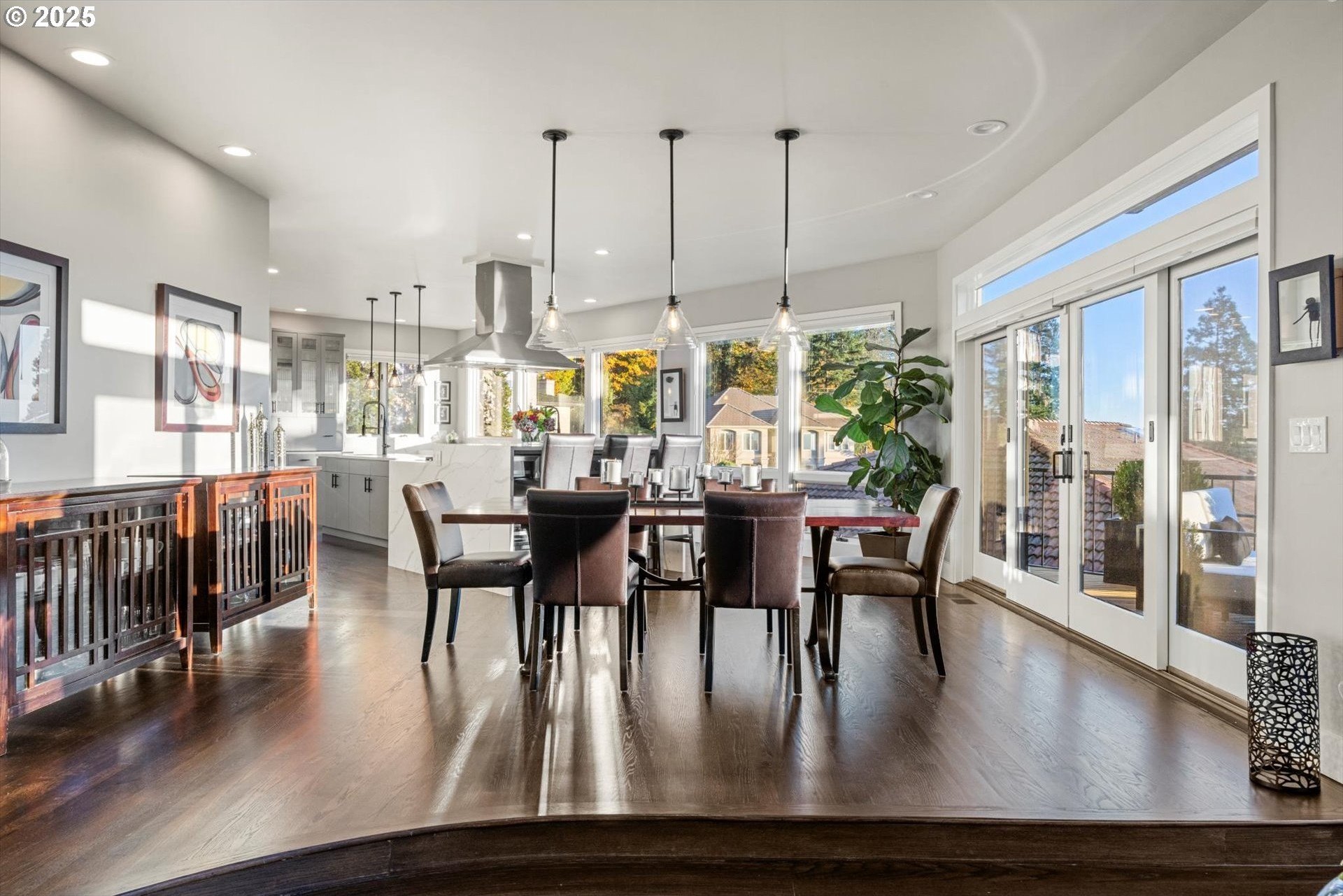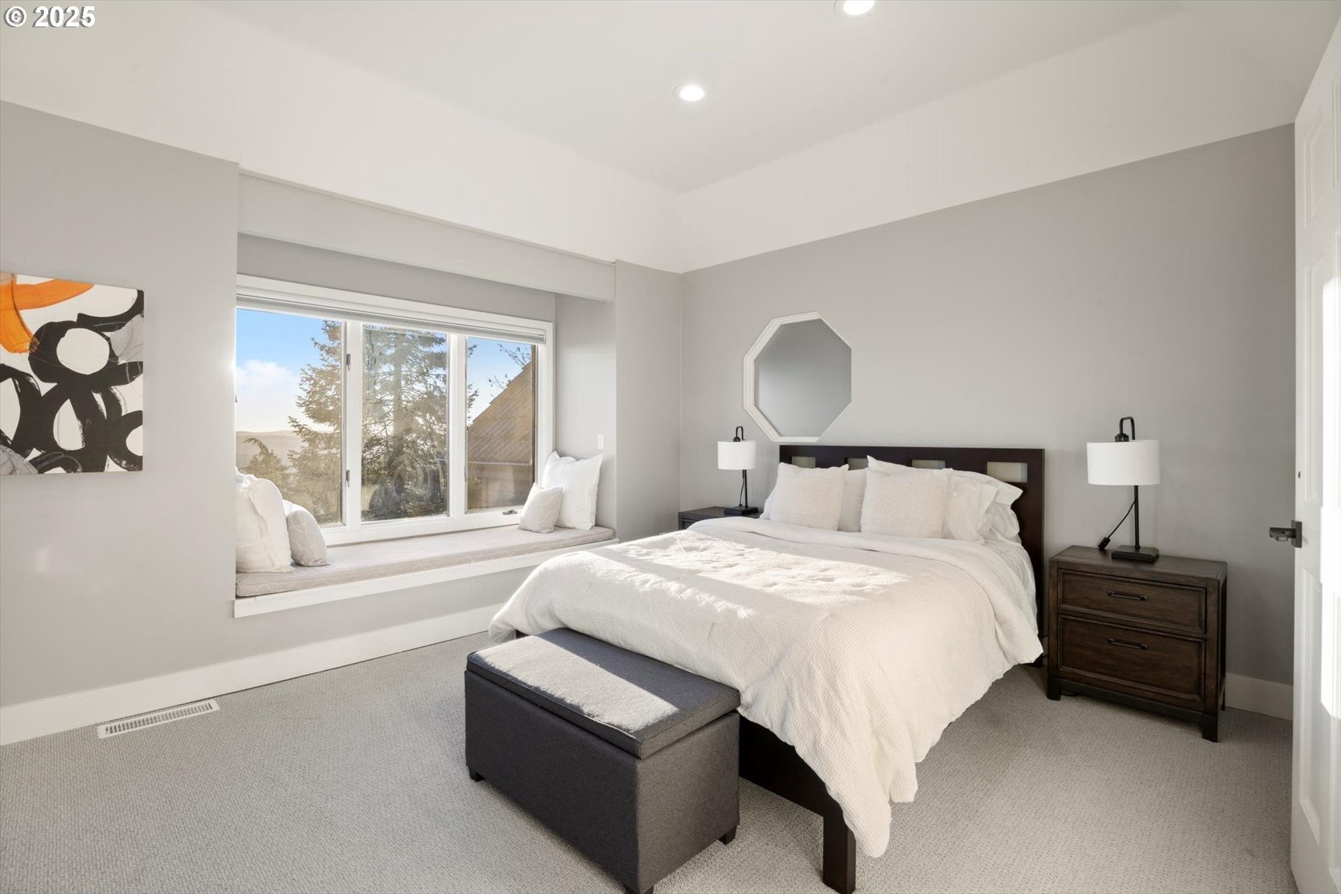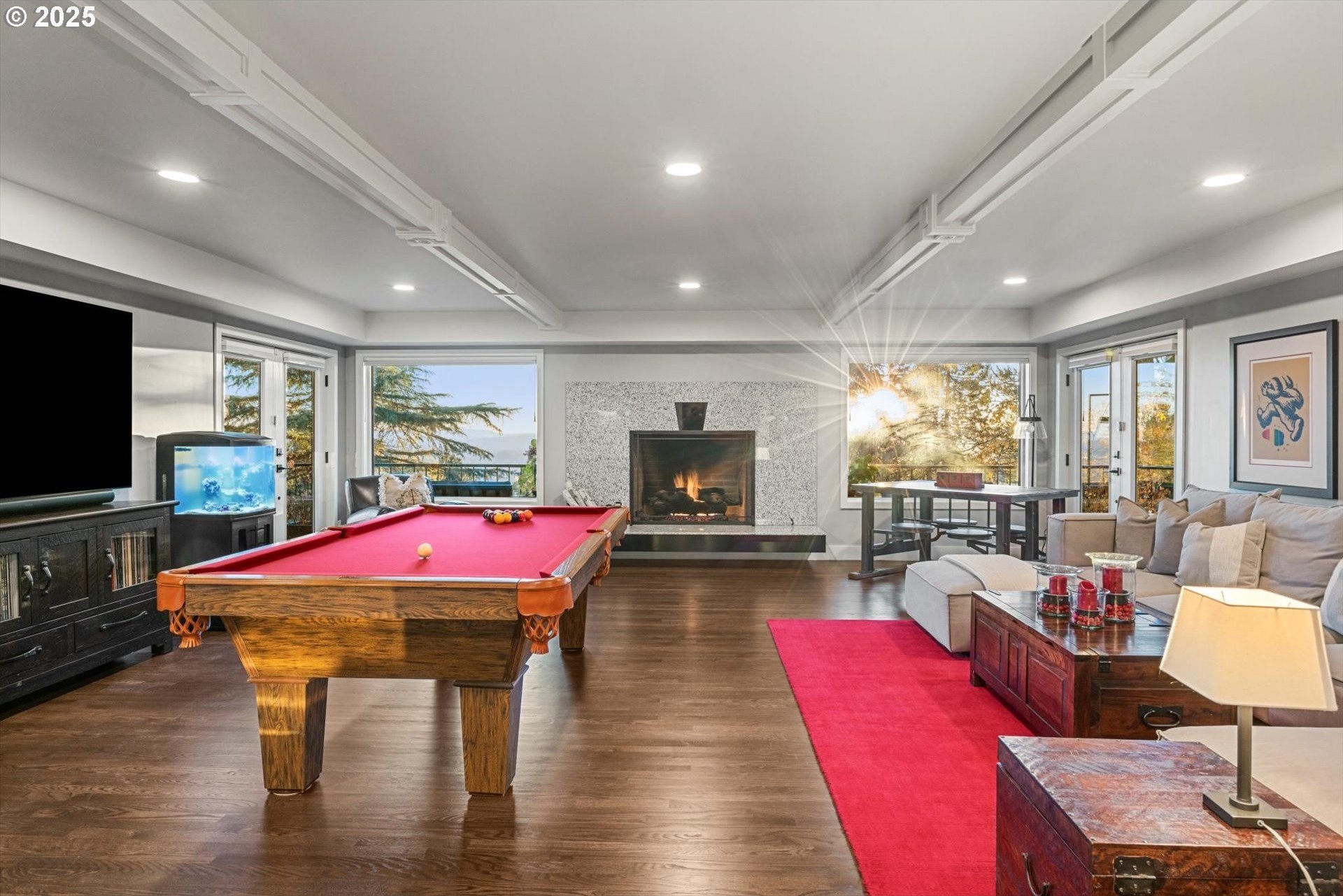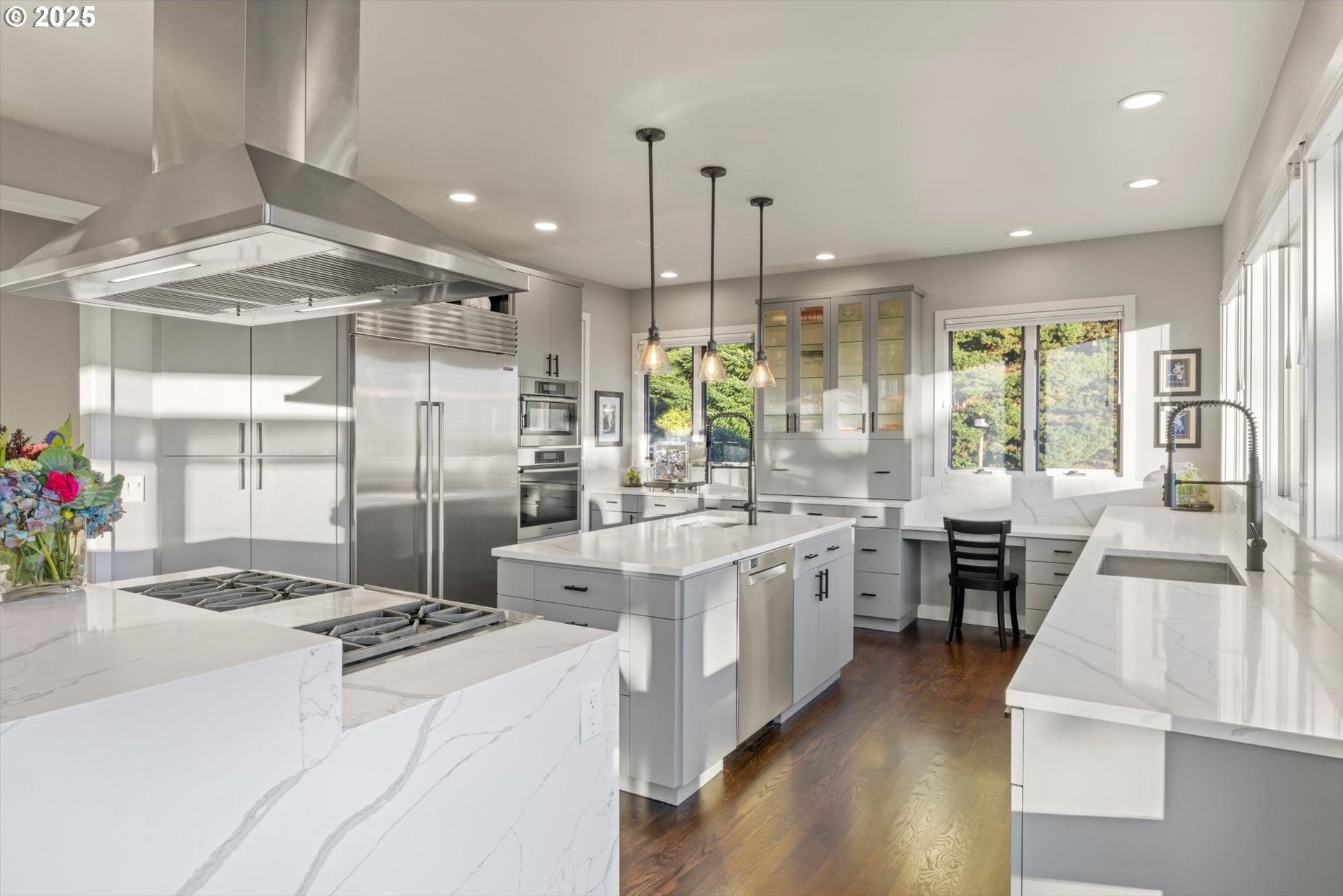 Welcome to an extraordinary retreat in the coveted, gated enclave of West Hills View Estates—where panoramic sunsets, high design, and thoughtful functionality converge. This reimagined residence offers an exceptional blend of grand scale, refined detail, and seamless indoor-outdoor living. Step into the dramatic mezzanine-level great room, where soaring 25-foot beamed ceilings and expansive windows create a stunning first impression. The open-concept chef’s kitchen is outfitted with premium Carrera quartz surfaces and top-tier appliances from Wolf, Miele, and SubZero—perfect for both everyday living and elevated entertaining. Experience elegant touches throughout, from sleek hardwood floors and Andersen windows to a luxe primary spa-style bath. Designed with versatility in mind, the home includes ADA-accessible guest accommodations complete with a second kitchenette, ideal for multi-generational living or long-term guests. Host effortlessly on the elevated deck and heated patio, with a nearby outdoor fireplace offering year-round ambiance. The lower level invites relaxation with a plush media lounge, wine cellar, and a soundproof flex room—perfect for music, art, or studio needs. Additional highlights include dual laundry areas and abundant space for customization. Enjoy the privacy of a boutique neighborhood of luxury estates, just minutes from Portland’s best—OHSU, the Multnomah Athletic Club, top-rated public and private schools, and a wealth of fine dining and cultural amenities. This is more than a home—it’s a lifestyle defined by reimagined vision, comfort, sophistication, and possibility. [Home Energy Score = 2. HES Report at https://rpt.greenbuildingregistry.com/hes/OR10233983]