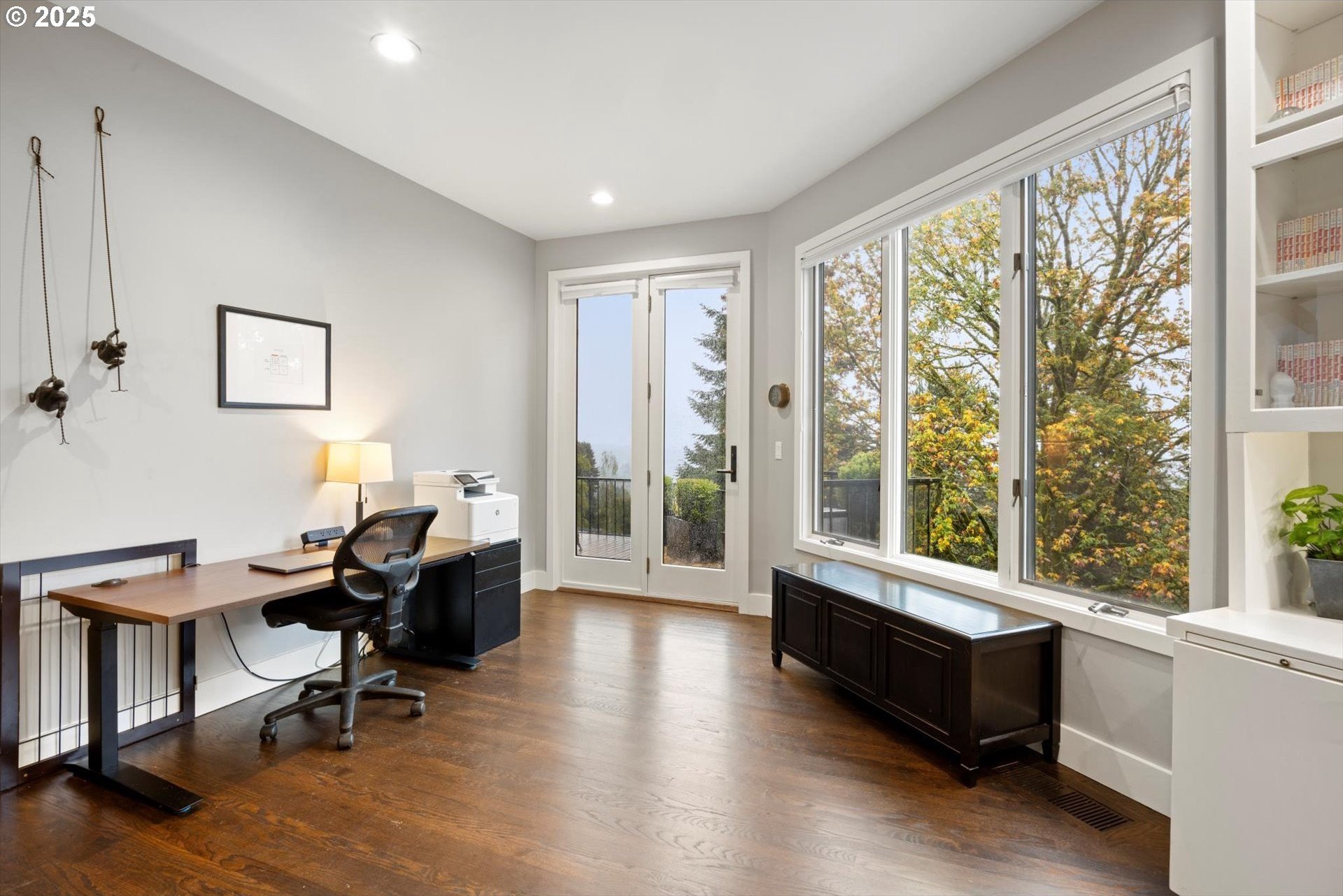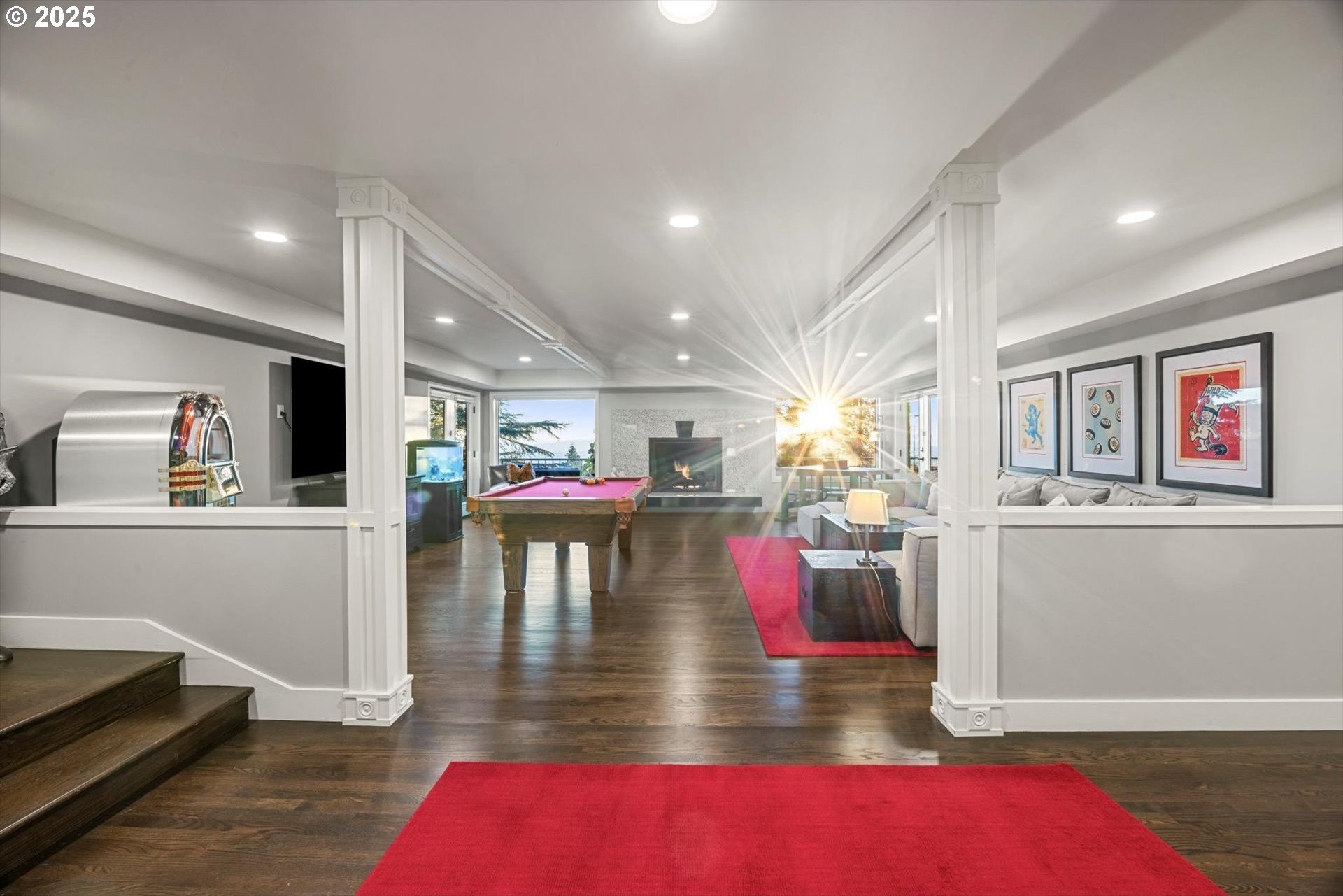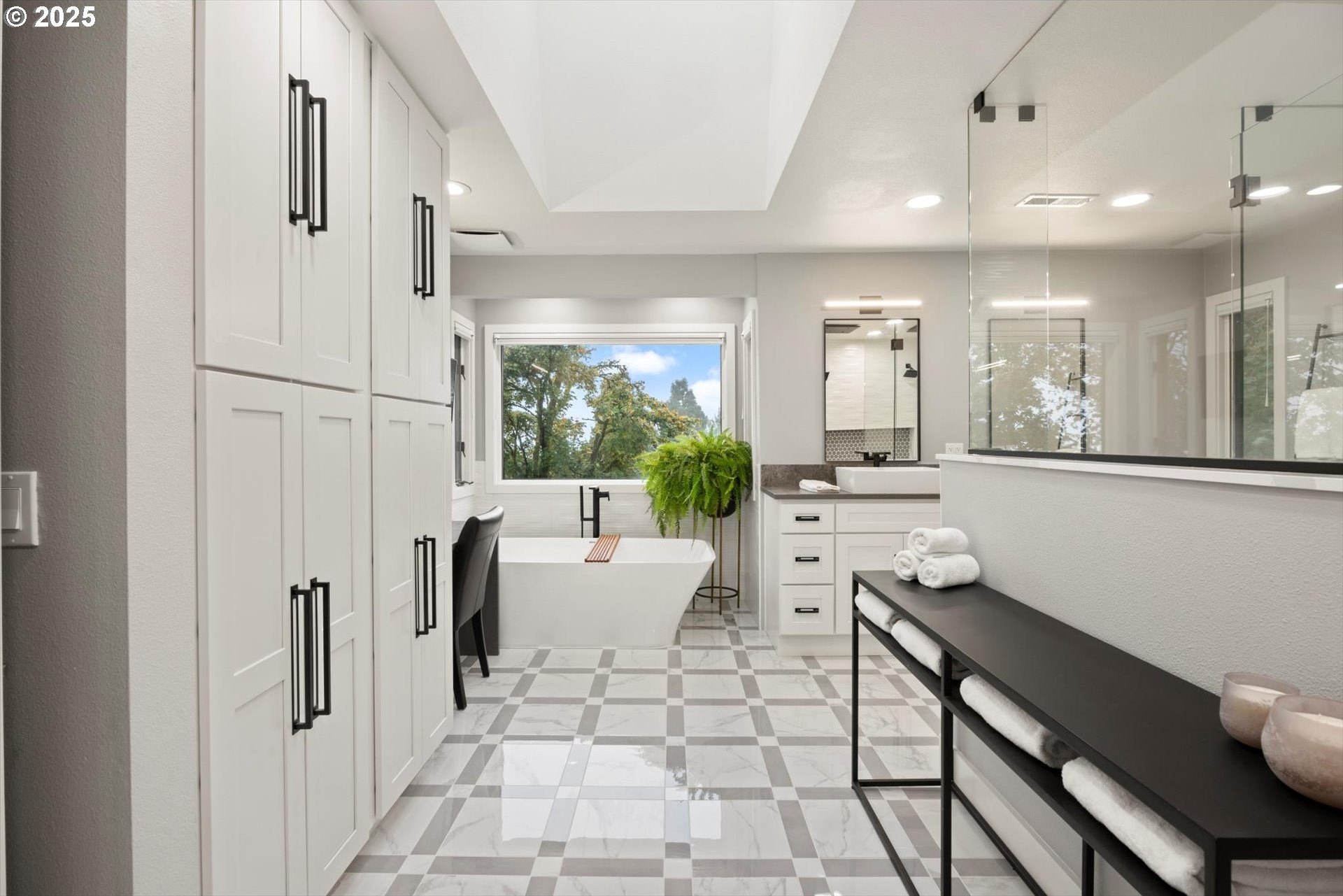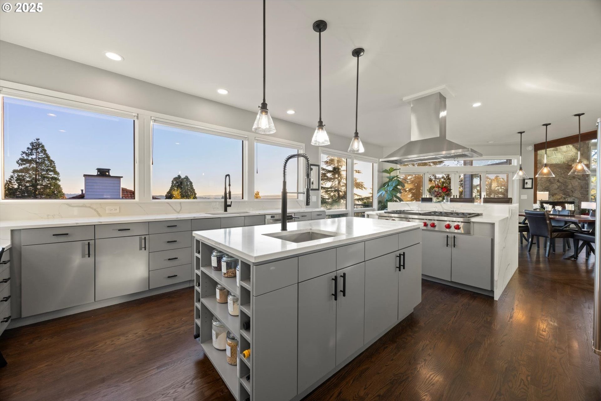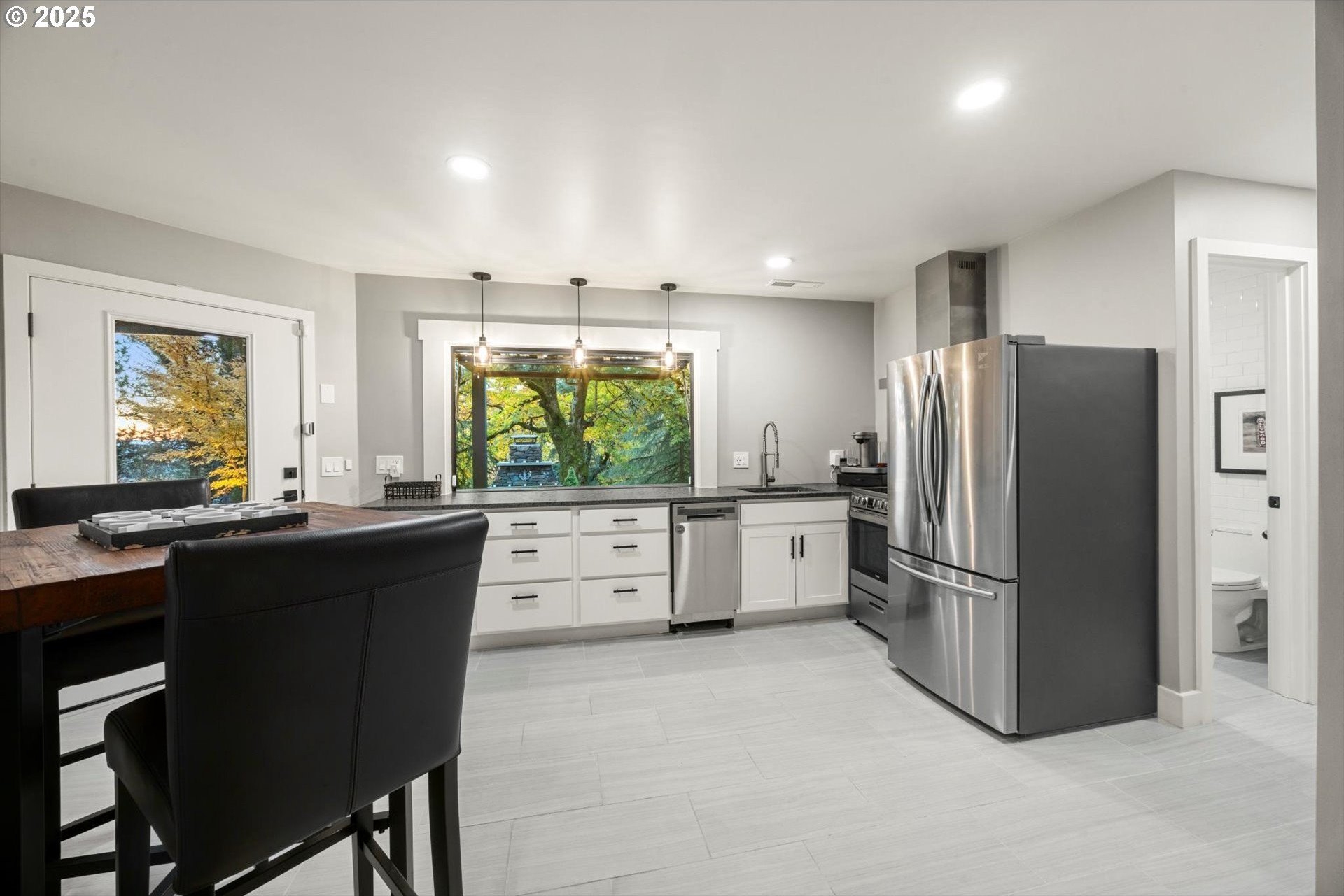 Welcome to an extraordinary retreat in the coveted, gated enclave of West Hills View Estates—where panoramic sunsets, high design, and thoughtful functionality converge. This reimagined residence offers an exceptional blend of grand scale, refined detail, and seamless indoor-outdoor living. Step into the dramatic mezzanine-level great room, where soaring 25-foot beamed ceilings and expansive windows create a stunning first impression. The open-concept chef’s kitchen is outfitted with premium Carrera quartz surfaces and top-tier appliances from Wolf, Miele, and SubZero—perfect for both everyday living and elevated entertaining. Experience elegant touches throughout, from sleek hardwood floors and Andersen windows to a luxe primary spa-style bath. Designed with versatility in mind, the home includes ADA-accessible guest accommodations complete with a second kitchenette, ideal for multi-generational living or long-term guests. Host effortlessly on the elevated deck and heated patio, with a nearby outdoor fireplace offering year-round ambiance. The lower level invites relaxation with a plush media lounge, wine cellar, and a soundproof flex room—perfect for music, art, or studio needs. Additional highlights include dual laundry areas and abundant space for customization. Enjoy the privacy of a boutique neighborhood of luxury estates, just minutes from Portland’s best—OHSU, the Multnomah Athletic Club, top-rated public and private schools, and a wealth of fine dining and cultural amenities. This is more than a home—it’s a lifestyle defined by reimagined vision, comfort, sophistication, and possibility. [Home Energy Score = 2. HES Report at https://rpt.greenbuildingregistry.com/hes/OR10233983]