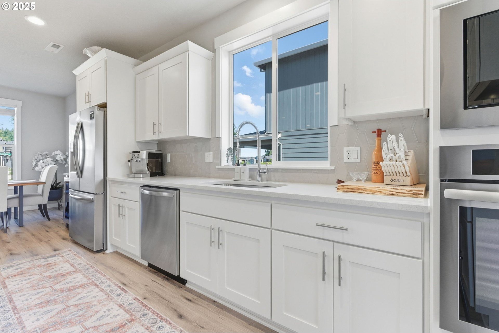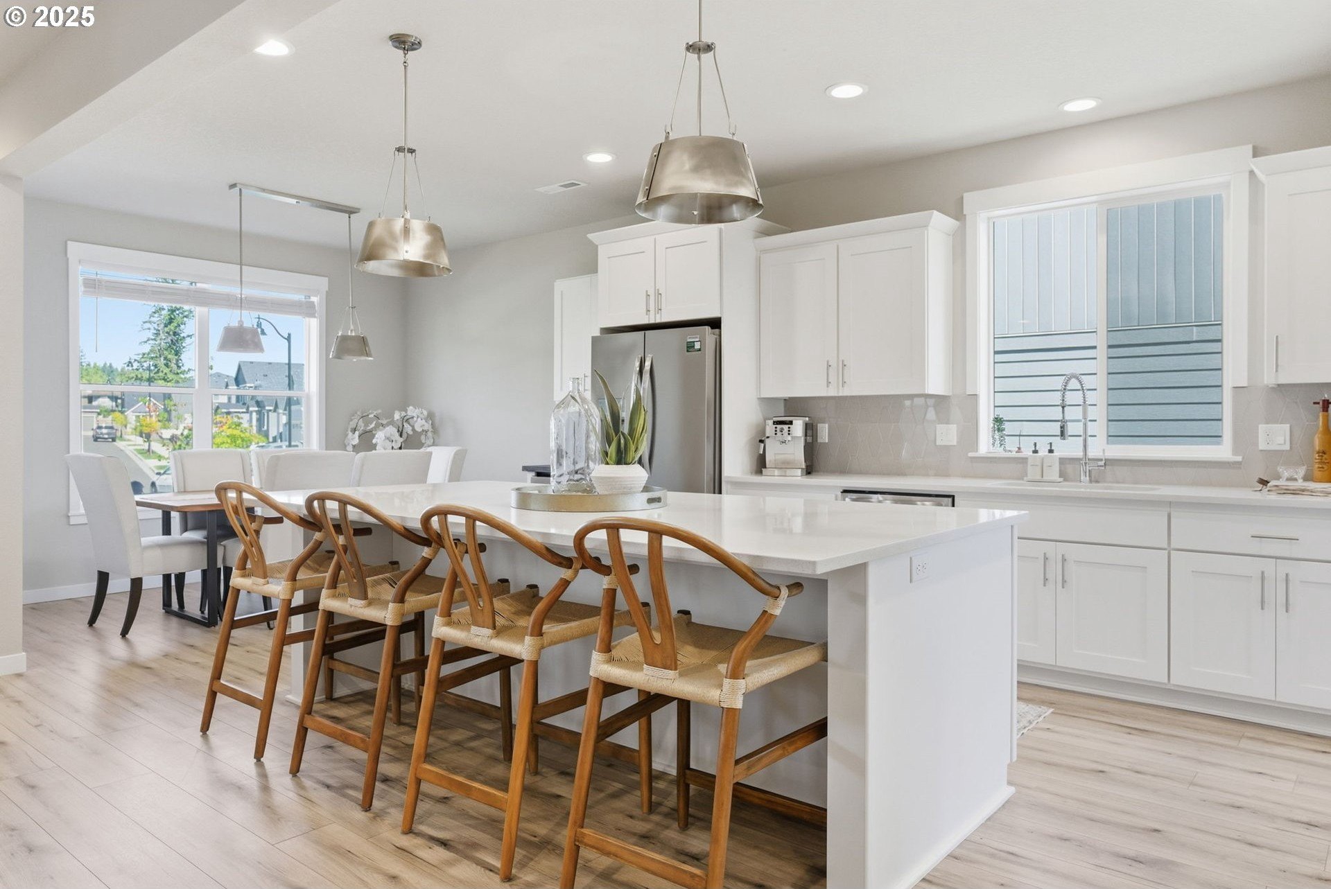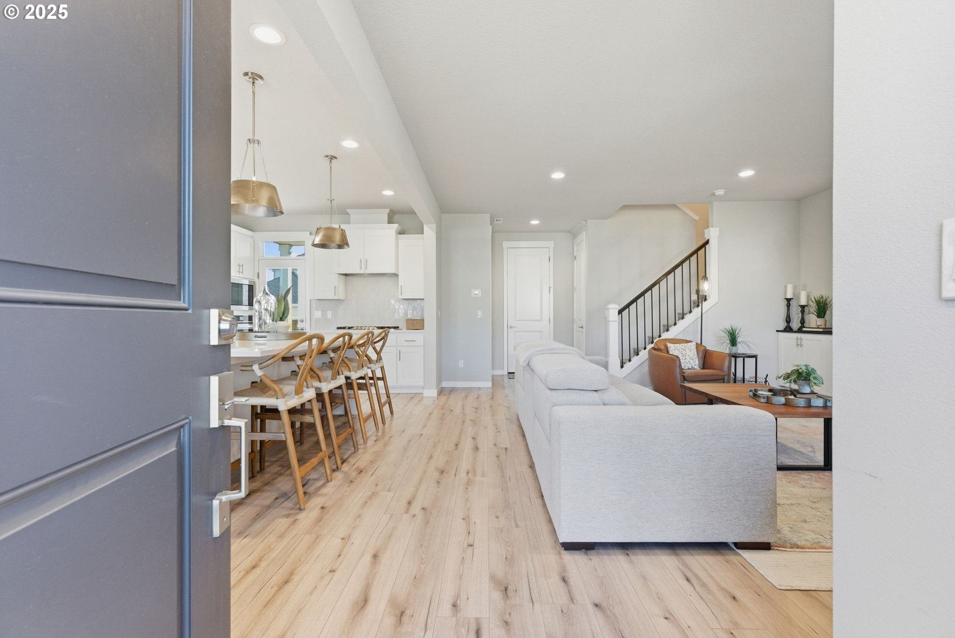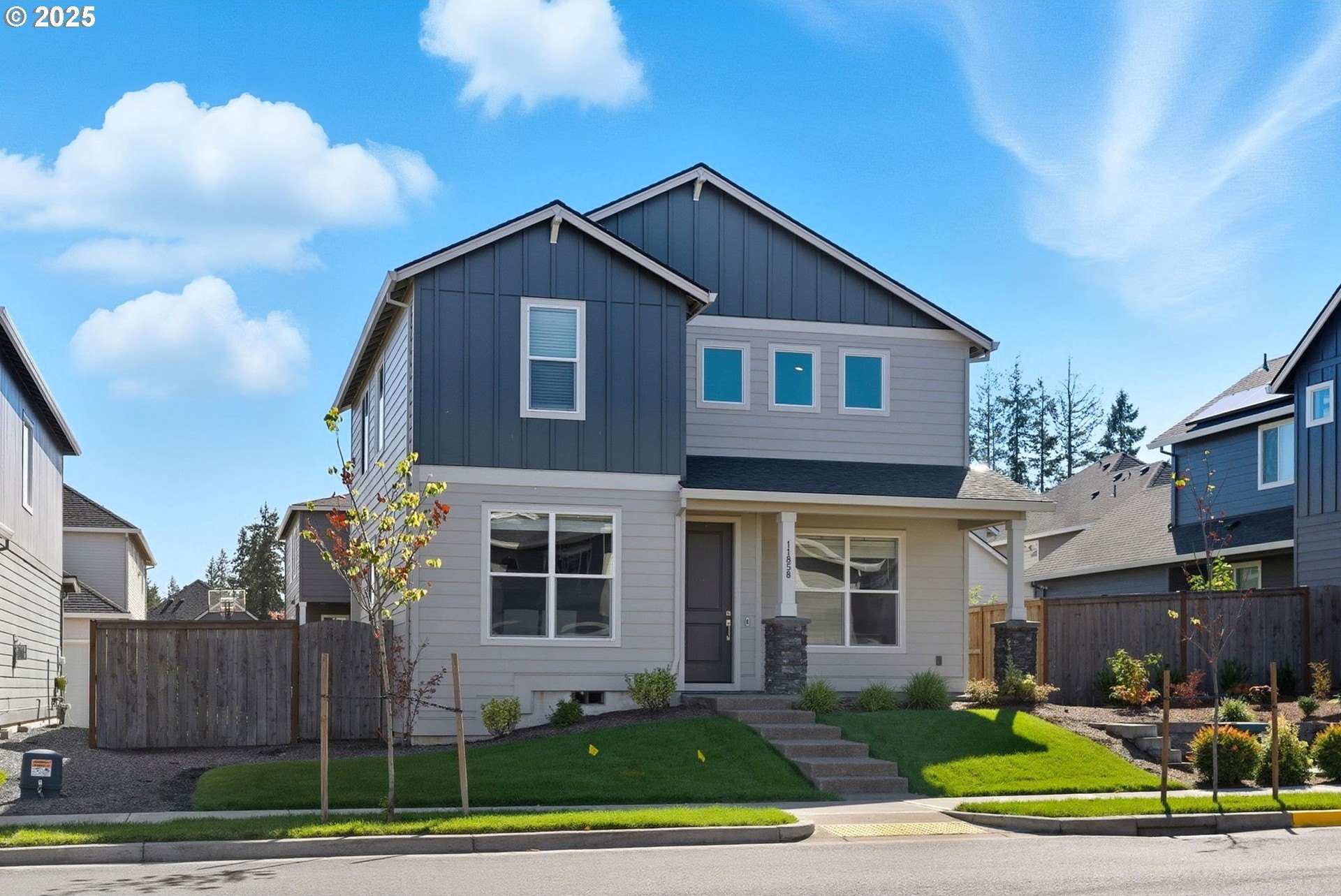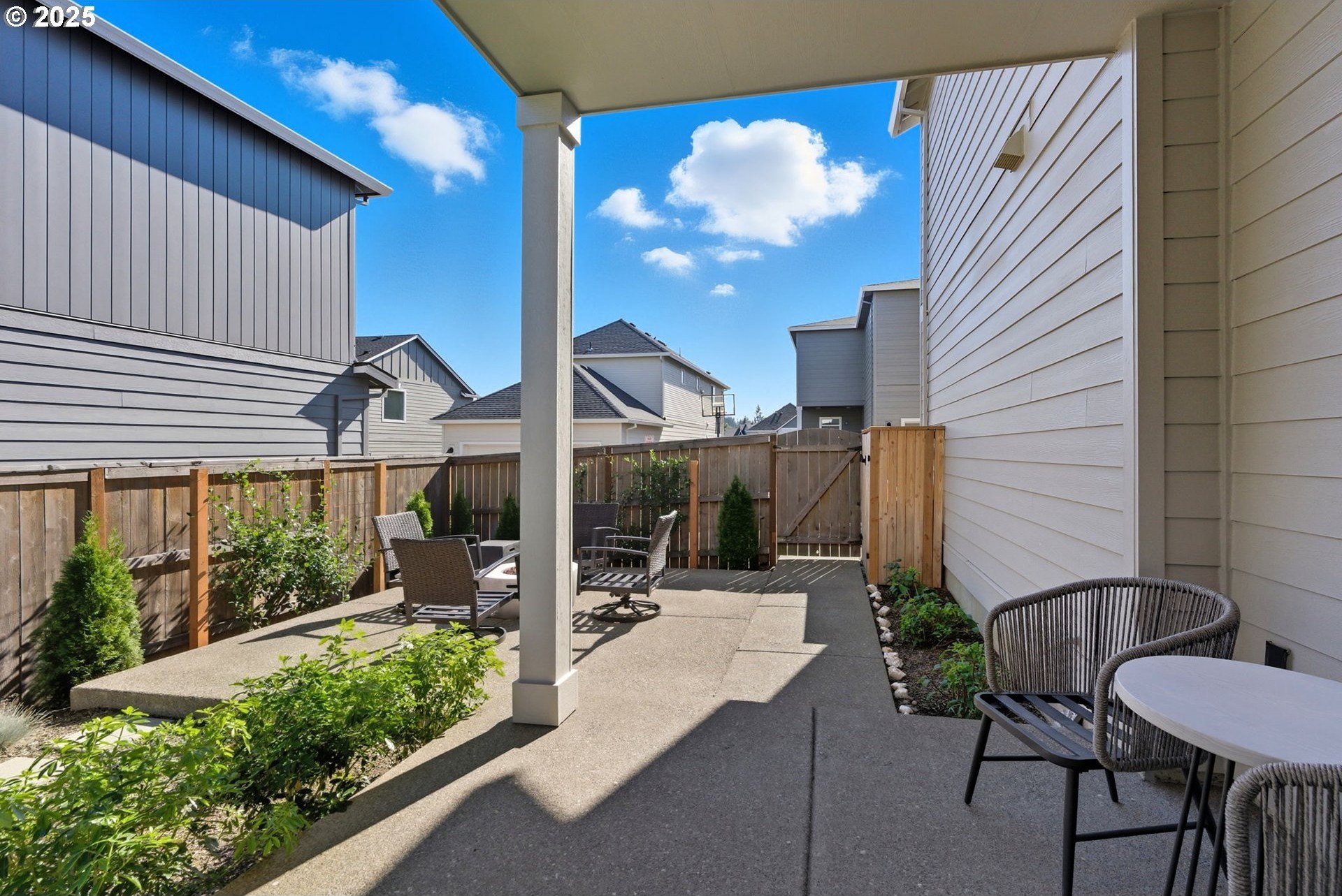 Built in 2022, this 4 bedroom, 2.5 bath Craftsman combines modern finishes with pristine condition. Lightly occupied and move-in ready, it shows like new. The open-concept chef’s kitchen offers abundant counter space, stainless steel gas appliances, a wine cooler, and a large quartz island with bar seating that's perfect for gatherings. The inviting living room centers around a cozy gas fireplace, while a separate dining area provides additional space for entertaining.Upgraded laminate flooring extends through the upper level and stairs. The spacious primary suite features high ceilings, a walk-in closet, and dual sinks in the ensuite bath.Enjoy outdoor living on the extended backyard patio that's ideal for grilling and relaxing, plus a fully fenced yard offering privacy and space for gardening.Located in one of Happy Valley’s sought-after newer neighborhoods, Pleasant Valley Villages offers exceptional amenities including a private community pool, playground, basketball court, trails, clubhouse, and more. Conveniently close to shopping, dining, and highway access.