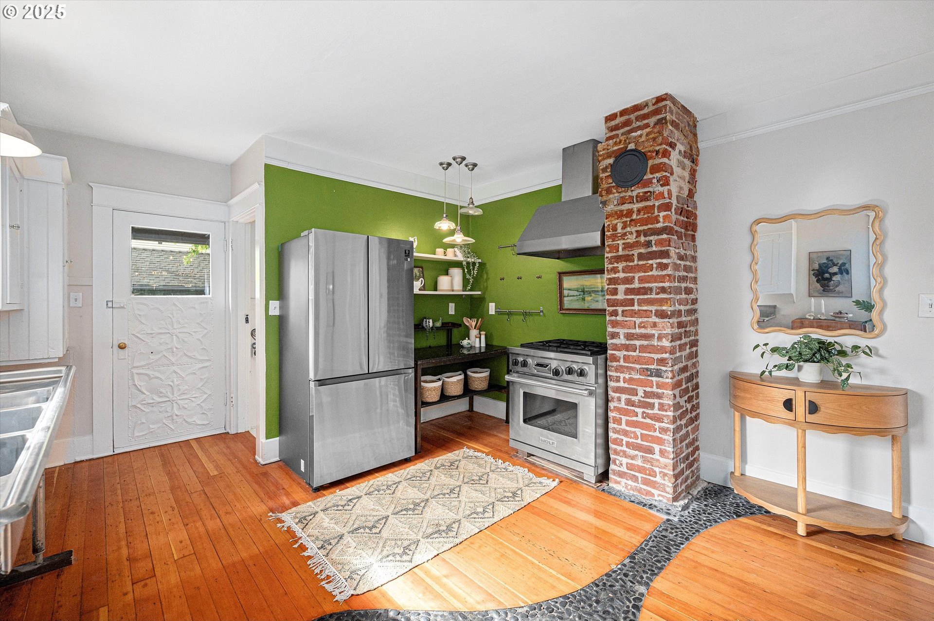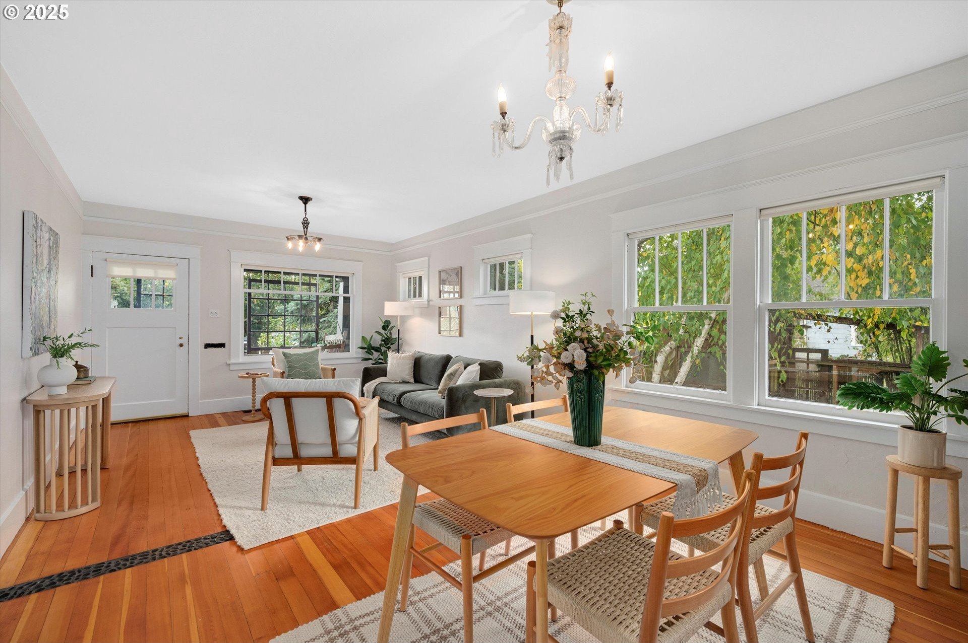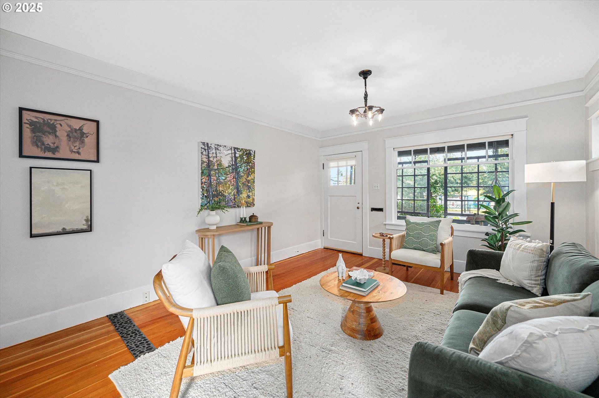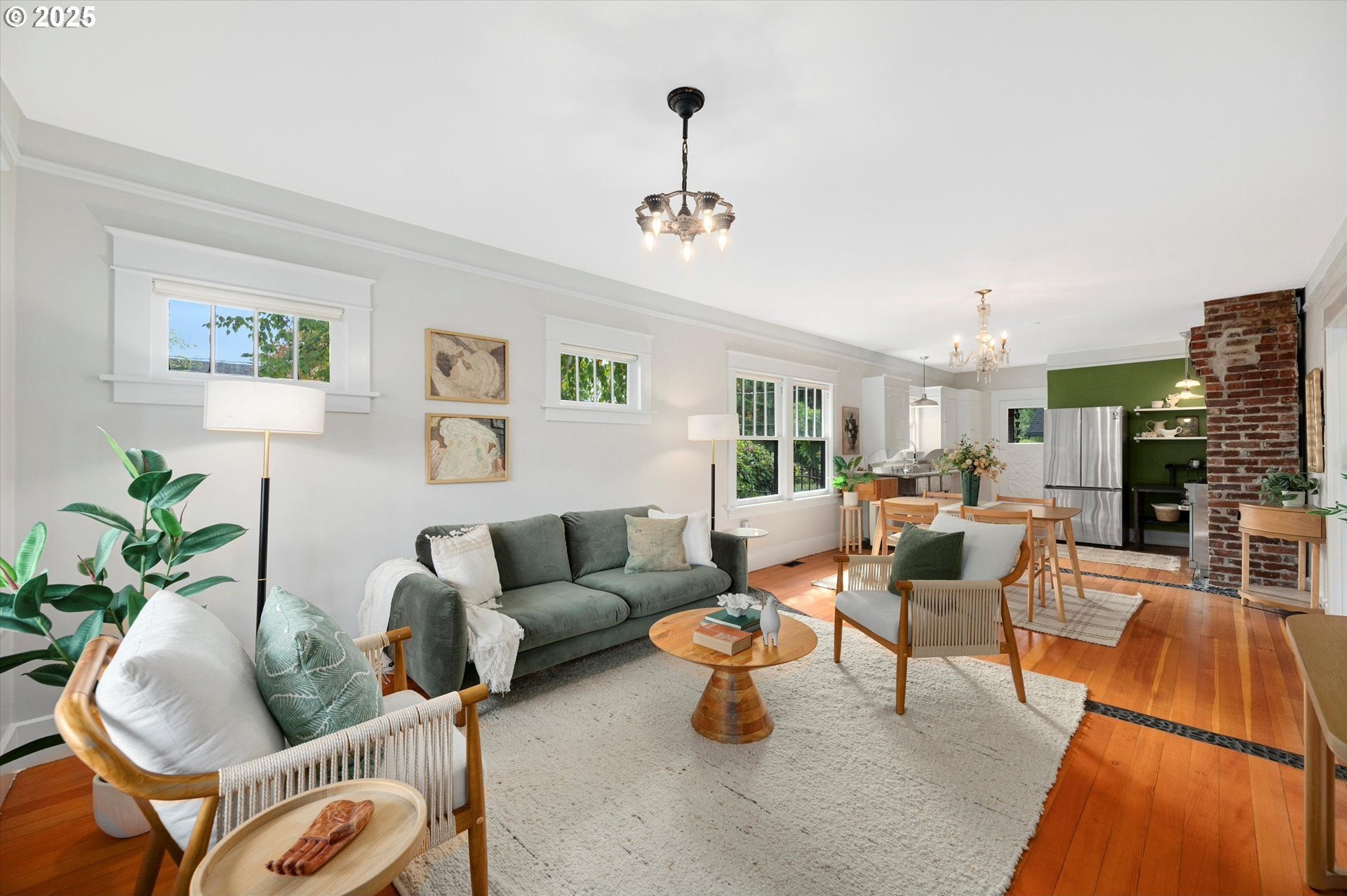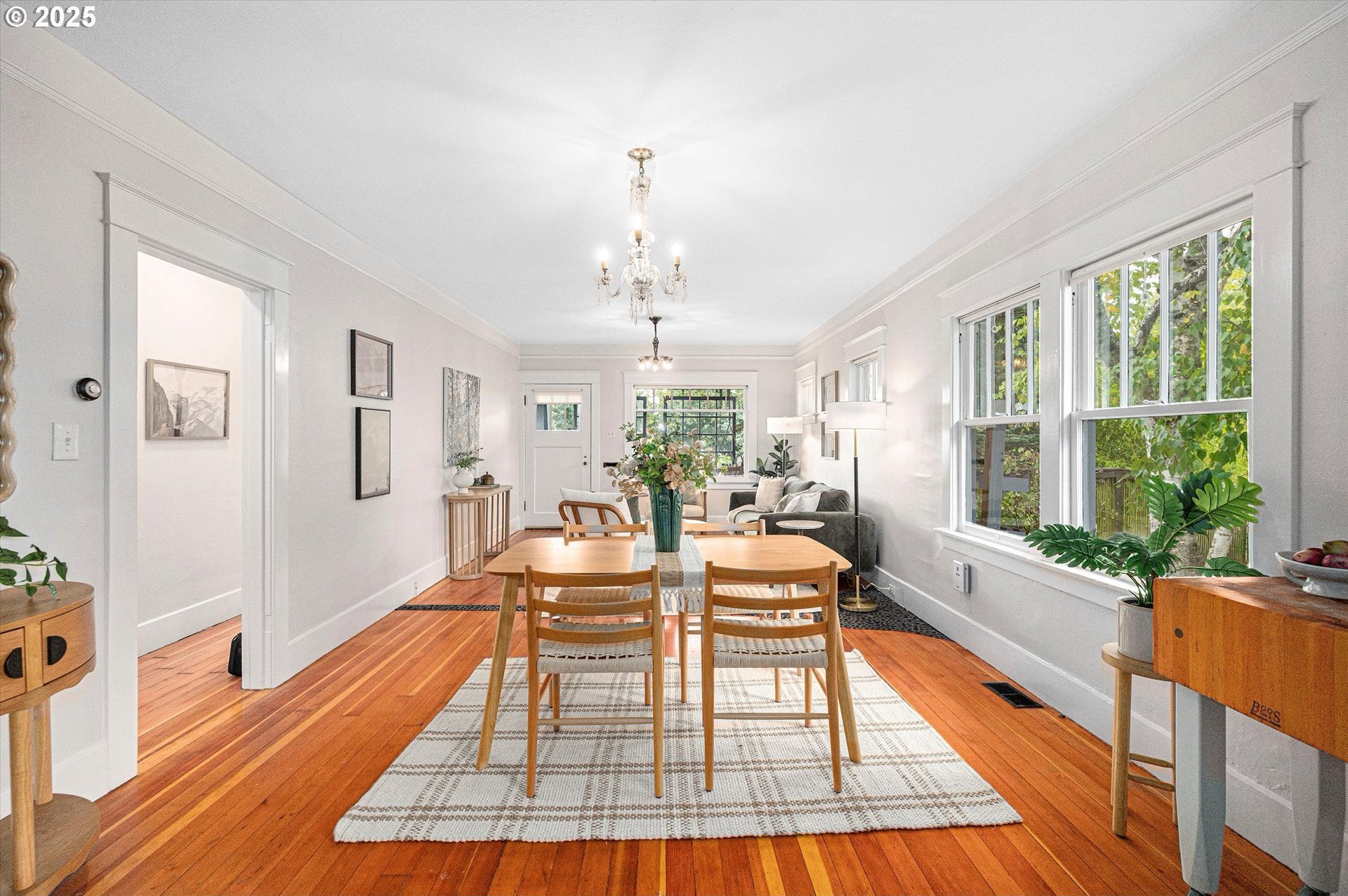 Welcome to this delightful St. Johns bungalow, where high ceilings, hardwood floors, and an open floor plan create a bright, inviting space filled with character. Sunlight pours through large windows overlooking a garden sanctuary bursting with life — from kiwi, pomegranate, and plum trees to Japanese wisteria and a thriving vegetable garden. A rain barrel system keeps things green year-round, and a deluxe chicken coop and run make this home a true urban homestead.The open kitchen features stainless steel appliances and a gas Wolf range that’s perfect for everyday cooking or sharing meals with friends. The bathroom is light and airy with a vintage clawfoot tub and hex-tile flooring. The basement offers flexible space for an office, workshop, or creative studio, the large light filled attic offers great storage and the possibility for future living space, while the detached garage—with power already installed—awaits your next project.Located on an oversized corner lot, this home offers a sense of peace and privacy while keeping you close to everything that makes St. Johns special. Just moments from downtown St. Johns, you’ll enjoy local coffee shops, restaurants, and boutique stores, as well as the scenic trails and river views of Cathedral Park. It’s a welcoming neighborhood with a small-town feel, community events, and the kind of charm that makes you feel right at home.Upgrades include refinished hardwood floors, interior paint, exterior paint, garage doors and electrical.