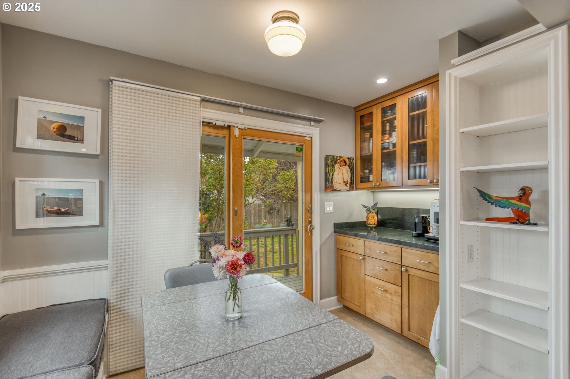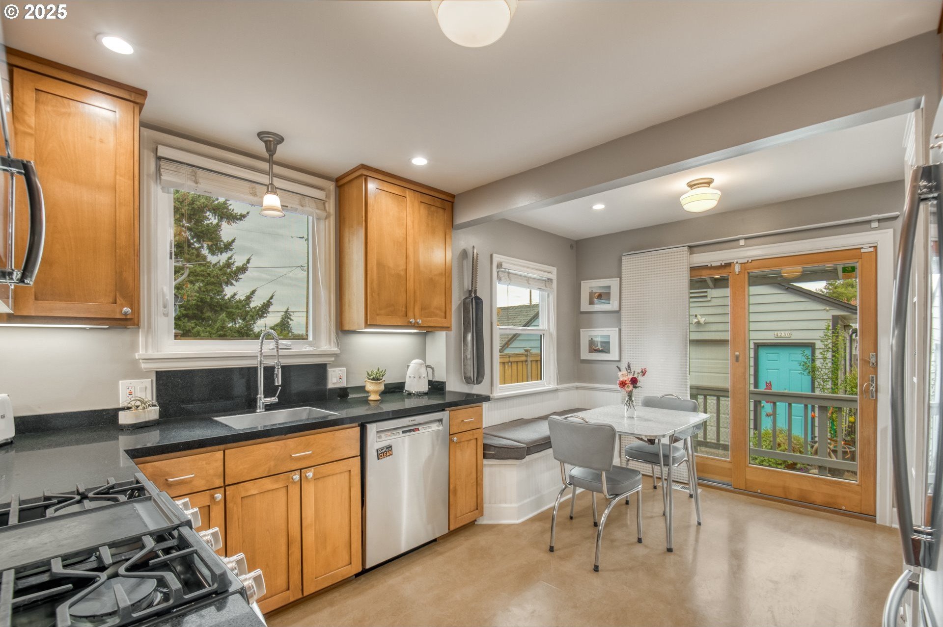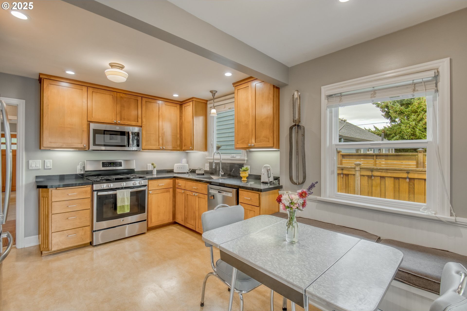 Nestled in the heart of Portland’s beloved Roseway neighborhood, this timeless 1934 English charmer blends vintage soul with modern updates, offering hardwood floors, a cozy fireplace, and authentic details alongside an updated kitchen with gas range, custom cabinetry, and a built-in breakfast nook that begs for Sunday mornings. The spacious living and dining areas flow together with an easy, modern vibe, while the vintage bathroom adds just the right touch of character. A large open unfinished basement with its own side door holds endless possibilities—studio, gym, creative workshop, or future expansion. Outside, lush mature landscaping frames a private fenced backyard with French doors opening to an oversized covered deck, perfect for year-round entertaining, while the detached garage provides plenty of room for bikes, gear, or projects. A newer tear-off roof adds peace of mind for years to come. With a Walk Score of 76 and Bike Score of 89, you’re a short stroll from the Roseway Parkway, Wellington Park, and Sacajawea Park—and less than five minutes from the farm-to-table restaurants, indie coffee shops, craft bars, and boutique shopping that make Beaumont Alameda on Fremont some of Portland’s most vibrant destinations. Live local. Live vibrant. Live in the Roseway neighborhood and enjoy the best of Portland’s urban energy, all from a quiet tree-lined street.