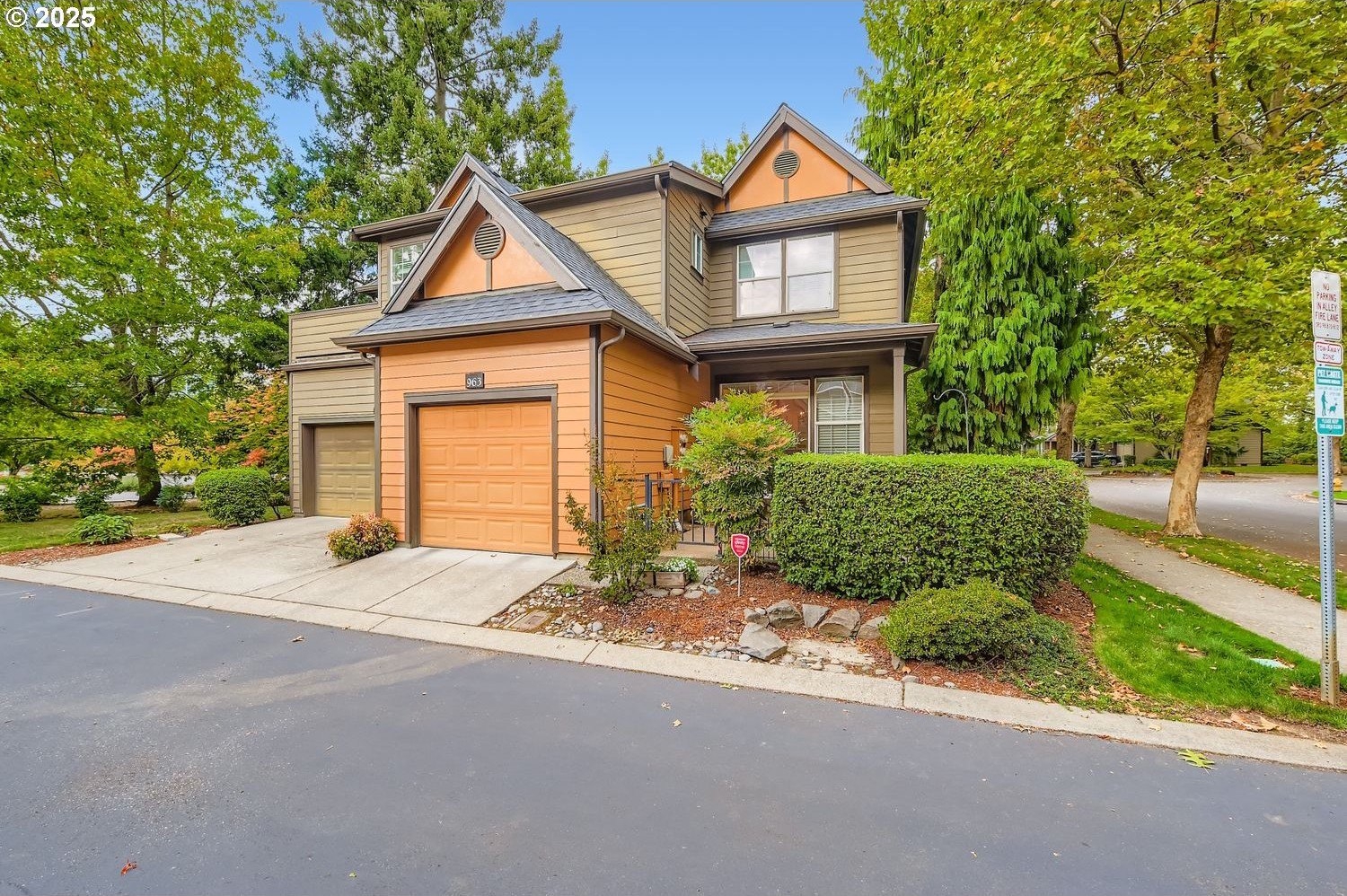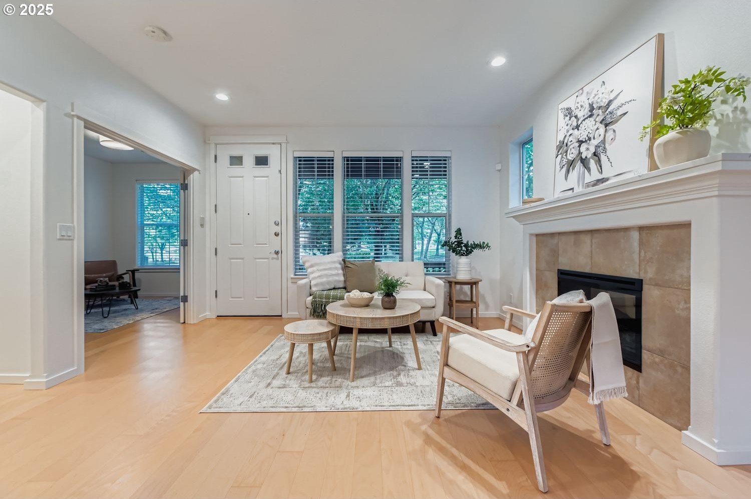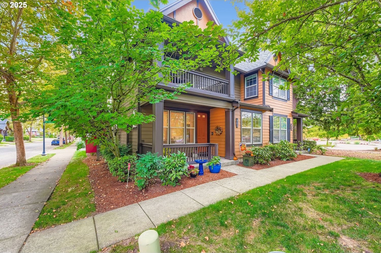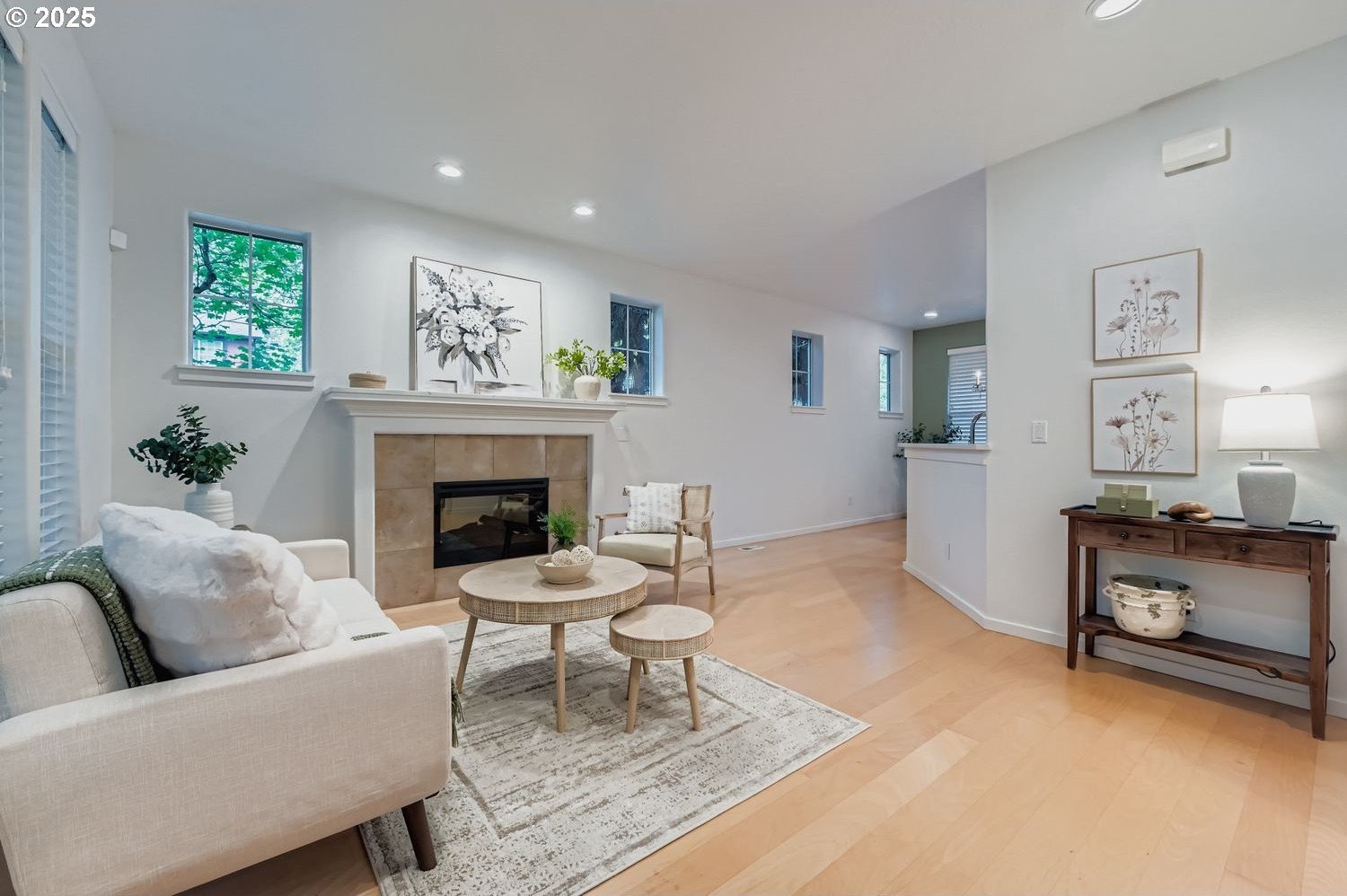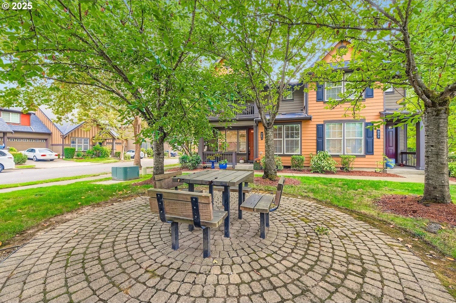 Beautifully updated and move-in ready, this corner-lot home offers single-level living in one of Orenco’s most peaceful, tree-lined neighborhoods. Step onto the charming covered front porch and into a light-filled, open floor plan featuring hardwood floors throughout, fresh interior paint, and abundant natural light from large windows.The inviting living room features a new electric fireplace with tile surround, modern recessed lighting with slow-fade dimmers and a seamless flow into the dining area and kitchen. The fully remodeled kitchen is a showstopper boasting a custom 3D tile backsplash, Bosch stainless steel appliances (oven, microwave, and whisper-quiet dishwasher), LG refrigerator, soft-close cabinetry, under-cabinet lighting and quartz countertops. The spacious primary suite offers new carpet, custom drapes and walk-in closet. Remodeled bathroom with patterned tile flooring, designer backsplash, walk-in shower and chrome fixtures. The second bedroom/office features elegant French doors and great natural light. Additional highlights include: New stackable washer and dryer. Epoxy-coated garage floor with overhead storage, custom metal shelving and slat wall system. Custom blinds throughout. Large covered patio off the dining room with sliding door access. Tucked away in a quiet, established community yet minutes from Orenco Station’s restaurants, shops, parks, and MAX line, this home combines comfort, convenience, and quality craftsmanship. Every detail has been thoughtfully updated—simply move in and enjoy!