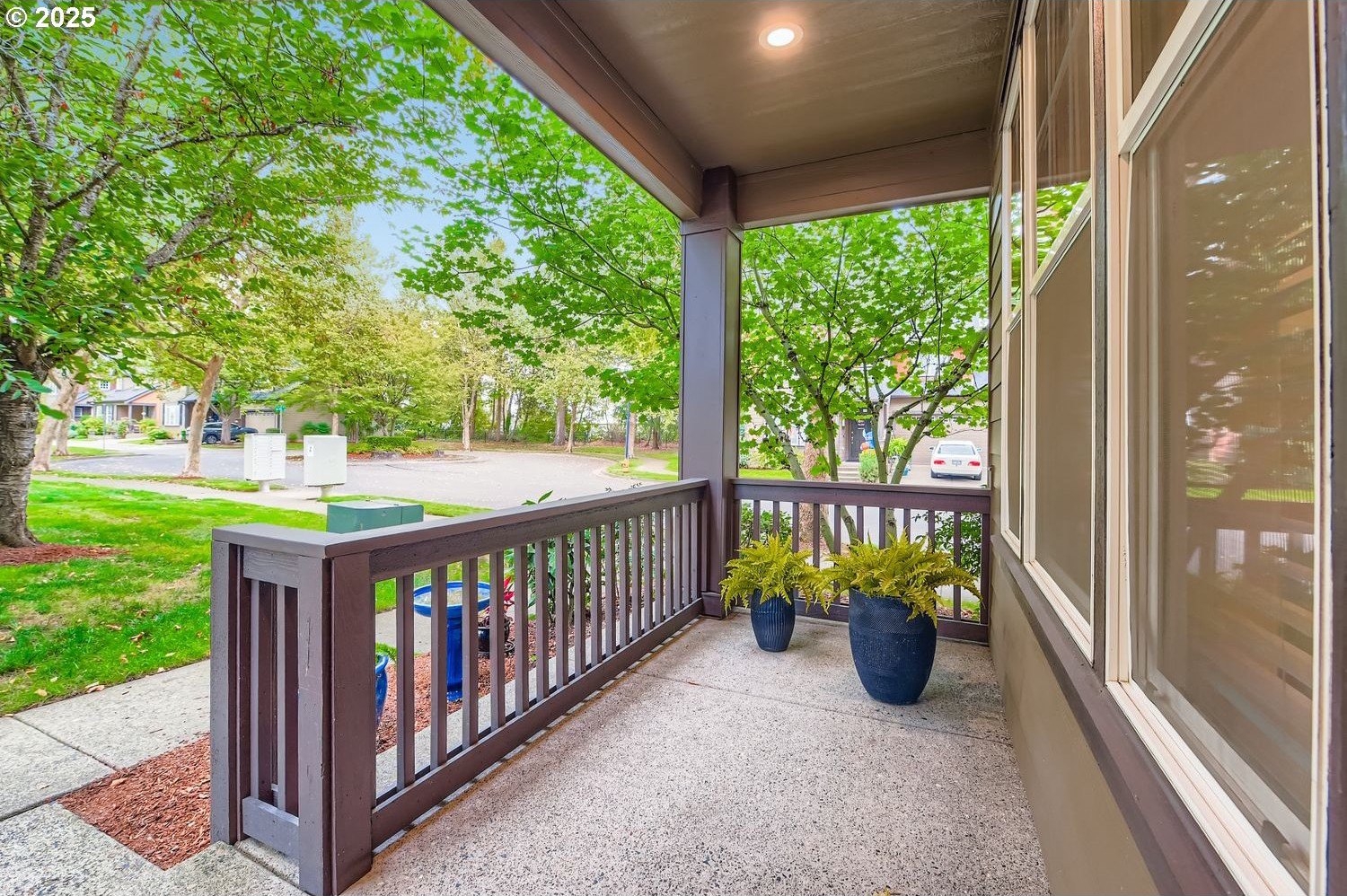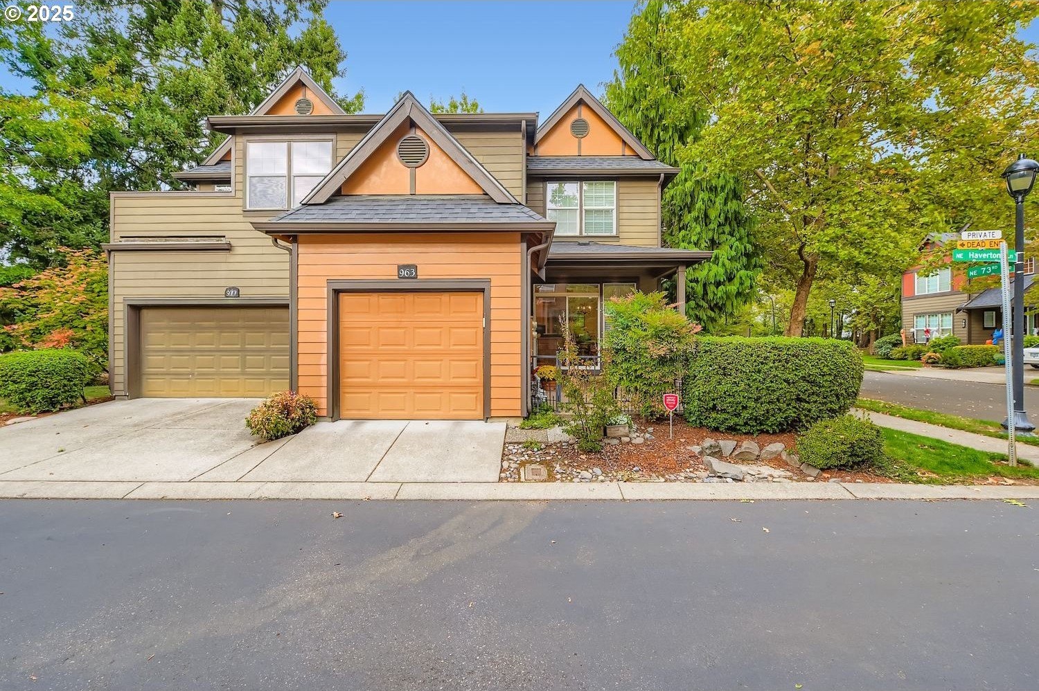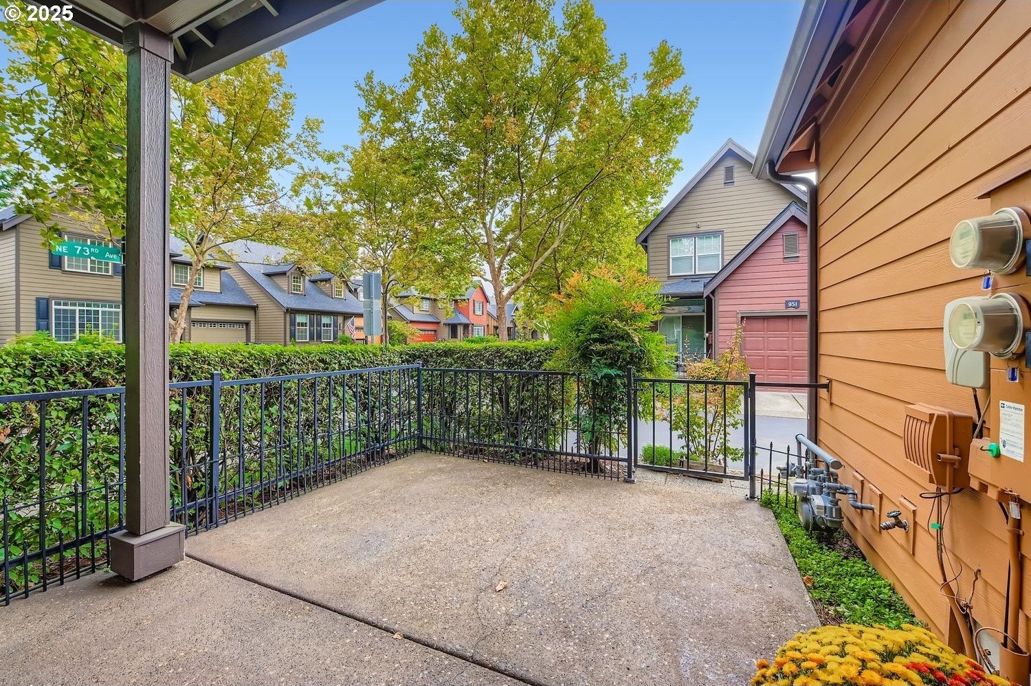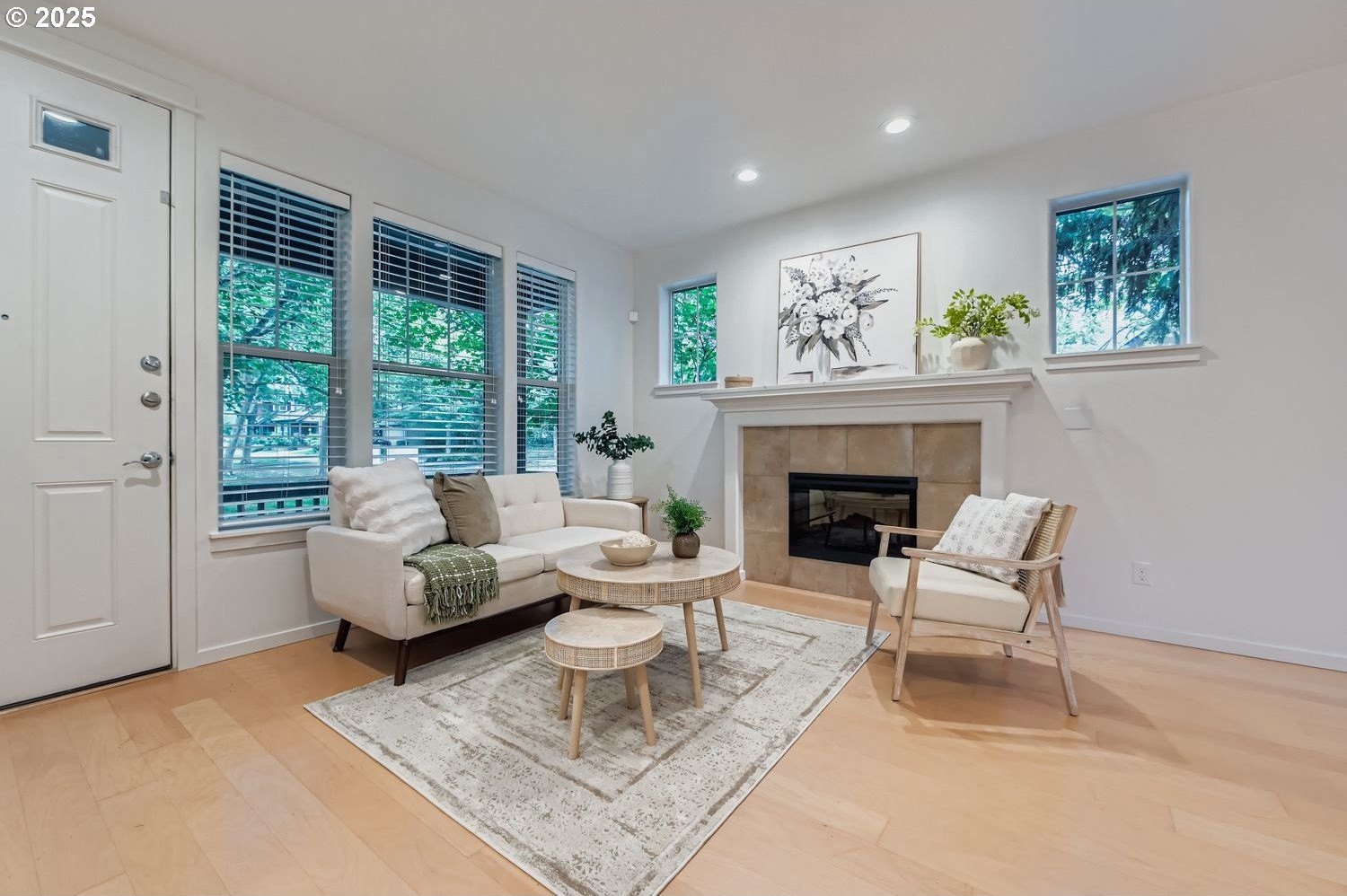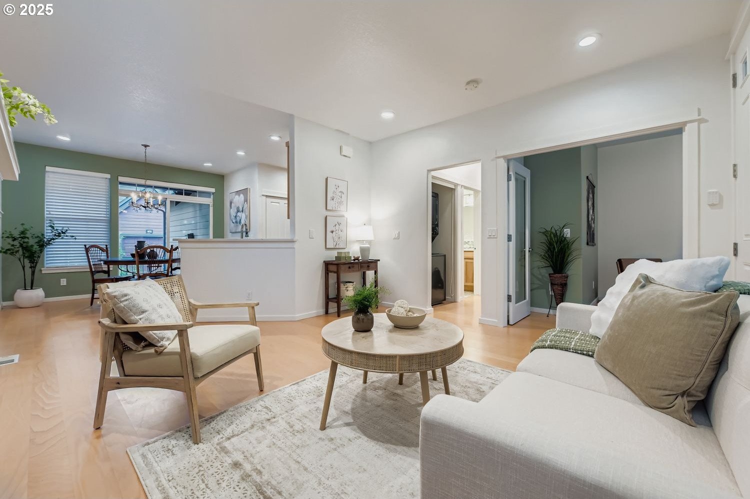 Beautifully updated and move-in ready, this corner-lot home offers single-level living in one of Orenco’s most peaceful, tree-lined neighborhoods. Step onto the charming covered front porch and into a light-filled, open floor plan featuring hardwood floors throughout, fresh interior paint, and abundant natural light from large windows.The inviting living room features a new electric fireplace with tile surround, modern recessed lighting with slow-fade dimmers and a seamless flow into the dining area and kitchen. The fully remodeled kitchen is a showstopper boasting a custom 3D tile backsplash, Bosch stainless steel appliances (oven, microwave, and whisper-quiet dishwasher), LG refrigerator, soft-close cabinetry, under-cabinet lighting and quartz countertops. The spacious primary suite offers new carpet, custom drapes and walk-in closet. Remodeled bathroom with patterned tile flooring, designer backsplash, walk-in shower and chrome fixtures. The second bedroom/office features elegant French doors and great natural light. Additional highlights include: New stackable washer and dryer. Epoxy-coated garage floor with overhead storage, custom metal shelving and slat wall system. Custom blinds throughout. Large covered patio off the dining room with sliding door access. Tucked away in a quiet, established community yet minutes from Orenco Station’s restaurants, shops, parks, and MAX line, this home combines comfort, convenience, and quality craftsmanship. Every detail has been thoughtfully updated—simply move in and enjoy!