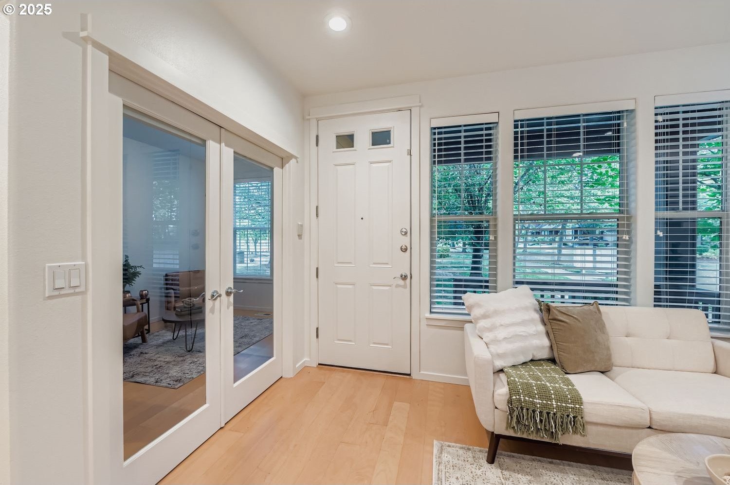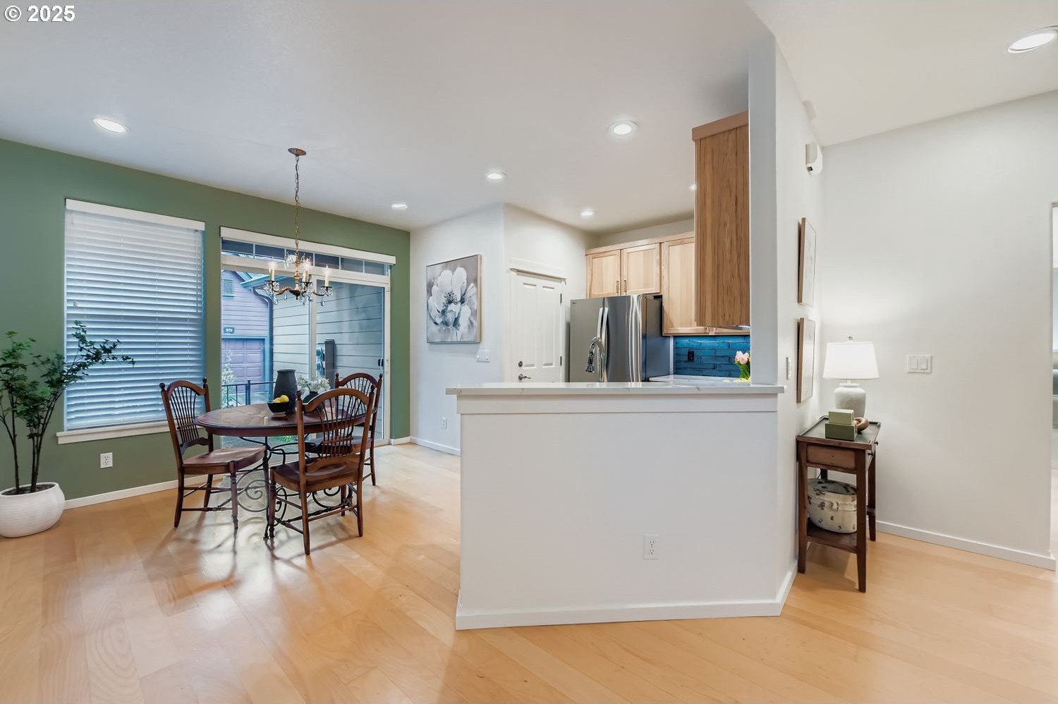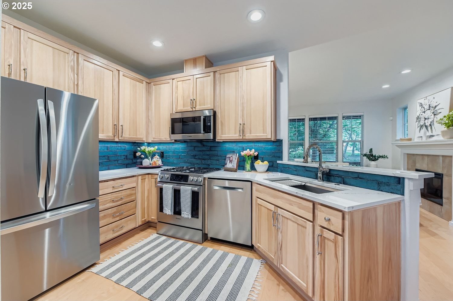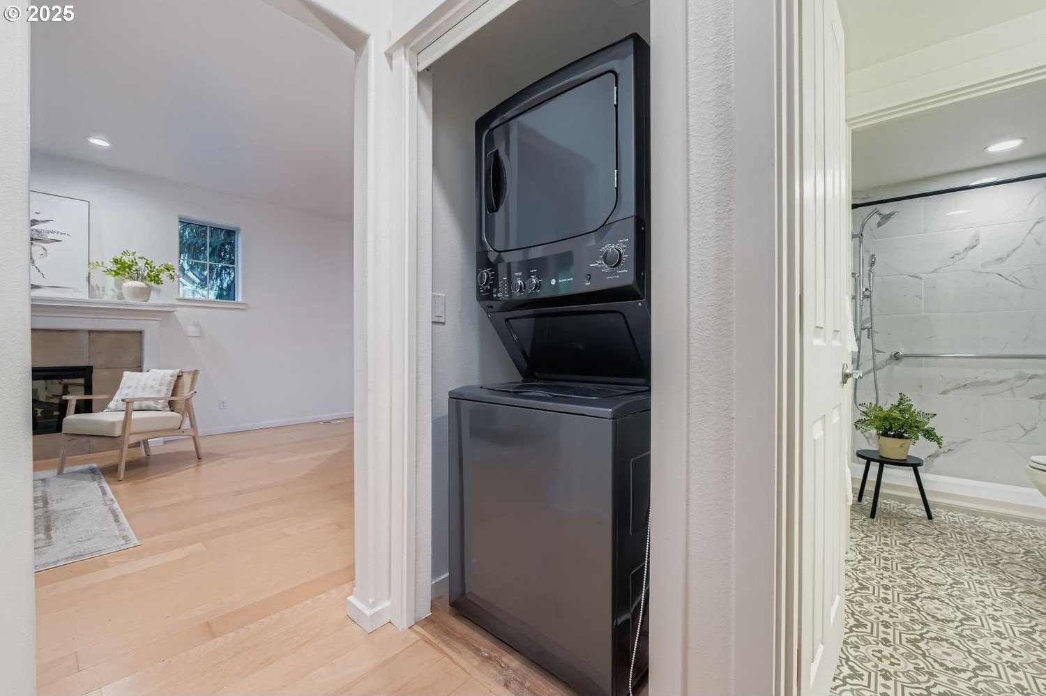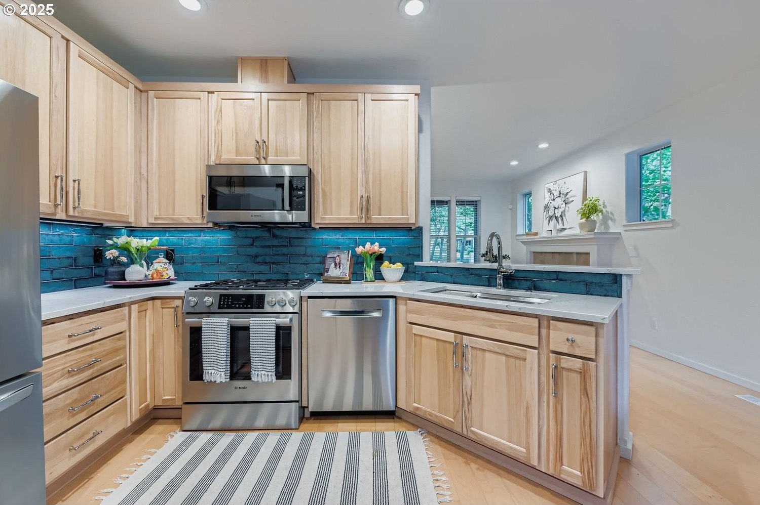 Beautifully updated and move-in ready, this corner-lot home offers single-level living in one of Orenco’s most peaceful, tree-lined neighborhoods. Step onto the charming covered front porch and into a light-filled, open floor plan featuring hardwood floors throughout, fresh interior paint, and abundant natural light from large windows.The inviting living room features a new electric fireplace with tile surround, modern recessed lighting with slow-fade dimmers and a seamless flow into the dining area and kitchen. The fully remodeled kitchen is a showstopper boasting a custom 3D tile backsplash, Bosch stainless steel appliances (oven, microwave, and whisper-quiet dishwasher), LG refrigerator, soft-close cabinetry, under-cabinet lighting and quartz countertops. The spacious primary suite offers new carpet, custom drapes and walk-in closet. Remodeled bathroom with patterned tile flooring, designer backsplash, walk-in shower and chrome fixtures. The second bedroom/office features elegant French doors and great natural light. Additional highlights include: New stackable washer and dryer. Epoxy-coated garage floor with overhead storage, custom metal shelving and slat wall system. Custom blinds throughout. Large covered patio off the dining room with sliding door access. Tucked away in a quiet, established community yet minutes from Orenco Station’s restaurants, shops, parks, and MAX line, this home combines comfort, convenience, and quality craftsmanship. Every detail has been thoughtfully updated—simply move in and enjoy!