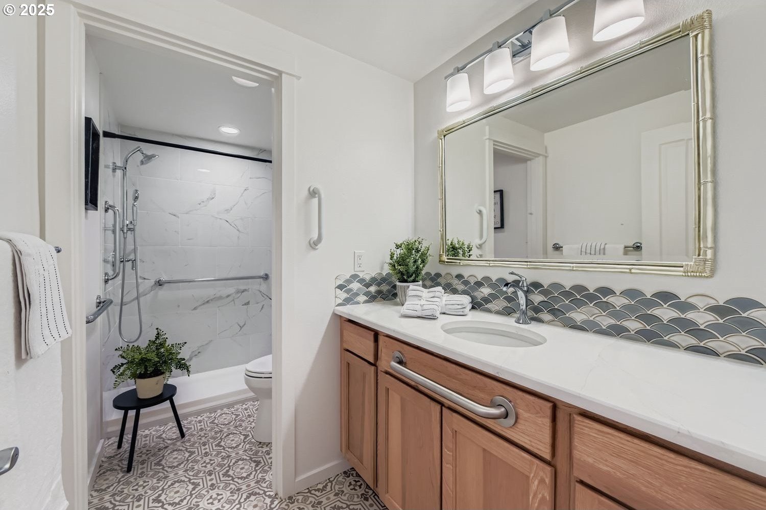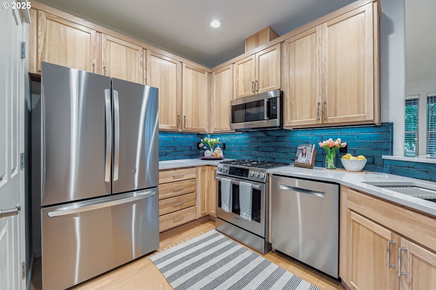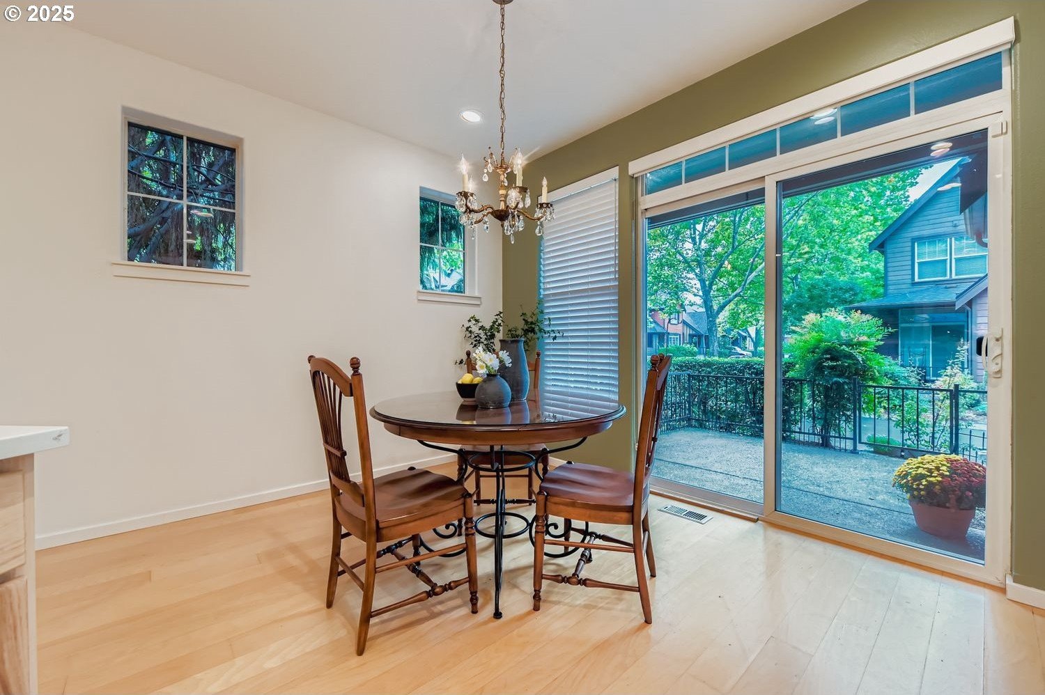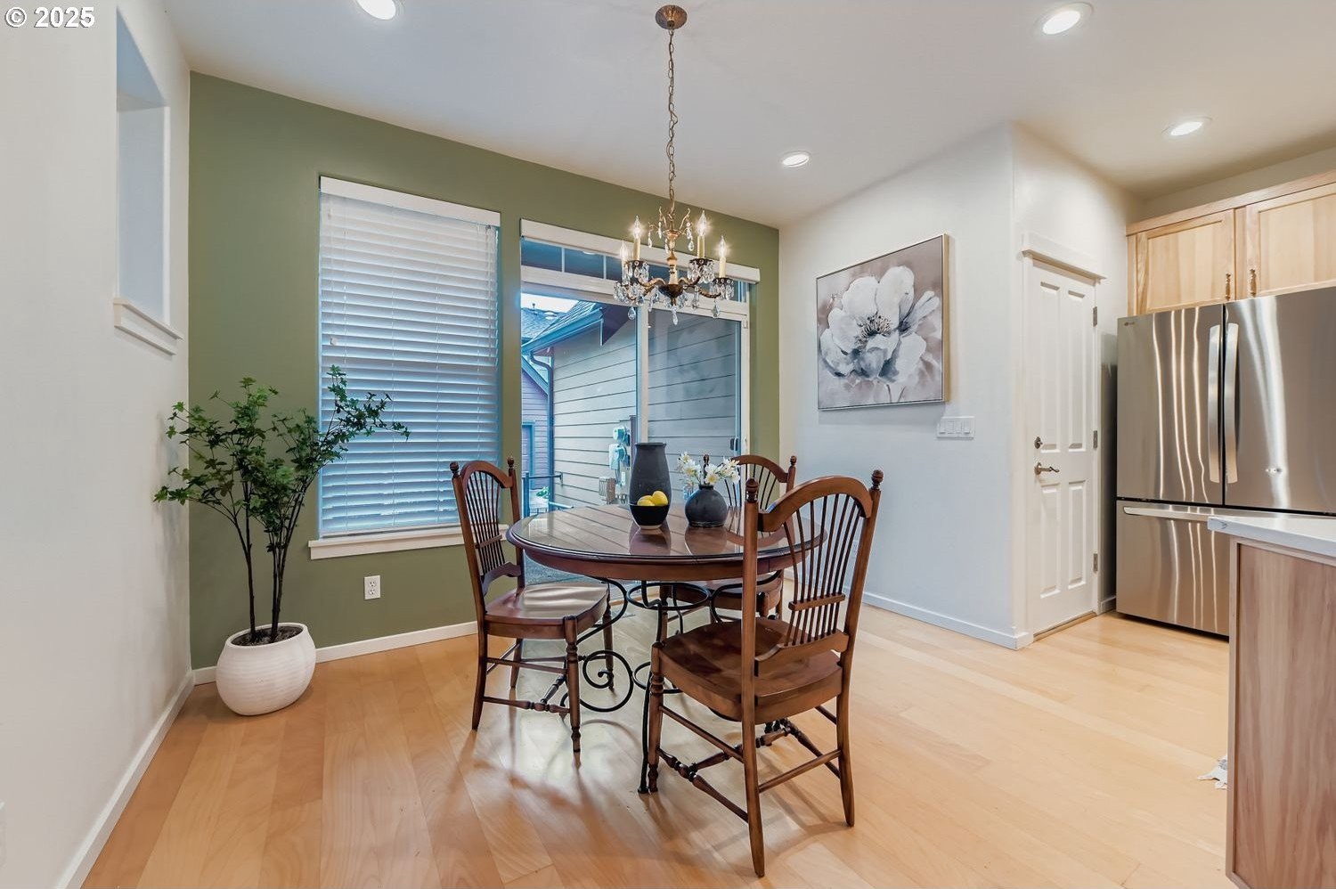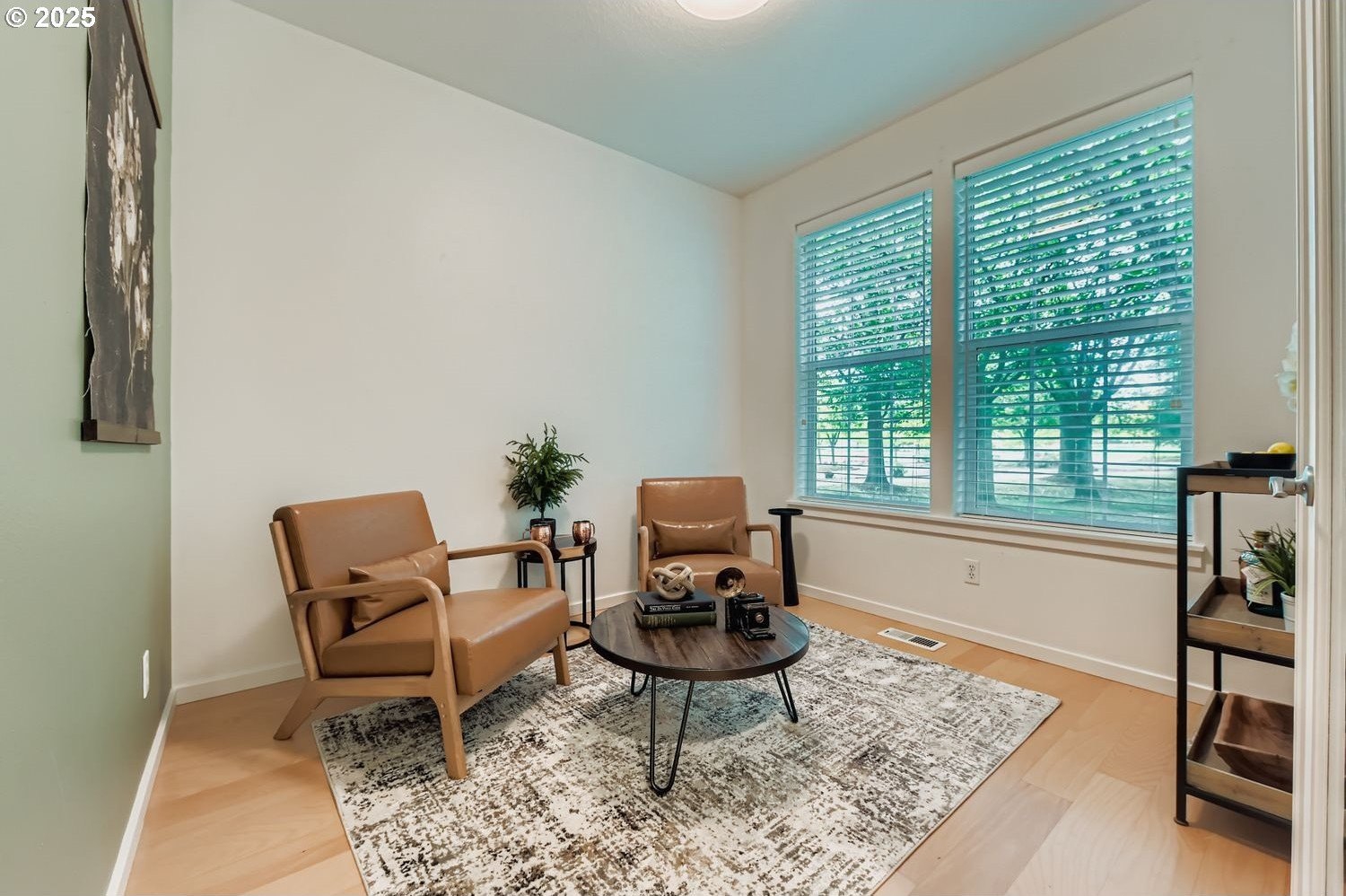 Beautifully updated and move-in ready, this corner-lot home offers single-level living in one of Orenco’s most peaceful, tree-lined neighborhoods. Step onto the charming covered front porch and into a light-filled, open floor plan featuring hardwood floors throughout, fresh interior paint, and abundant natural light from large windows.The inviting living room features a new electric fireplace with tile surround, modern recessed lighting with slow-fade dimmers and a seamless flow into the dining area and kitchen. The fully remodeled kitchen is a showstopper boasting a custom 3D tile backsplash, Bosch stainless steel appliances (oven, microwave, and whisper-quiet dishwasher), LG refrigerator, soft-close cabinetry, under-cabinet lighting and quartz countertops. The spacious primary suite offers new carpet, custom drapes and walk-in closet. Remodeled bathroom with patterned tile flooring, designer backsplash, walk-in shower and chrome fixtures. The second bedroom/office features elegant French doors and great natural light. Additional highlights include: New stackable washer and dryer. Epoxy-coated garage floor with overhead storage, custom metal shelving and slat wall system. Custom blinds throughout. Large covered patio off the dining room with sliding door access. Tucked away in a quiet, established community yet minutes from Orenco Station’s restaurants, shops, parks, and MAX line, this home combines comfort, convenience, and quality craftsmanship. Every detail has been thoughtfully updated—simply move in and enjoy!