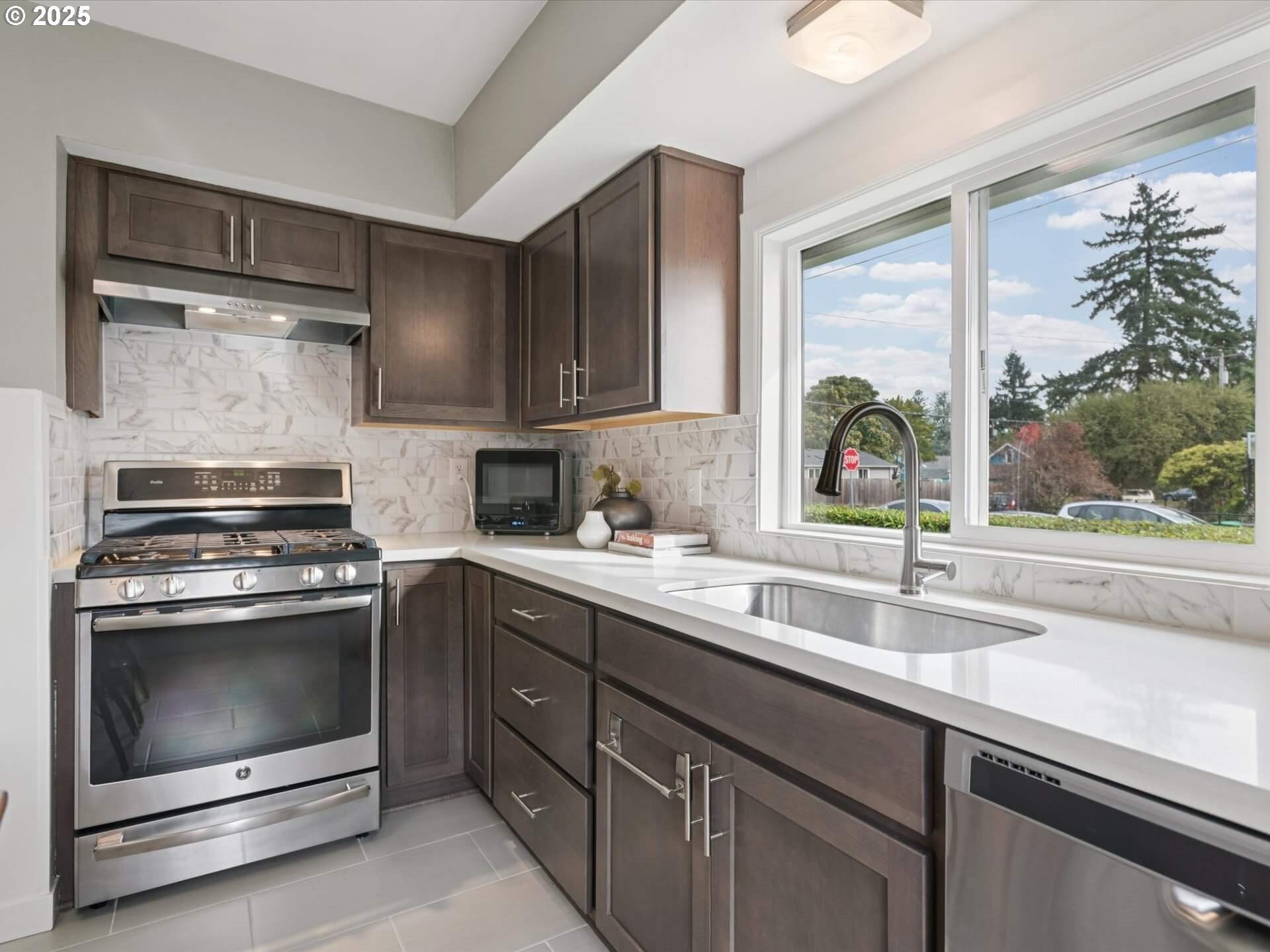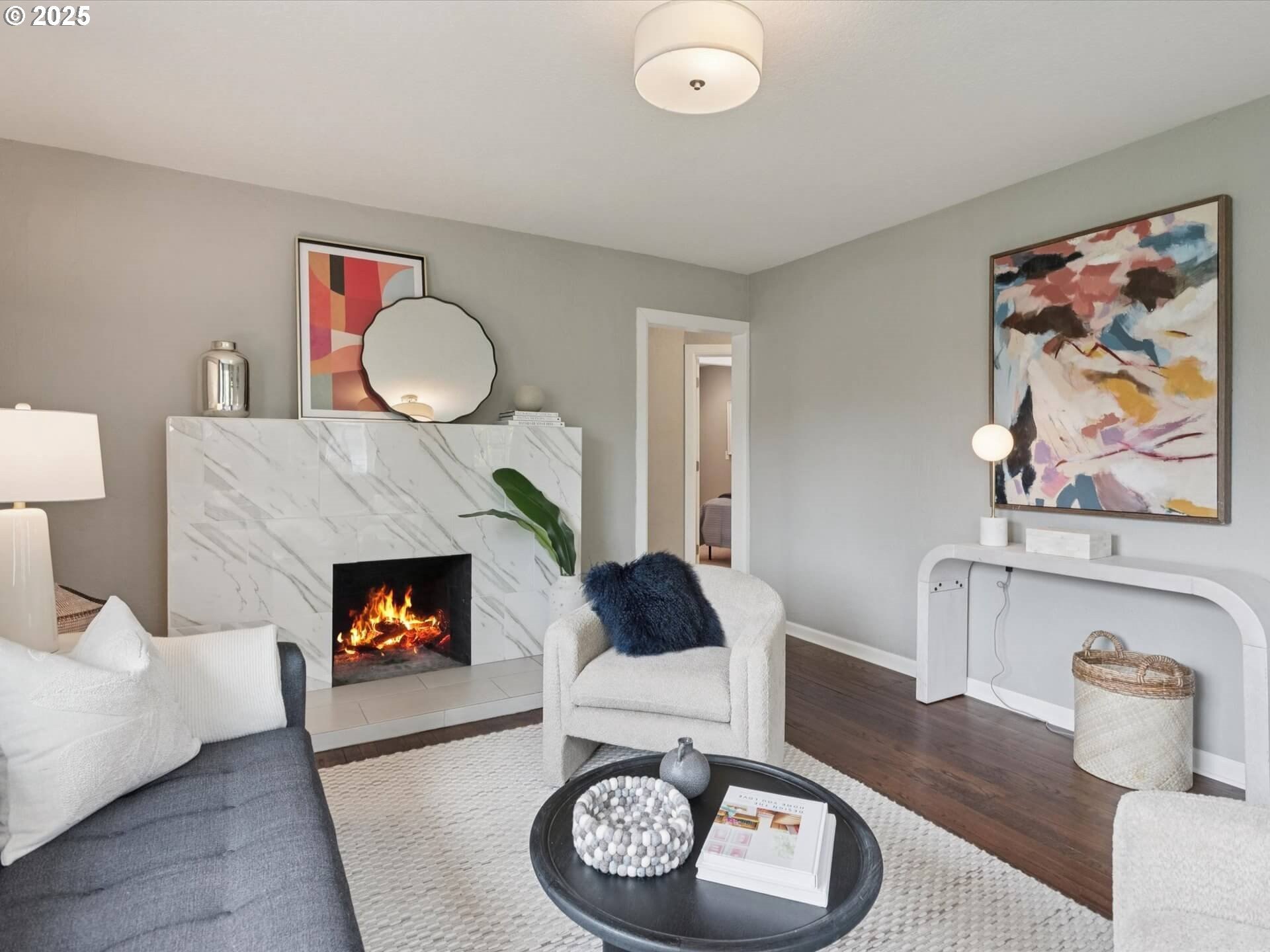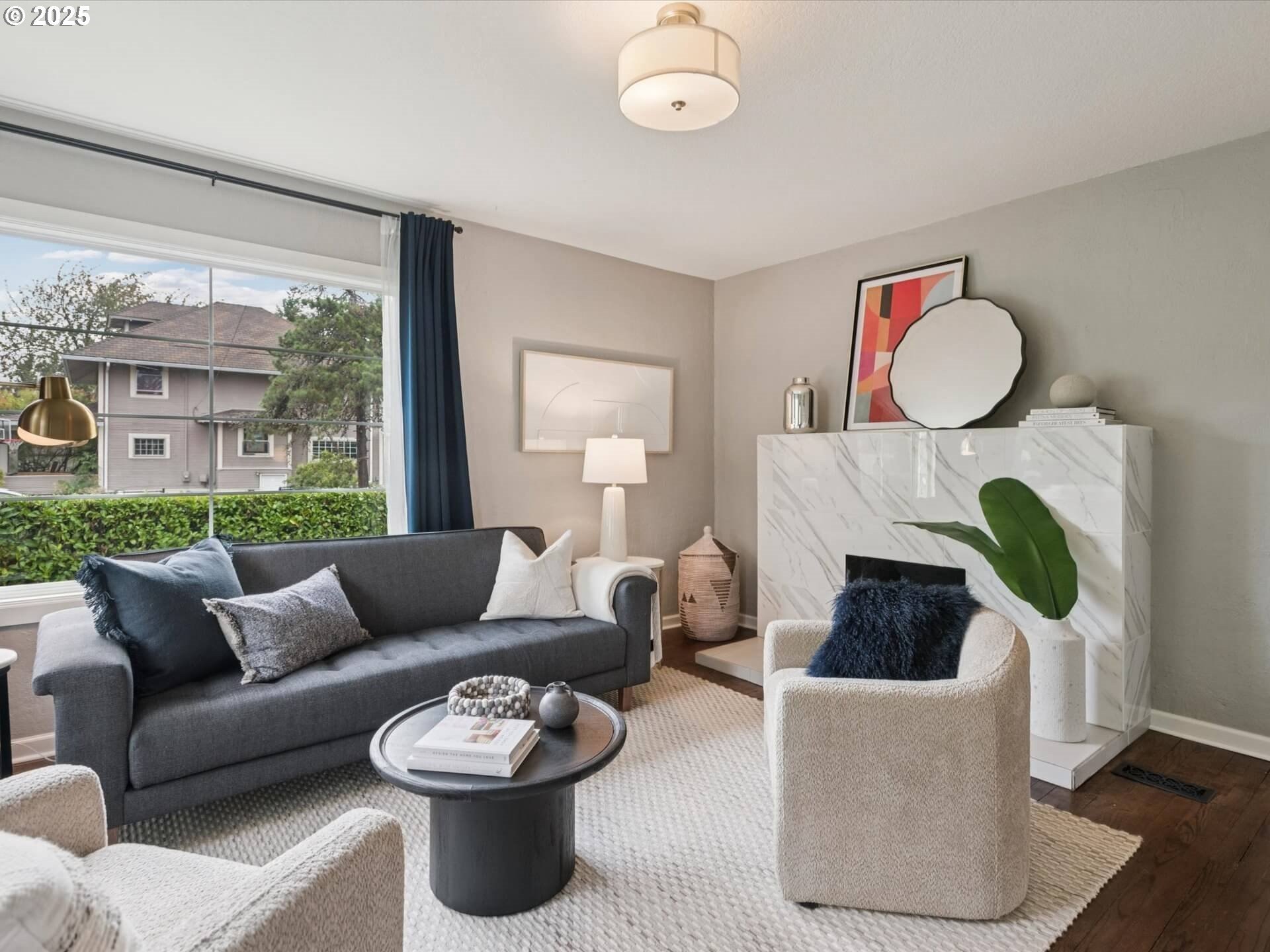 A beautifully renovated bungalow near Woodstock! This home effortlessly blends classic charm with modern upgrades, beginning with gleaming hardwood floors and a striking Calcutta-tiled fireplace. Enjoy peace of mind with newer siding, roof, gutters, furnace, hot water heater, central AC – plus a sprinkler system with drip irrigation, decommissioned oil tank, and radon mitigation system for added comfort and efficiency. The sun-drenched, spacious kitchen features quartz countertops, wainscoting, a dual five-burner range, and a refrigerator with built-in ice maker. Retreat to the luxurious primary ensuite, complete with a custom walk-in closet designed with uplighting and ample space for the most dedicated shoe or wardrobe enthusiast. The spa-like bathroom includes double sinks, quartz counters, a soaking tub, and abundant storage. Step outside to a fully fenced yard oasis, complete with mature landscaping, raised garden beds, a new storage shed, and a covered patio ideal for year-round enjoyment. Off-street parking adds convenience, and the location — near both Brentwood Park and Mt. Scott Community Center — offers loads of neighborhood fun!