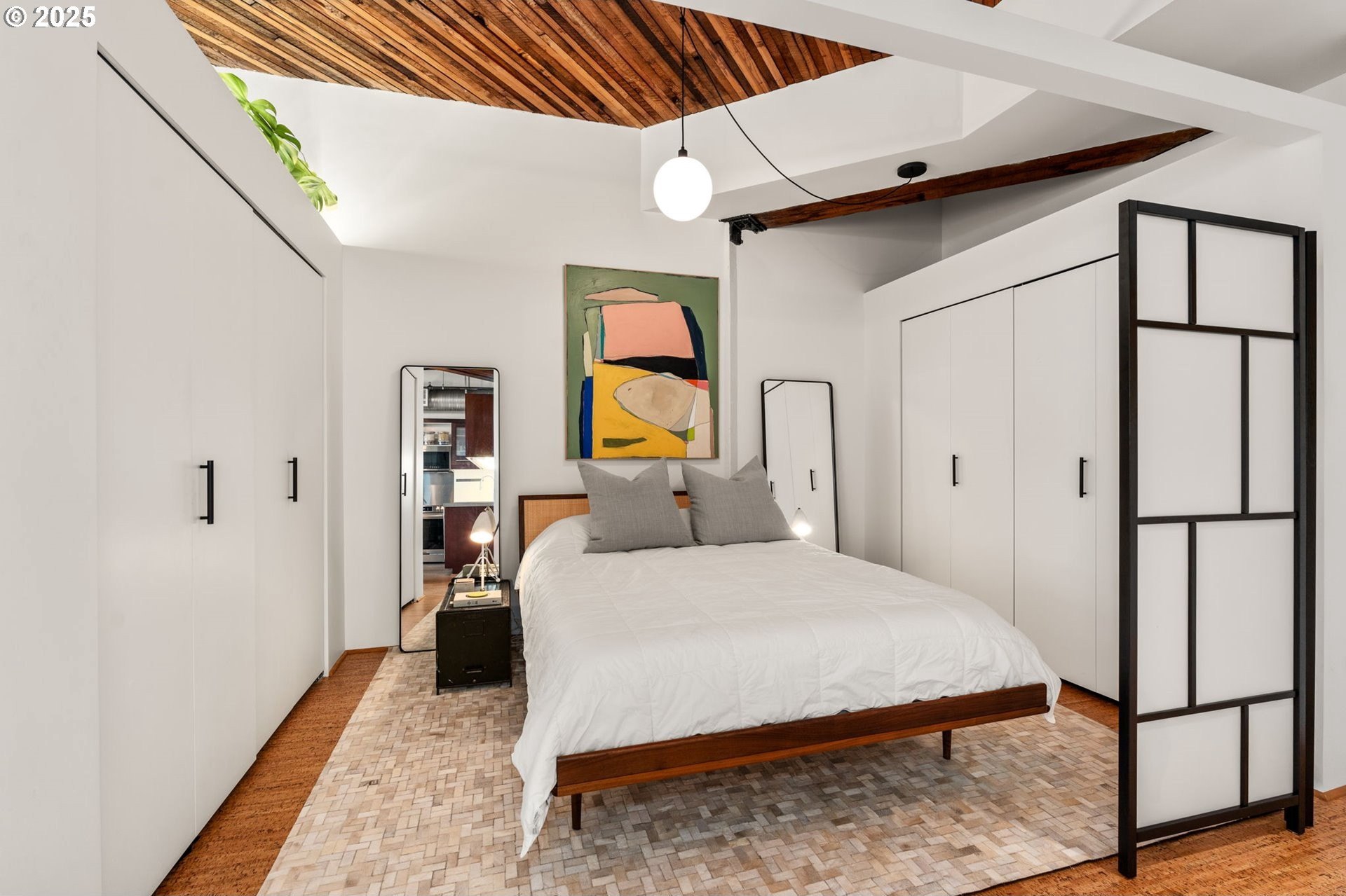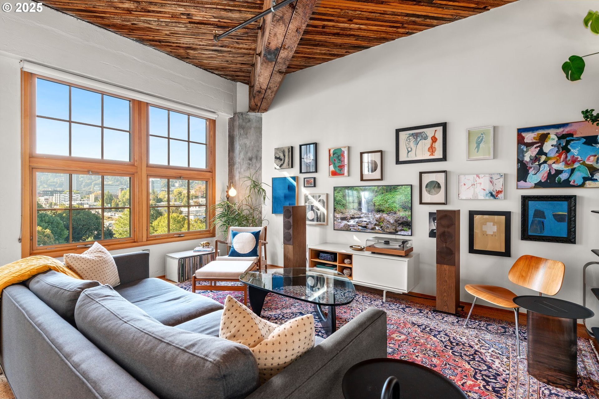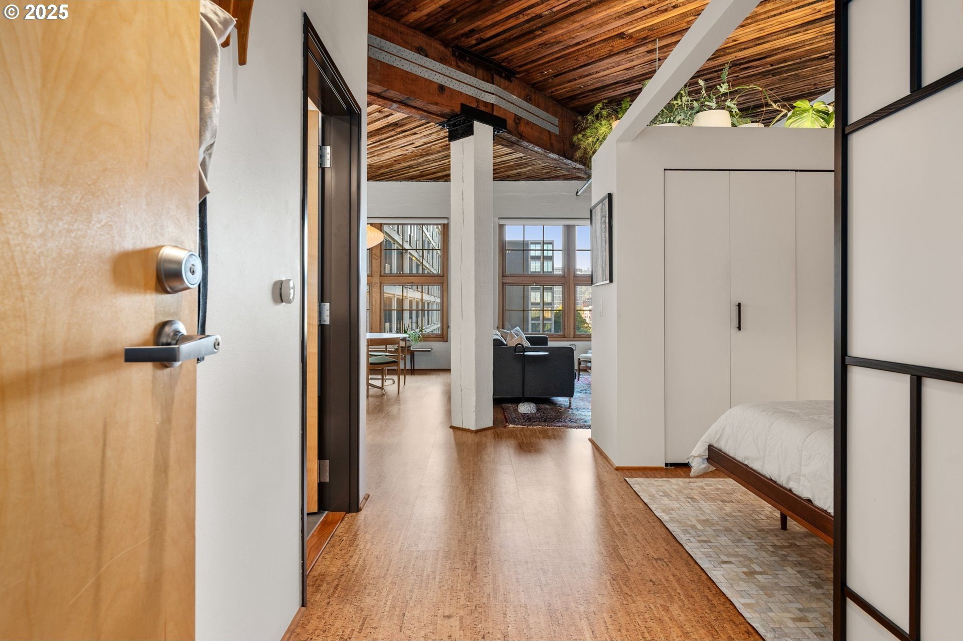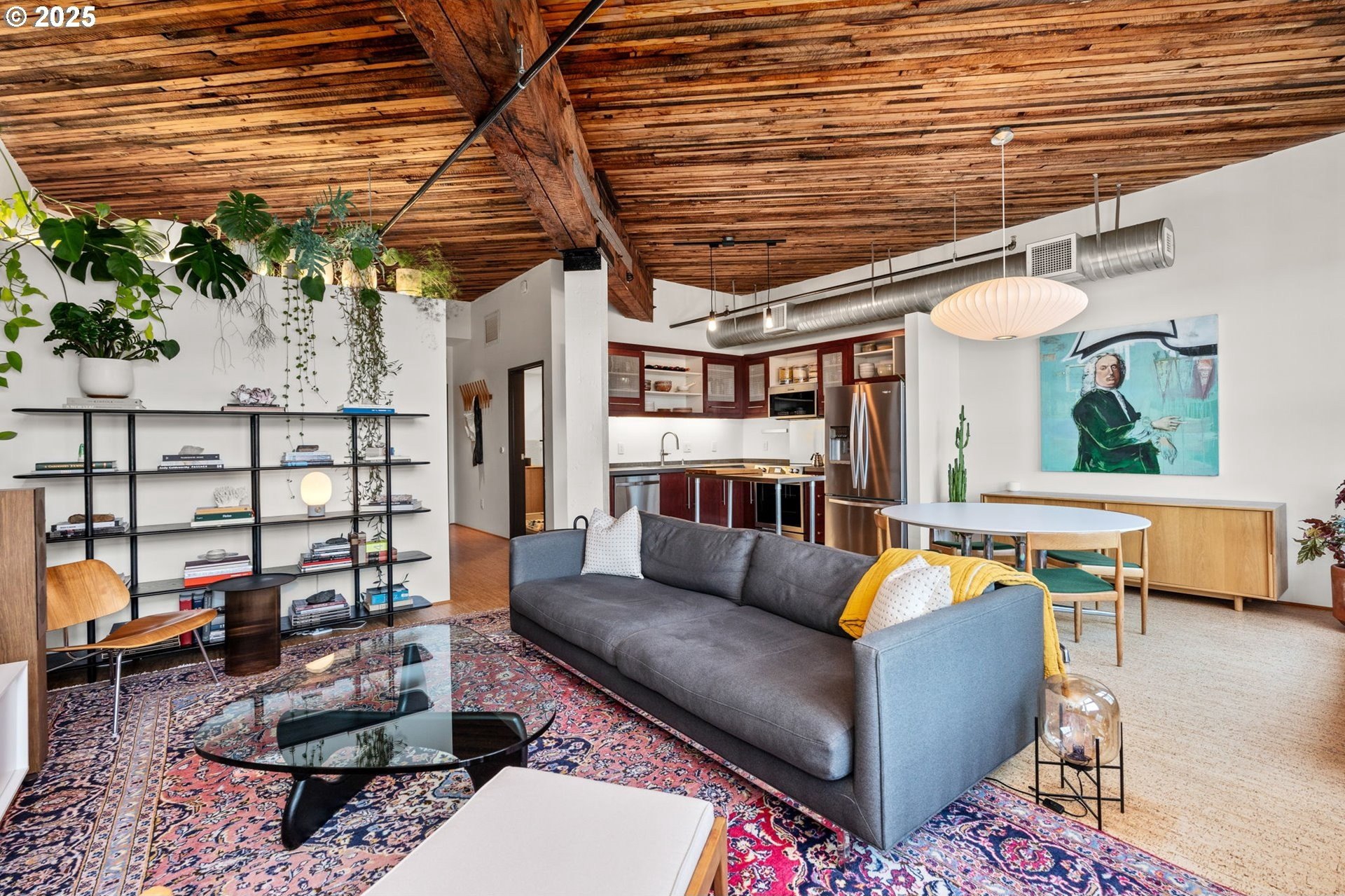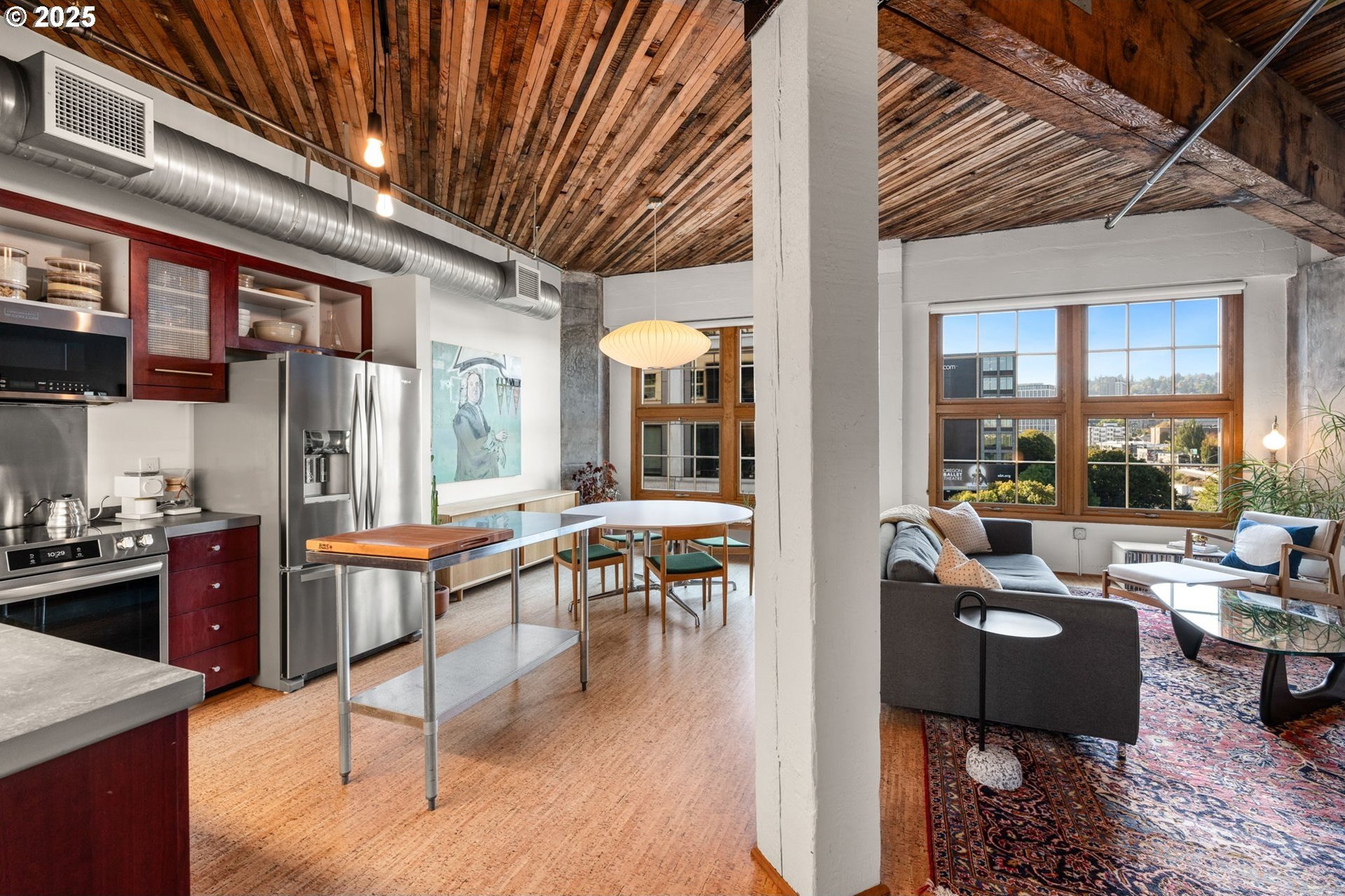 This historic loft in Portland's Pearl District blends industrial charm with modern updates. The open-concept layout features timber-beamed ceilings, warm cork floors and full-height Chown Pella windows showcasing unobstructed city and West Hill views. With its southern exposure, the loft is filled with natural light year-round, even on Portland’s grayest days—a key feature that makes it such a special home. The renovated bathroom (2023) offers elegant floor-to-ceiling tilework and a extra tall rain shower head, new washer & dryer (2017), non-conforming bedroom with custom builtin closets, while the kitchen refresh (2025) includes new stainless steel appliances, sink, faucet, and disposal. A new roof-mounted heat pump/AC (2024) provides efficient climate control, and the updated flooring (2021) ties the space together beautifully. Additional highlights include a deeded full-size parking space on the ground level and a large deeded storage room on the 2nd floor.The Marshall Wells Lofts community is known for its strong HOA, commitment to maintaining the building’s historic integrity, and a friendly, connected atmosphere. Residents enjoy access to a lush courtyard ideal for outdoor relaxation and gatherings. This historic loft is ideally situated in Portland’s Pearl District—just steps from the city’s best restaurants, boutiques, gyms and bookstores.