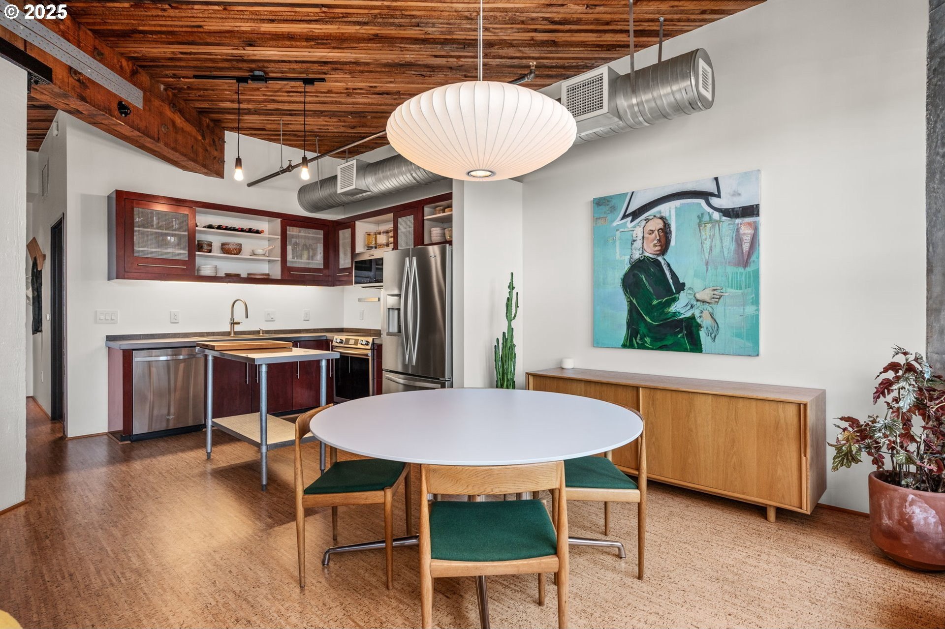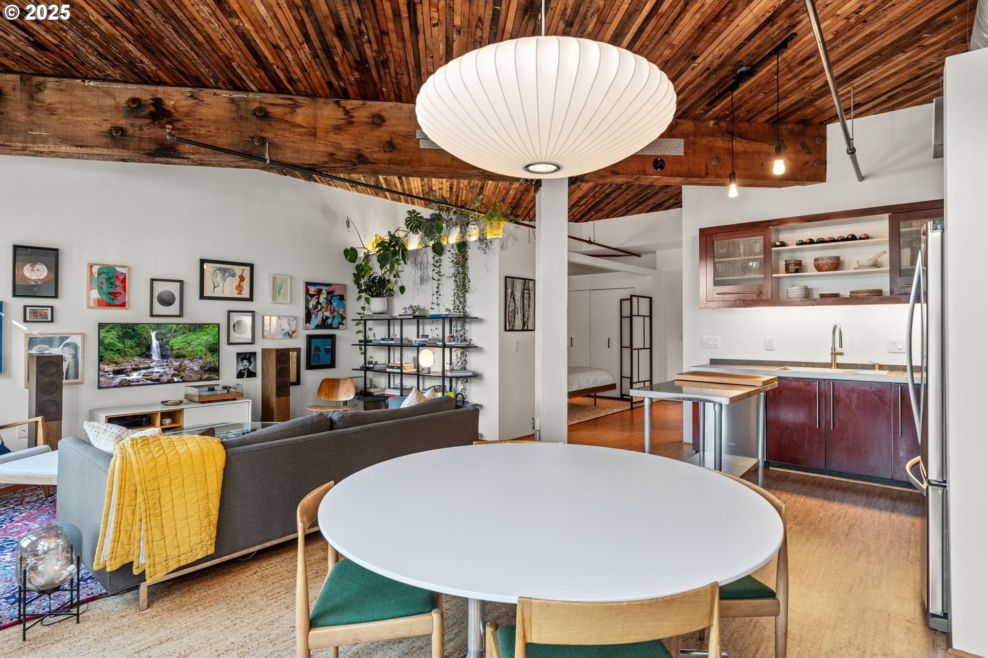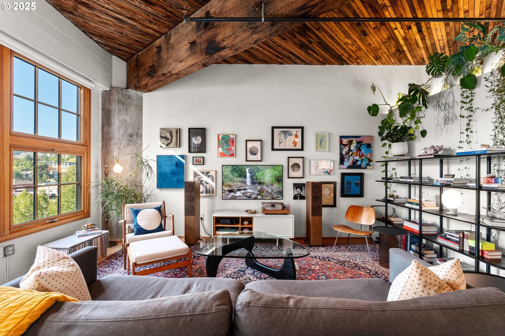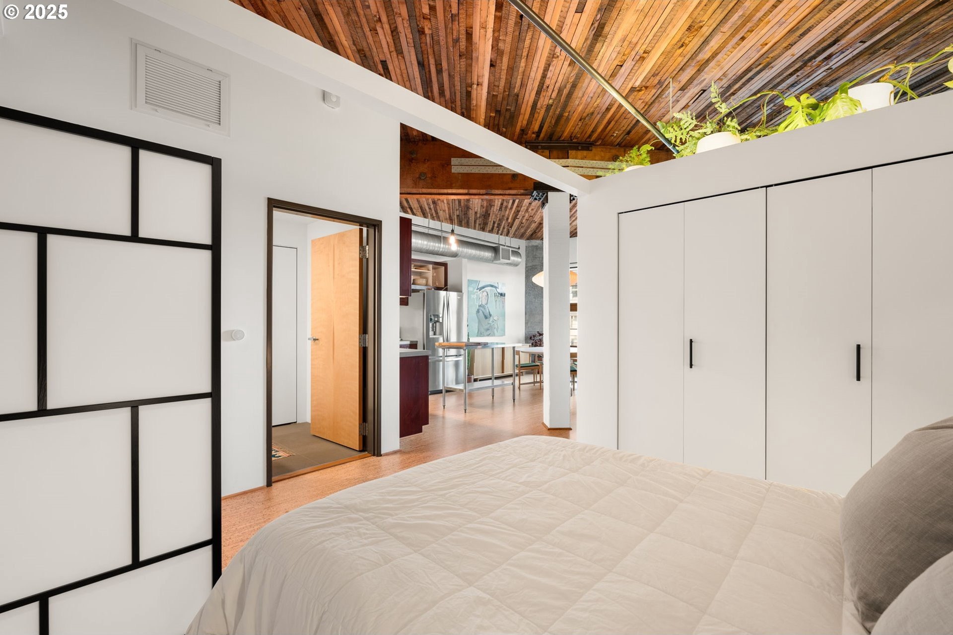This historic loft in Portland's Pearl District blends industrial charm with modern updates. The open-concept layout features timber-beamed ceilings, warm cork floors and full-height Chown Pella windows showcasing unobstructed city and West Hill views. With its southern exposure, the loft is filled with natural light year-round, even on Portland’s grayest days—a key feature that makes it such a special home. The renovated bathroom (2023) offers elegant floor-to-ceiling tilework and a extra tall rain shower head, new washer & dryer (2017), non-conforming bedroom with custom builtin closets, while the kitchen refresh (2025) includes new stainless steel appliances, sink, faucet, and disposal. A new roof-mounted heat pump/AC (2024) provides efficient climate control, and the updated flooring (2021) ties the space together beautifully. Additional highlights include a deeded full-size parking space on the ground level and a large deeded storage room on the 2nd floor.The Marshall Wells Lofts community is known for its strong HOA, commitment to maintaining the building’s historic integrity, and a friendly, connected atmosphere. Residents enjoy access to a lush courtyard ideal for outdoor relaxation and gatherings. This historic loft is ideally situated in Portland’s Pearl District—just steps from the city’s best restaurants, boutiques, gyms and bookstores.