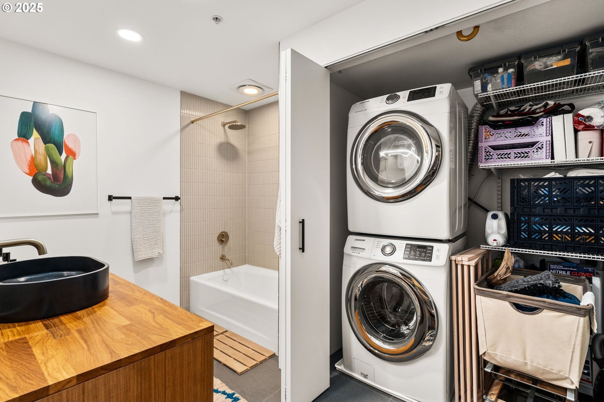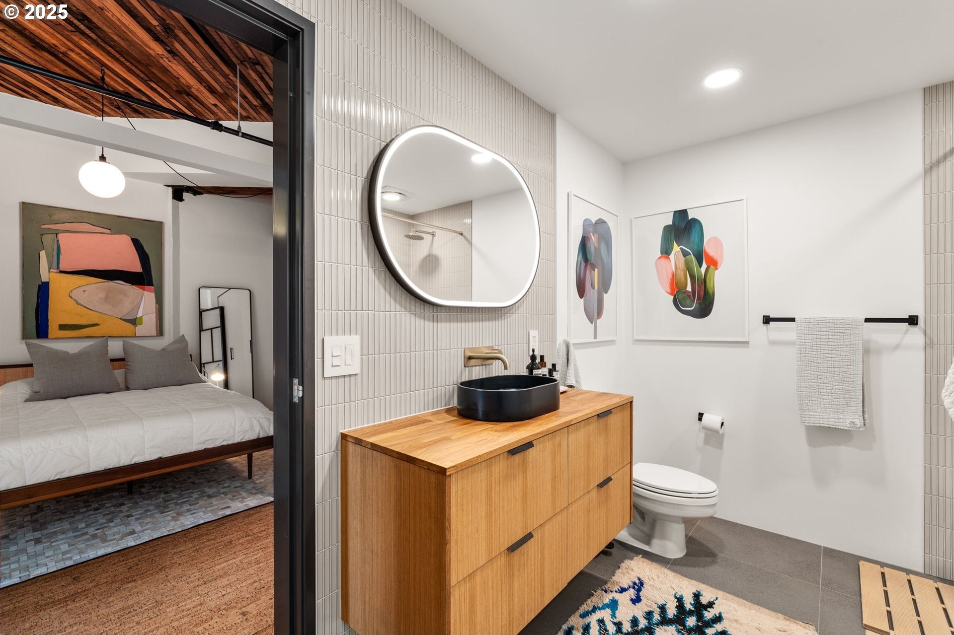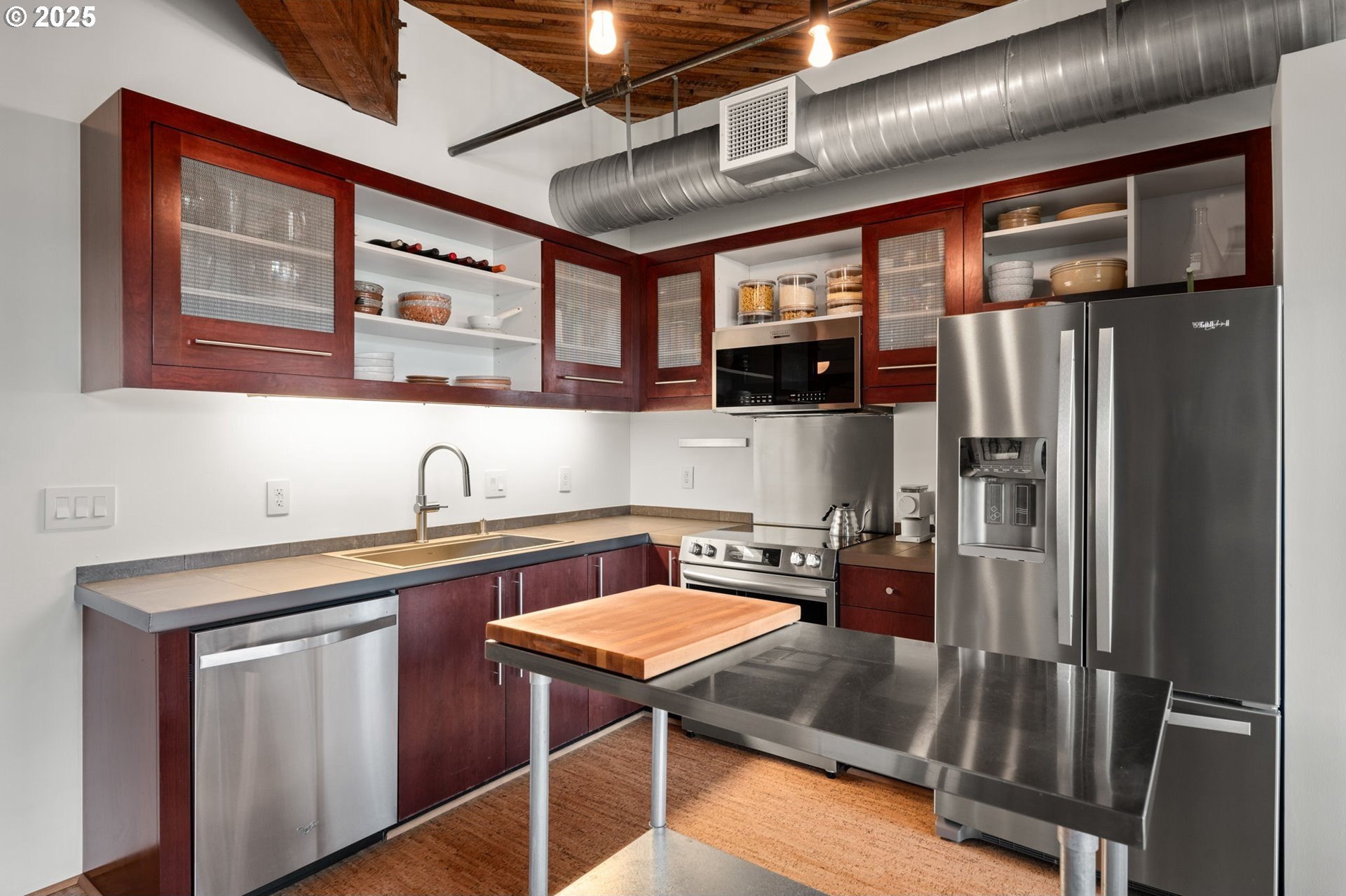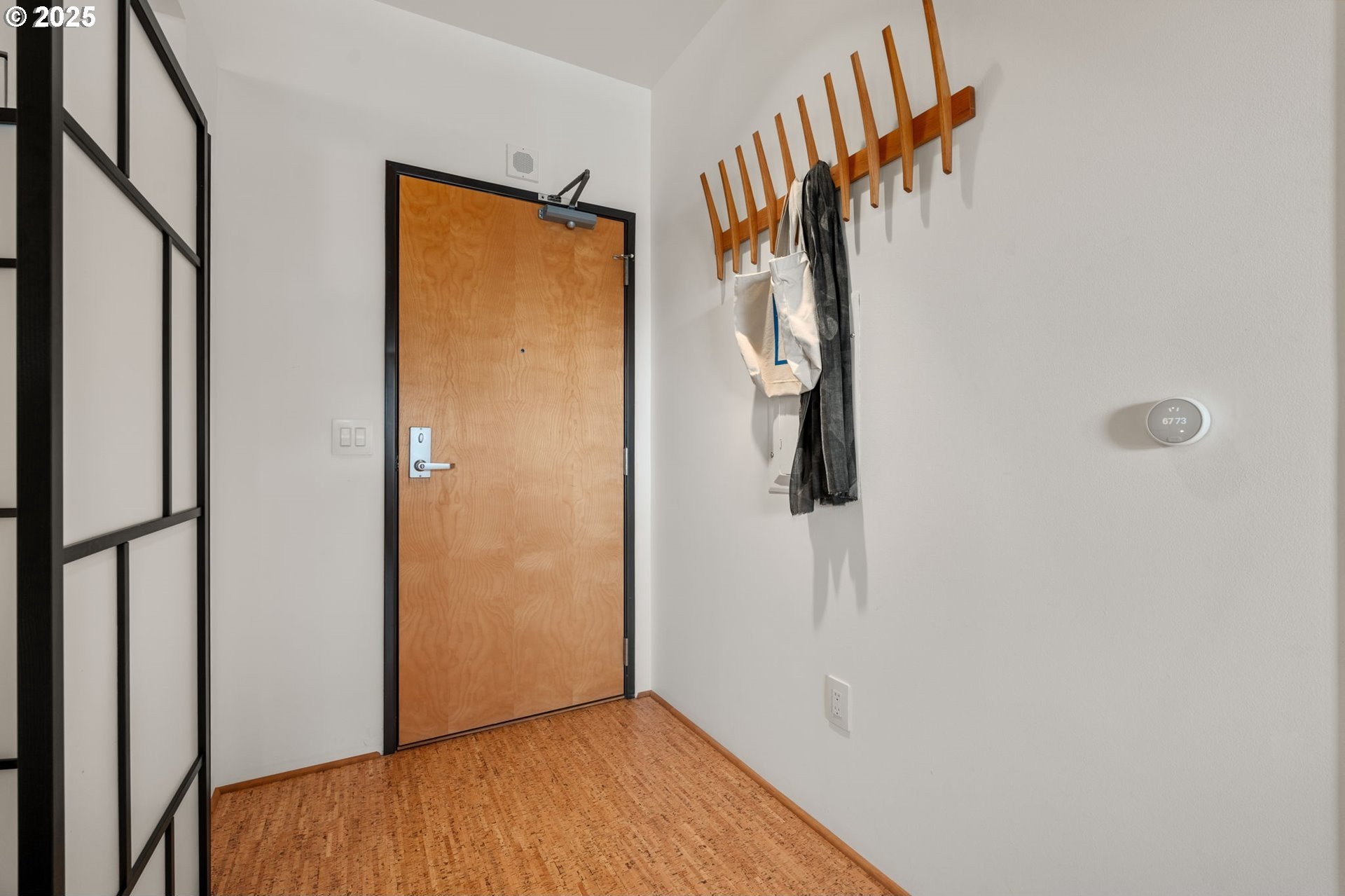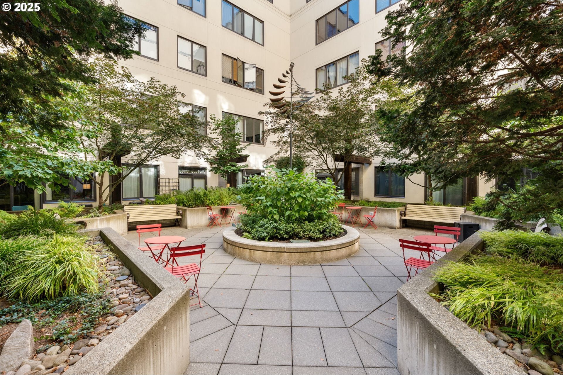 This historic loft in Portland's Pearl District blends industrial charm with modern updates. The open-concept layout features timber-beamed ceilings, warm cork floors and full-height Chown Pella windows showcasing unobstructed city and West Hill views. With its southern exposure, the loft is filled with natural light year-round, even on Portland’s grayest days—a key feature that makes it such a special home. The renovated bathroom (2023) offers elegant floor-to-ceiling tilework and a extra tall rain shower head, new washer & dryer (2017), non-conforming bedroom with custom builtin closets, while the kitchen refresh (2025) includes new stainless steel appliances, sink, faucet, and disposal. A new roof-mounted heat pump/AC (2024) provides efficient climate control, and the updated flooring (2021) ties the space together beautifully. Additional highlights include a deeded full-size parking space on the ground level and a large deeded storage room on the 2nd floor.The Marshall Wells Lofts community is known for its strong HOA, commitment to maintaining the building’s historic integrity, and a friendly, connected atmosphere. Residents enjoy access to a lush courtyard ideal for outdoor relaxation and gatherings. This historic loft is ideally situated in Portland’s Pearl District—just steps from the city’s best restaurants, boutiques, gyms and bookstores.