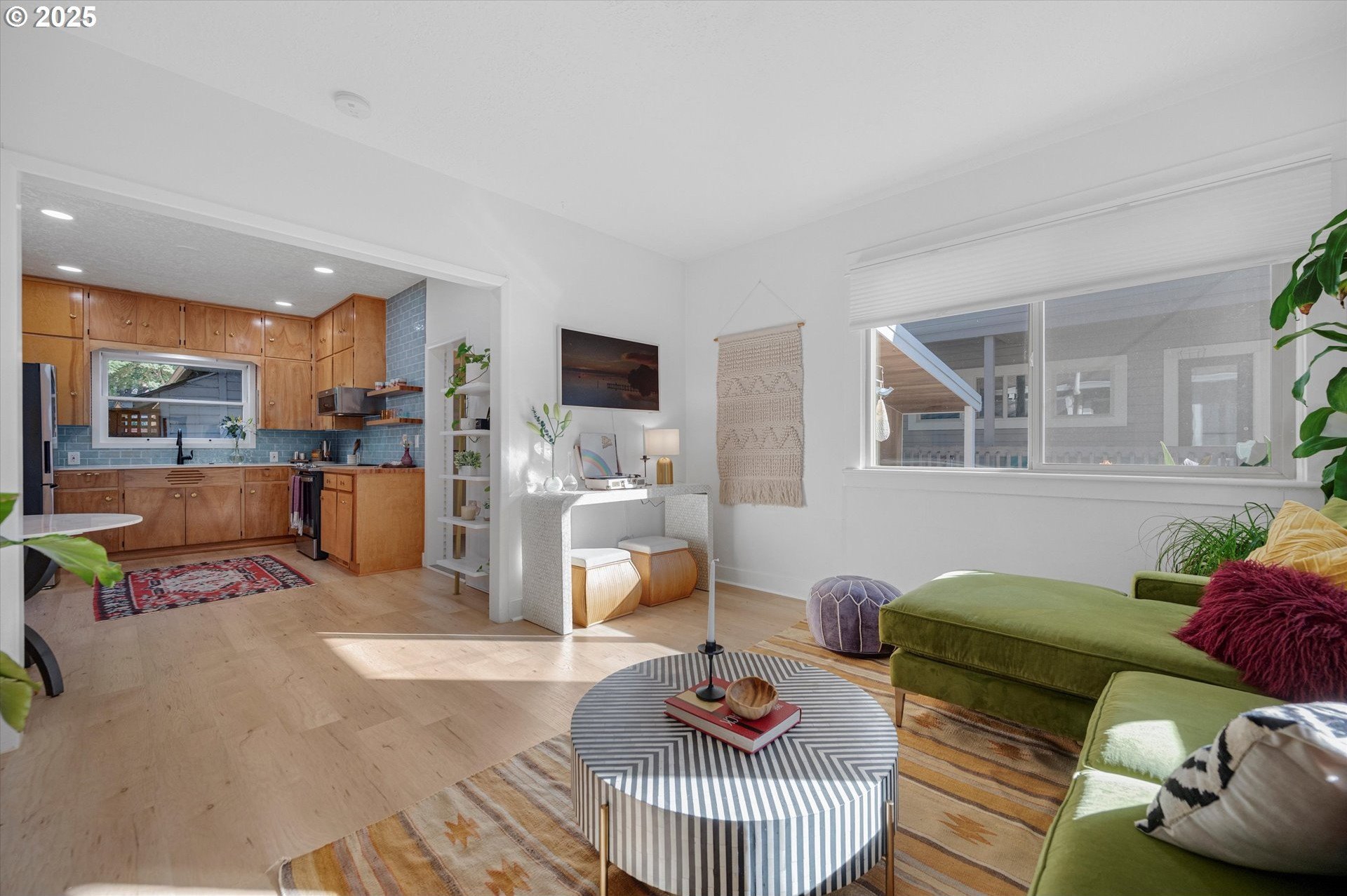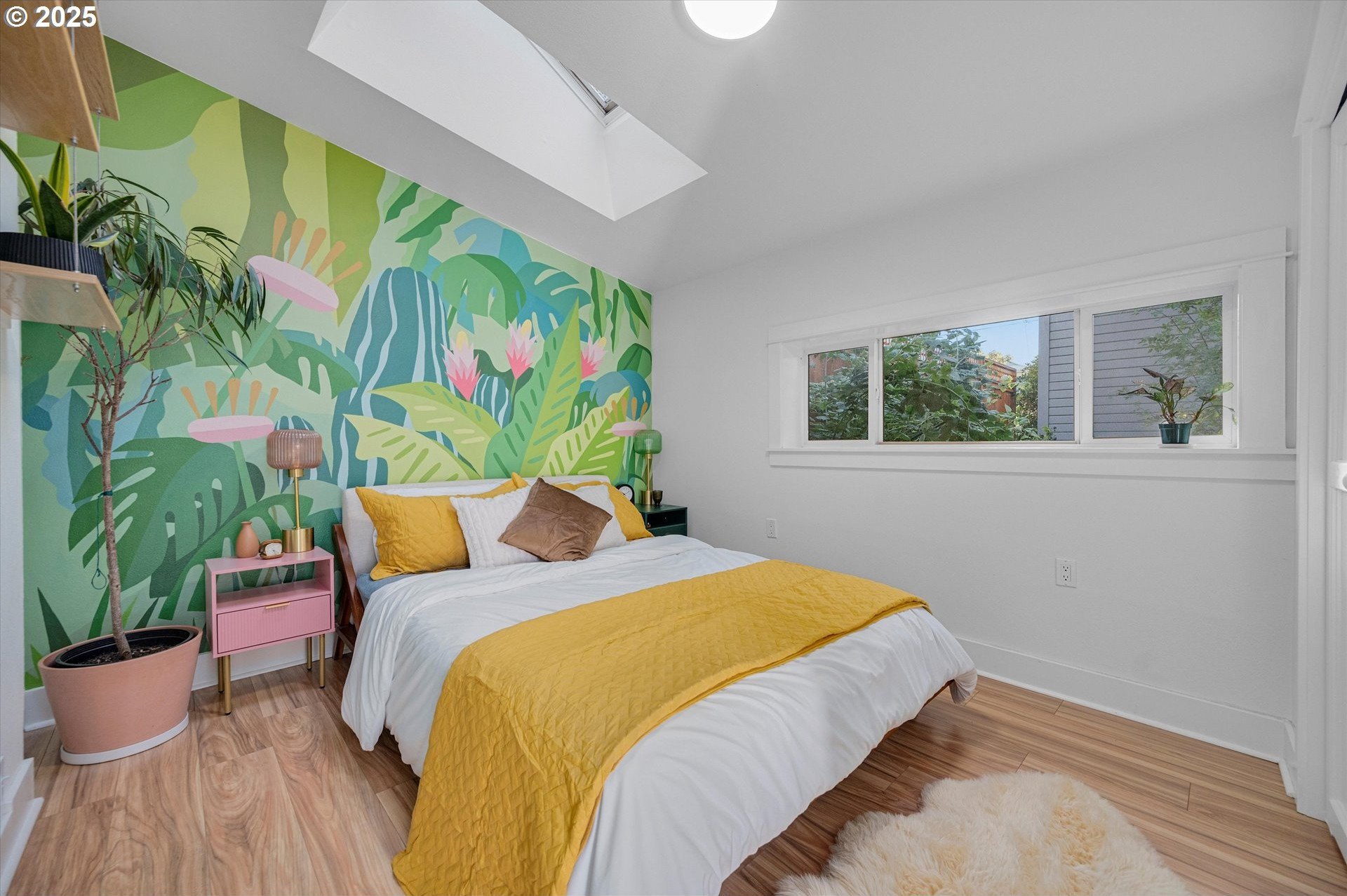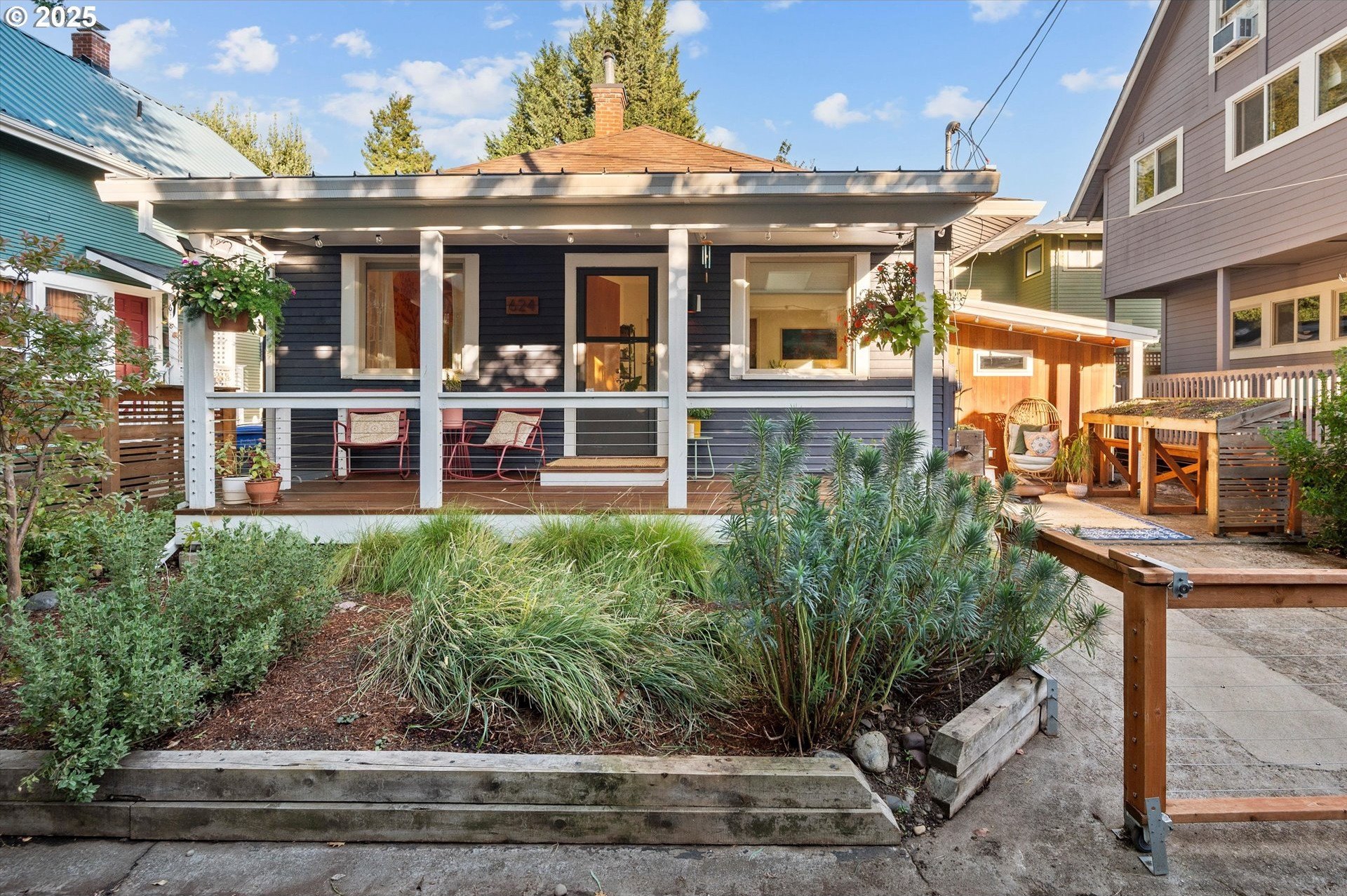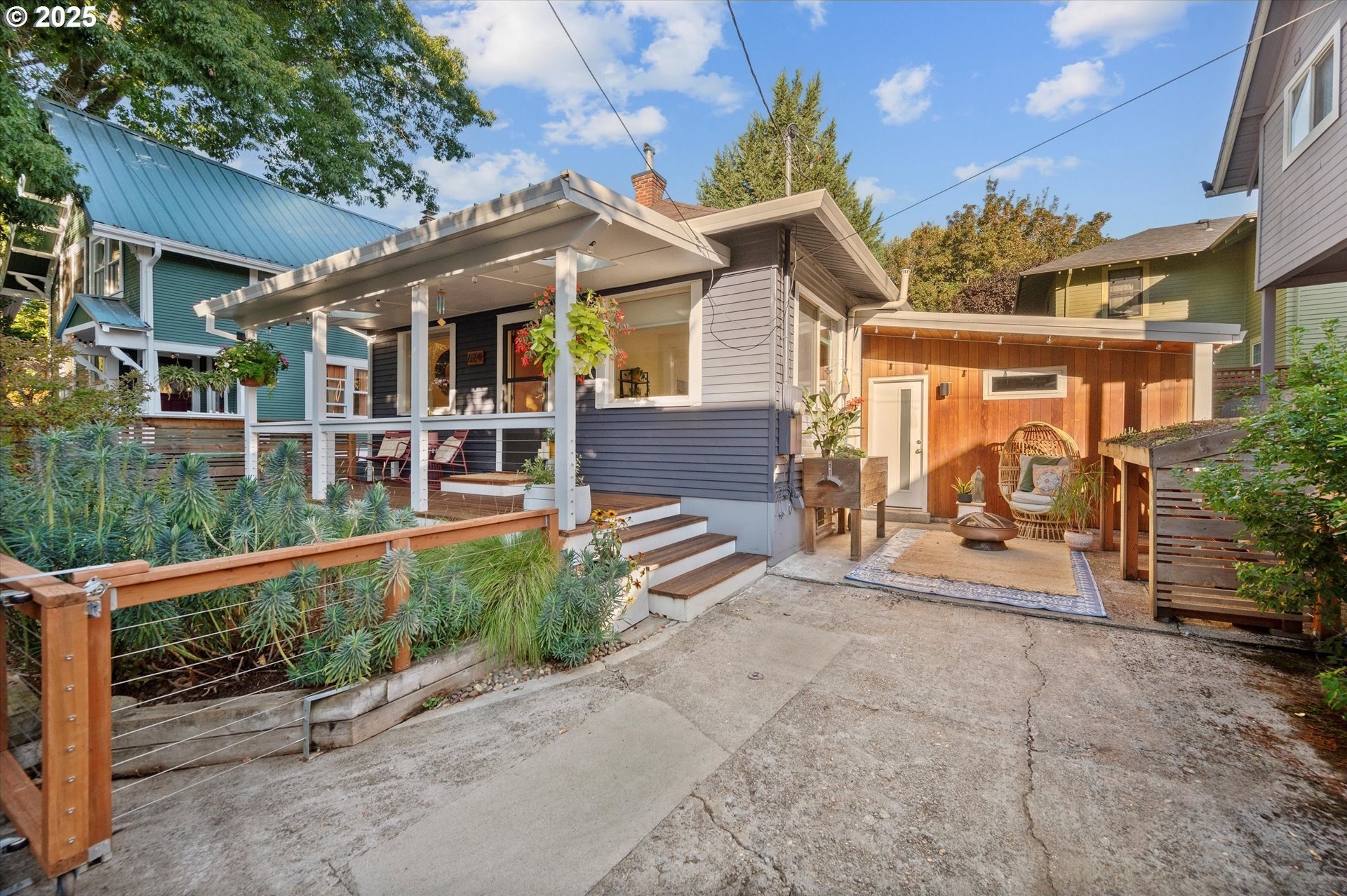 Hidden away on a quiet side street, this storybook Sunnyside cottage is a rare Portland find — just blocks to Belmont Street and Laurelhurst Park. Every detail of this home has been thoughtfully reimagined for modern living, with convenience, comfort, and an eye for design. Step inside to a light-filled living room with 8ft. ceilings, custom finishes, and open floorplan. The updated kitchen shines with quartz countertops, designer tile, and stainless appliances. Enjoy single-level living with three spacious bedrooms, two updated baths, and a large primary suite with a skylight illuminating a hand painted mural by Portland's own Lettie Jane Rennekamp. Custom mudroom adds style and storage, while a partially finished basement with 7ft ceiling offers additional living space, or an easy path to an ADU conversion. Sip your morning matcha or evening negroni on the covered all-season porch, surrounded by native drought tolerant landscaping. When its time to explore, you can head out to Por que' No, Kens Artisan Pizza or Stumptown Coffee within blocks. Updates include modernized kitchen and baths, newer composition roof, gutters, furnace & A/C, 200 Amp panel, and so much more. [Home Energy Score = 5. HES Report at https://rpt.greenbuildingregistry.com/hes/OR10108117]