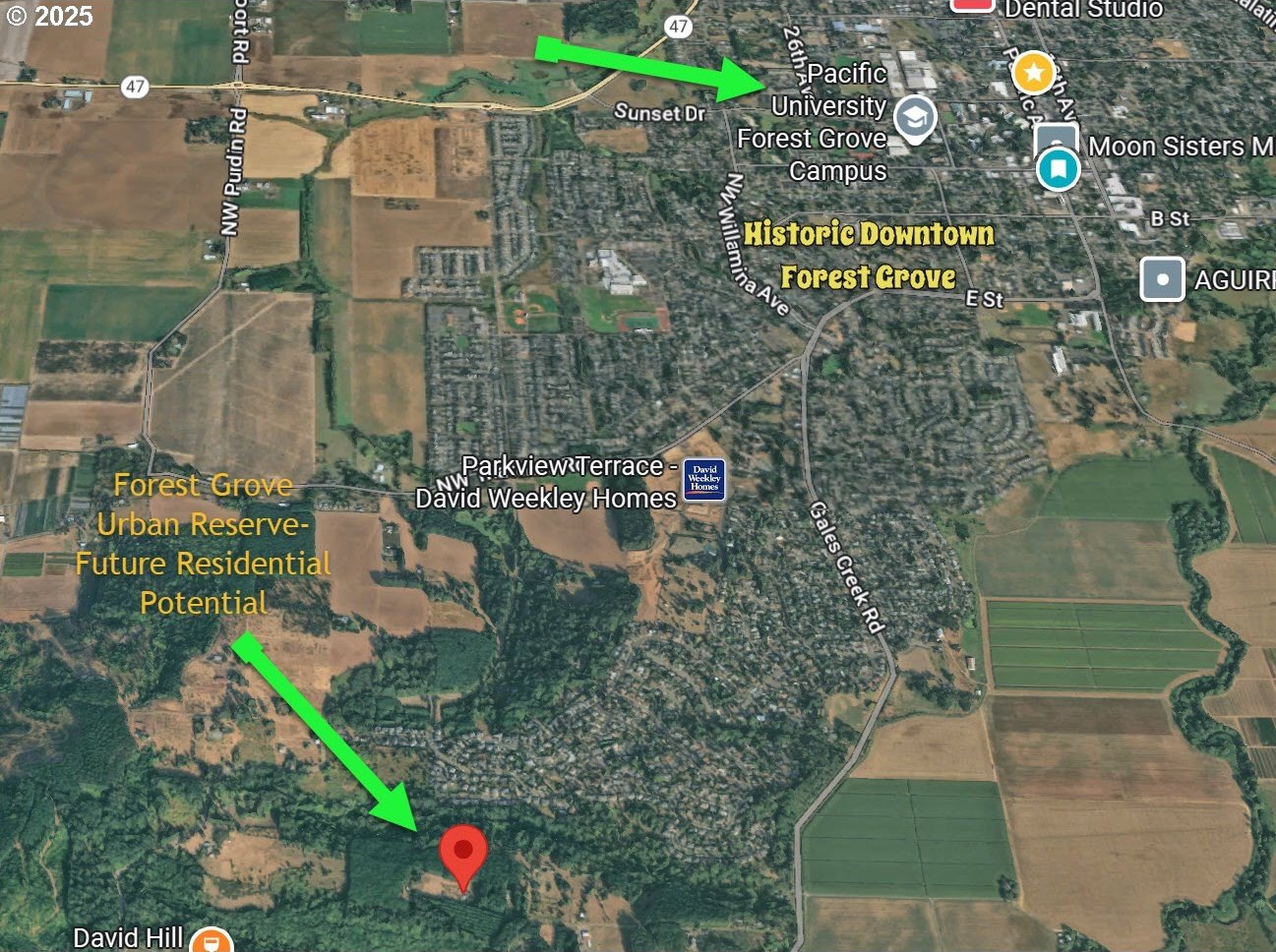 Open Sunday 1-4PM. Are you ready for a simpler, more abundant life? We have the opportunity you have been looking for! For over 80 years, the Jarrell family farmed, planted, & lived on this beautiful hillside acreage just west of Forest Grove. Generations were raised here on what became known locally as Jarrell Hill, where abundance came through hard work, good soil, and Oregon grit. This rare 10.52-acre property carries that legacy forward—an extraordinary blend of self-sufficiency, privacy, and opportunity.Set at the end of a private road, the land unfolds with a verdant pasture, orchard, and forest. About 2½ acres are in fenced gardens, orchard, and pasture—perfect for livestock, gardens, and a life close to the land. Over 40 mature fruit trees (apples, pears, prunes, peaches, figs, and more) thrive alongside grapevines, berries, and a bounty of vegetables protected by deer fencing. The Douglas fir plantation, valued at over $95,000 in 2024, continues to grow—offering both natural beauty and long-term value. The three-level, 2,243-square-foot farmhouse provides 4 Bedrooms with light, warmth, and character—a solid Craftsman-style home with great bones and a blank canvas for your vision. The property features a large garage & wood shop adjacent to the house, a 12×40 powered shop nestled in the forest—ideal for projects, tools, vehicles, or creative work—and an additional powered shed perfect for goats or chickens. The excellent well provides pure, abundant water, & the property’s solar potential, timber, & wood heat make off-grid living entirely possible. A seasonal creek winds through acres of natural woodland filled with big-leaf maples & native wildlife. With selective harvest, a clear view of Mt. Hood awaits from the eastern slope. All of this lies within the Forest Grove Urban Reserve, offering a substantial investment upside as growth continues to move west. Just minutes from Pacific University, local wineries, US 26, & a short drive to the Beach! Come See!