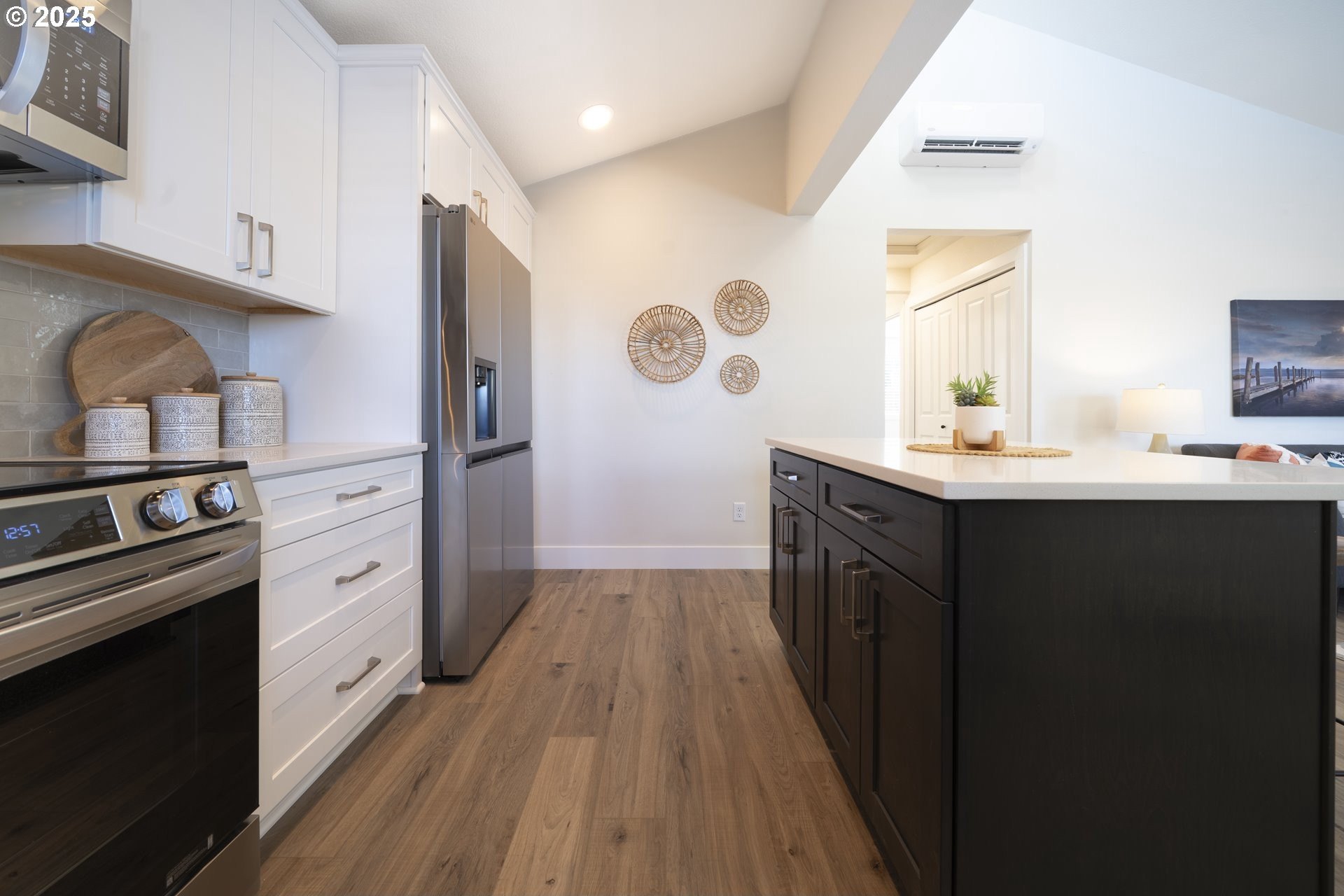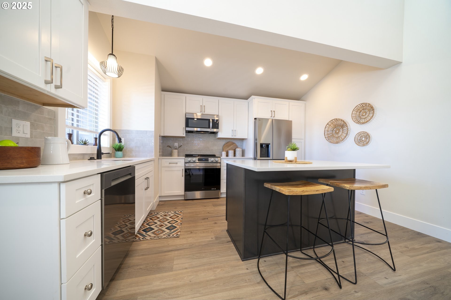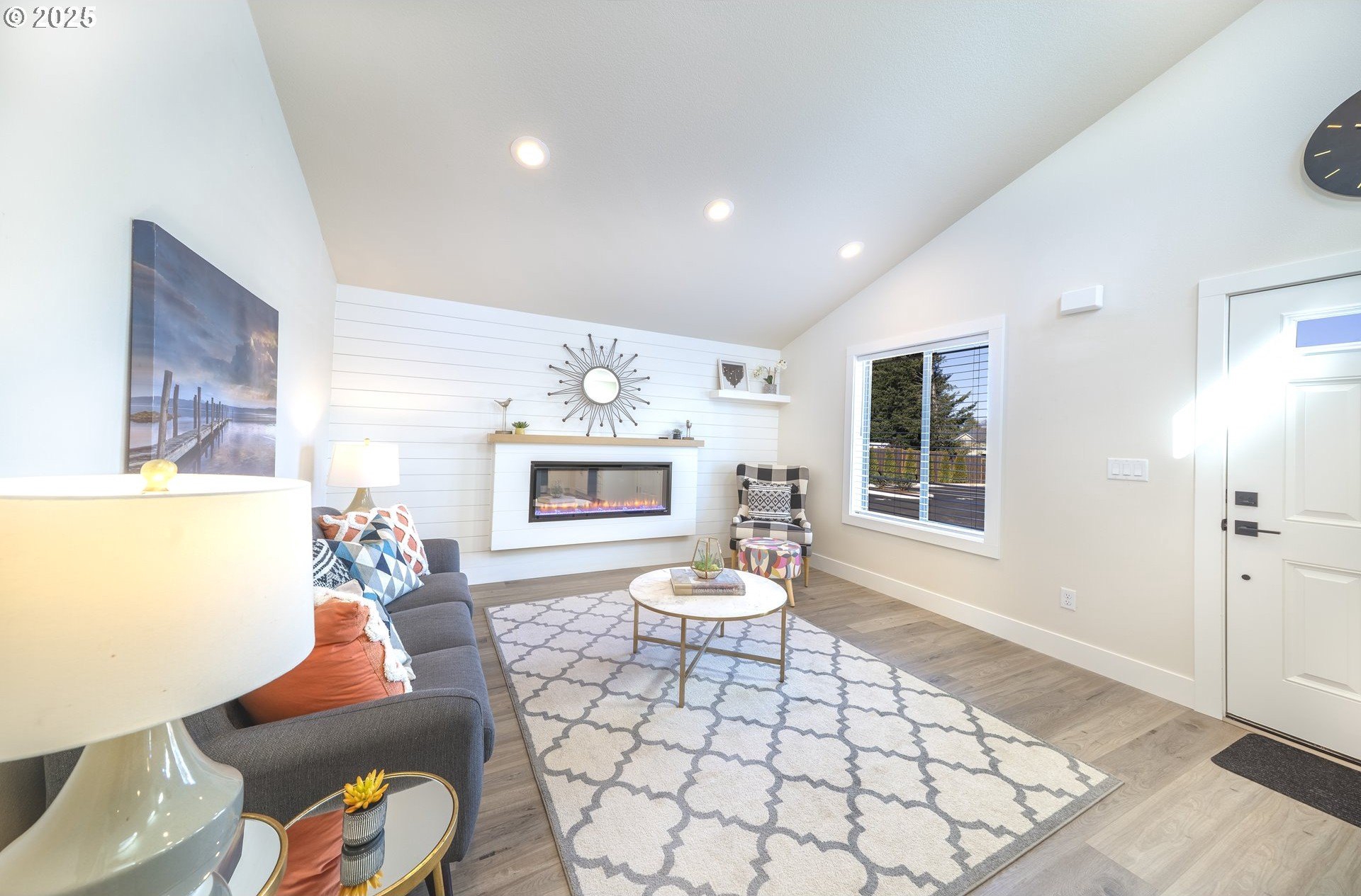 Brand new one level luxury cottage home thoughtfully designed for comfort and style. From the moment you enter, you’ll be welcomed by stunning luxury vinyl plank flooring, soaring vaulted ceilings, and an abundance of natural light that fills the open-concept living space.The heart of the home features a beautifully crafted kitchen complete with quartz countertops, soft-close cabinets, a spacious island, and premium stainless steel appliances—including the refrigerator. Cozy up in the inviting living room, highlighted by a floor-to-ceiling shiplap accent wall, floating built in shelve, and a sleek electric fireplace. This 2-bedroom, 2-bathroom gem includes a spacious primary suite with a luxurious attached bath, featuring a walk-in shower. Each home comes with a dedicated parking spot, and the $223/month HOA covers nearly everything except electricity and cable ensuring low-maintenance living. This home also offers a fenced private yard! Nestled in a peaceful neighborhood, you’re just a short walk to Wesley Linn Park and minutes from local shopping and amenities. Don’t miss this opportunity to own a beautifully designed home built by a trusted local custom home builder: Gerritz Custom Homes who has been building quality homes since: 1979. This custom cottage offers Luxury, convenience, and charm—all in one perfect package!