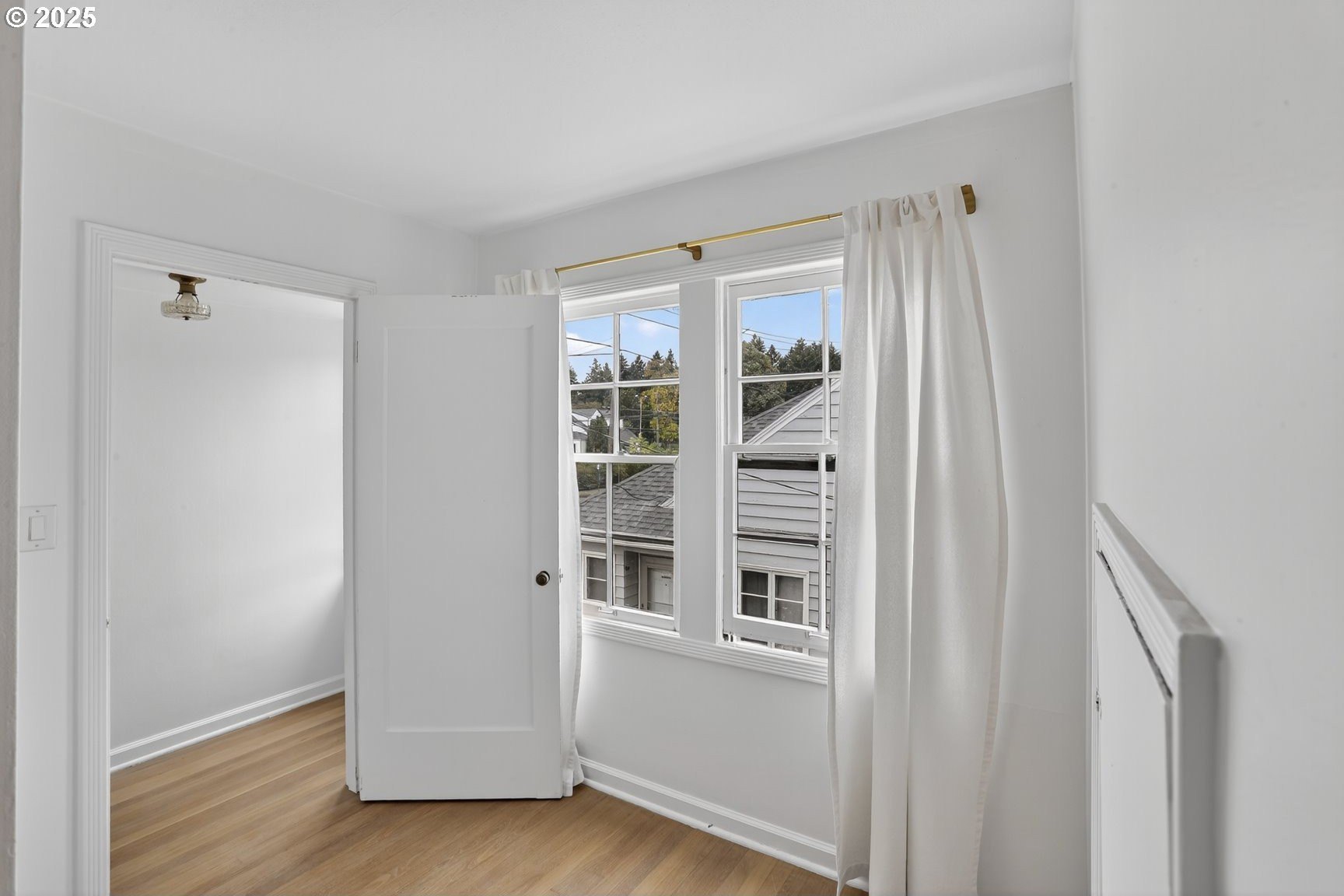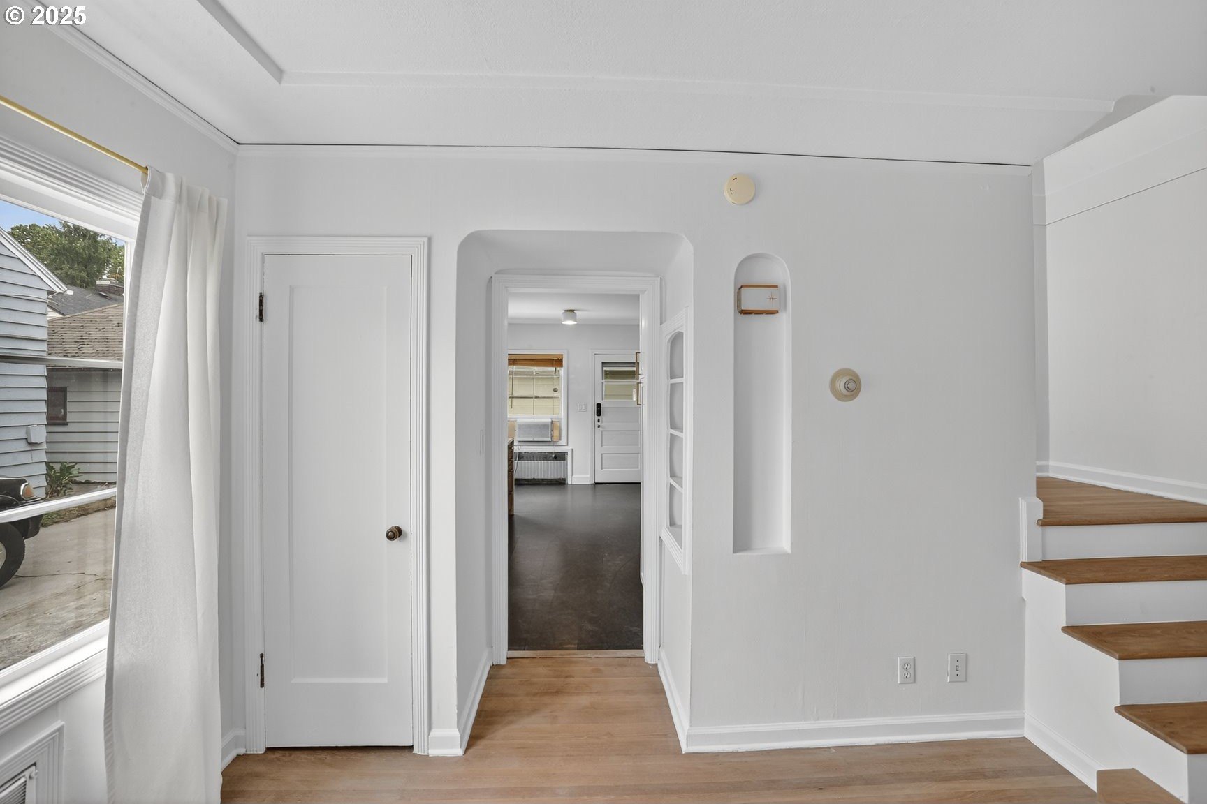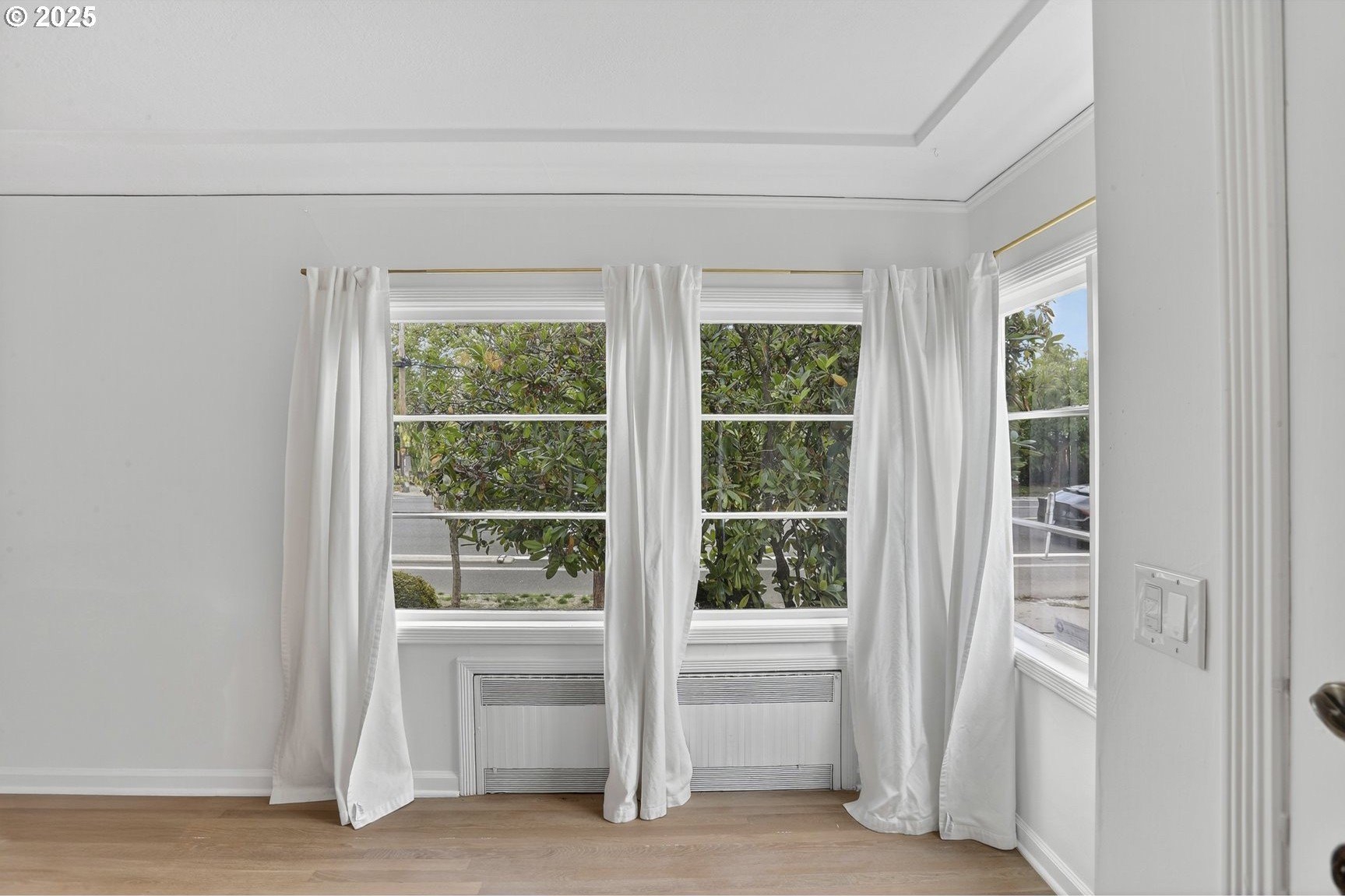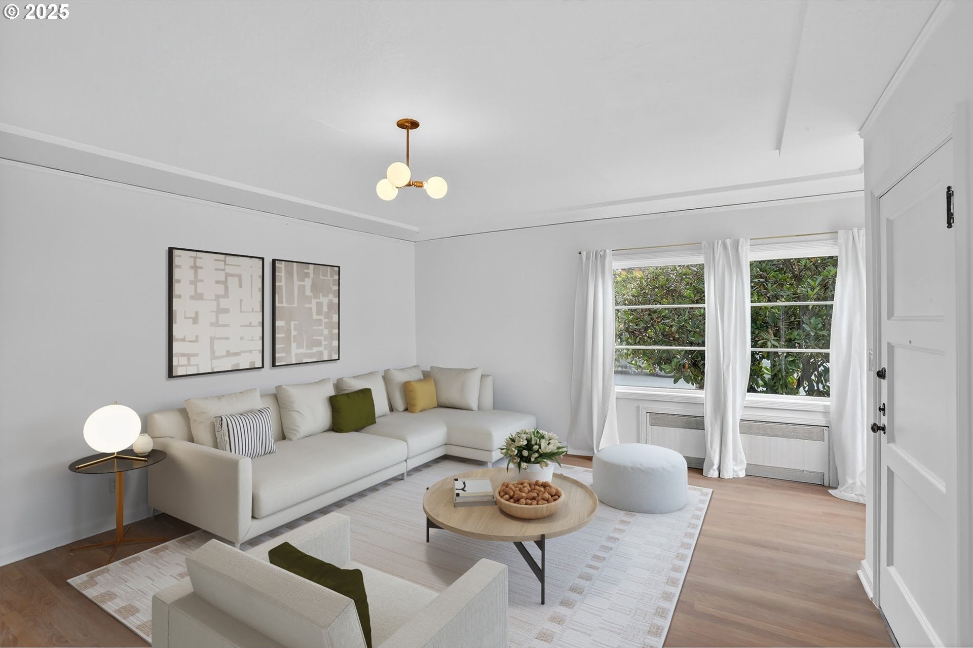 To say this end unit two story condo is charming is an understatement. The large living room is filled with natural light and period details such as, nooks, arches, charming picture rail, and gleaming hardwood floors (refinishing still in process-to be complete prior to closing). Moving through to the kitchen you'll find quality updates that are on trend with open shelving, high end appliances, an eat in kitchen nook and lots of clever storage. The bathroom has been remodeled to feature fabulous floor tile, wood countertop with wood shelf below and the star of the show which is the concrete vessel sink & mirror mounted wall sconces. Heading upstairs there is generous space at the top of the landing for a piece of furniture. The bedroom features two closets, Lots of windows, and space for a desk or dresser. A dedicated extra deep garage comes with the home and has a long driveway for extra parking. The common area features a workout room and a dedicated storage unit. The HOA fees cover more than your typical water, sewer garbage. The HOA fees also includes: Hot Water, Heat, Landscaping, and Weight Room. THE HOA FEE IS SCHEDULED TO LOWER TO $356/MONTH IN AUGUST 2026. (Temporarily raised to enhance reserve fund). This gorgeous condo is where period charm meets contemporary updates in a fantastic location across from the beautiful Peninsula Park Rose Garden.