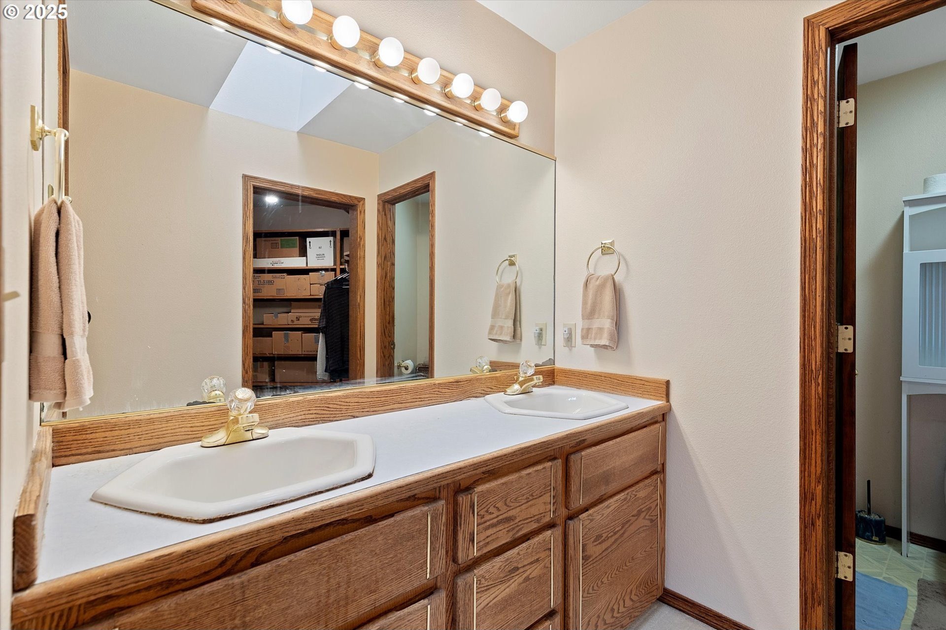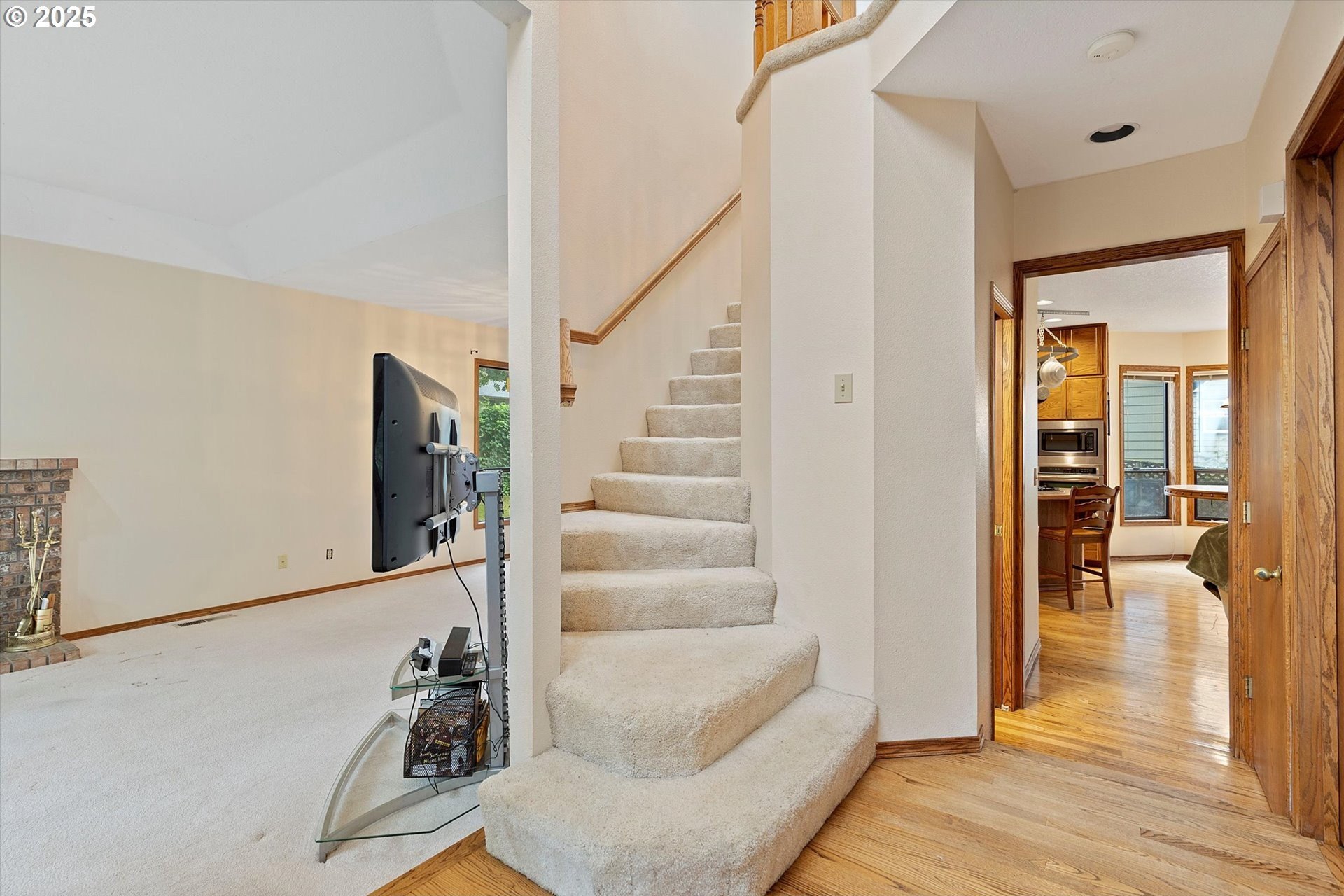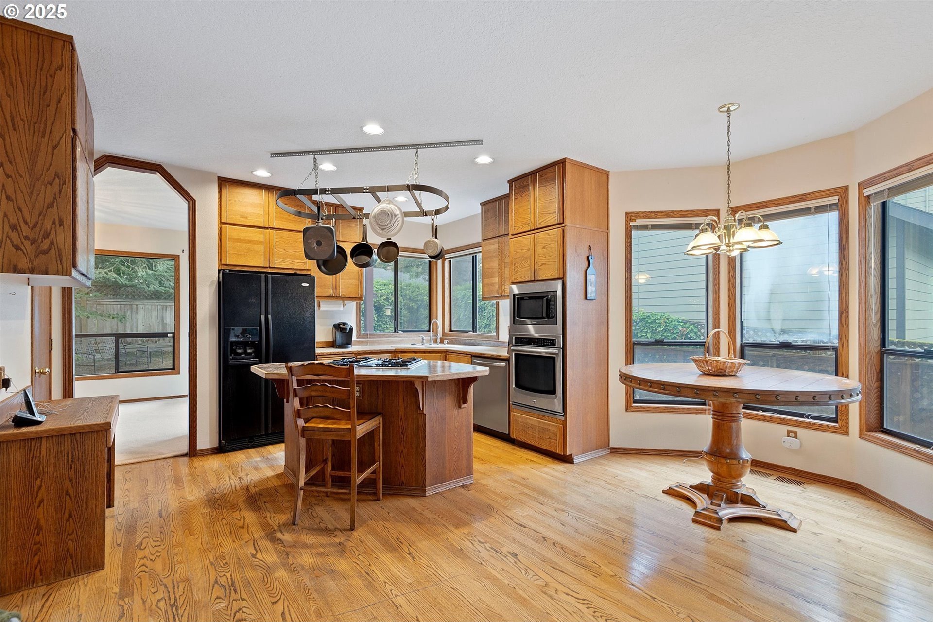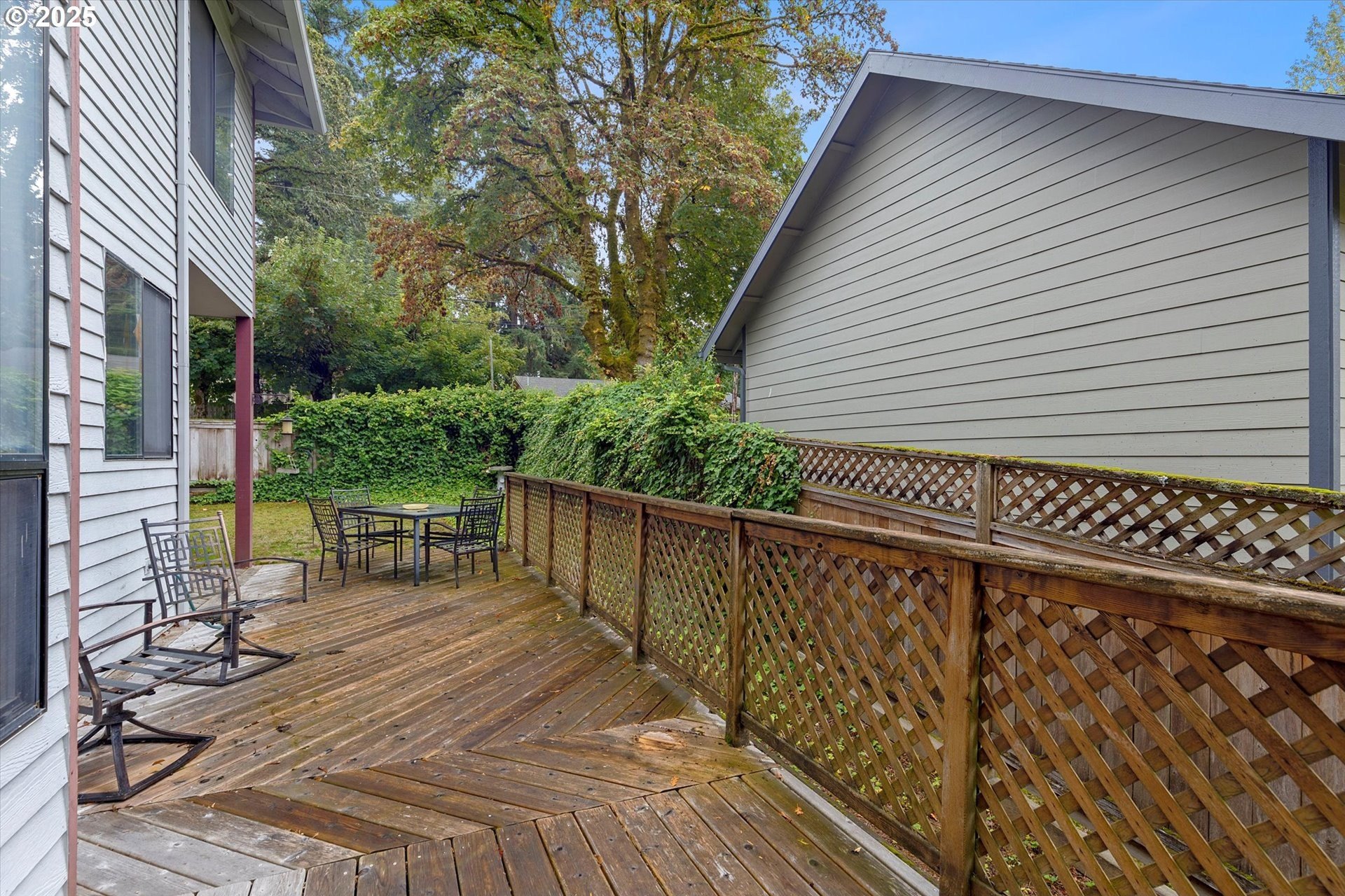 Traditional home has hardwood floors in entry, kitchen and family room, lots of windows, very light and bright with 4 foot skylight in wide hallway that overlooks entry, 3 skylights in all! Kitchen has cook island with gas cook top, stainless built in oven and microwave, bay window area, high ceilings, desk area, French Doors that open to deck in back, eat bar and a sitting area for table and or couch. Double high cabinets and cool pot rack! Family room has wood stove and hardwoods. Living room has gas fireplace, coved ceiling and bay window, dining room has large windows and chandelier. Primary bedroom suite is large with double sinks and walk in closet. Huge bonus room upstairs has wet bar and pool table. House has 3 skylights, Large laundry room has lots of cabinets, hanging rod and sink. Garage has super tall ceilings and is oversize. you can use for storage. Room for RV. Yard is fenced with 2 separate grass areas. Location is awesome, close to shopping, parks, yet very quiet and peaceful street. See attached neighborhood video to learn more about neighborhood