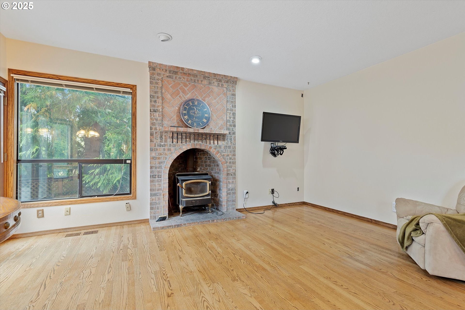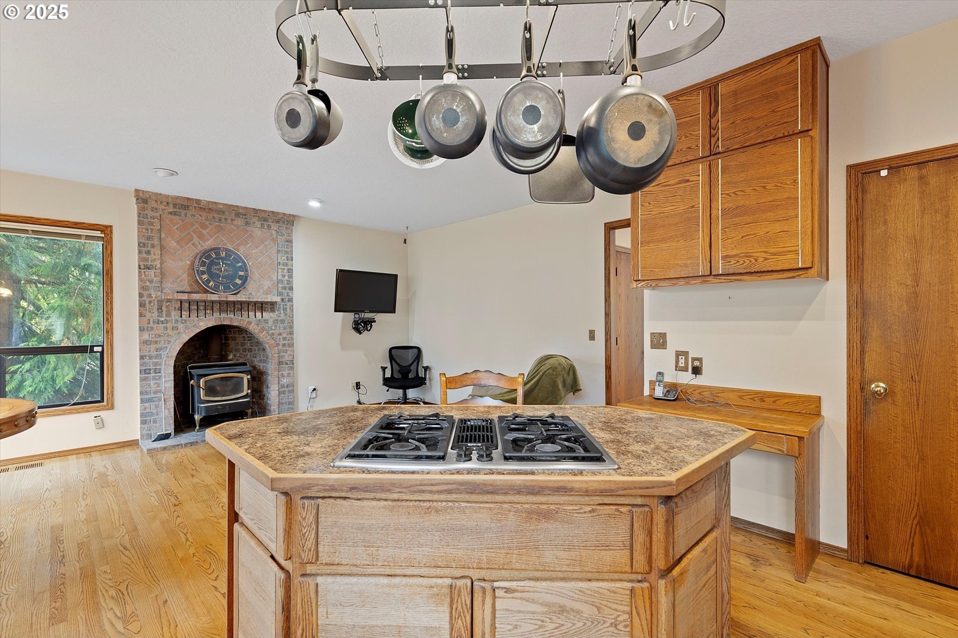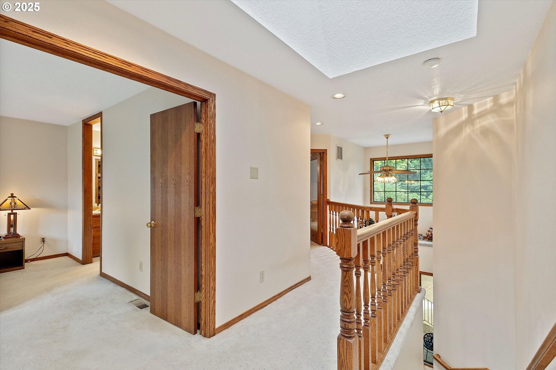 Traditional home has hardwood floors in entry, kitchen and family room, lots of windows, very light and bright with 4 foot skylight in wide hallway that overlooks entry, 3 skylights in all! Kitchen has cook island with gas cook top, stainless built in oven and microwave, bay window area, high ceilings, desk area, French Doors that open to deck in back, eat bar and a sitting area for table and or couch. Double high cabinets and cool pot rack! Family room has wood stove and hardwoods. Living room has gas fireplace, coved ceiling and bay window, dining room has large windows and chandelier. Primary bedroom suite is large with double sinks and walk in closet. Huge bonus room upstairs has wet bar and pool table. House has 3 skylights, Large laundry room has lots of cabinets, hanging rod and sink. Garage has super tall ceilings and is oversize. you can use for storage. Room for RV. Yard is fenced with 2 separate grass areas. Location is awesome, close to shopping, parks, yet very quiet and peaceful street. See attached neighborhood video to learn more about neighborhood