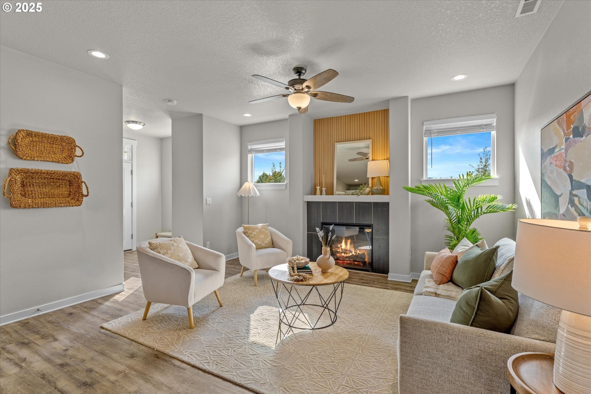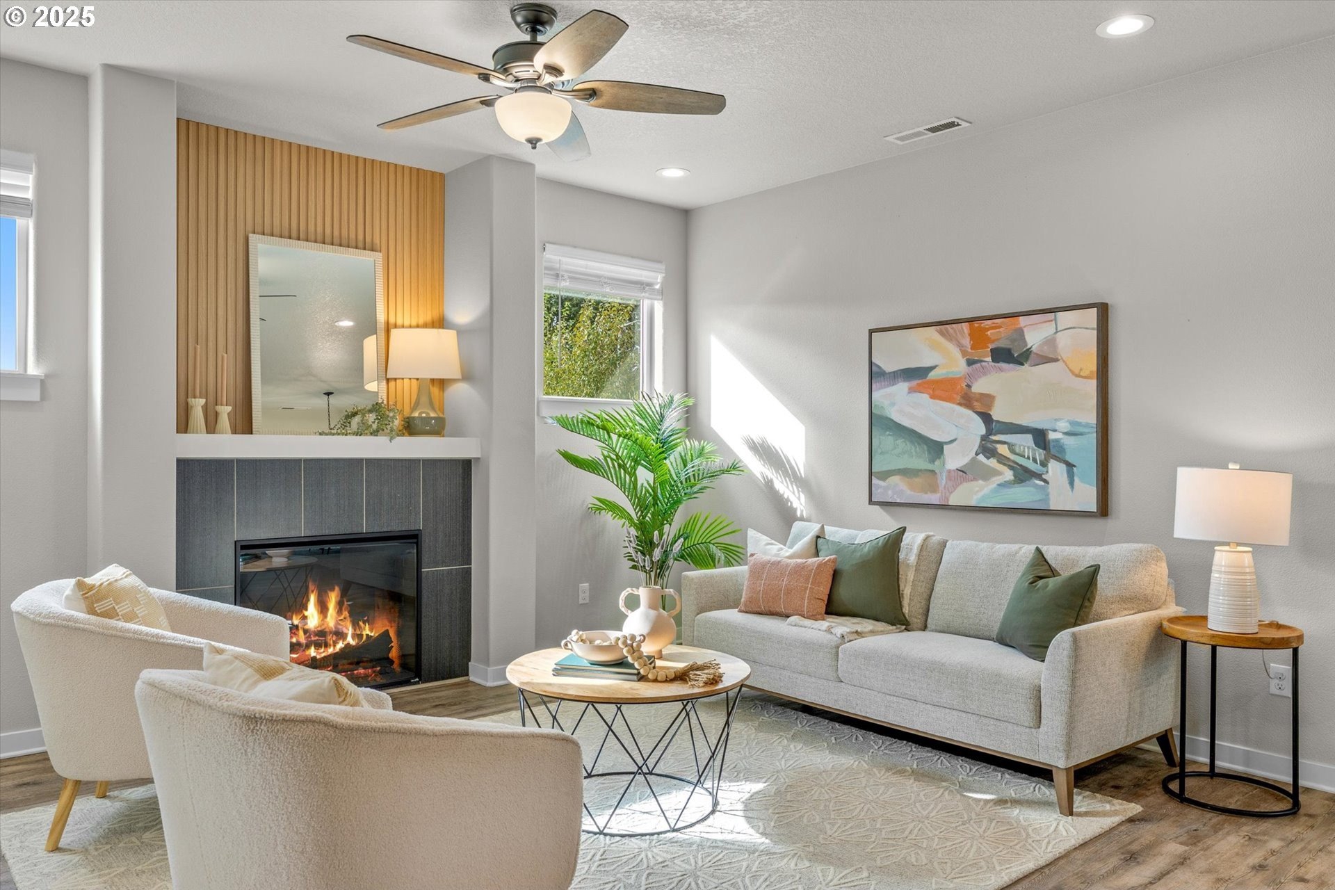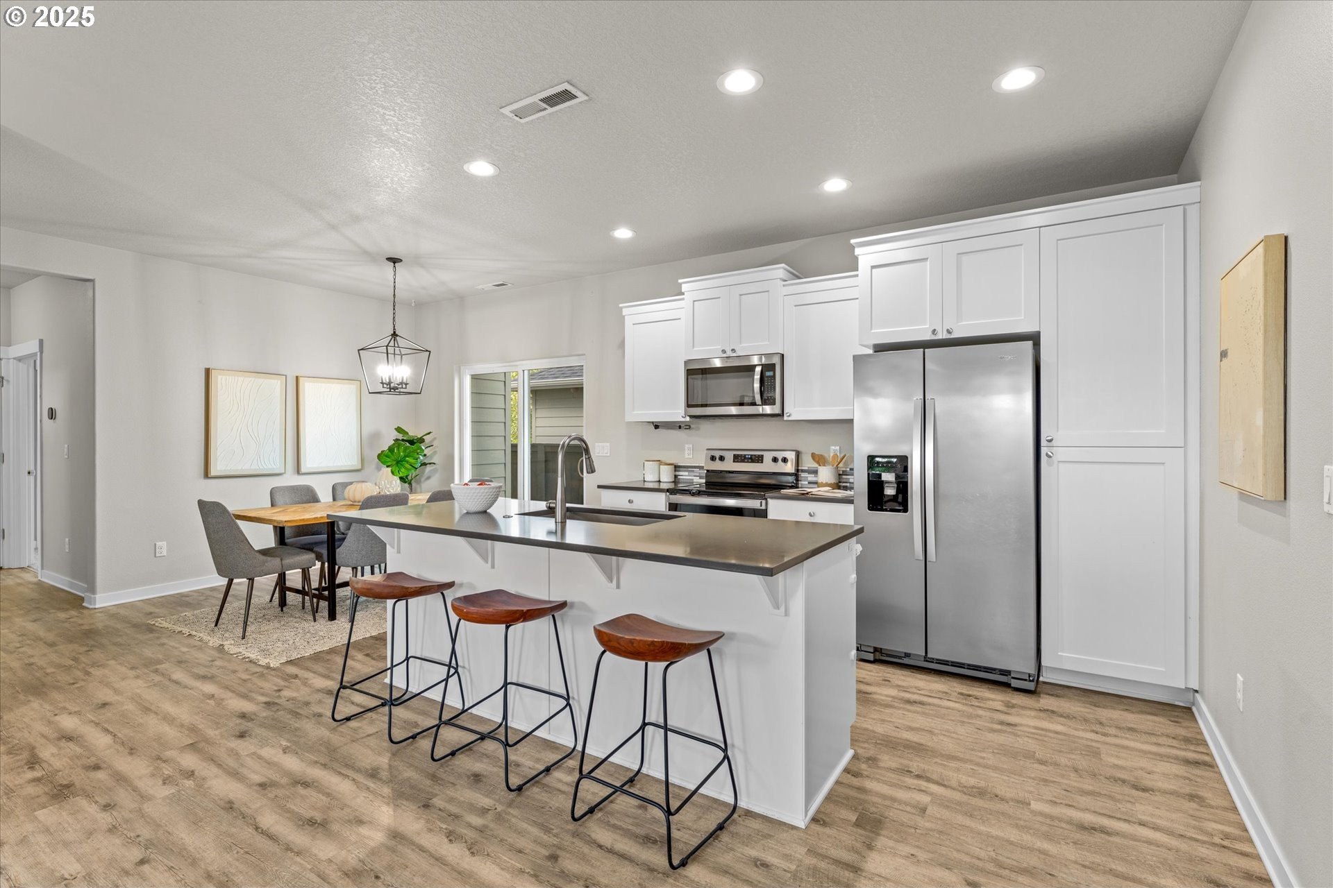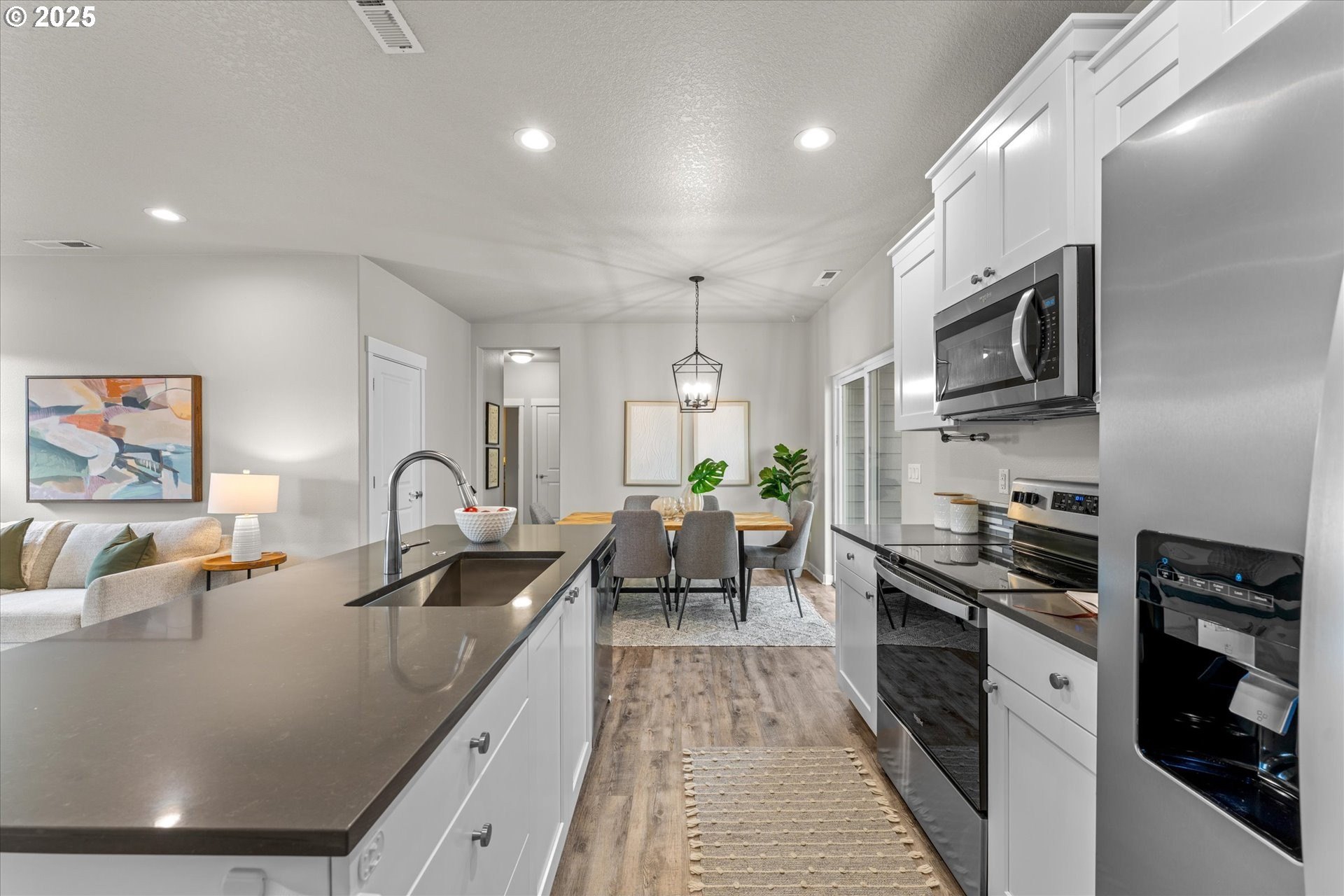 Welcome to this beautifully maintained newer construction home offering the perfect single-level layout on a desirable corner lot. Step inside to an open-concept floor plan filled with natural light, high ceilings, and stylish LVP flooring throughout the main living areas. The spacious kitchen is a true highlight—featuring a large island, stainless steel appliances, and a dedicated dining area that flows seamlessly to the backyard through a sliding glass door. Enjoy cozy evenings by the elegant gas fireplace or morning coffee on your private patio. The primary suite is a peaceful retreat with dual sinks, a walk-in closet, and a standing shower. Two additional bedrooms are conveniently located near a dedicated indoor laundry space for easy everyday living. You’ll appreciate the oversized garage with ample room for parking and storage. Located in the sought-after Campanella Estates community, this neighborhood is known for its welcoming atmosphere and close-knit feel. Enjoy nearby Wade Creek Park and its splash pad, Timber Park for water activities, the new community center, and local library. Explore neighborhood ponds, riding trails, and miles of paved walking and biking paths—everything you need is right at your doorstep! A perfect blend of comfort, style, and convenience—don’t miss your chance to call this stunning home your own!
