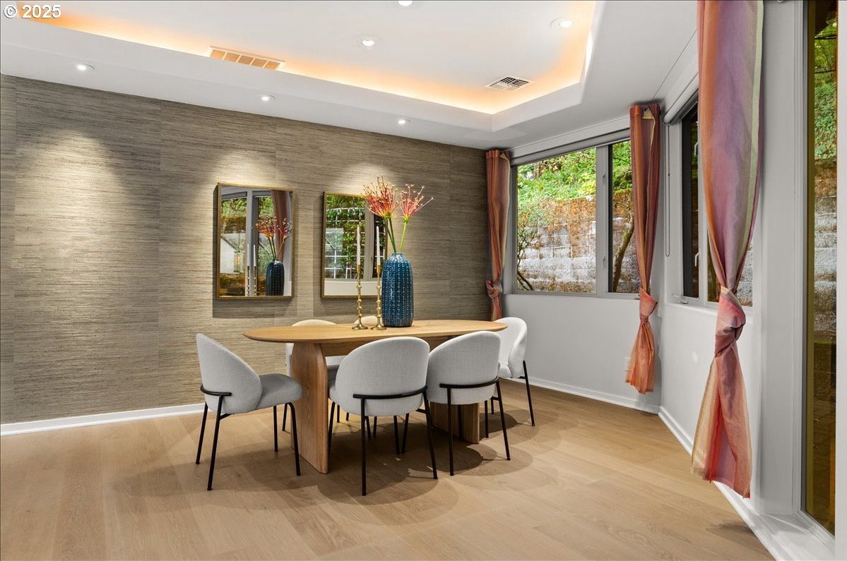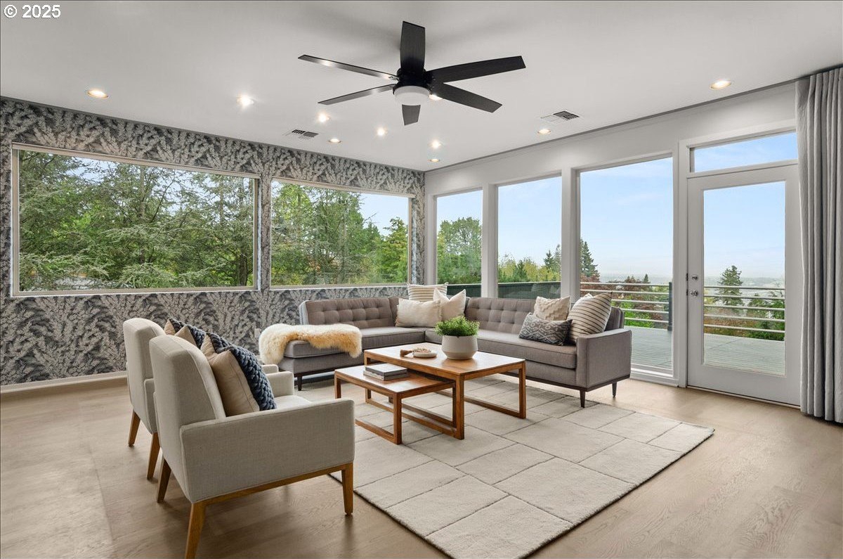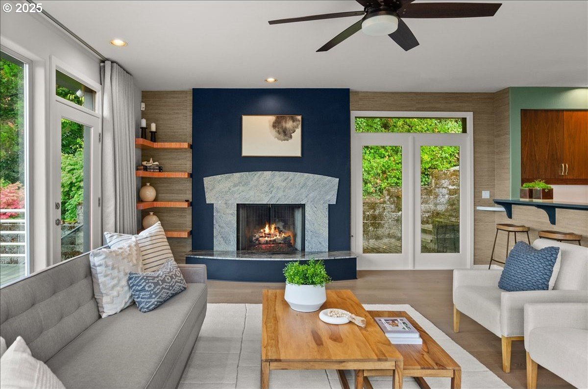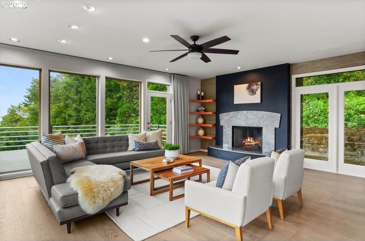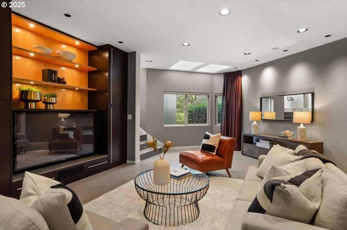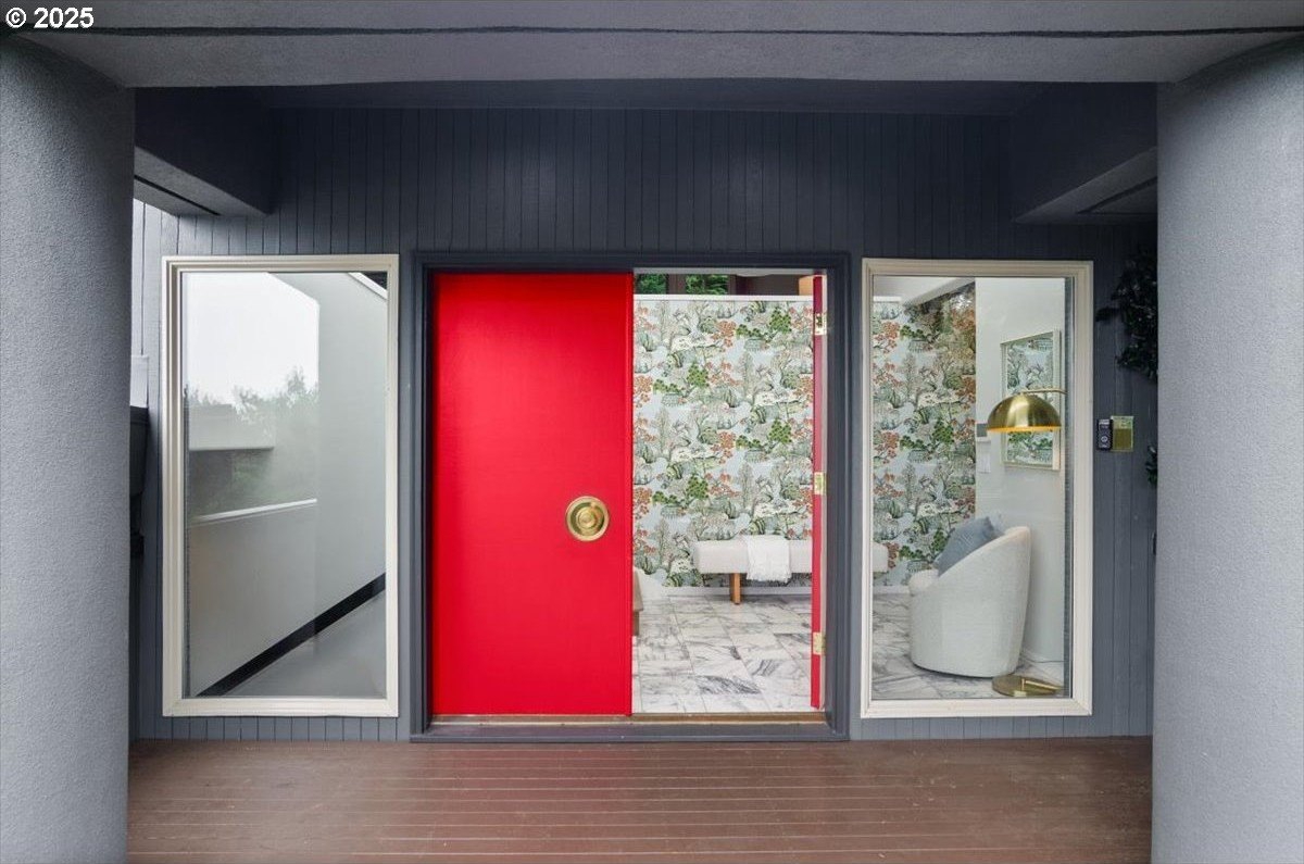 Live effortlessly in this one-of-a-kind Portland Heights residence, a home that blends contemporary urban design with natural serenity. Thoughtfully planned and superbly executed by renowned Oregon designer Steve Van Sant, this property showcases generous rooms, handsome built-ins, and walls of windows framing breathtaking views of the city and mountains. Perfectly positioned at the end of a private drive and bordering protected woodlands, the home offers rare privacy and elegance. The gated exterior offers a level lawn, expansive decks, and lush gardens—an ideal setting to enjoy the beauty of the natural surroundings. Distinguished by architectural detail, refined finishes, and seamless integration with its natural setting, this property offers both artistic sophistication and timeless comfort—while being only minutes from parks, trails, downtown, hospitals, schools, NW Portland, and the high-tech corridor. [Home Energy Score = 4. HES Report at https://rpt.greenbuildingregistry.com/hes/OR10026654]