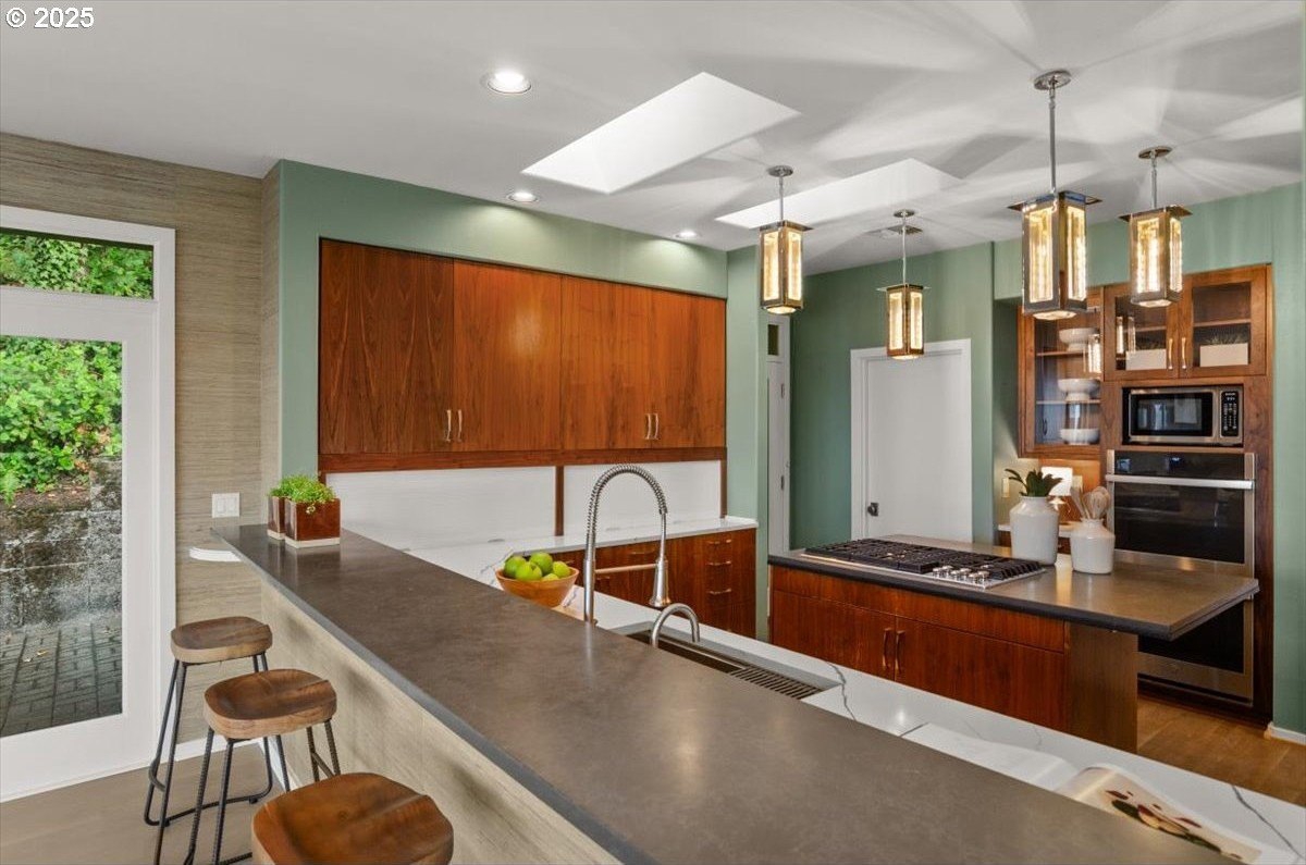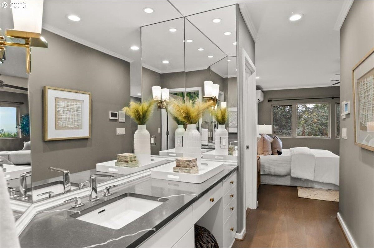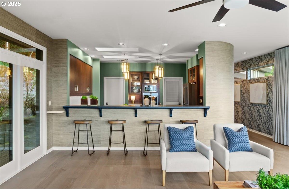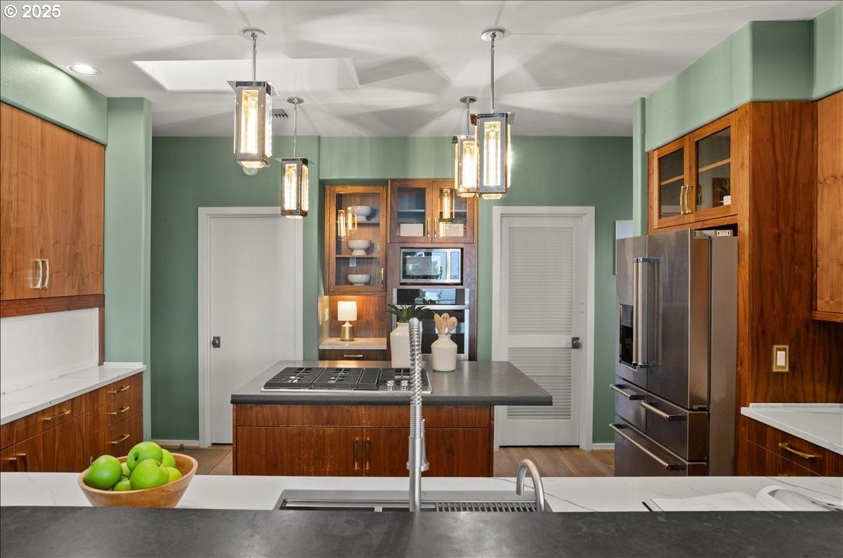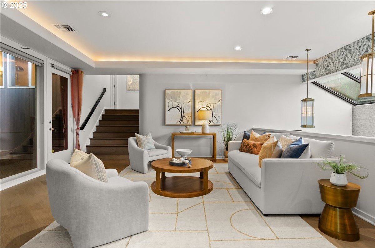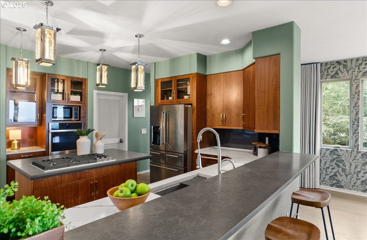 Live effortlessly in this one-of-a-kind Portland Heights residence, a home that blends contemporary urban design with natural serenity. Thoughtfully planned and superbly executed by renowned Oregon designer Steve Van Sant, this property showcases generous rooms, handsome built-ins, and walls of windows framing breathtaking views of the city and mountains. Perfectly positioned at the end of a private drive and bordering protected woodlands, the home offers rare privacy and elegance. The gated exterior offers a level lawn, expansive decks, and lush gardens—an ideal setting to enjoy the beauty of the natural surroundings. Distinguished by architectural detail, refined finishes, and seamless integration with its natural setting, this property offers both artistic sophistication and timeless comfort—while being only minutes from parks, trails, downtown, hospitals, schools, NW Portland, and the high-tech corridor. [Home Energy Score = 4. HES Report at https://rpt.greenbuildingregistry.com/hes/OR10026654]