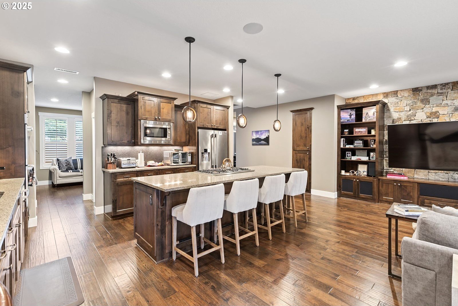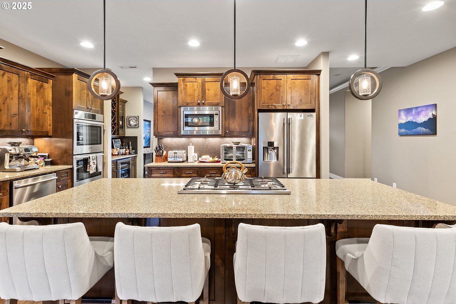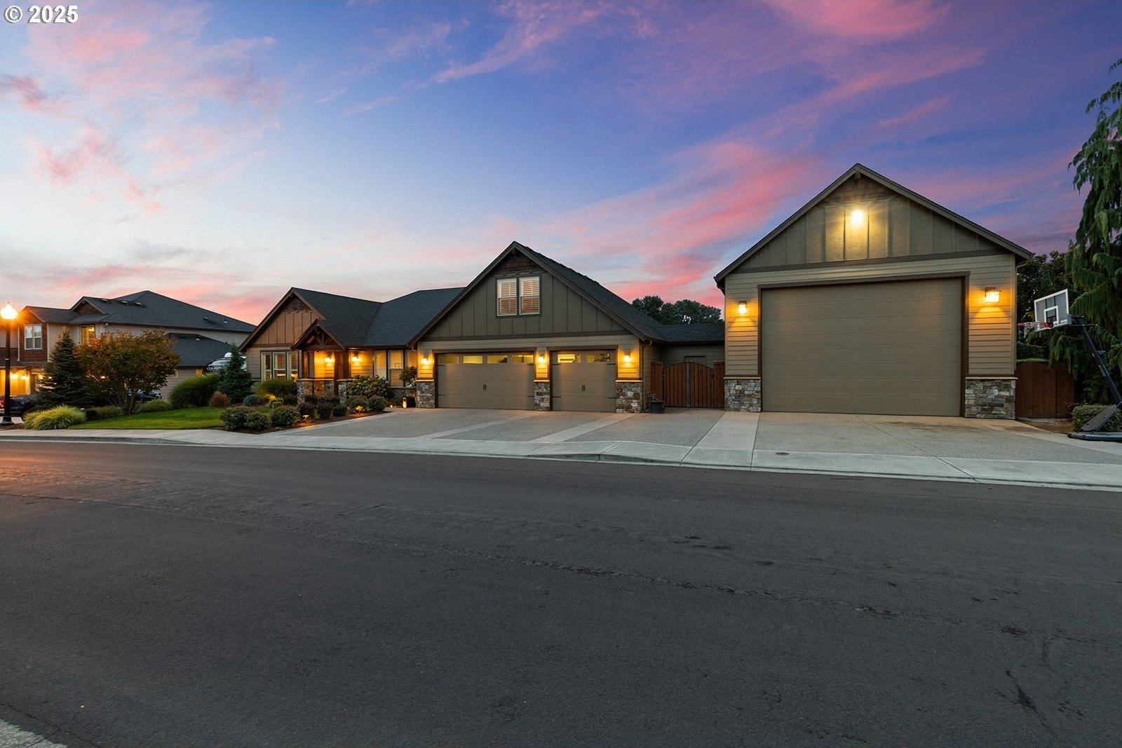 Lifestyle calls in this one of a kind Felida home! Main level living in this beautiful luxury home with an attached extra deep 3 bay garage and a detached 1456 sq ft luxury shop. Coveted Felida community, walk to parks, nearby local eateries, salon & Barre fitness! This home boasts 4 bedrooms on the main, plus an upper bonus room, including 2 bedrooms with attached bathrooms. Extras everywhere including built in vacuum, abundant windows with plantation shutters & 10' ceilings. Relaxing primary suite with a gas fireplace and private door to patio. Attached bathroom with soaking tub, 6ft tile shower and walk in closet. Gourmet Kitchen with butler's pantry with wine fridge, double oven, & eating island. Walk in pantry with extra refrigerator. Inviting great room with stone wall & custom built ins with a must have cozy gas fireplace! Upstairs enjoy a 425 sf bonus room with incredible reclaimed barnwood walls. A bar area with sink, mini fridge and microwave as well as bar counter seating for the ultimate entertaining. Hardwood floors complete the room perfectly! Outside enjoy an extra-large patio with covered area that includes lighting, heat, and a TV. Firepit & prewired for a hot tub! Fully fenced yard including side yard for games or adding a garden! The gem of this property is the 28'x 52' detached shop! Soaring ceilings, extra tall overhead door, bathroom with shower, hot water tank, floor drain, RV hook ups for power (50 amp) and sewer, shop has it's own 200 amp service, and custom storage. Home's exterior freshly painted! Ask to see the home's features list & watch the virtual tour for more photos!
