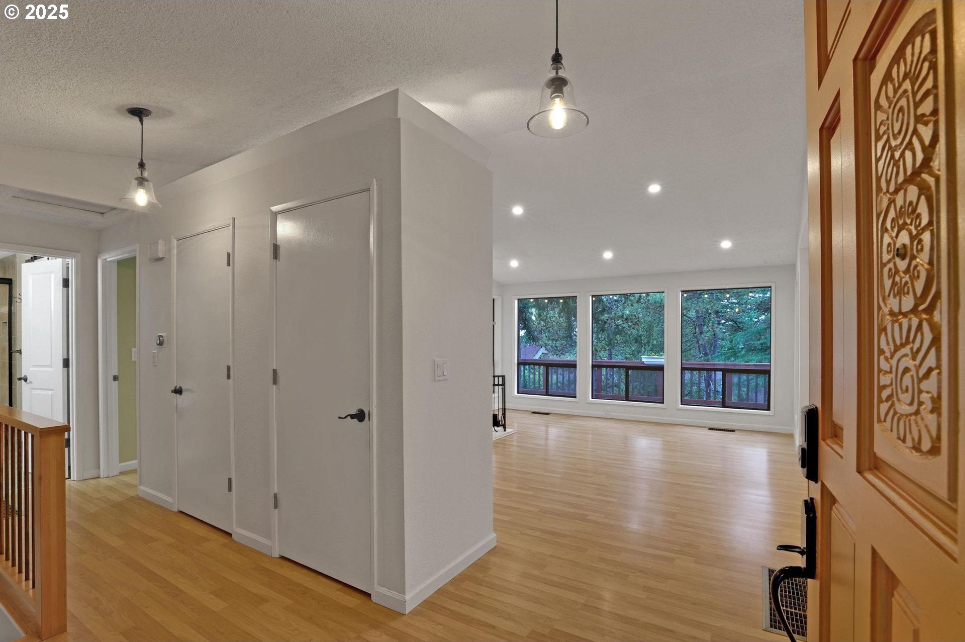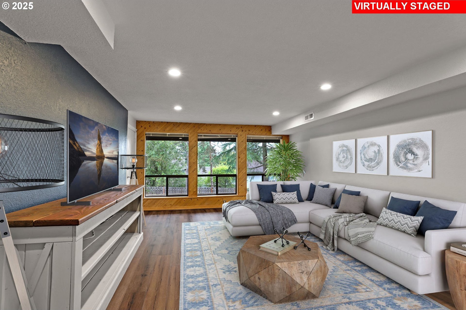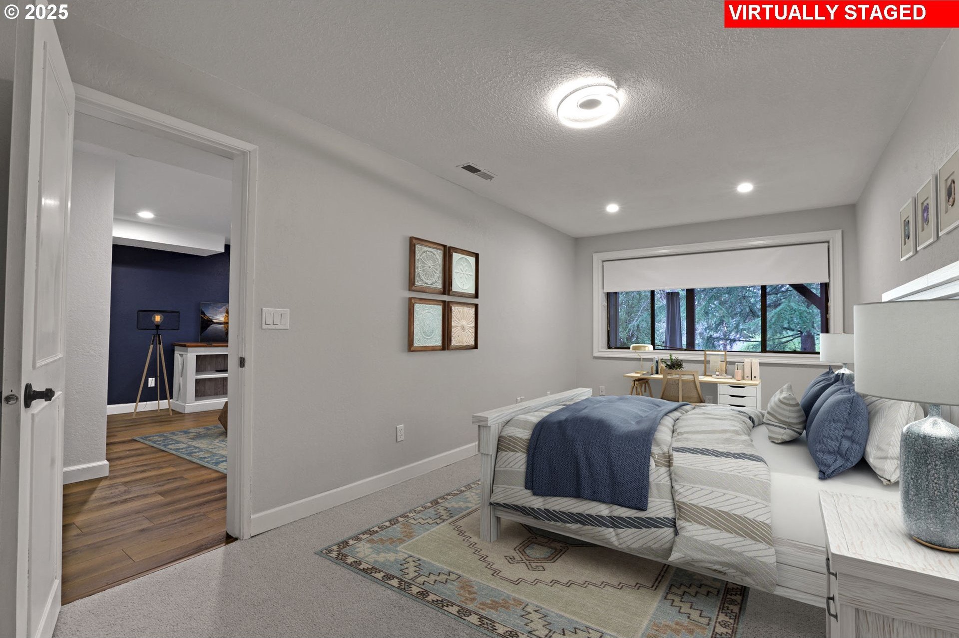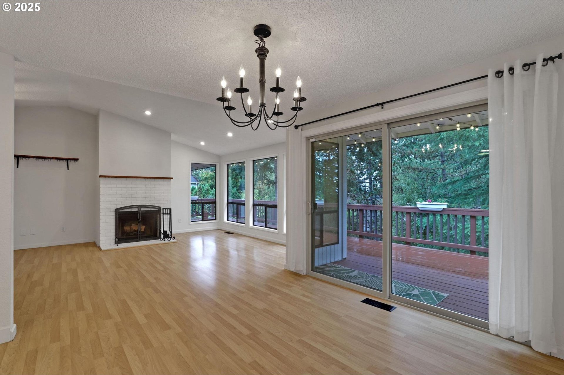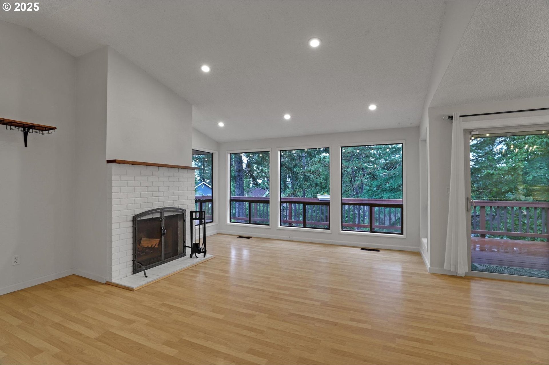 Tucked on a quiet street with no neighbors across, this light-filled Daylight Ranch feels like a private forest retreat just minutes from Portland’s urban edge. Expansive windows frame elevated territorial views, while a wood-burning fireplace anchors the open main level, creating a warm and inviting atmosphere. The home blends comfort with thoughtful design, featuring natural light, warm materials, and spaces that connect seamlessly to the outdoors. The primary suite opens to a spacious deck overlooking the treetops and features a bathroom with heated tile floors for an added touch of comfort. The lower level offers two bedrooms, a full bath, and a large family room with a bar—perfect for guests, hobbies, or movie nights. Outdoors, enjoy the partially covered deck and terraced garden beds surrounded by trees and birdsongs. The extra-deep garage provides ample storage space and room for a workbench or hobby area. This is a well maintained home with lots of thoughtful updates including: new roof (2022), water heater (2022), exterior paint (2023), attic insulation and sealing from a professional energy audit (2025), and more. Conveniently located with easy access to I-5 and Barbur Blvd, close to shopping, dining, parks, and community amenities. [Home Energy Score = 7. HES Report at https://rpt.greenbuildingregistry.com/hes/OR10242372]