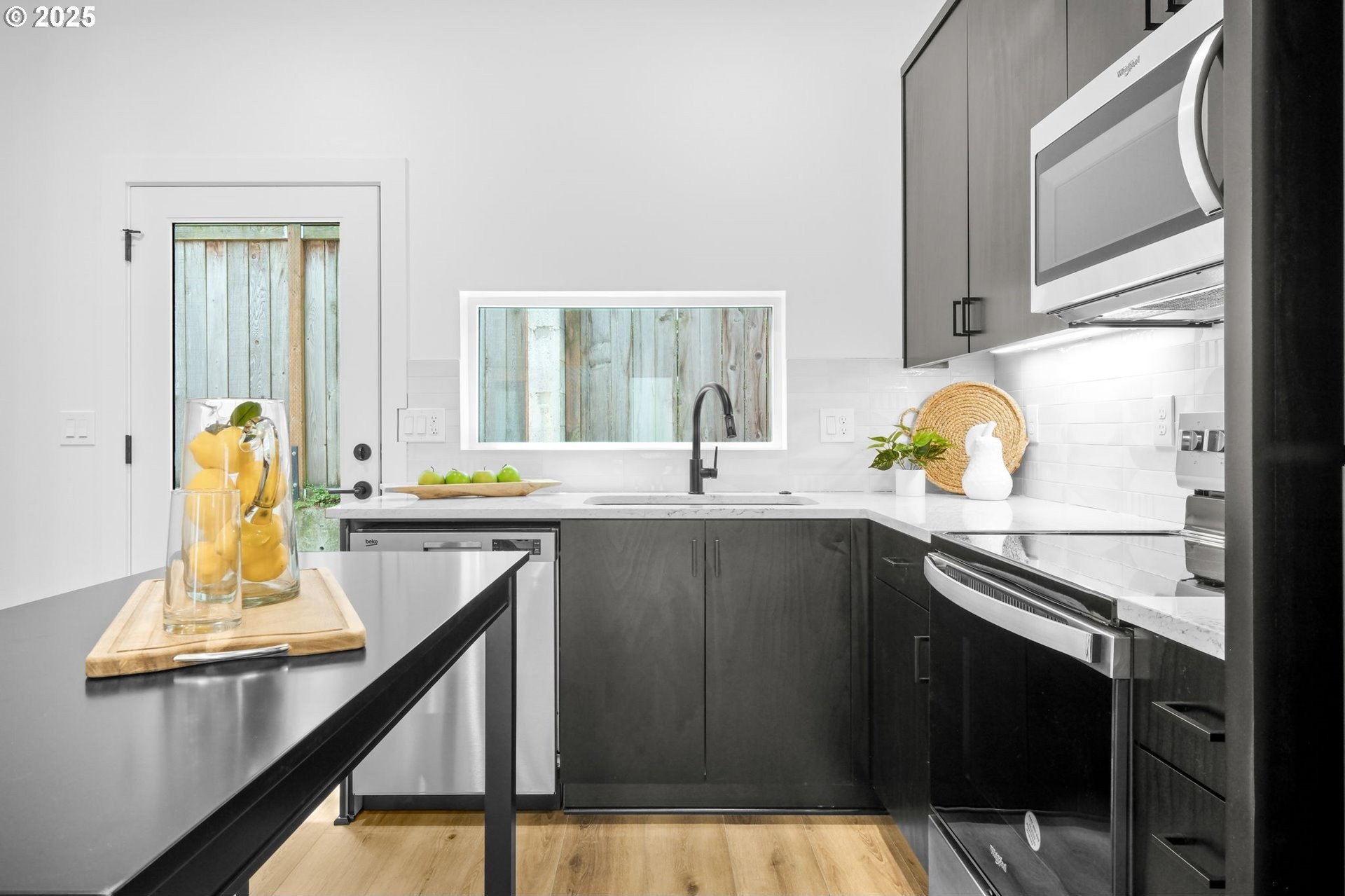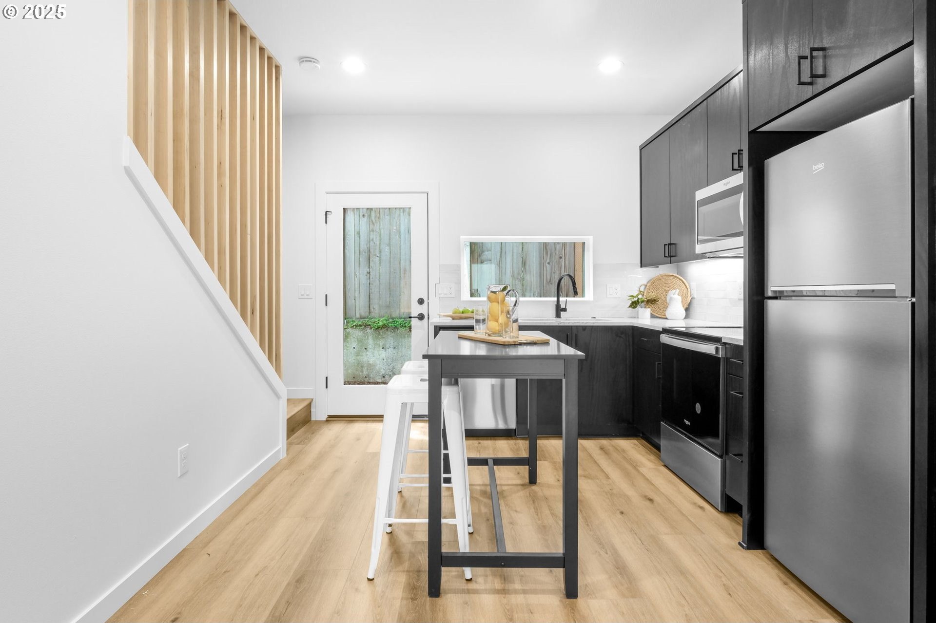Welcome to Beaumont Bostads, a thoughtfully designed Cottage Cluster Development nestled in the coveted Beaumont-Wilshire neighborhood of NE Portland. This 2-bedroom, 1.5-bathroom home blends modern Scandinavian aesthetics with the warmth of community living, while offering the privacy and independence of a fee simple home on its own lot, with no HOA. Meticulously crafted with custom design elements and high-end finishes, this home features an Earth Advantage Platinum certification, ensuring sustainable living with superior energy efficiency. The interior boasts premium stainless-steel appliances, sleek cabinetry, and refined details throughout.Unwind or entertain in the private back yard patio, a rare luxury in this walkable urban enclave. Just steps from vibrant Fremont Street shops, cafes, and parks, this home delivers the perfect mix of style, comfort, and convenience.