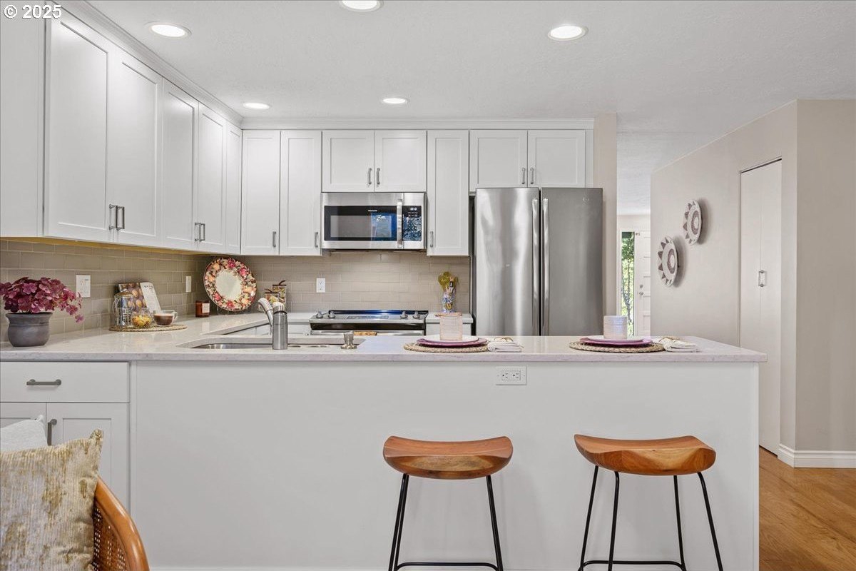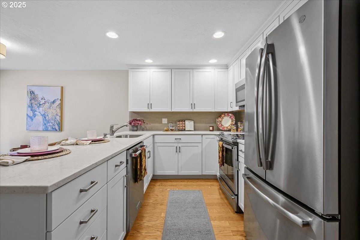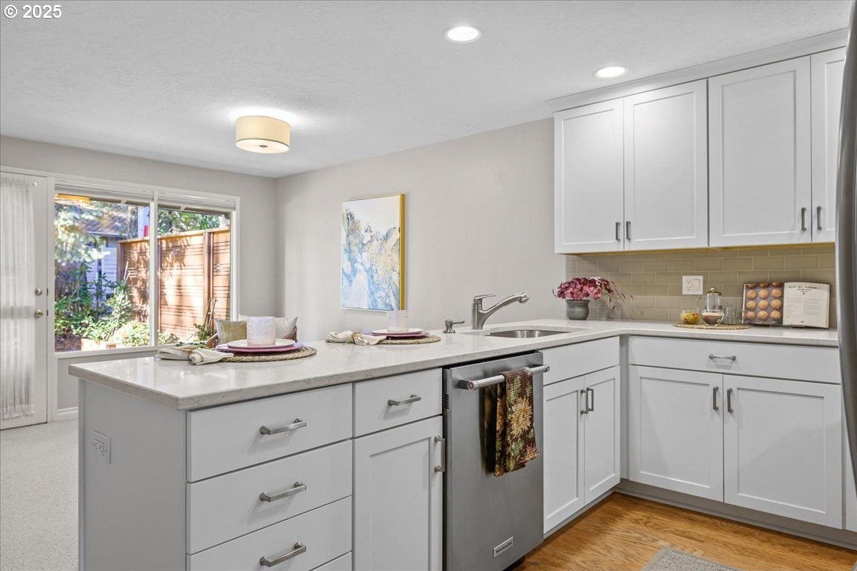 Charming end-unit townhome nestled in a peaceful and welcoming neighborhood. Elevated above street level, the home offers added privacy along with views of the community pool and walking trails.Enjoy cozy evenings by the fireplace in the spacious living room or host gatherings of any size in the generously sized dining area. The recently remodeled kitchen features shaker-style cabinetry, stainless steel appliances, a pantry and quartz countertops. Both bathrooms have been updated, and the primary suite includes double closets and an en-suite bathroom with a walk-in shower. A rare find, this home also offers an attached two-car garage and additional driveway parking. The private backyard patio with built-in planters provides a perfect space for relaxing or gardening. This is an opportunity you won’t want to miss!