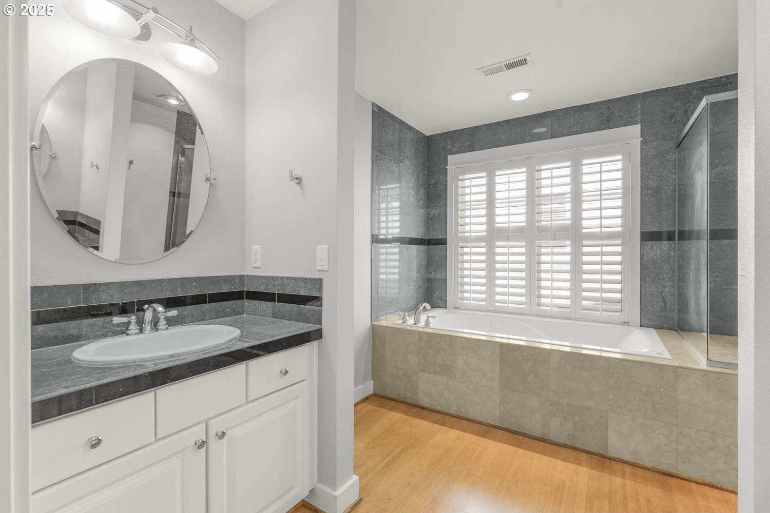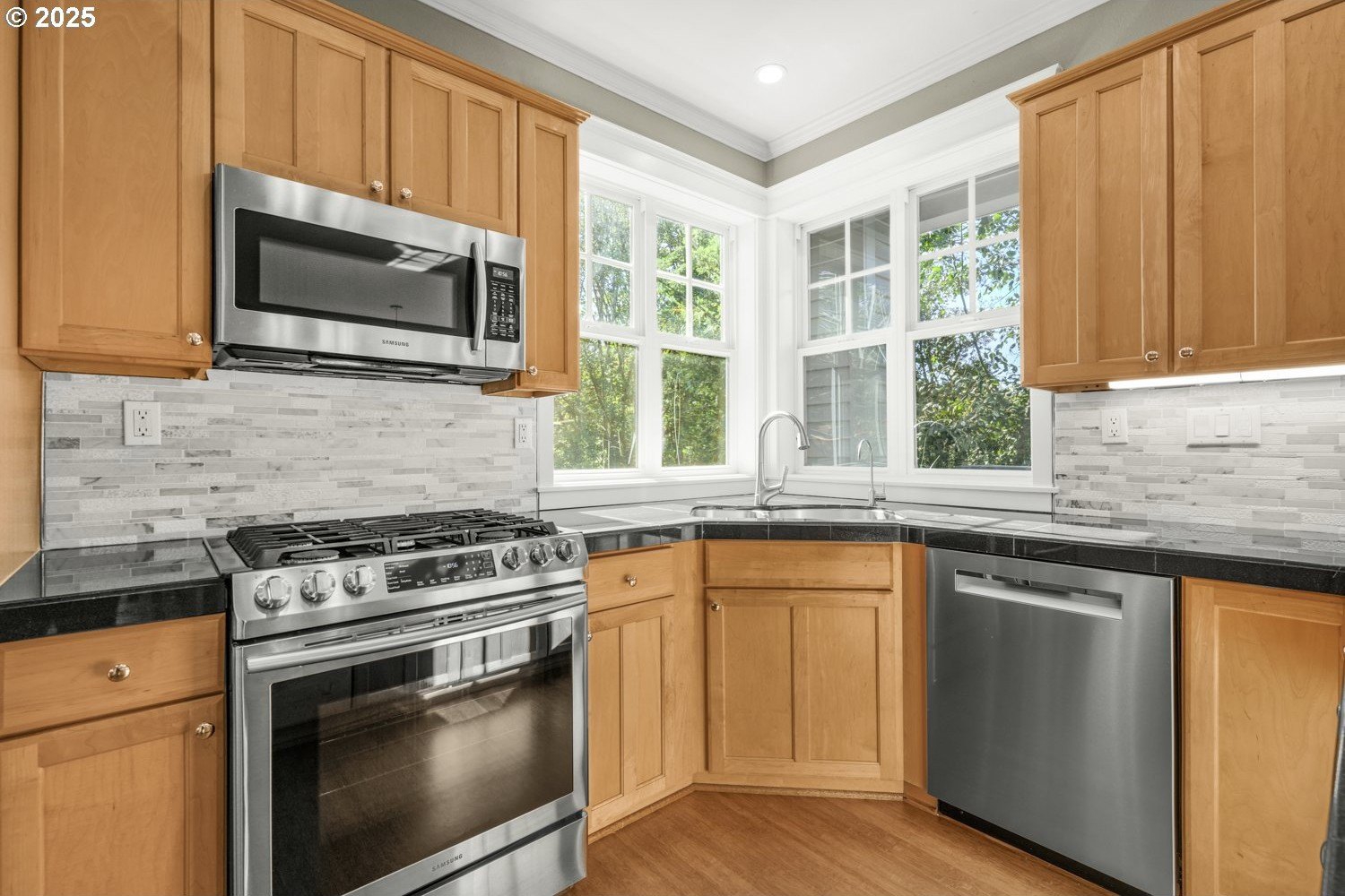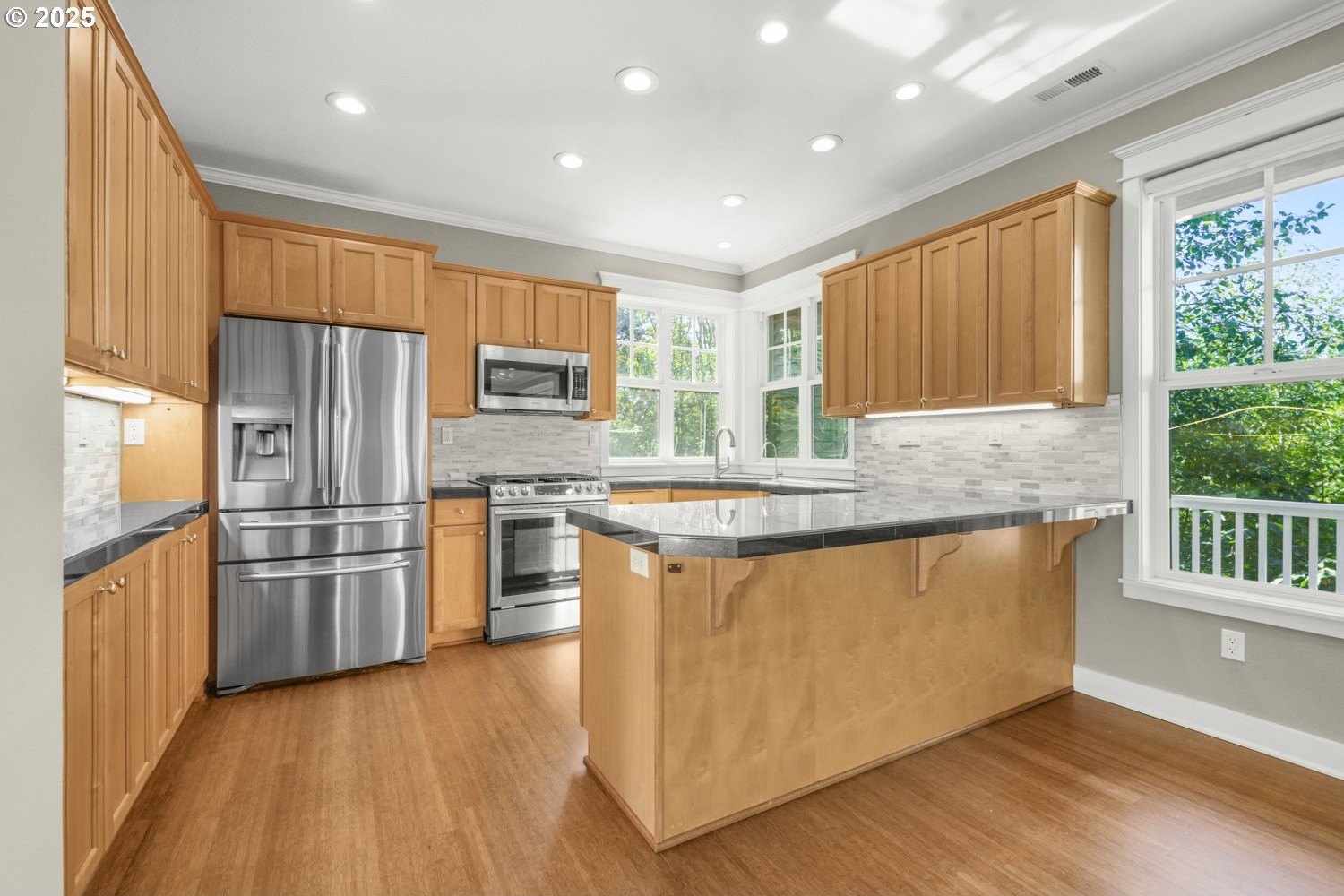 Discover tranquility in this unique Forest Heights residence, privately set against a lush greenspace. Abundant natural light fills the home, highlighting serene views throughout. This is a rare find with two condos thoughtfully combined to create a fully detached home offering flexible living options. Live in one space and rent the other, or enjoy both levels as an expansive single-family home with a separate guest suite or rental unit. Home is set up for multi-generational living. The main floor has a cozy living room with a gas fireplace, a dining area that opens to a private balcony, a gourmet kitchen with stainless appliances and tons of prep space, one bedroom, and a full bathroom. Upstairs, a secluded primary suite includes a spacious walk-in closet and a beautifully updated bath with a jetted tub and dual vanities. The lower-level apartment offers an open-concept design with a full kitchen with granite countertops, an island and stainless appliances. There's also a large living/dining area, a bedroom with a walk-in closet, and a full bath, plus access to a private deck. Additional features include a two-car attached garage and a fantastic location near scenic trails, restaurants, top hospitals, and Intel.