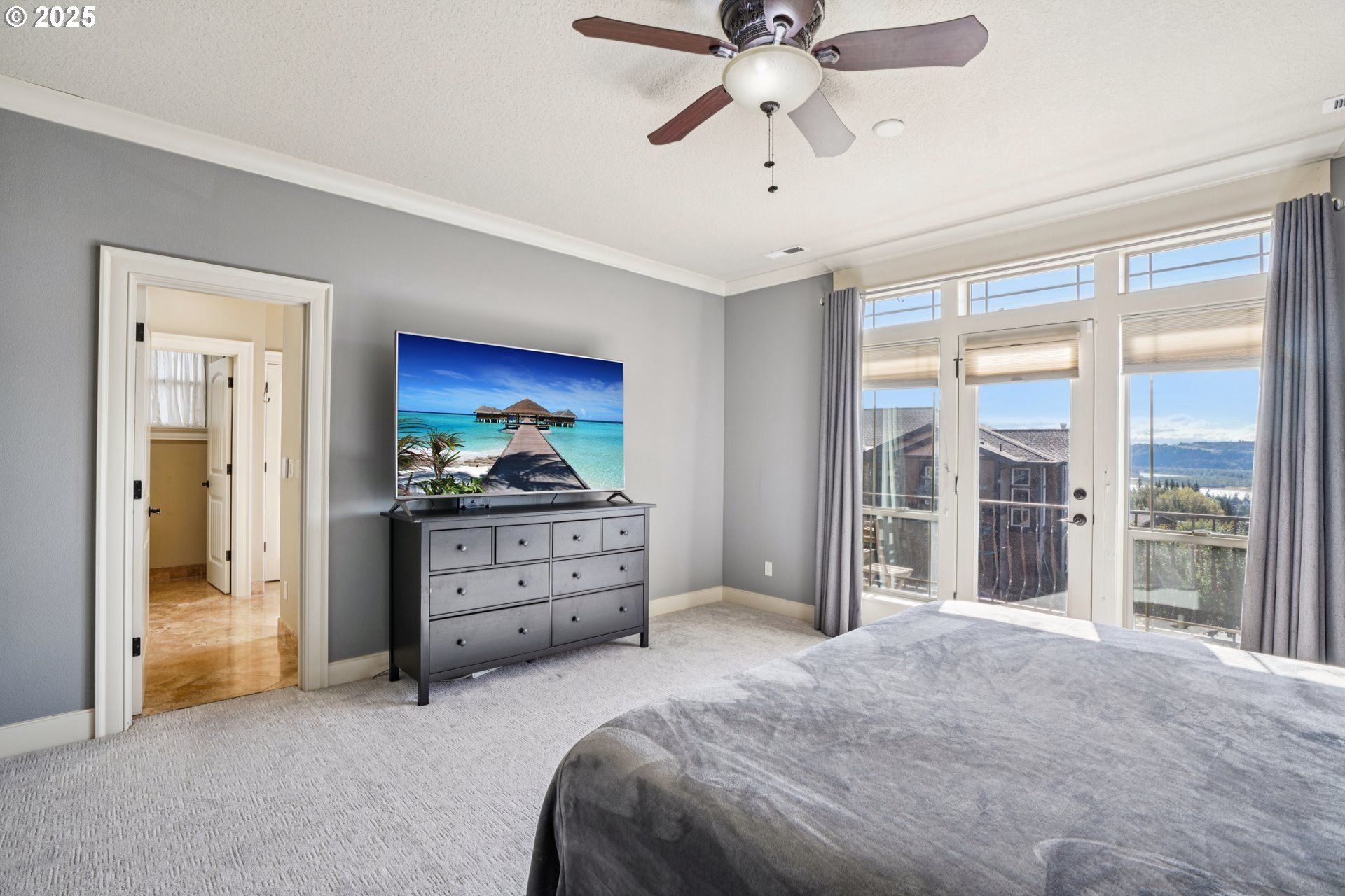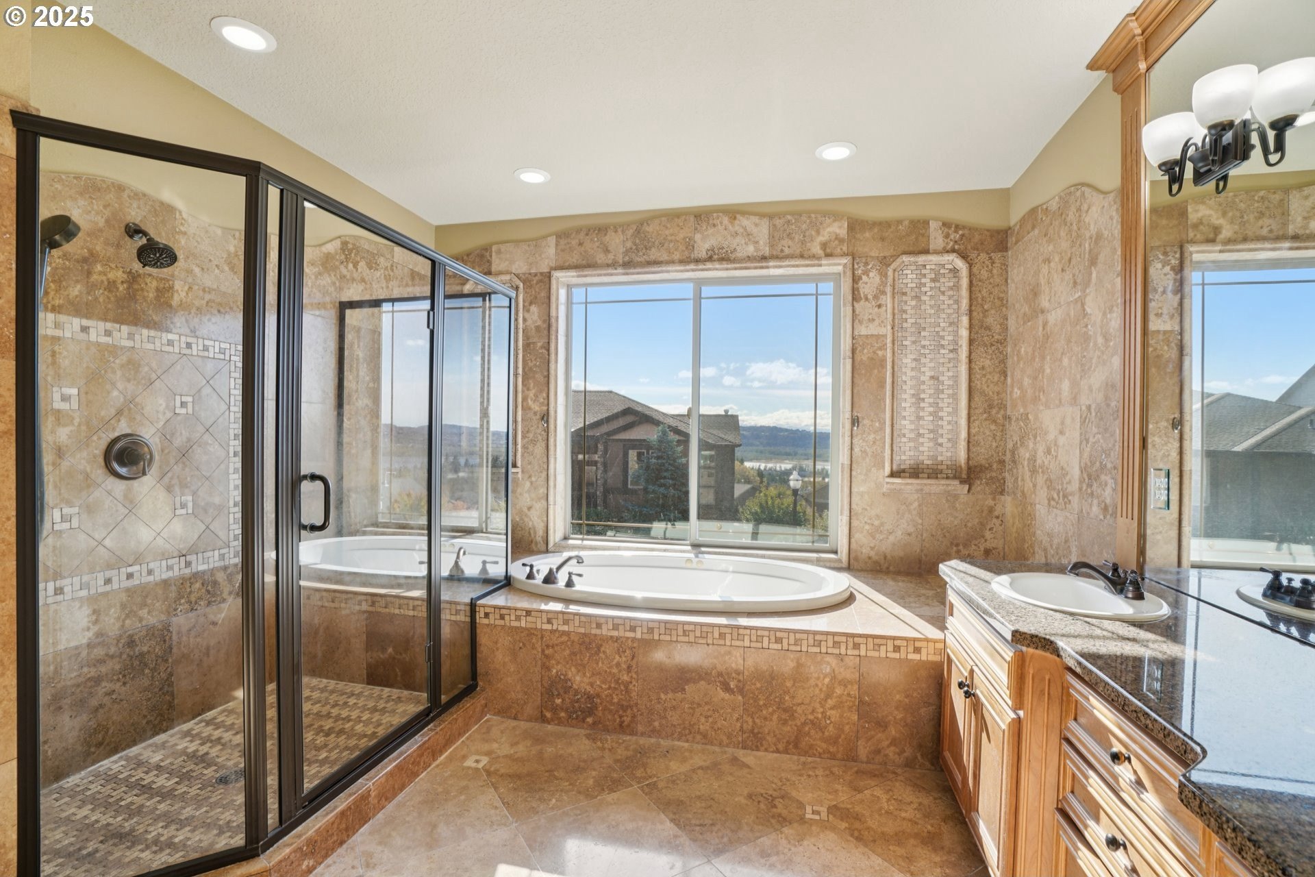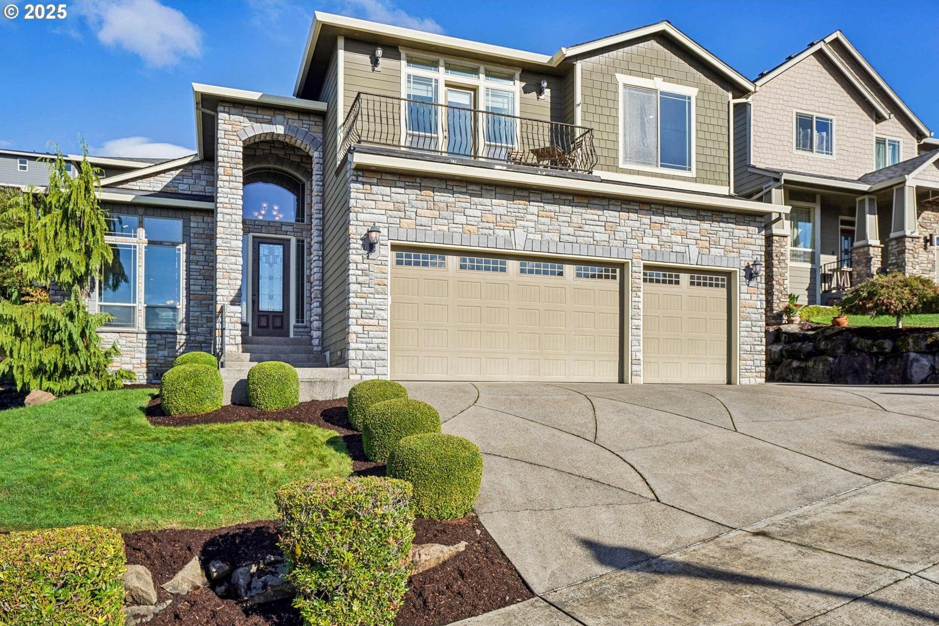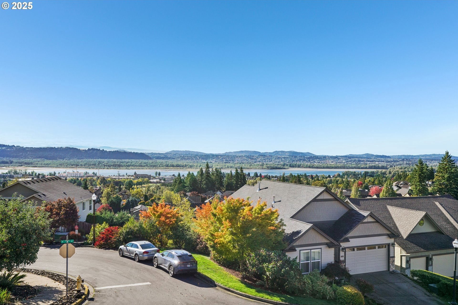 This elegant custom home welcomes you with a covered front porch, leaded glass entry door with sidelites, and clerestory window that fills the soaring entry with natural light. Brazilian hardwood floors with intricate inlays lead to the formal living room where a gas fireplace with a stone surround up to the vaulted ceiling, complemented by a window wall view of the Columbia River. The living room flows seamlessly into the formal dining room, featuring chair rail, crown molding, and convenient access to the gourmet kitchen. The great room offers a family room with travertine-surround gas fireplace, built-ins, some with glass panes, and recessed lighting. The gourmet kitchen includes stainless appliances, granite counters with travertine backsplash, island with breakfast bar, abundant cabinetry some glass panes, separate pantry with frosted glass entry, and heated travertine floors extending to dining area with patio and backyard access. Upstairs, the primary en-suite boasts a private balcony with Columbia River views, walk-in closet with organizer, dual-sink granite vanity, jet tub, tiled shower, walk-in closet, all finished with heated travertine floors. Additional bedrooms include a main-level bedroom/office with built-ins and closet, 3 additional upper-level bedrooms with closets, 1 possible bonus/media room. Bathrooms are thoughtfully designed with pedestal sinks, dual vanities, 1 with heated tile floor. Laundry room & mud room with abundant built-ins add everyday convenience. Interior highlights include exquisite millwork, staircase iron balusters, smart sensor switches, a whole-house fan and fresh air system, heated travertine floors with Wi-Fi thermostat, plumbed for central vacuum system. Outdoors, enjoy a covered front porch, back patio with gas hookups, landscaped, sprinklers, and 3-car garage with overhead storage. This home blends timeless craftsmanship with modern comfort and stunning views. Mortgage savings may be available for buyers of this listing.