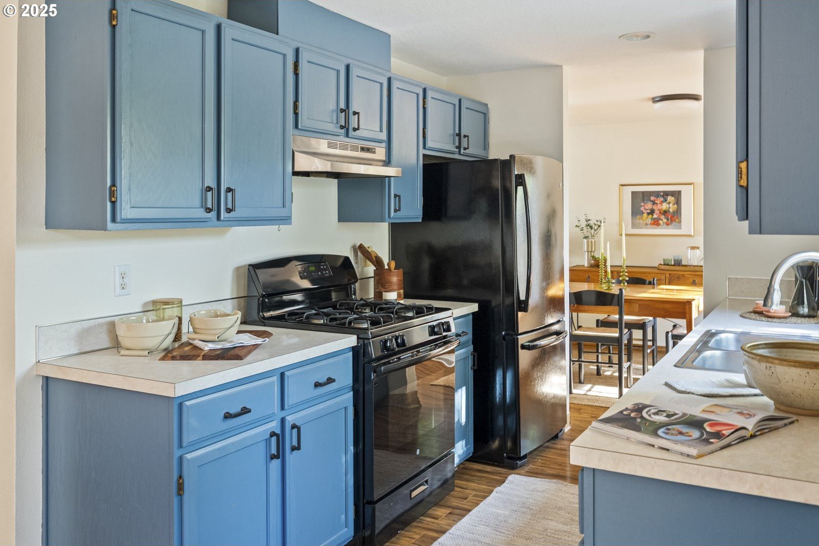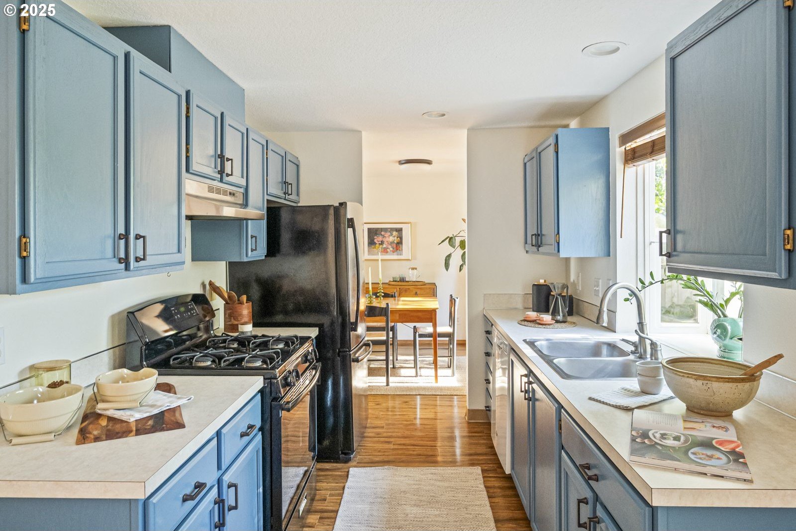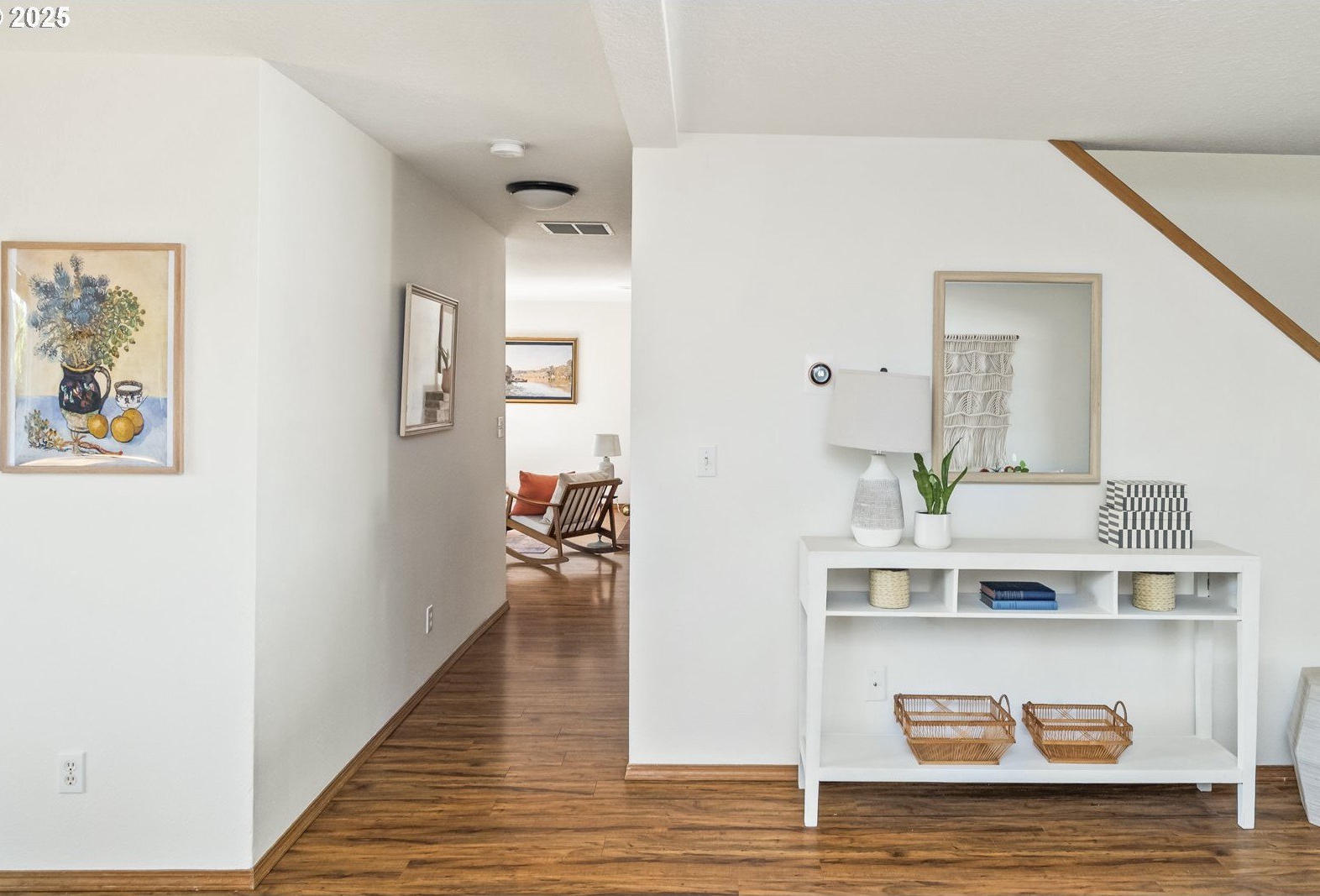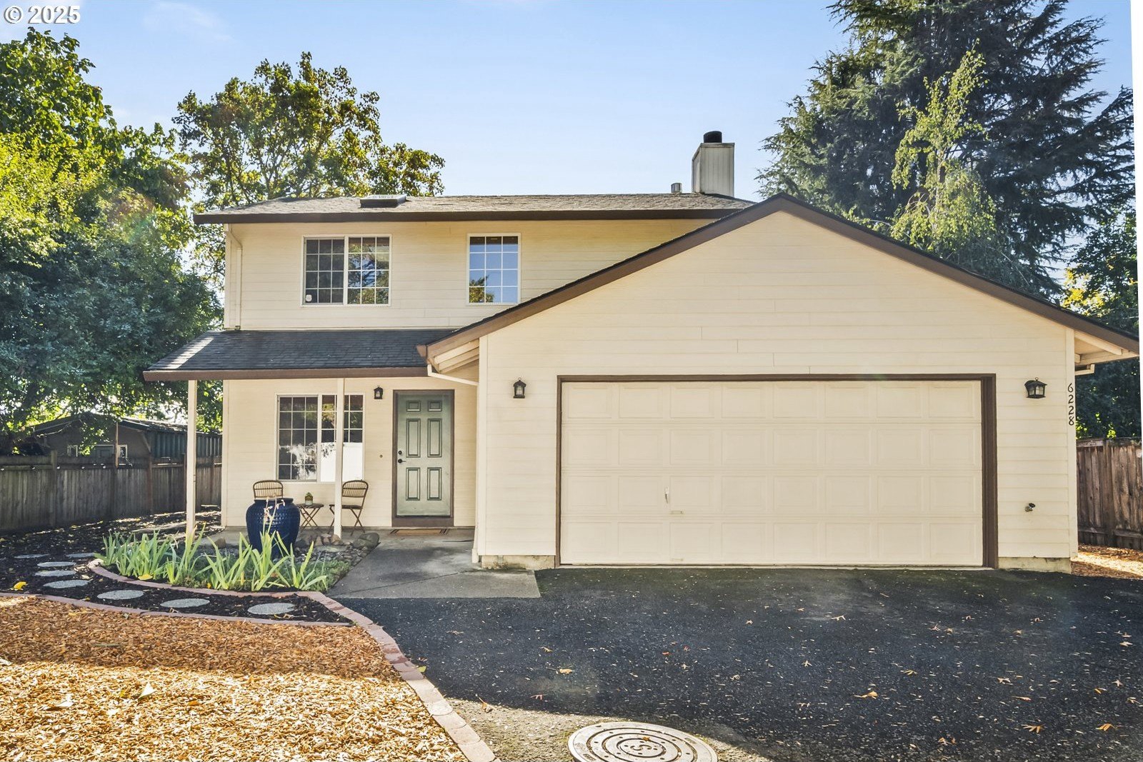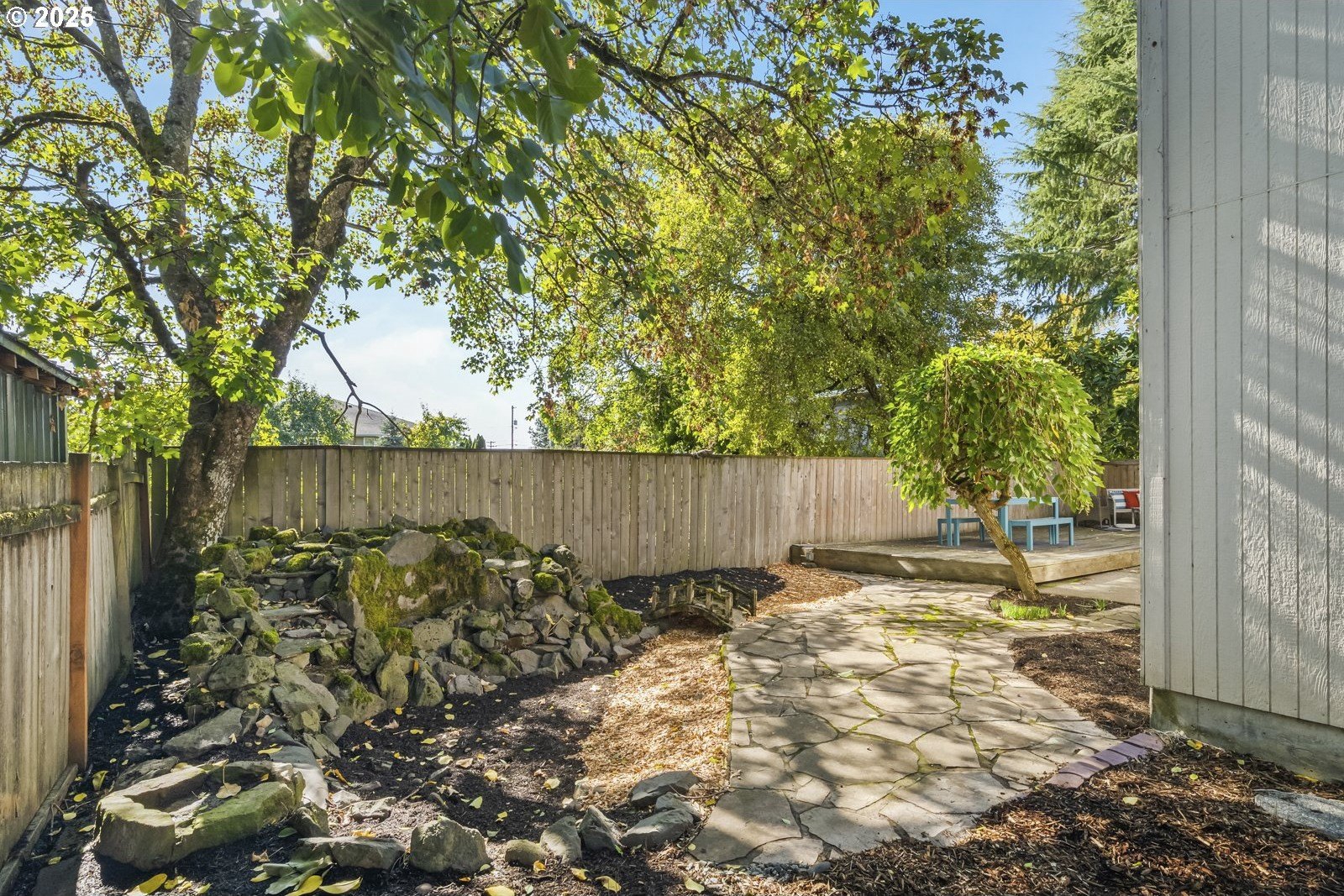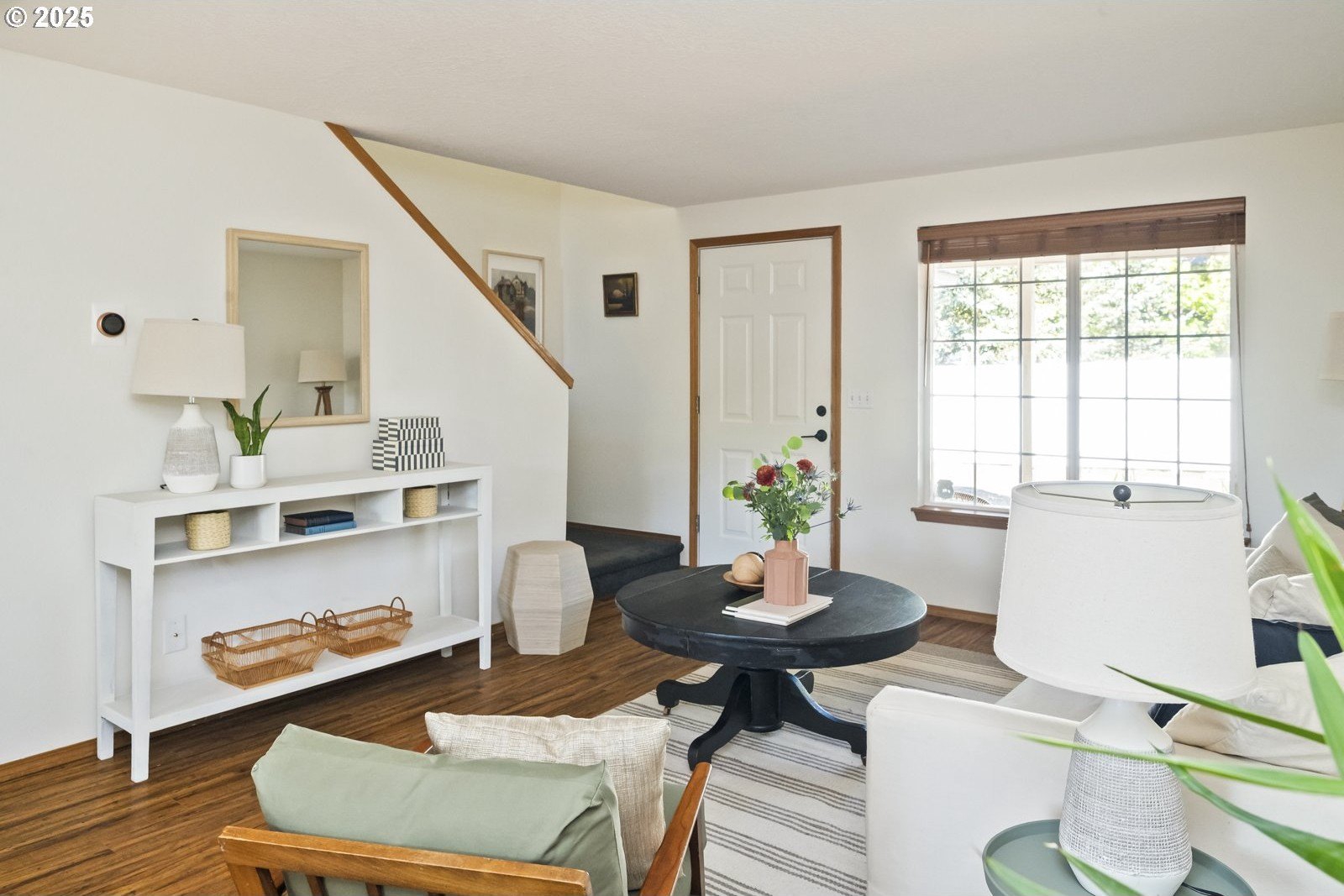 This adorable contemporary feels like your own urban sanctuary, with just the right mix of charm and updates! Surrounded by trees and set back from the road, enjoy dappled sunlight streaming in through the windows and beautiful, peaceful outdoor spaces on all sides. Inside you'll find updated laminate floors, fresh paint throughout, and a refreshed kitchen. The main floor features a family room with fireplace and a half bathroom, in addition to the open living room, dining room, and kitchen. Upstairs are all three bedrooms plus two full bathrooms. The generous primary bedroom boasts a central skylight, ensuite, and a walk-in closet. Storage space and closets galore, plus a two-car garage for all of your projects. All of this tucked into the sweetest pocket, just around the corner from Harney Park, Cartlandia Food Carts, Fred Meyer, Trader Joe's, and tons of retail and transit. [Home Energy Score = 6. HES Report at https://rpt.greenbuildingregistry.com/hes/OR10242429]