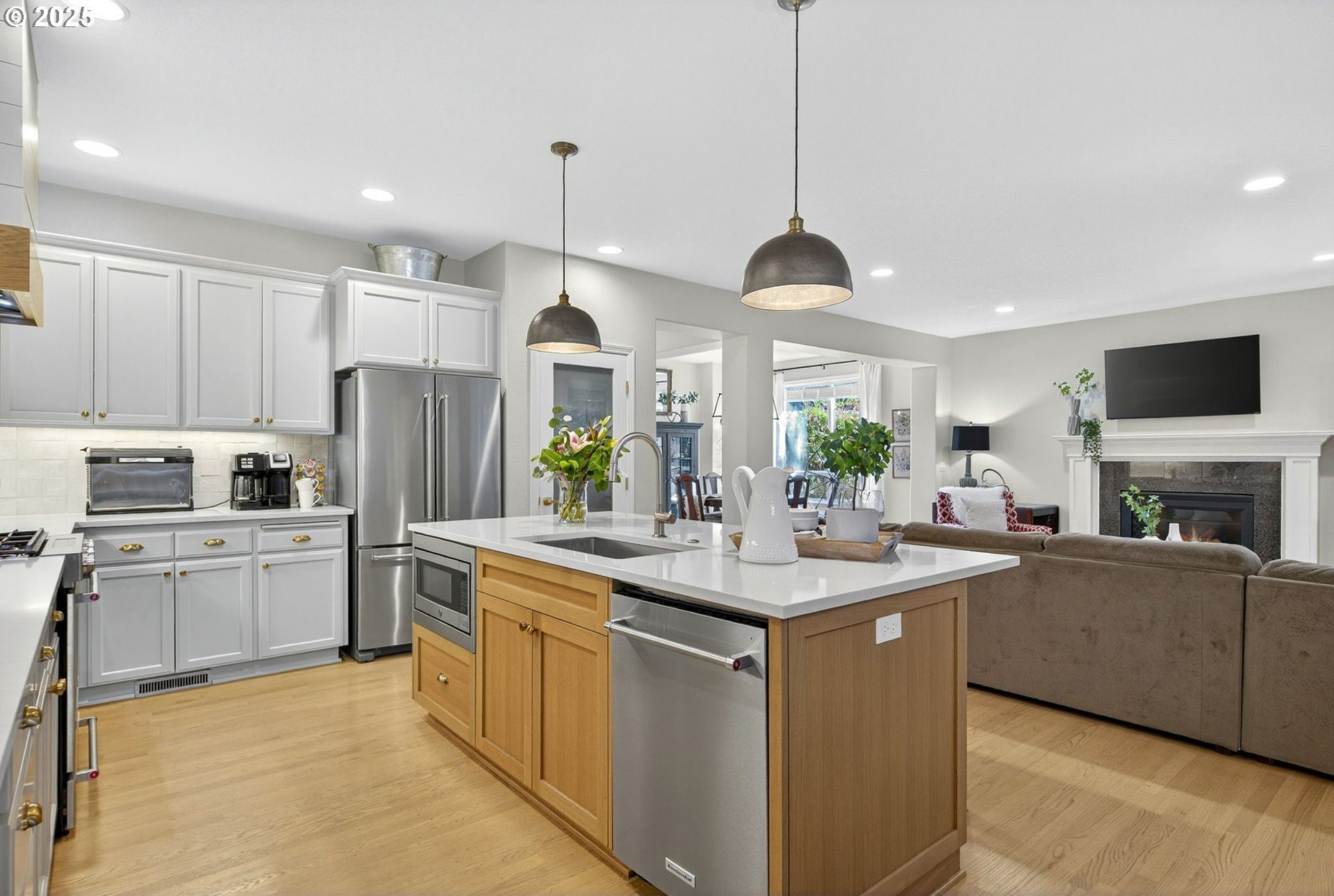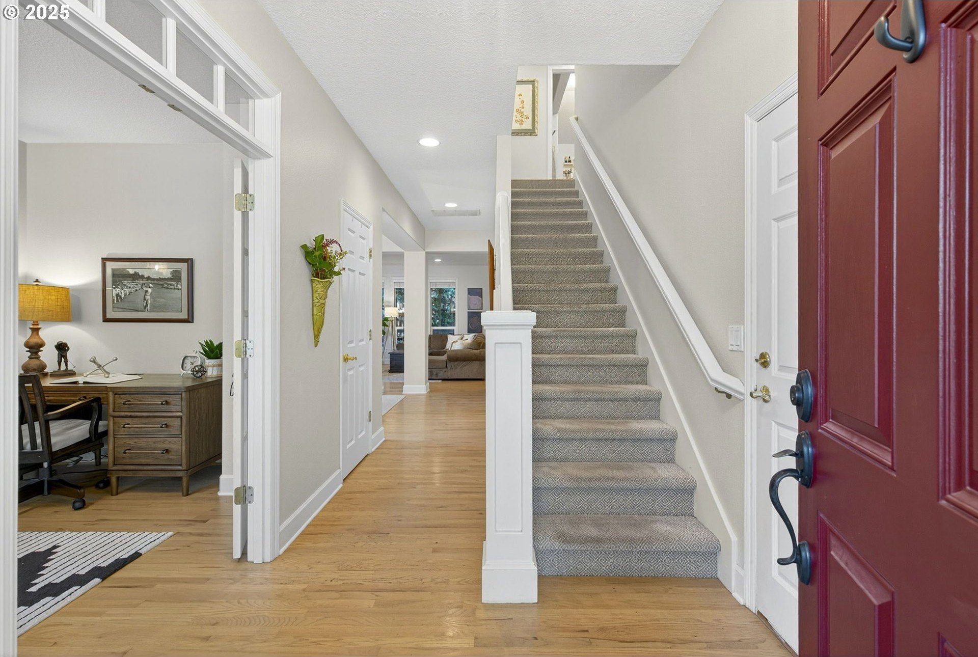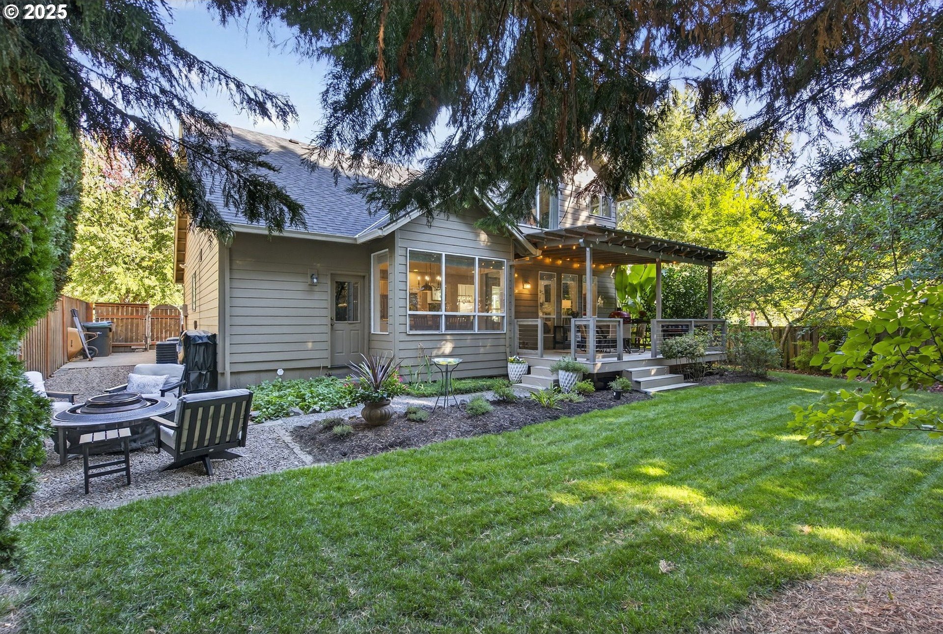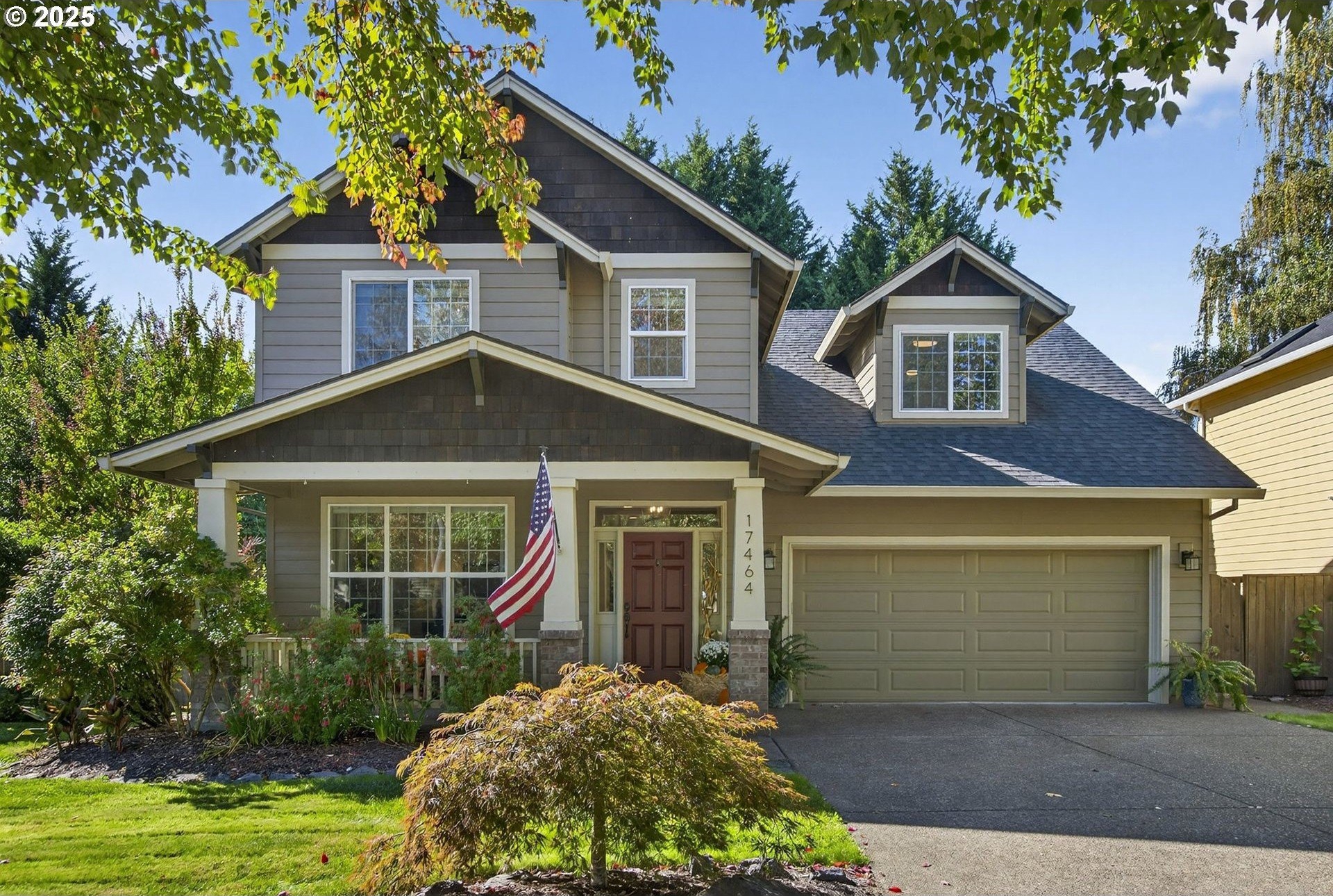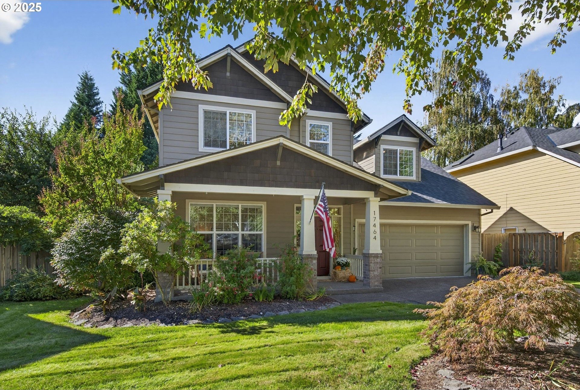 Open Sat 10/18 @ 1-3pm and Sun 10/19 @ 11am-1pm. Beautifully updated home in Sherwood’s desirable Woodhaven neighborhood! Prime location on a quiet street just 2 homes from a trailhead connecting miles of paved recreation paths, close to Old Town’s restaurants and amenities. This spacious home offers 4 bedrooms upstairs (bdrm #4 is staged as a bonus room with 3 large storage areas!) and a main-level office with a helpful storage closet. The open floor plan includes a formal dining area, living room with gas fireplace, large eat-at island, breakfast nook and gourmet kitchen! Beautiful quartz counter tops, custom backsplash, SS appliances including under counter lighting & BI-under counter microwave & wine fridge. Hardwood floors throughout the entire main level. Vaulted Primary Suite has WI-closet, linen closet, double sinks & gorgeous tiled WI-shower! Laundry room with sink is conveniently located upstairs as well. Enjoy the private backyard with a brand new (2025) covered patio that can be utilized all year round! Additional storage area behind the side gate that leads to the 3 car tandem garage & workbench. Established fruit plants include blueberries, strawberries, apple & plum trees. NEW in 2021: Cabinets, quartz counters, appliances, bathroom updates, interior paint & roof! NEW in 2023: Water heater, heat pump, and dehumidifier. Plumbed for central vac. Highly rated school district. Just a few blocks from the YMCA & new pedestrian bridge! Move-in ready & meticulously maintained!