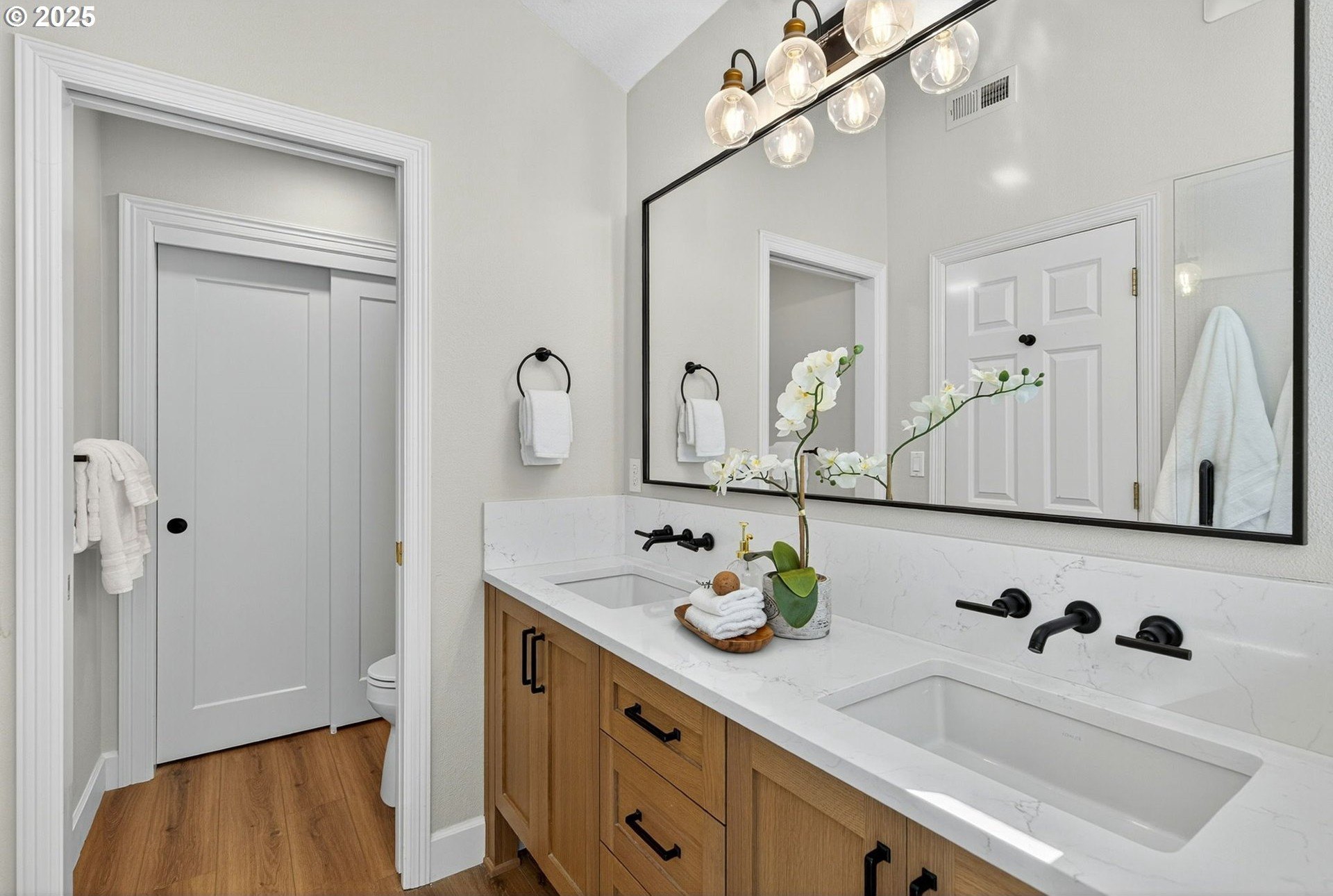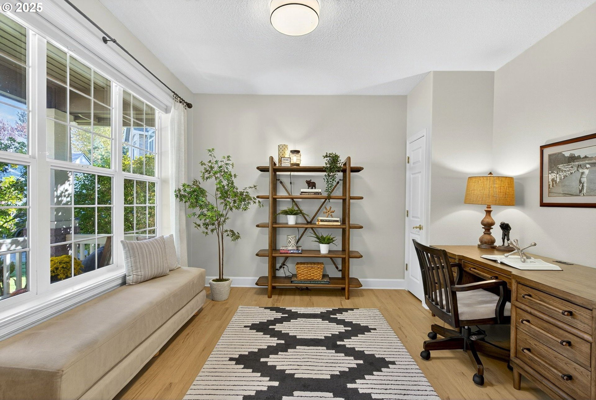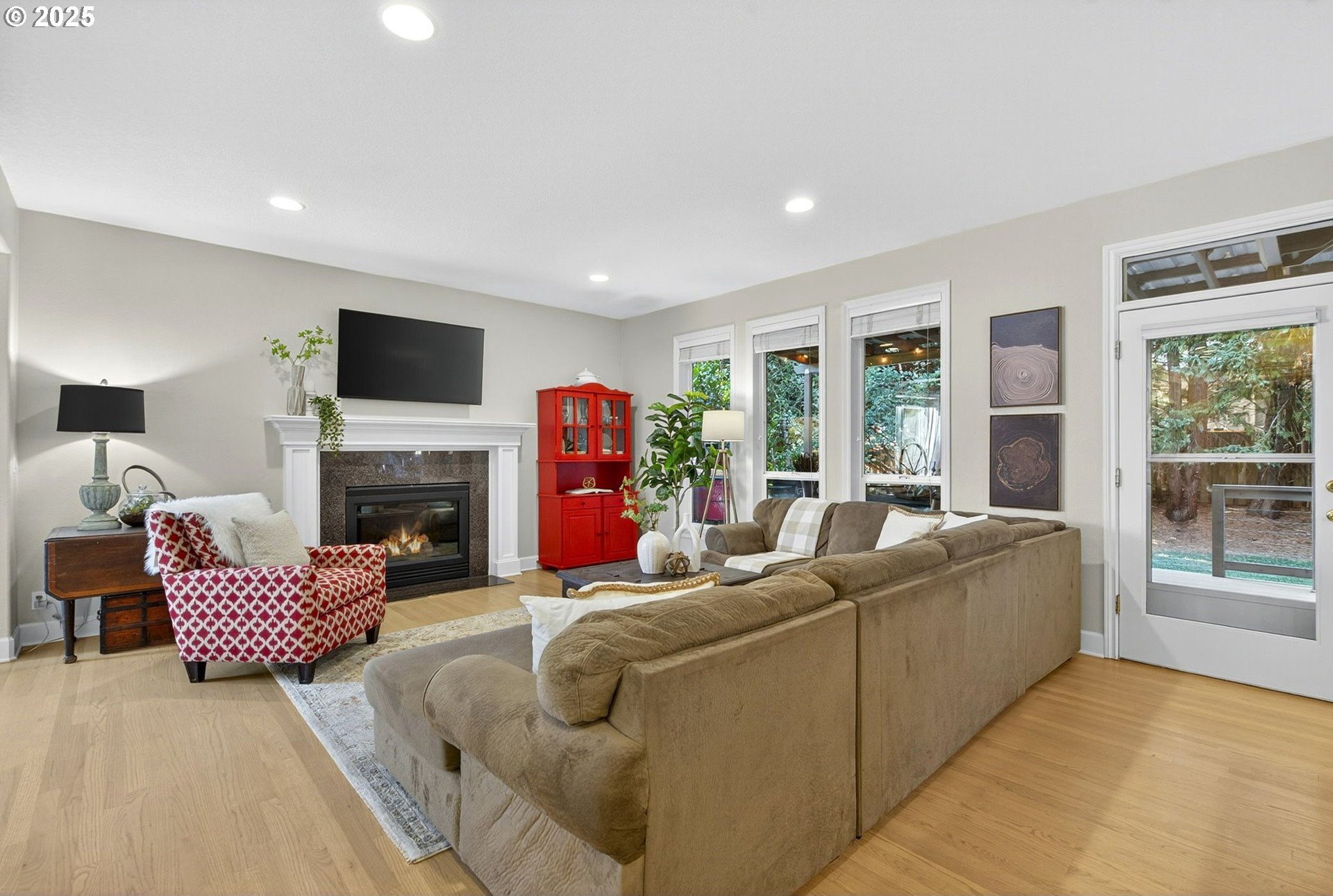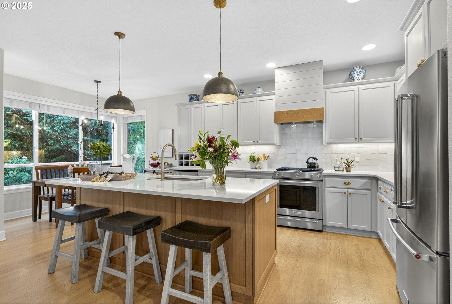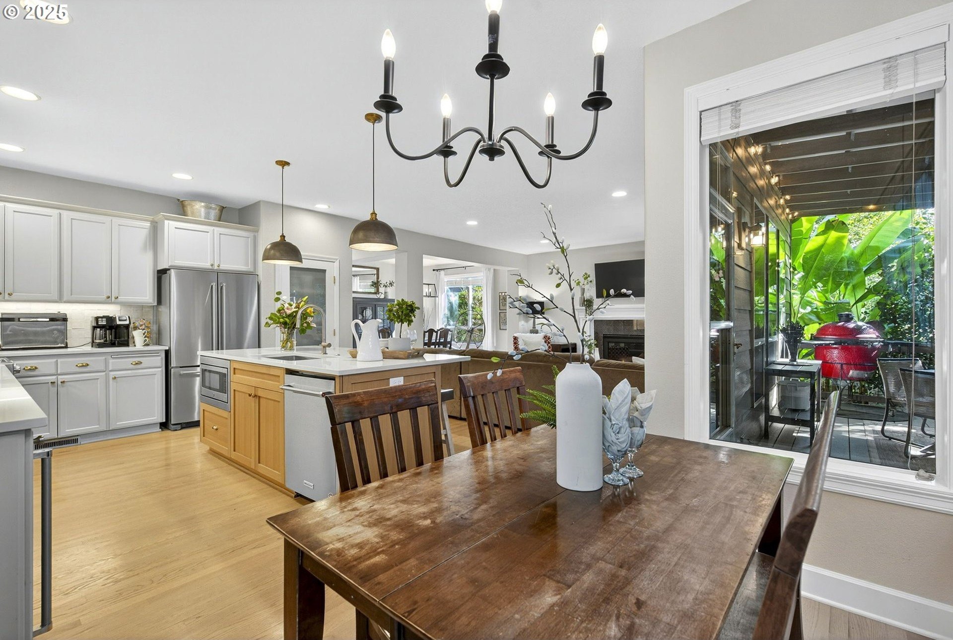 Open Sat 10/18 @ 1-3pm and Sun 10/19 @ 11am-1pm. Beautifully updated home in Sherwood’s desirable Woodhaven neighborhood! Prime location on a quiet street just 2 homes from a trailhead connecting miles of paved recreation paths, close to Old Town’s restaurants and amenities. This spacious home offers 4 bedrooms upstairs (bdrm #4 is staged as a bonus room with 3 large storage areas!) and a main-level office with a helpful storage closet. The open floor plan includes a formal dining area, living room with gas fireplace, large eat-at island, breakfast nook and gourmet kitchen! Beautiful quartz counter tops, custom backsplash, SS appliances including under counter lighting & BI-under counter microwave & wine fridge. Hardwood floors throughout the entire main level. Vaulted Primary Suite has WI-closet, linen closet, double sinks & gorgeous tiled WI-shower! Laundry room with sink is conveniently located upstairs as well. Enjoy the private backyard with a brand new (2025) covered patio that can be utilized all year round! Additional storage area behind the side gate that leads to the 3 car tandem garage & workbench. Established fruit plants include blueberries, strawberries, apple & plum trees. NEW in 2021: Cabinets, quartz counters, appliances, bathroom updates, interior paint & roof! NEW in 2023: Water heater, heat pump, and dehumidifier. Plumbed for central vac. Highly rated school district. Just a few blocks from the YMCA & new pedestrian bridge! Move-in ready & meticulously maintained!