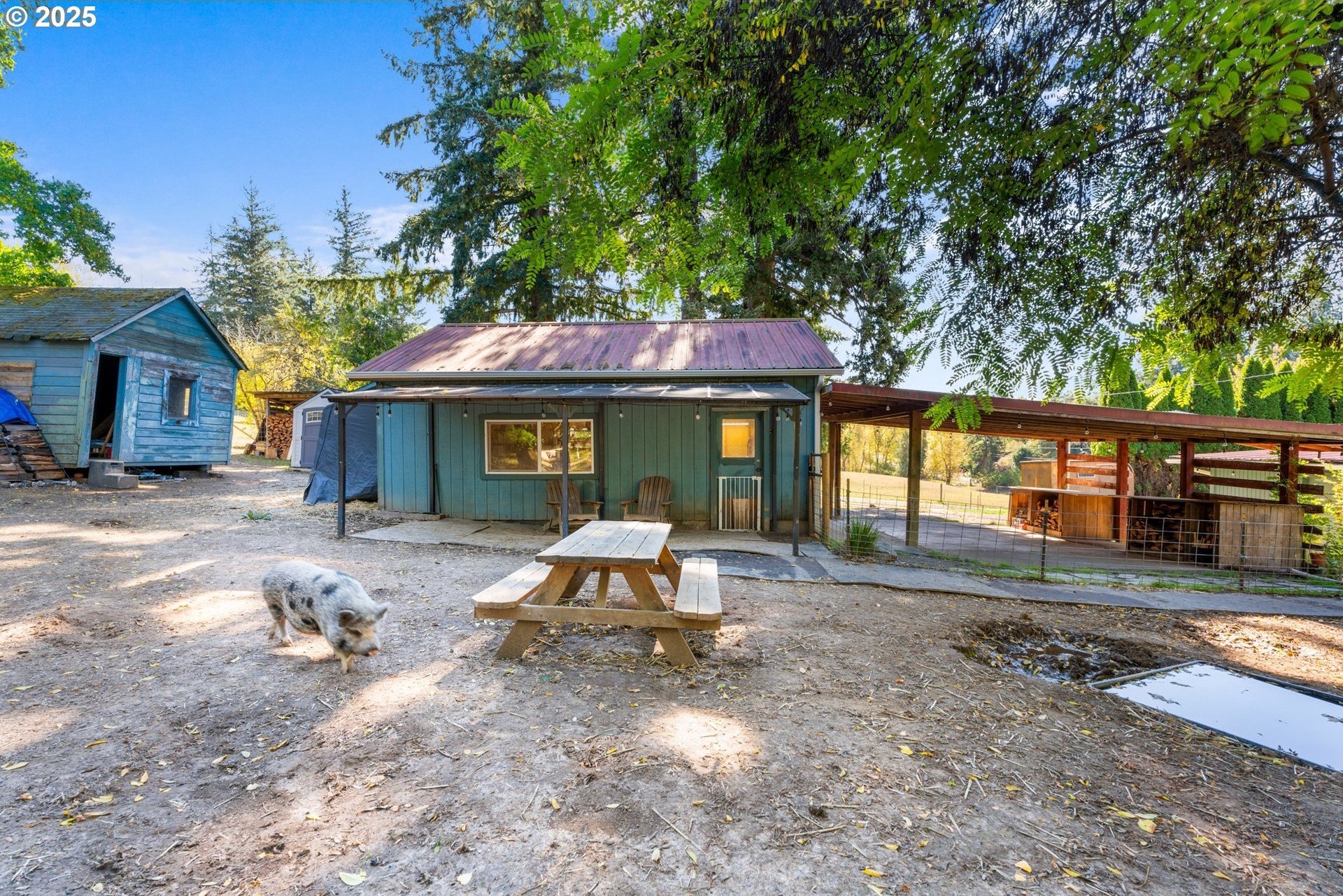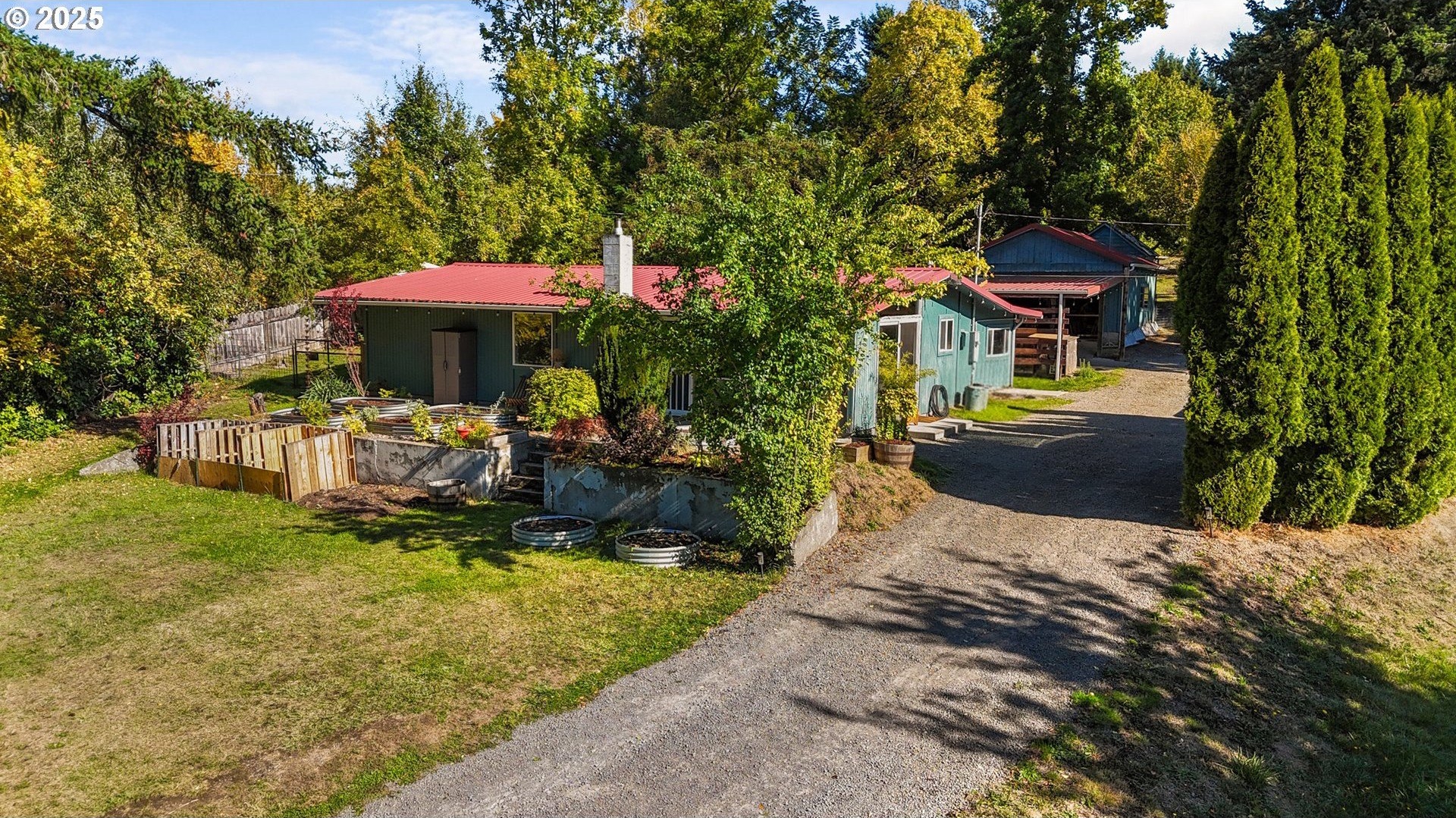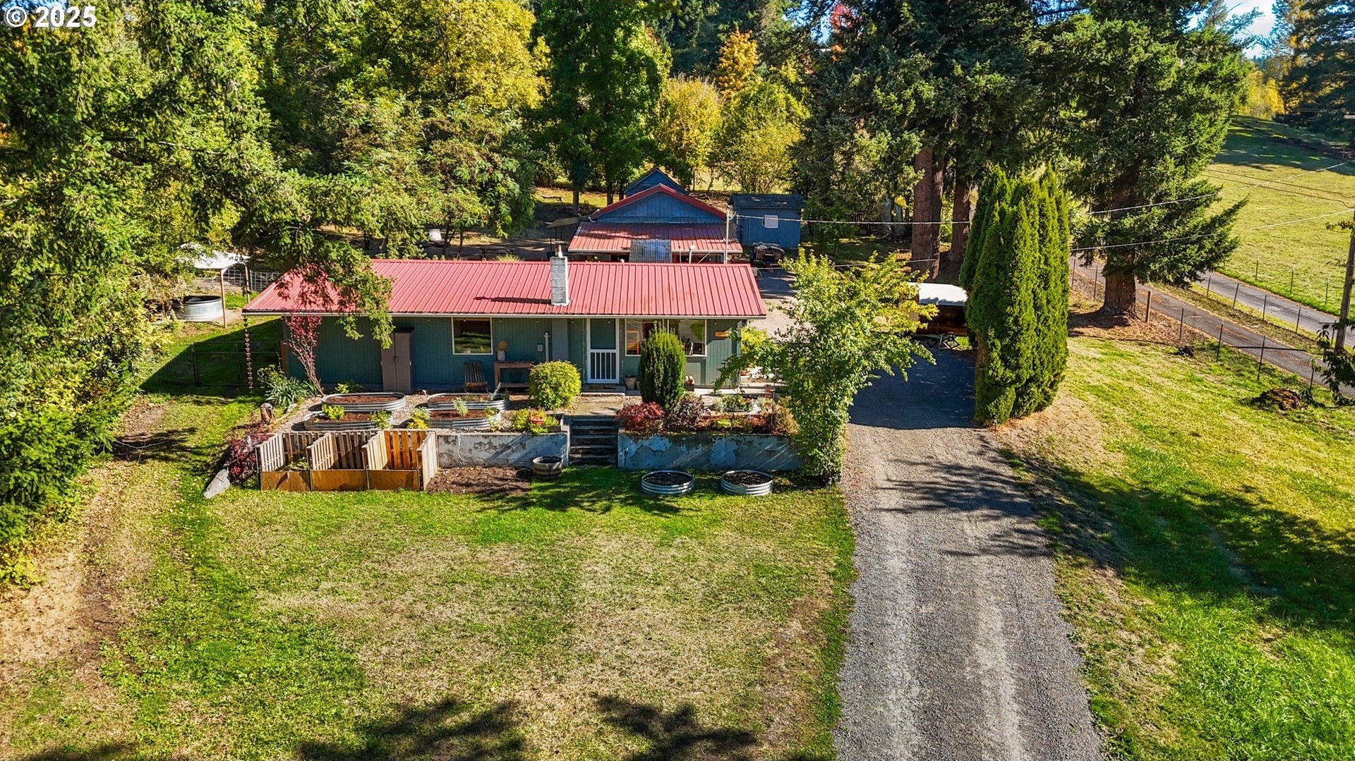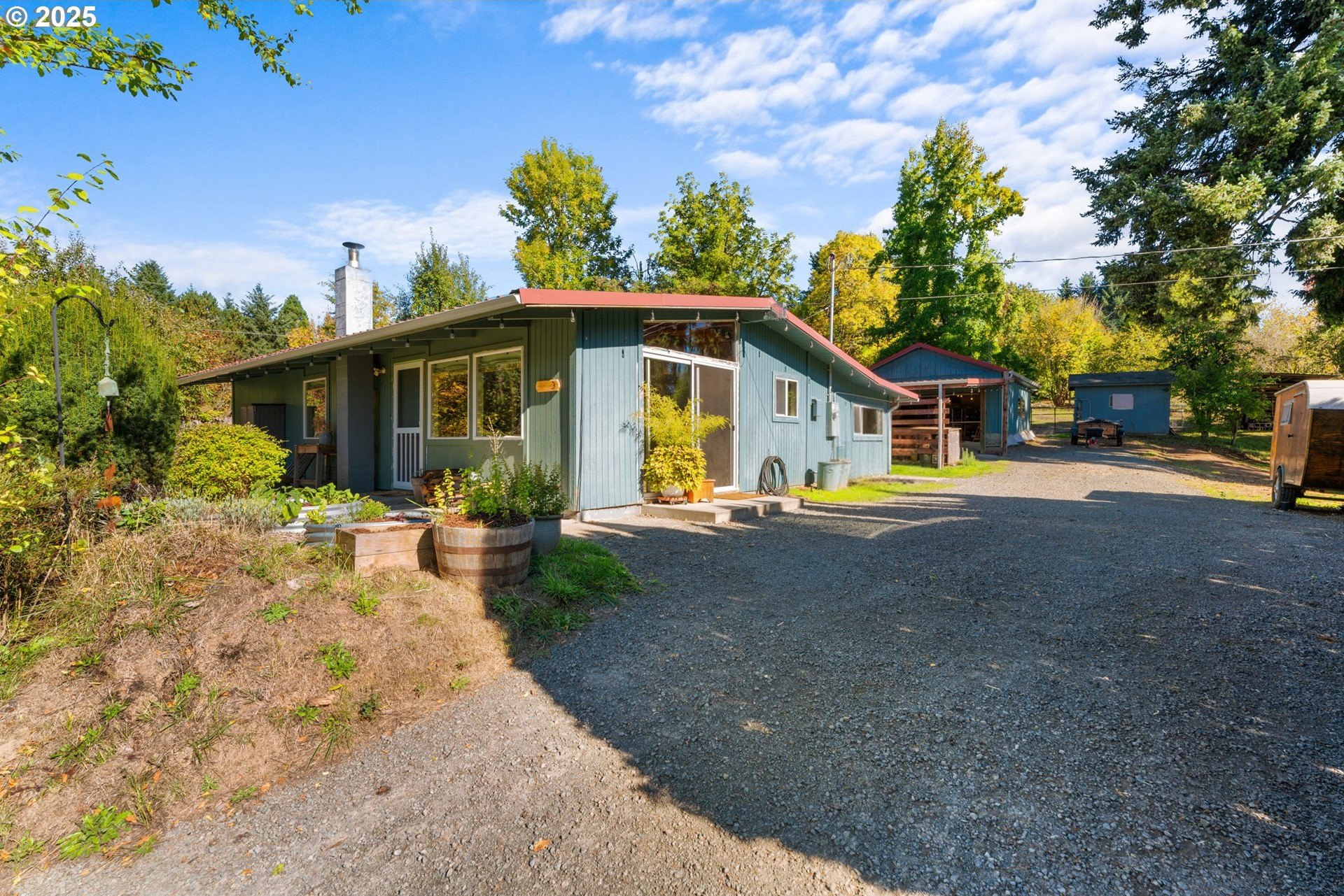 Opportunity knocks with this beautifully maintained mid-century home on a serene 1.55-acre cleared lot, both flat and gently sloping, set back from the road for added privacy. Inside, you’ll find three comfortable bedrooms, vaulted open-beam ceilings, vinyl windows, and a warm, functional layout filled with natural light.Recent updates include a new wood stove (with over 3 cords of firewood included!), new bedroom windows and slider, interior paint, modern lighting and wiring including in the detached garage, and custom window shades throughout. The home also features upgraded electrical and plumbing, a new septic system and well holding tank, and new gutters with copper rain chains. Step outside to enjoy a brand-new covered back patio and rock wall, plus a concrete side patio, ideal for morning coffee and bird watching. The fully fenced and cross-fenced property includes a new gravel driveway and parking pad, raised garden beds, and fruit trees — plum, apple, cherry, fig, chestnut, and grape vines — perfect for the homesteader or hobby gardener. The detached garage with a concrete floor and 220-power adds versatile workspace potential. This peaceful area is surrounded by high-end custom homes, offering room to expand or build your dream addition. Don’t miss the level building site at the back of the property, perfect for gardening, farming, or housing animals.