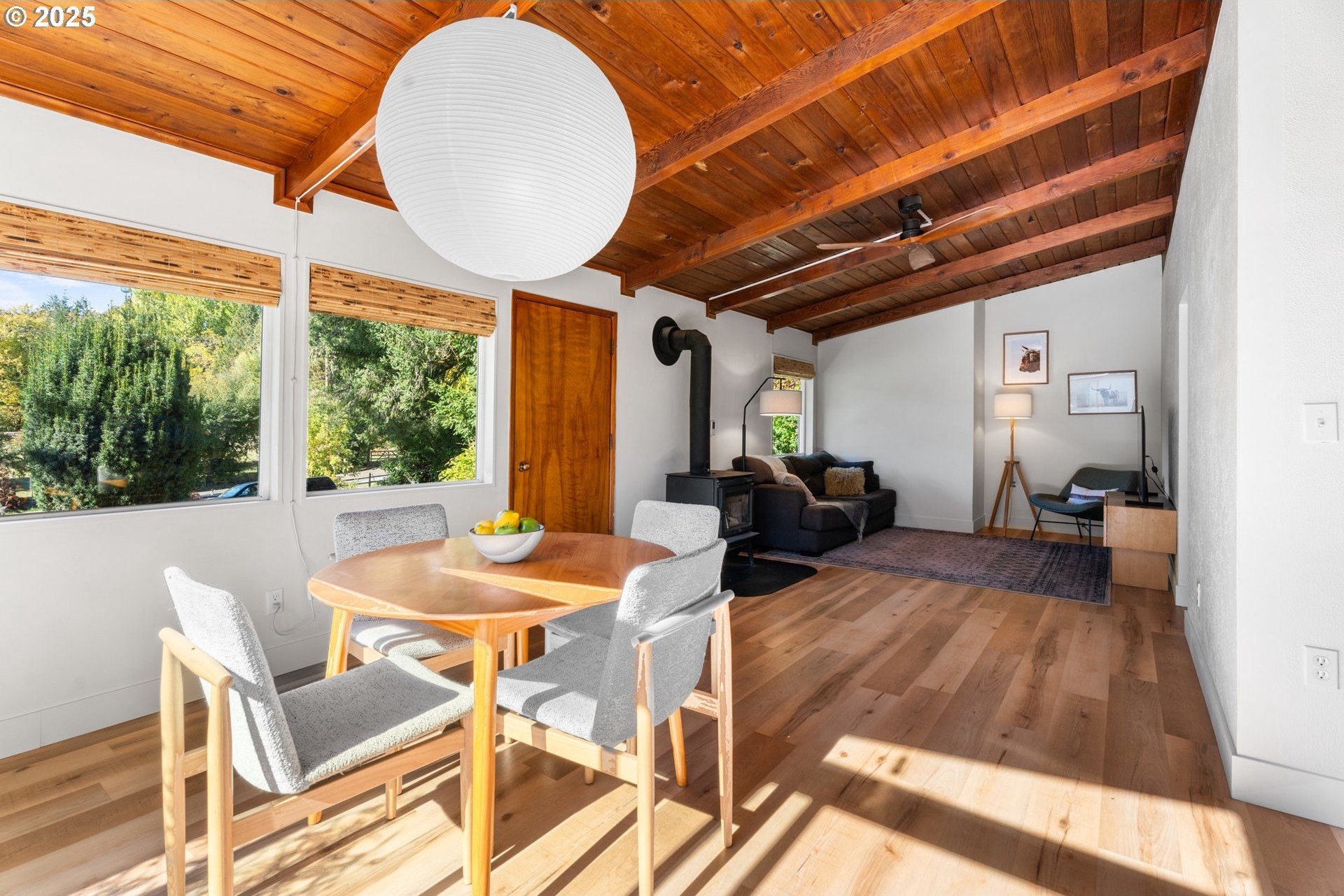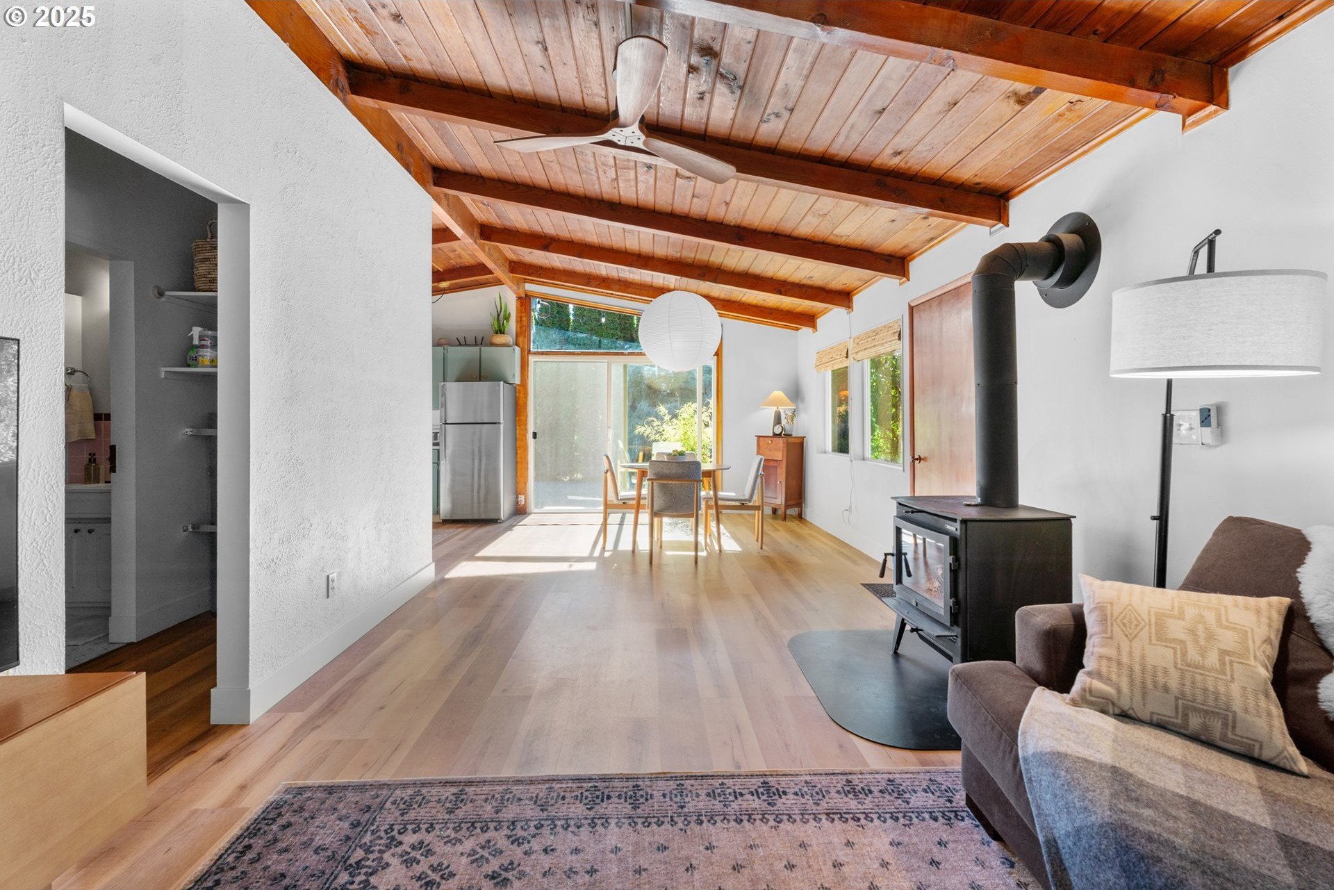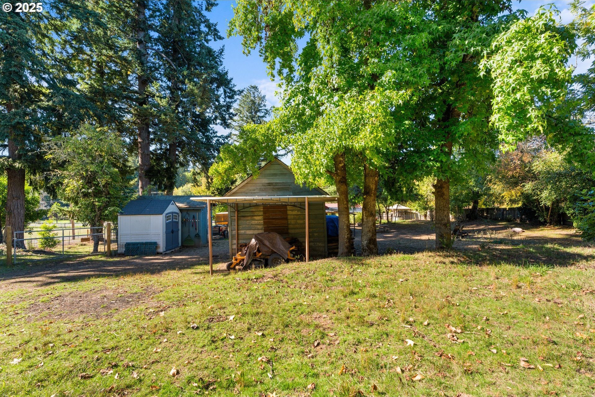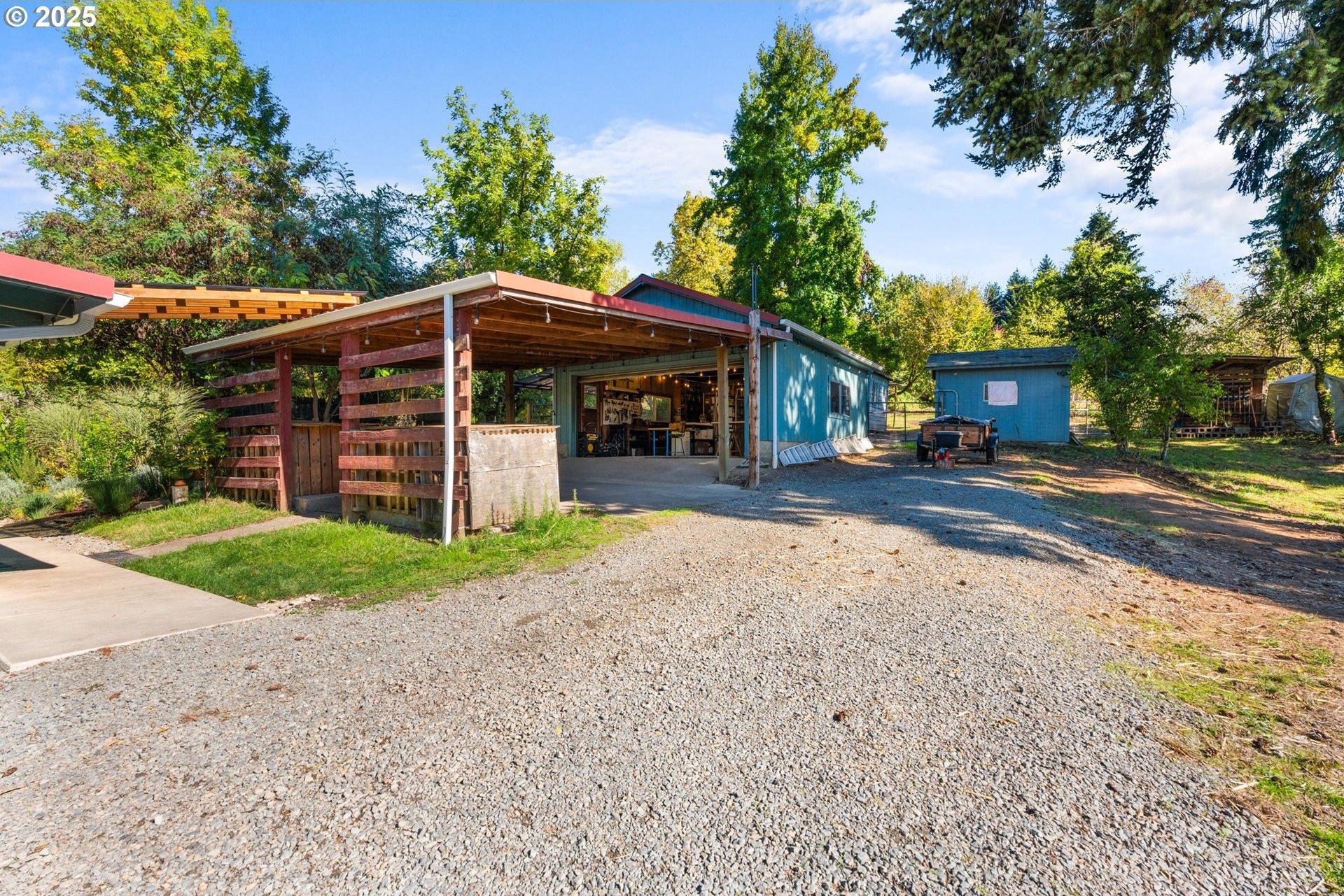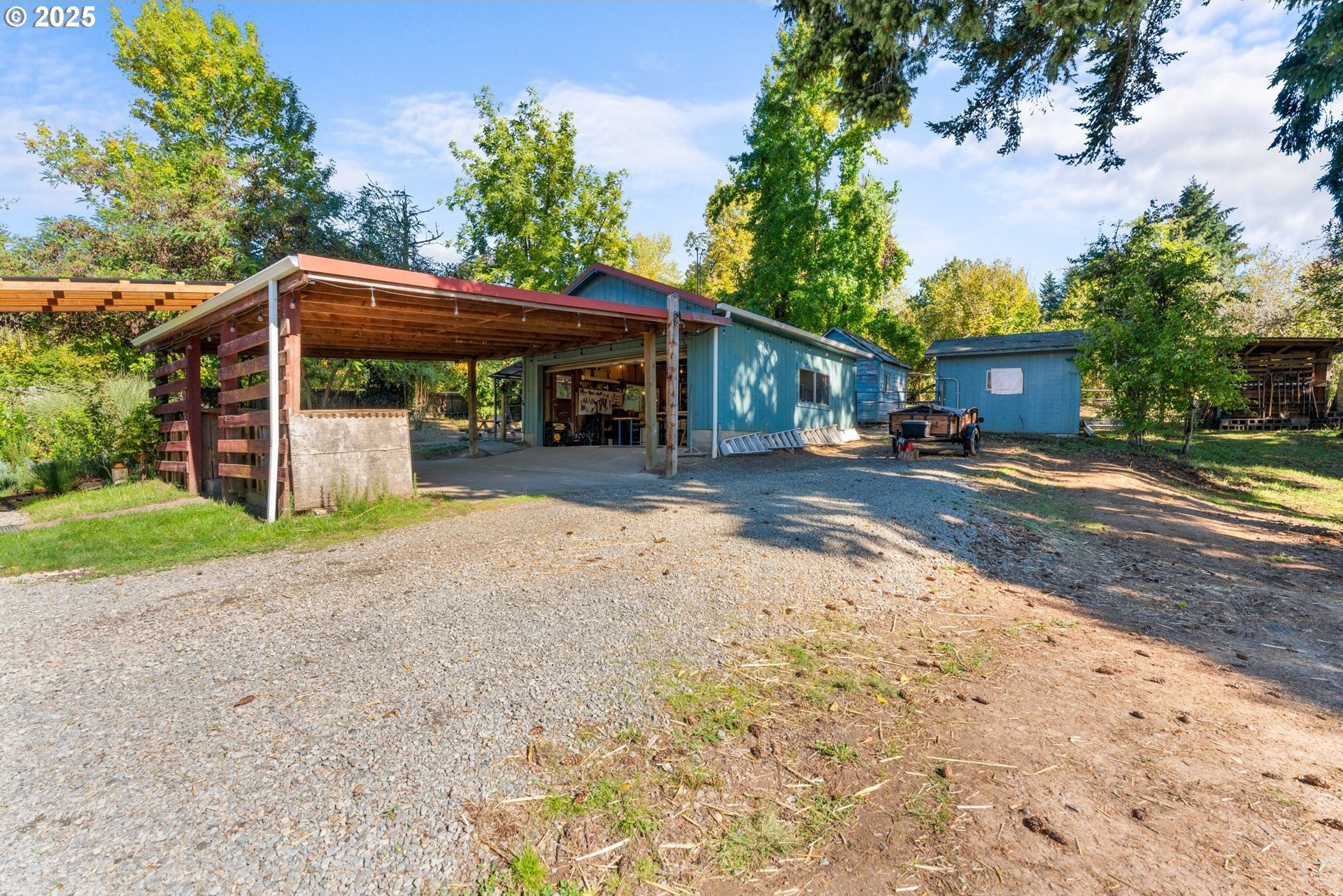 Opportunity knocks with this beautifully maintained mid-century home on a serene 1.55-acre cleared lot, both flat and gently sloping, set back from the road for added privacy. Inside, you’ll find three comfortable bedrooms, vaulted open-beam ceilings, vinyl windows, and a warm, functional layout filled with natural light.Recent updates include a new wood stove (with over 3 cords of firewood included!), new bedroom windows and slider, interior paint, modern lighting and wiring including in the detached garage, and custom window shades throughout. The home also features upgraded electrical and plumbing, a new septic system and well holding tank, and new gutters with copper rain chains. Step outside to enjoy a brand-new covered back patio and rock wall, plus a concrete side patio, ideal for morning coffee and bird watching. The fully fenced and cross-fenced property includes a new gravel driveway and parking pad, raised garden beds, and fruit trees — plum, apple, cherry, fig, chestnut, and grape vines — perfect for the homesteader or hobby gardener. The detached garage with a concrete floor and 220-power adds versatile workspace potential. This peaceful area is surrounded by high-end custom homes, offering room to expand or build your dream addition. Don’t miss the level building site at the back of the property, perfect for gardening, farming, or housing animals.