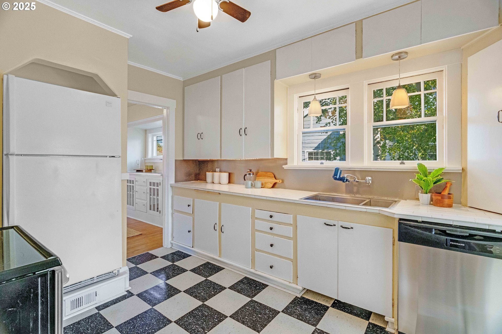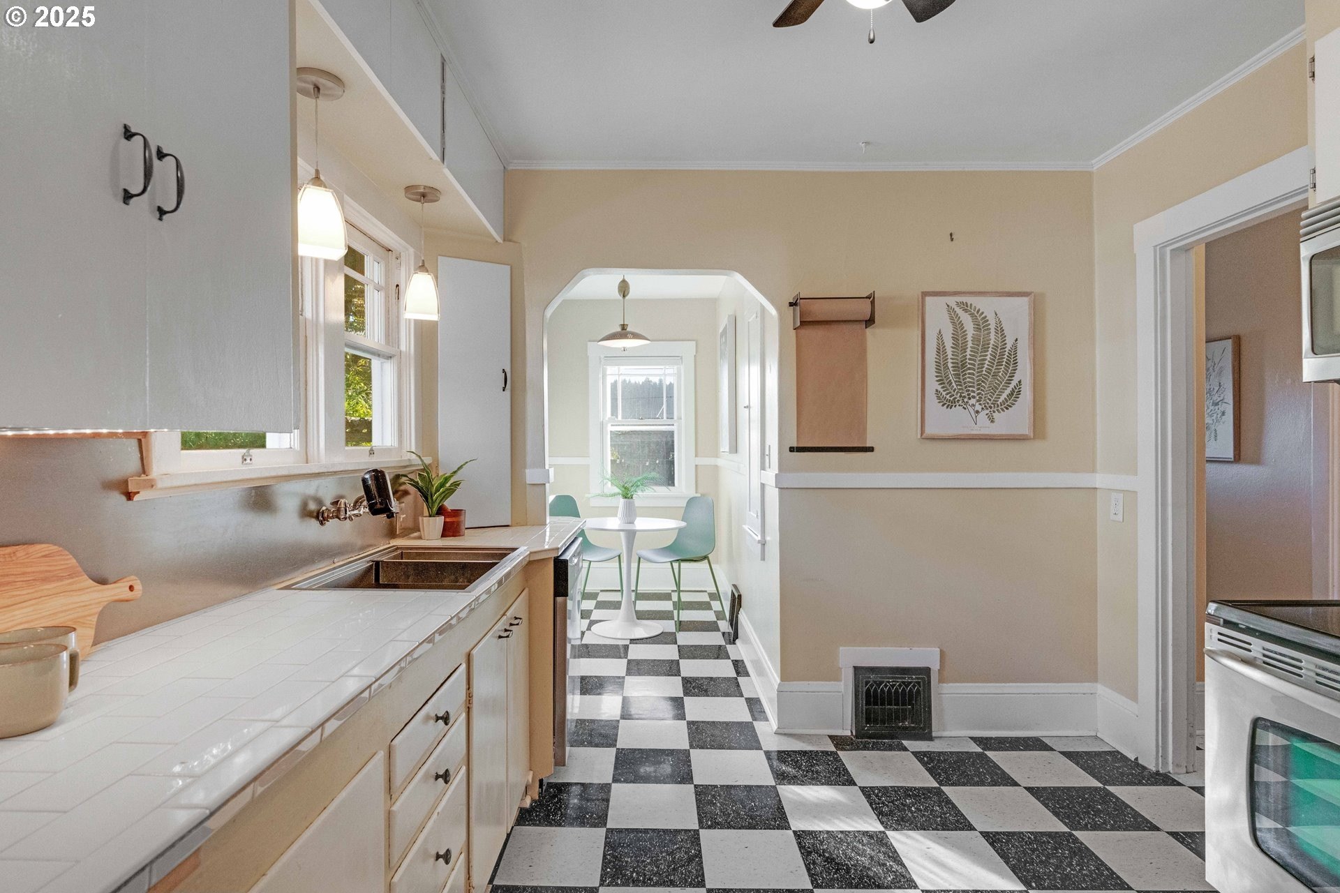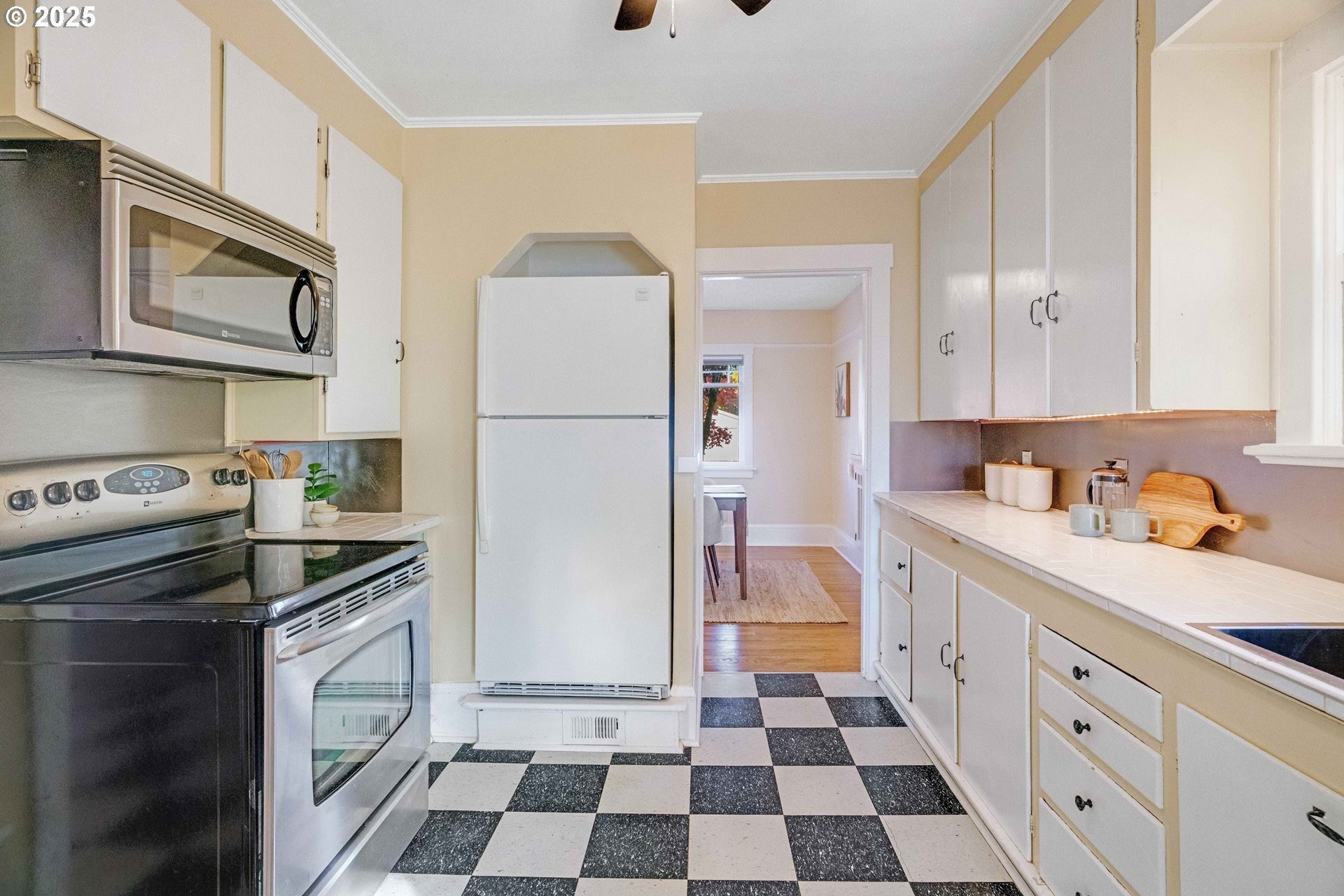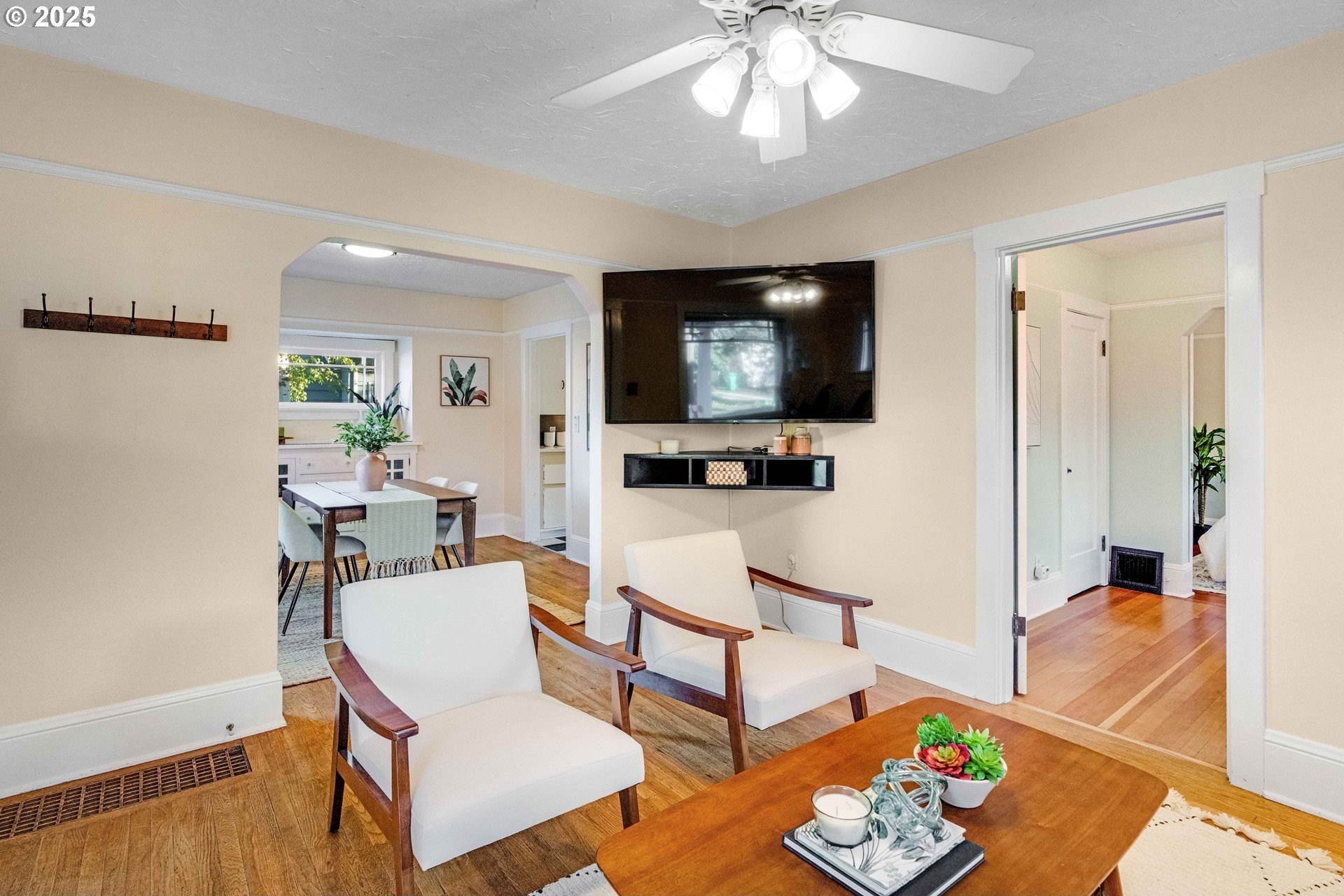 This beautifully maintained Roseway home is filled with vintage charm and modern updates throughout, offering flexibility and comfort in a classic setting. Fresh exterior paint and newly refreshed landscaping with sod, barkdust, and plantings enhance its curb appeal. Inside, hardwood floors, built-ins, and a clawfoot tub highlight timeless craftsmanship. Major updates include a roof, gutters, and furnace (2015), an earthquake retrofit (2016), and energy-efficient vinyl windows. Stainless steel appliances, a two-car garage, fenced yard, and ample off-street parking add everyday convenience. Currently used as a two bedroom/large primary suite with double closets or convert back to a three bedroom. Large basement with tall ceilings and possibility to finish and create more living space. Just blocks to Glenhaven Park and Rose City Golf Club. With its covered front porch and move-in-ready condition, this Roseway gem perfectly blends character and care. [Home Energy Score = 7. HES Report at https://rpt.greenbuildingregistry.com/hes/OR10183212]