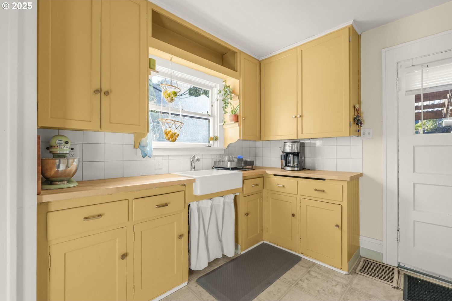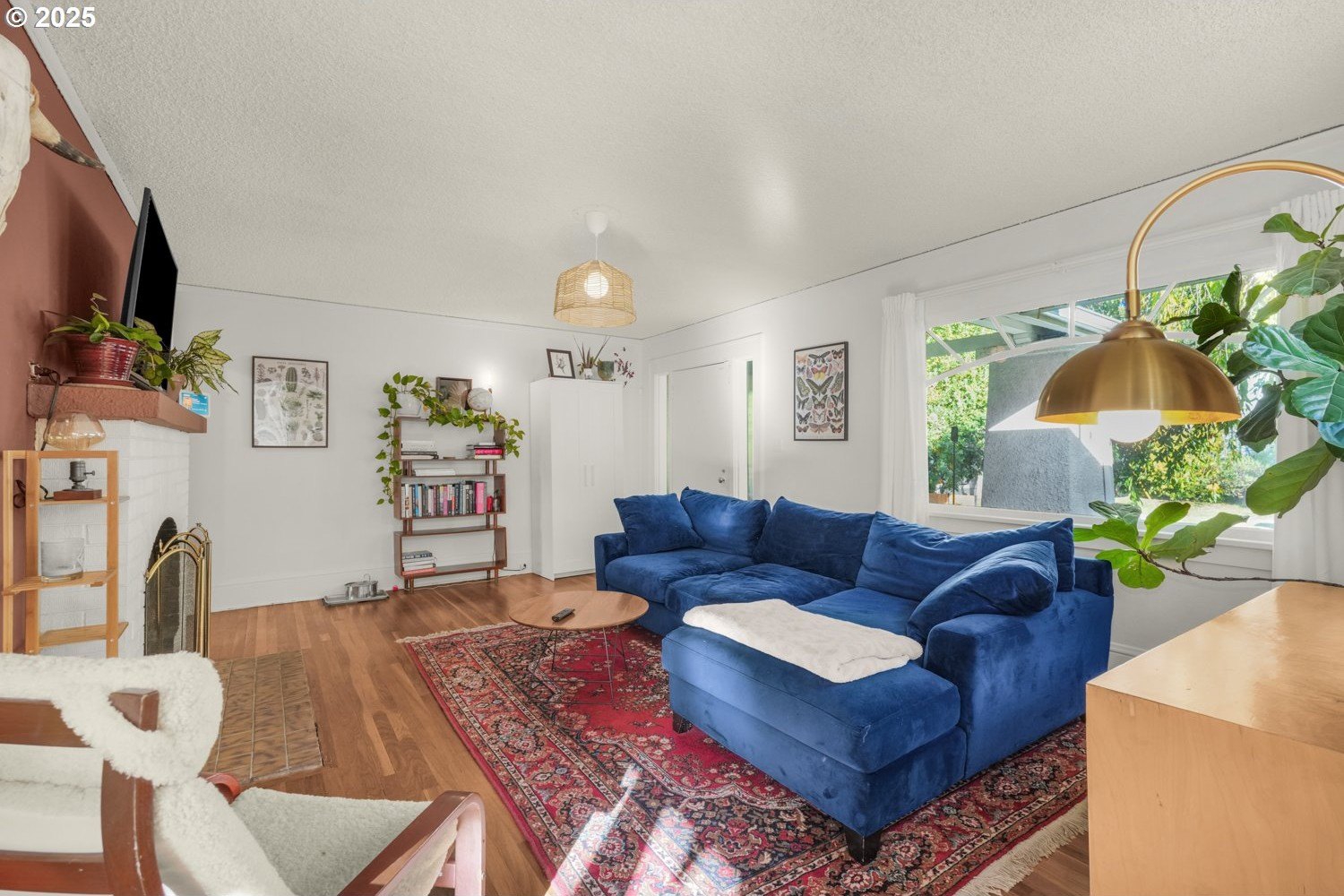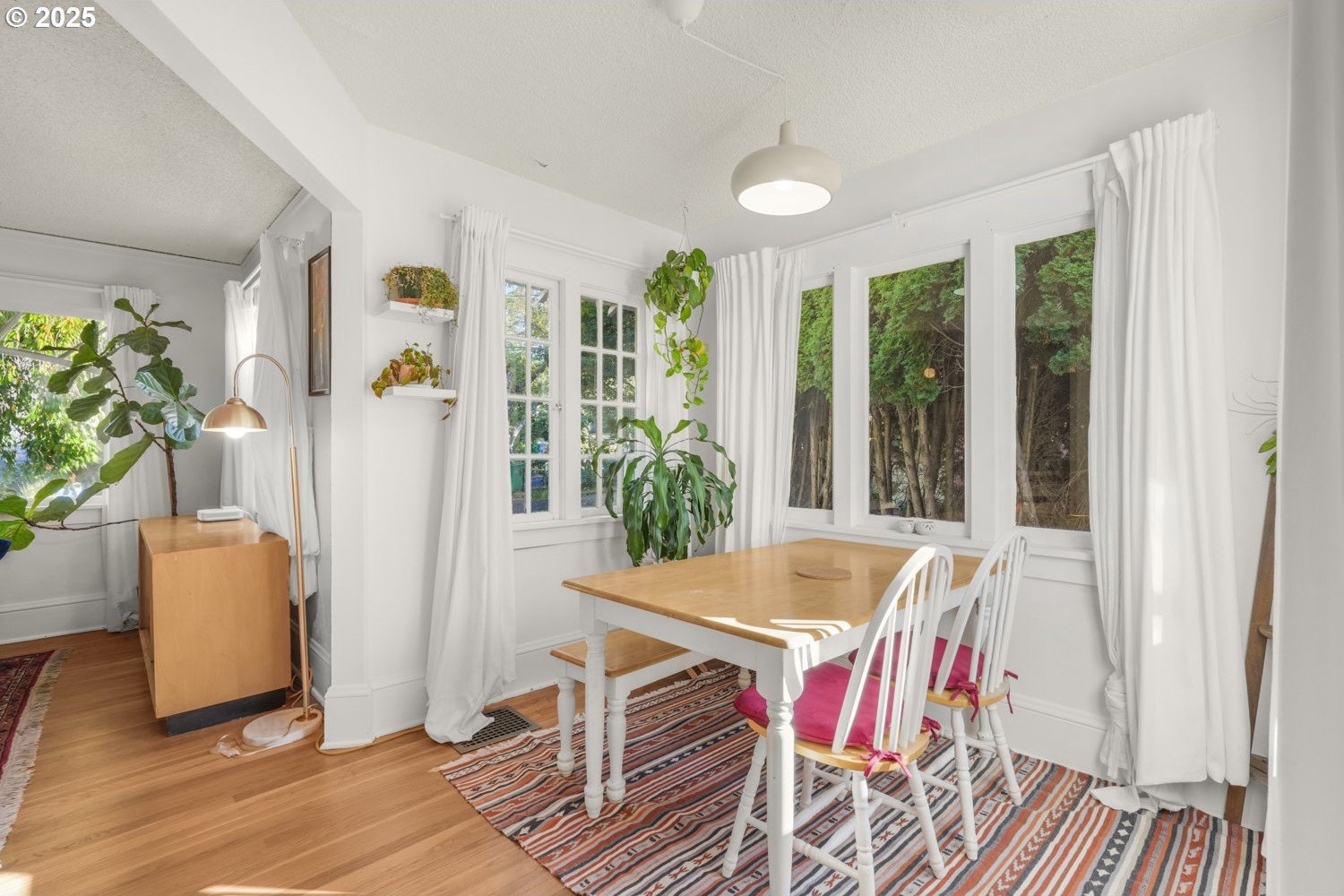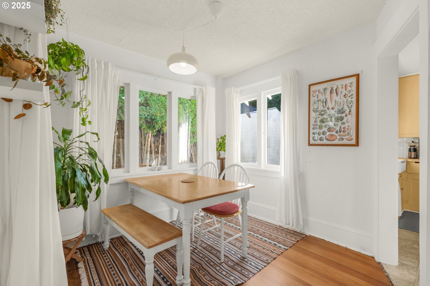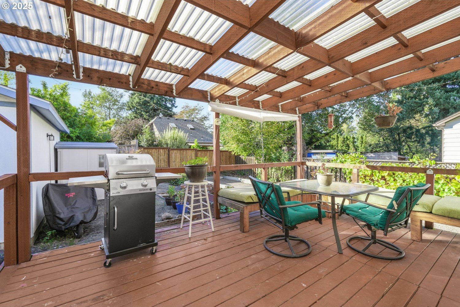 Charming 2-bedroom, 1-bath home filled with warmth and natural light. Gorgeous hardwood floors flow throughout. The bright living room features a cozy fireplace, and the adjacent dining area is surrounded by windows for a cheerful, light-filled space. The updated kitchen has butcher block countertops, a farmhouse sink, and access to a covered deck making it ideal forindoor/outdoor dining and entertaining. Both bedrooms are generously sized, and the updated bath adds a fresh, modern touch. The fantastic backyard is private and fenced, featuring a versatile multi-use court for multiple seating areas, large garden beds, and a handy tool shed. The 12x19 detached garage has added electricity, making it a perfect workshop or creative space. The unfinished basement includes a workbench, lots of storage, and potential for turning it into a bonus room, home office, or gym. Additional updates include new water pipes. Conveniently located just minutes from dining, shopping, neighborhood parks, and Providence Medical Center, this home blends classic charm with modern comfort.