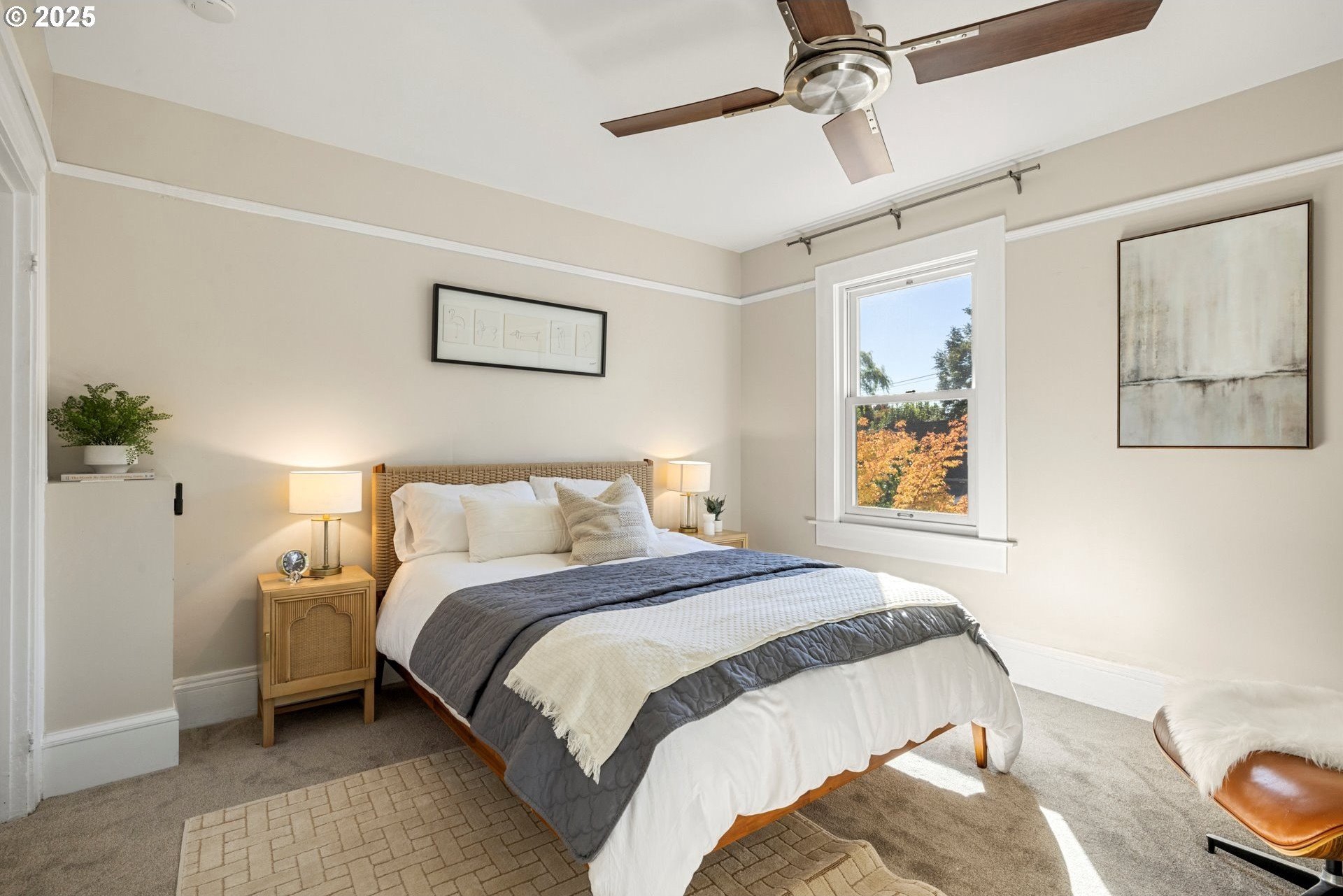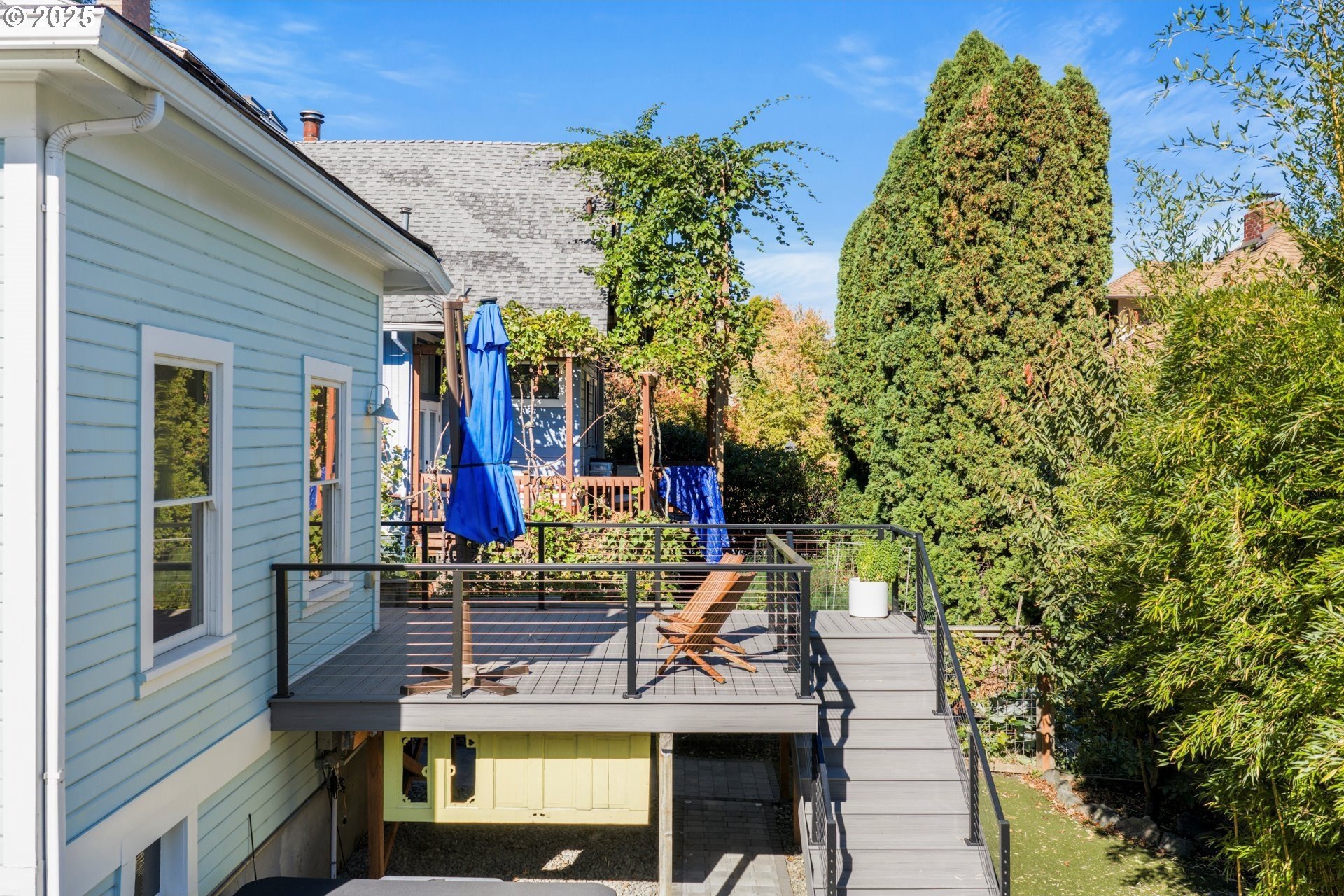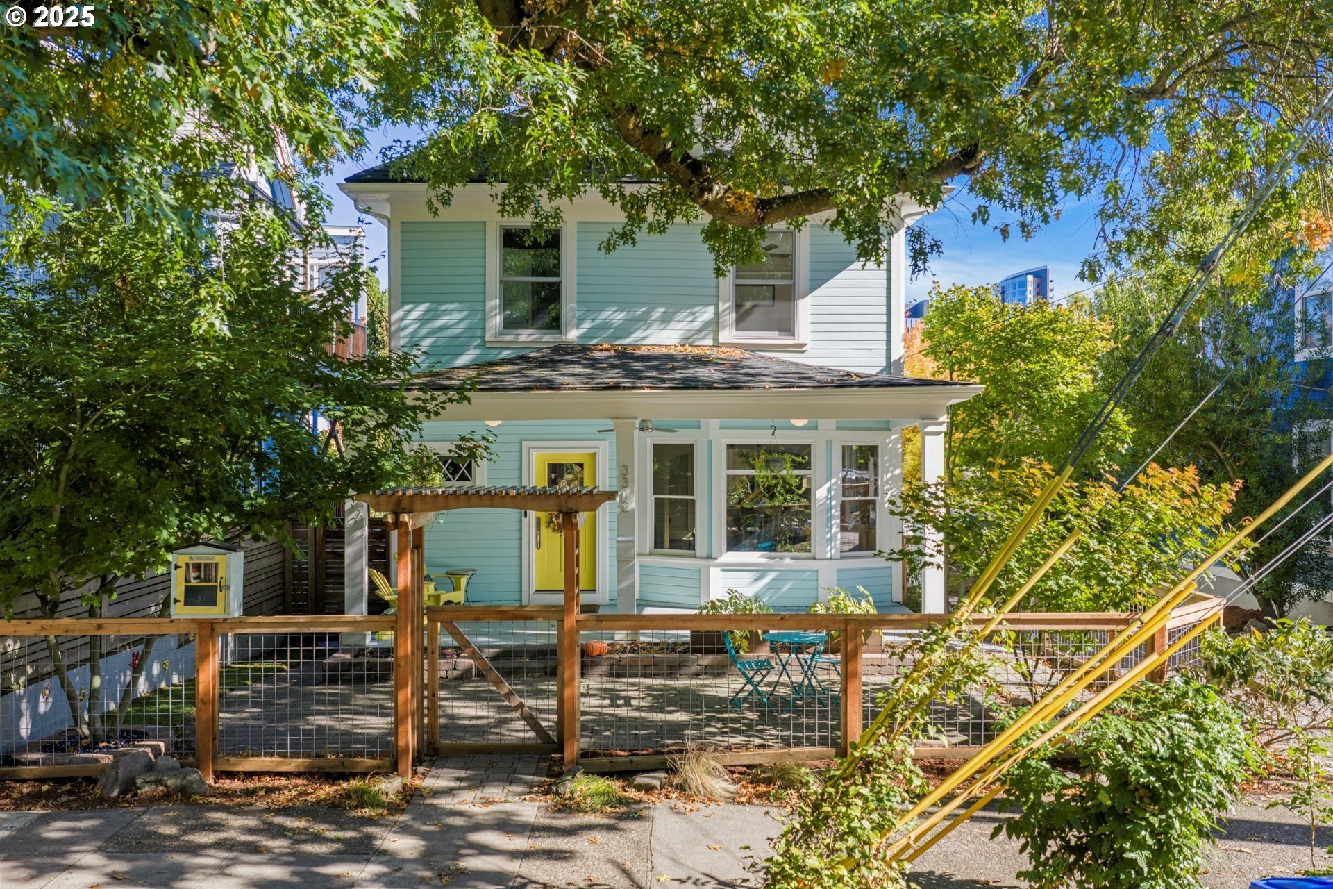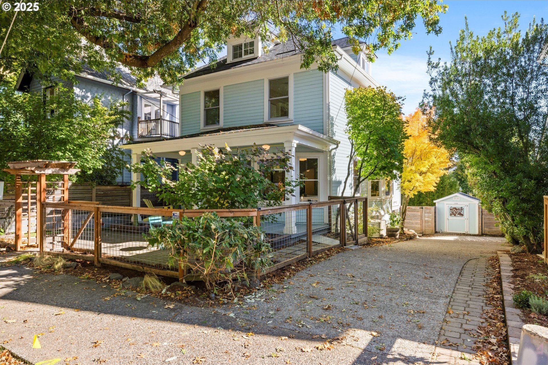 This is a stunning turn of the century 4-Square in the Lair Hill neighborhood! Thoughtfully restored, the house reflects immaculate attention to detail to make this home functional, without compromising its historic character. The level lot offers ample off-street parking, with a garage, fully fenced backyard, cute storage shed and low maintenance landscaping. Choices abound when you want to chill outside, whether it’s on your front porch, the elevated back deck or the hot tub! The path of the OHSU aerial tram soars right next to your property and is a delight to watch..really!The fun doesn’t stop there. The main level features an open kitchen with bar seating, full pantry, an abundance of light and access to the back deck. The kitchen opens to the dining room and flows to the living room at the front of the house, or to the back of the house with a room that could be a guest suite, master bedroom or family room. (Current owners have it set up as a family room).You’ll find another full bathroom upstairs, with heated floors and free standing tub you can lose yourself in, 2 ample bedrooms with new carpet and ample closet space. The laundry chute makes transferring your dirty laundry downstairs a breeze! Need a hobby room? Open the door to another staircase and head up to the attic, which offers so many opportunities. Owner used it as a craft/sewing room.Finally, you have a fully functional and dry basement, which consists of the laundry room, mechanical room and a space where the current owner had a pottery studio, complete with a kiln! Basement has outside access and direct access to the garage.The 1 block proximity to the Gibbs Street Pedestrian Bridge marries the Lair Hill neighborhood with the South Waterfront district, making this such a special place to call home. It truly allows you to appreciate all that Portland has to offer, with its Mt Hood views, easy access to the outdoors, OHSU medical facility, pedestrian bridge, walking/biking paths and more! [Home Energy Score = 1. HES Report at https://rpt.greenbuildingregistry.com/hes/OR10007641]