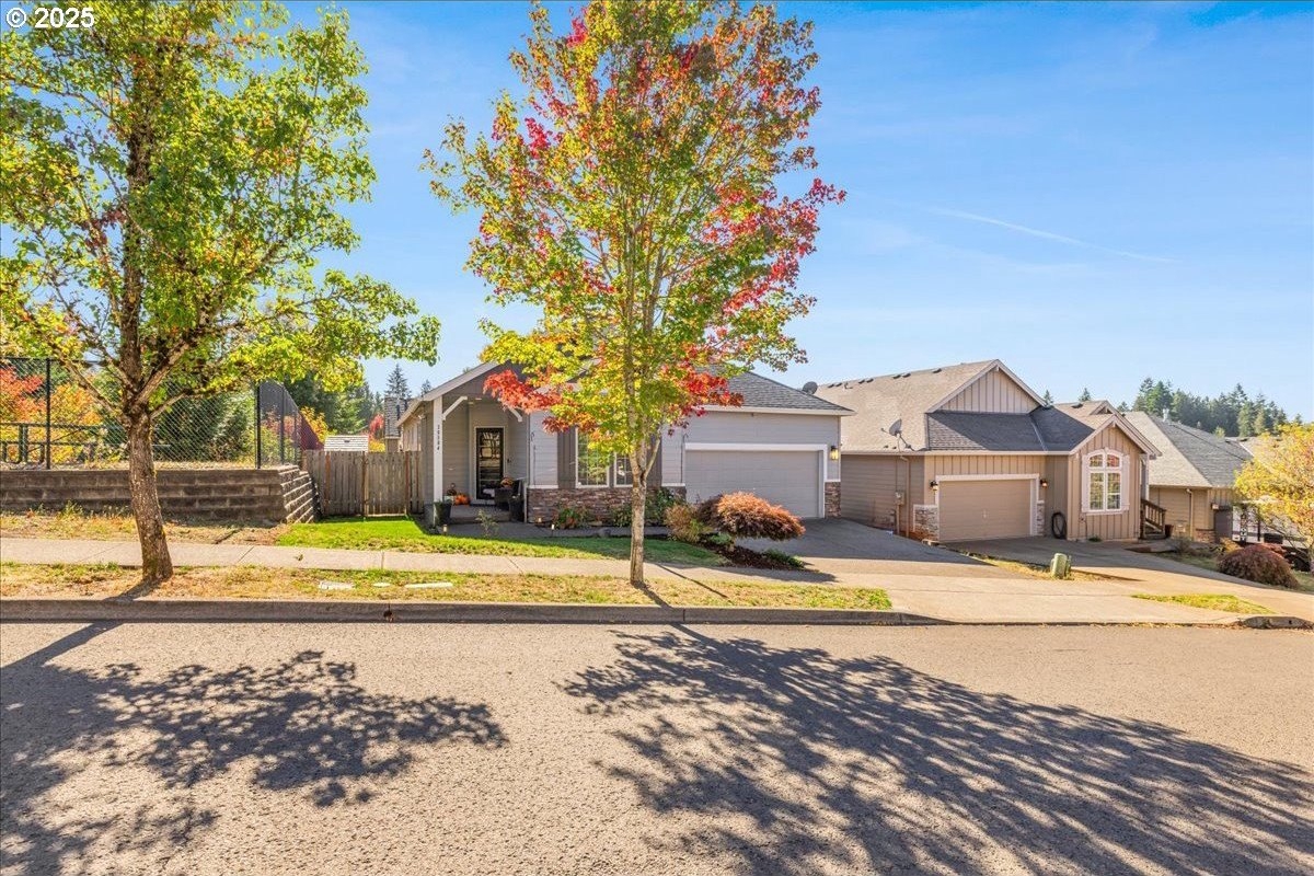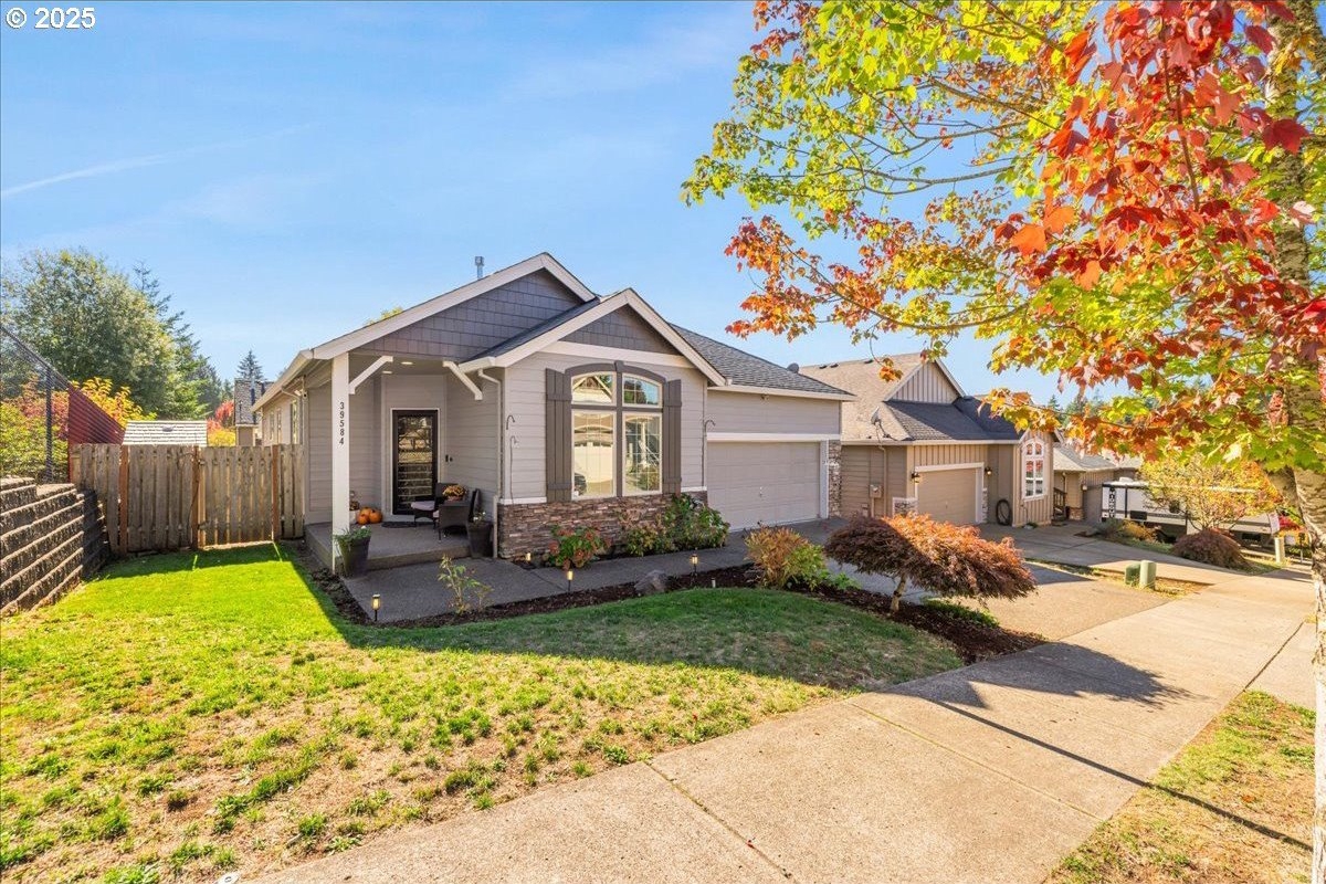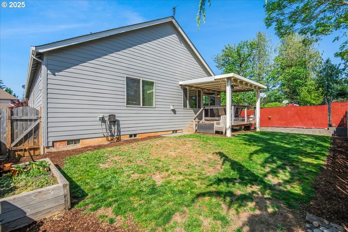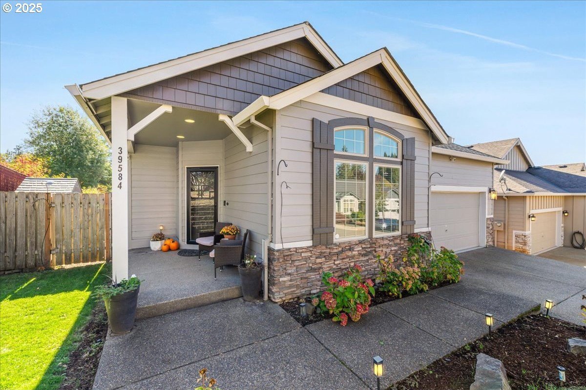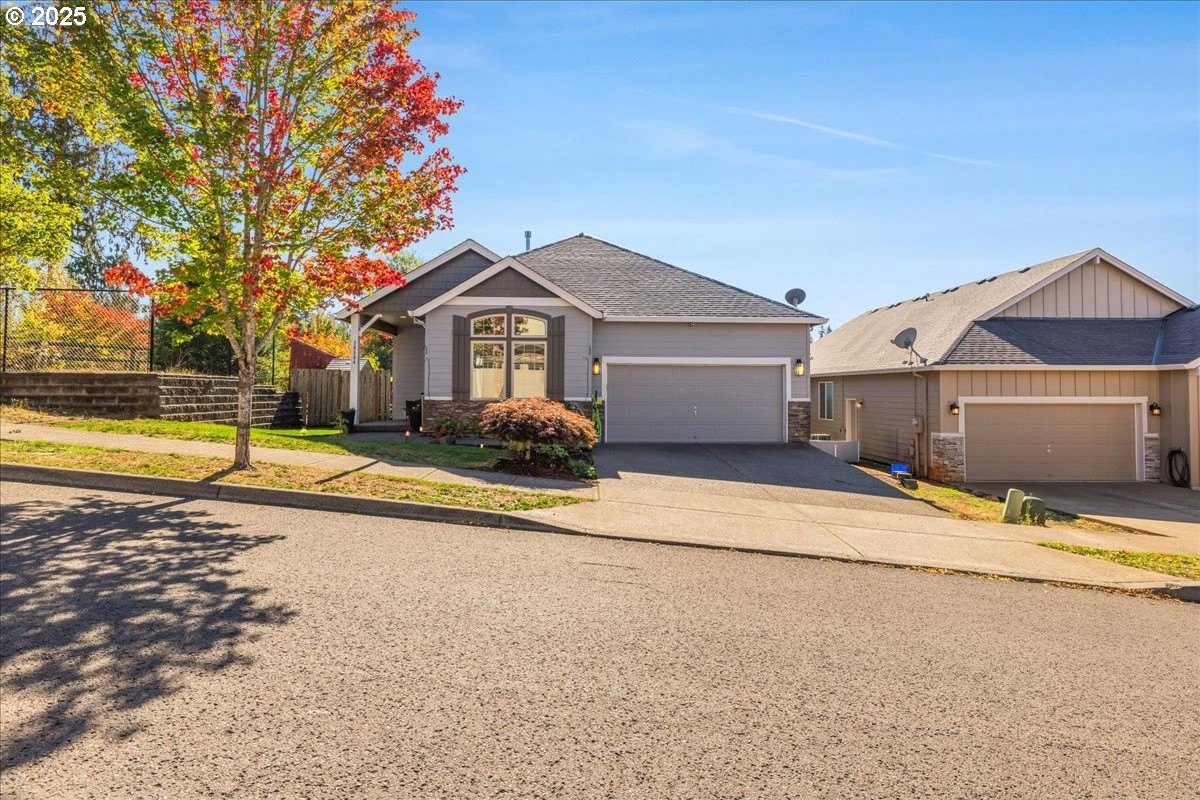 Beautiful single-story home offering 4 bedrooms, 2.5 bathrooms, and 9-foot ceilings throughout, with a vaulted living room that enhances the spacious feel. The open-concept kitchen features granite countertops, a large island, gas appliances, and a built-in pantry—ideal for cooking and entertaining. The adjoining living area includes a custom stone fireplace and vaulted ceilings for added character. The front dining room provides an inviting space for meals or gatherings. The primary suite includes vaulted ceilings, a walk-in closet, and an ensuite bath with dual vanities. Recent updates include new flooring (2021), new light fixtures, new toilets, and interior/exterior paint (2020). Additional highlights include a large laundry room with utility sink and cabinetry, and a garage with overhead storage racks. Outdoor features include fully fenced grounds, a fenced garden area with raised beds, a storage shed, and a covered back deck with shades—perfect for outdoor enjoyment. Prime location next to Timberline Park and minutes from coffee shops, restaurants, and hiking trails. A beautifully maintained one-level home that’s truly move-in ready!